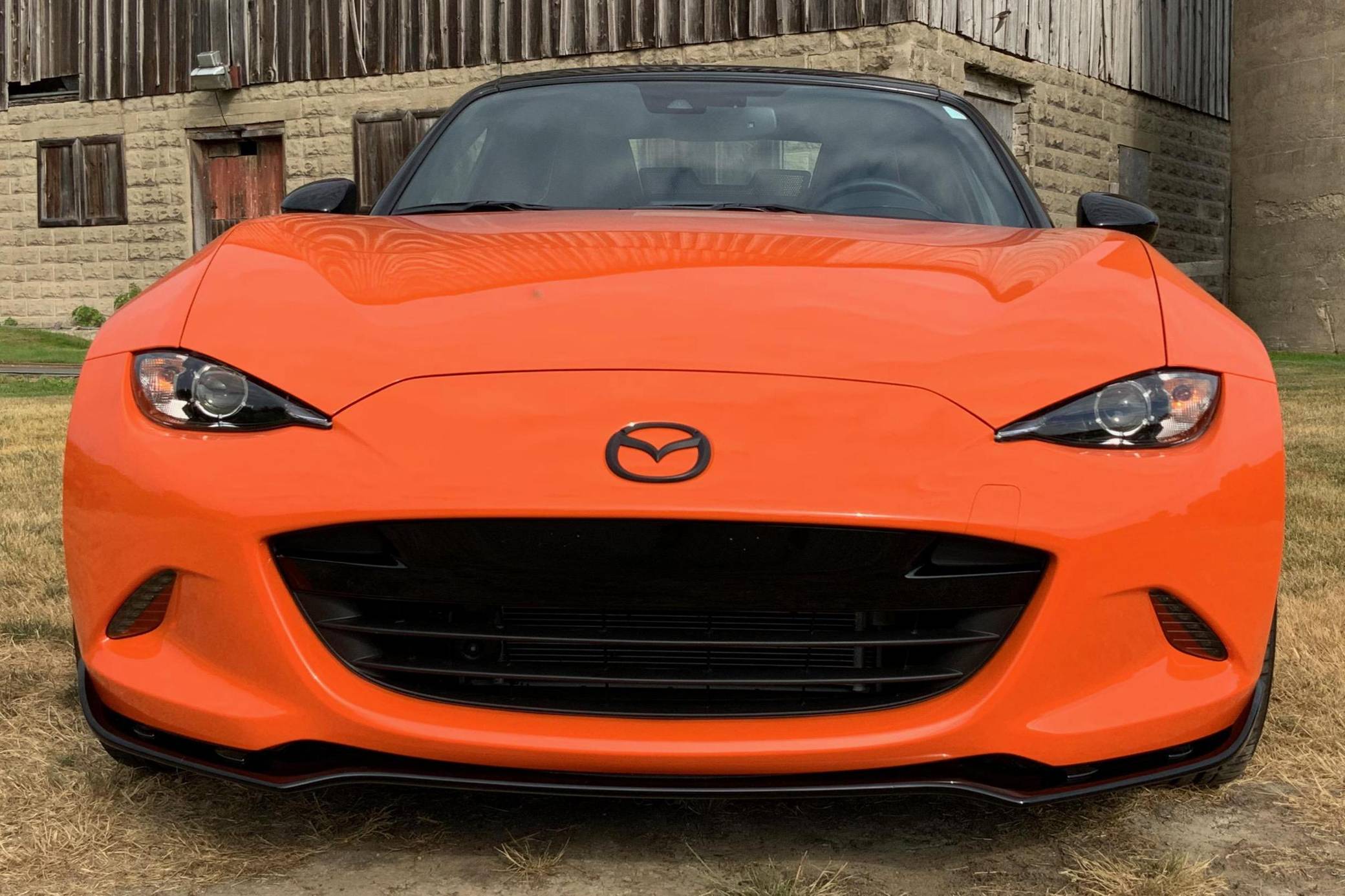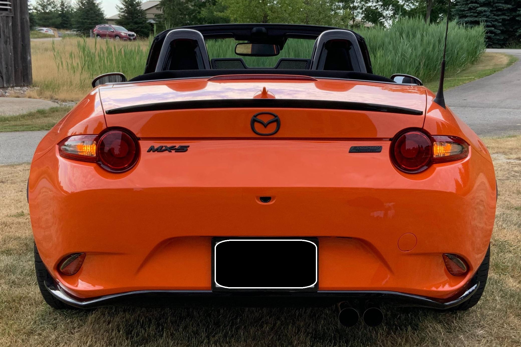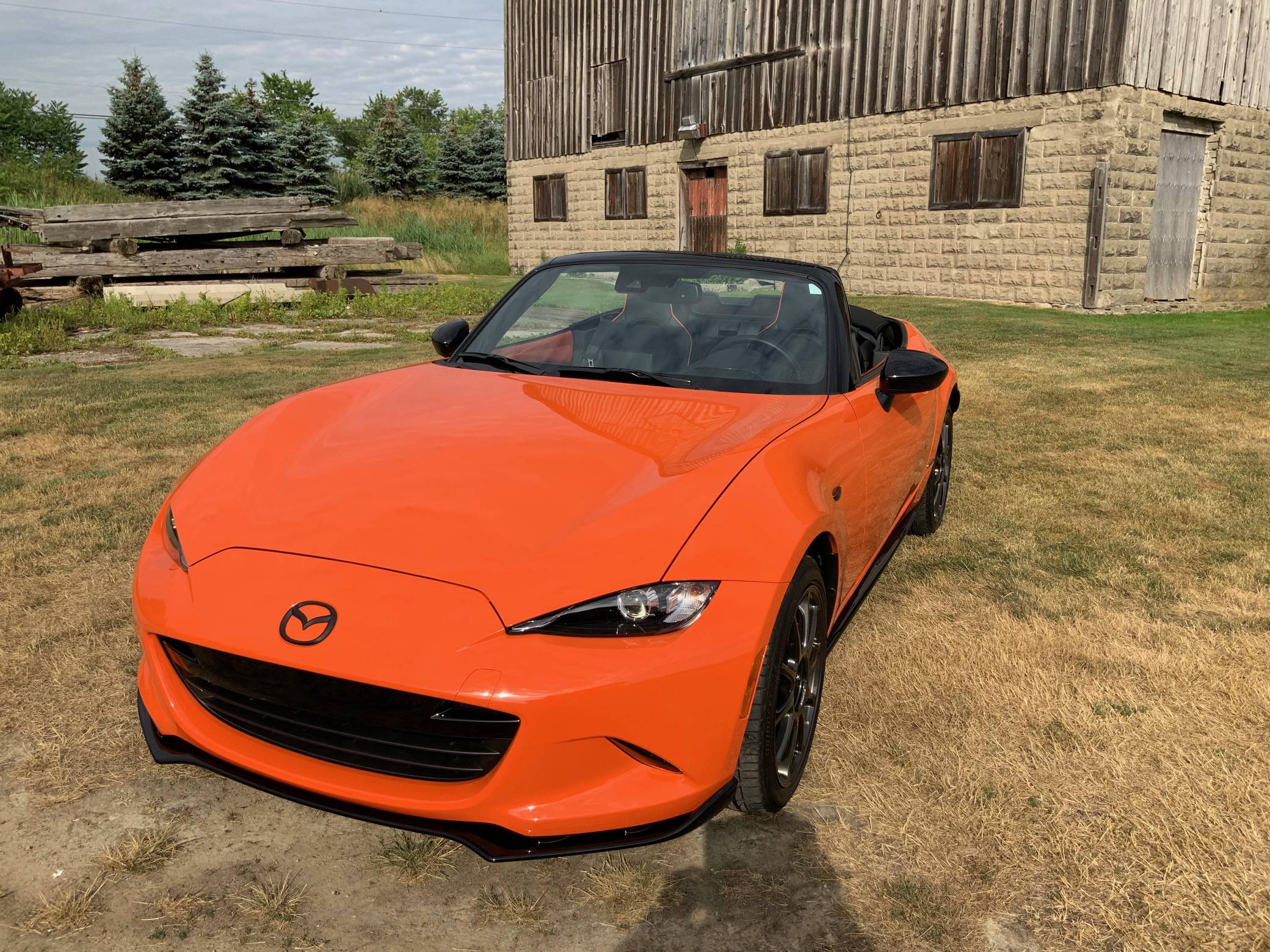 2019 Mazda MX-5 Miata 30th Anniversary Edition, finished in Racing Orange with a black soft top and a black interior. The instrument cluster is in metric units and the odometer currently displays approximately 5,100 kilometers or about 3,200 miles. This MX-5 is equipped with the desirable 6-speed manual transmission. Factory equipment includes 17-inch Rays forged wheels, a dealer-installed aero kit, Bilstein dampers, Brembo front brake calipers, aluminum hood and trunk lid, heated Recaro seats, a 9-speaker Bose sound system, and more detailed below. Modifications reported by the seller include LED tail lights and tinted LED side markers, chrome badges plasti-dipped black, and a corrosion control module. The "ND" Miata made its debut for the 2016 model year, and it strikes a balance as a modern, nicely-appointed roadster that still maintains the intended nature of a Miata as a fun, uncomplicated, and lightweight sports car at an accessible price. The "ND2" model arrived for the 2019 model year with revisions to the engine (including more power and a higher redline), a telescoping steering column, revised seat controls, and a new cupholder, among other improvements. It's still sold new in 2022. The 30th Anniversary Edition differentiates itself from other trim levels with a distinct - Racing Orange paint, Rays forged wheels, orange-painted brake calipers, and orange accents throughout the interior, as well as a few other unique features. 3,000 units were built, and this car is number 1920. Power comes from a 2. 0-liter 4-cylinder engine, rated at 181 horsepower and 151 lb-ft of torque. Output is sent to the rear wheels via a 6-speed manual transmission.