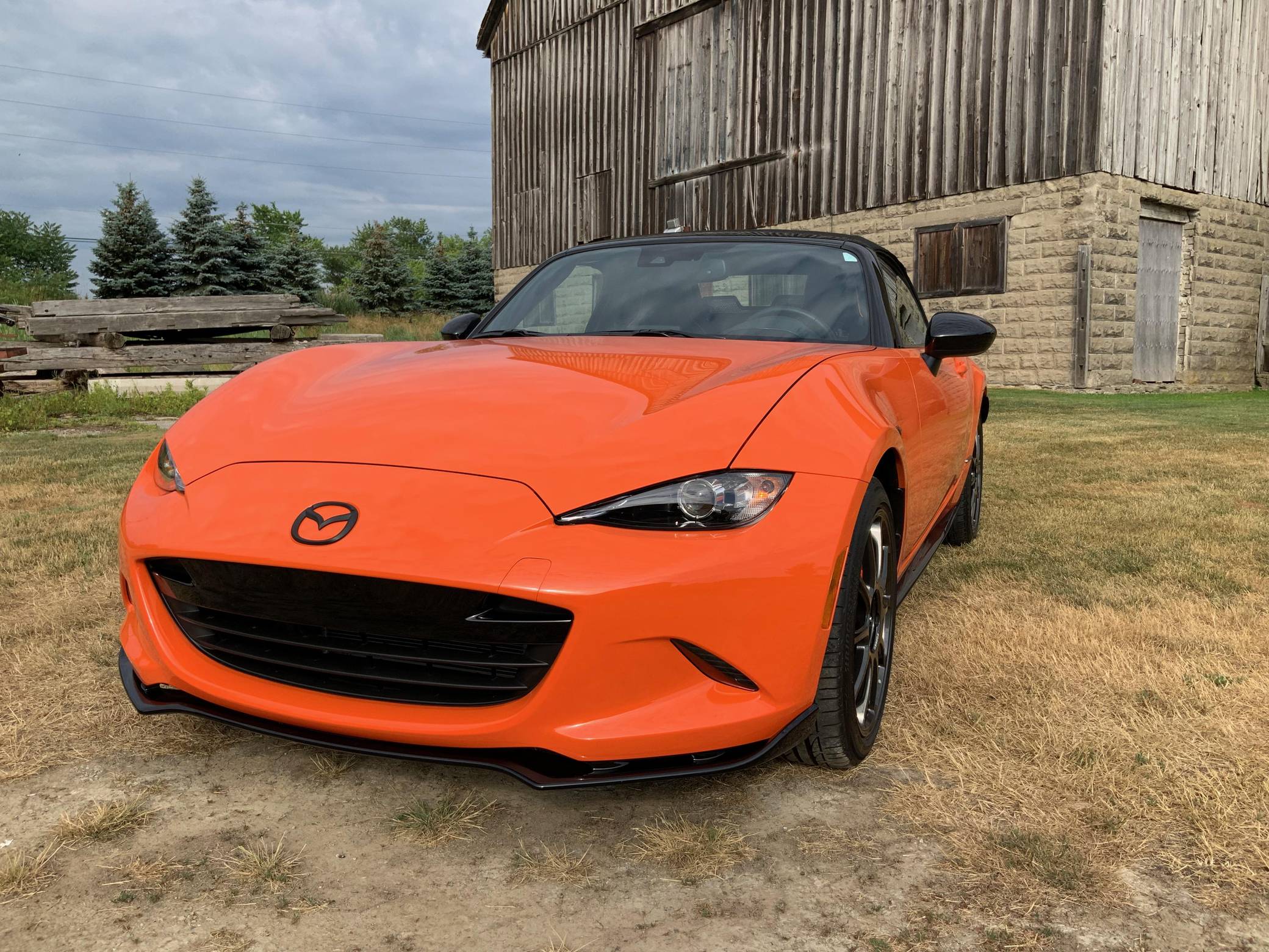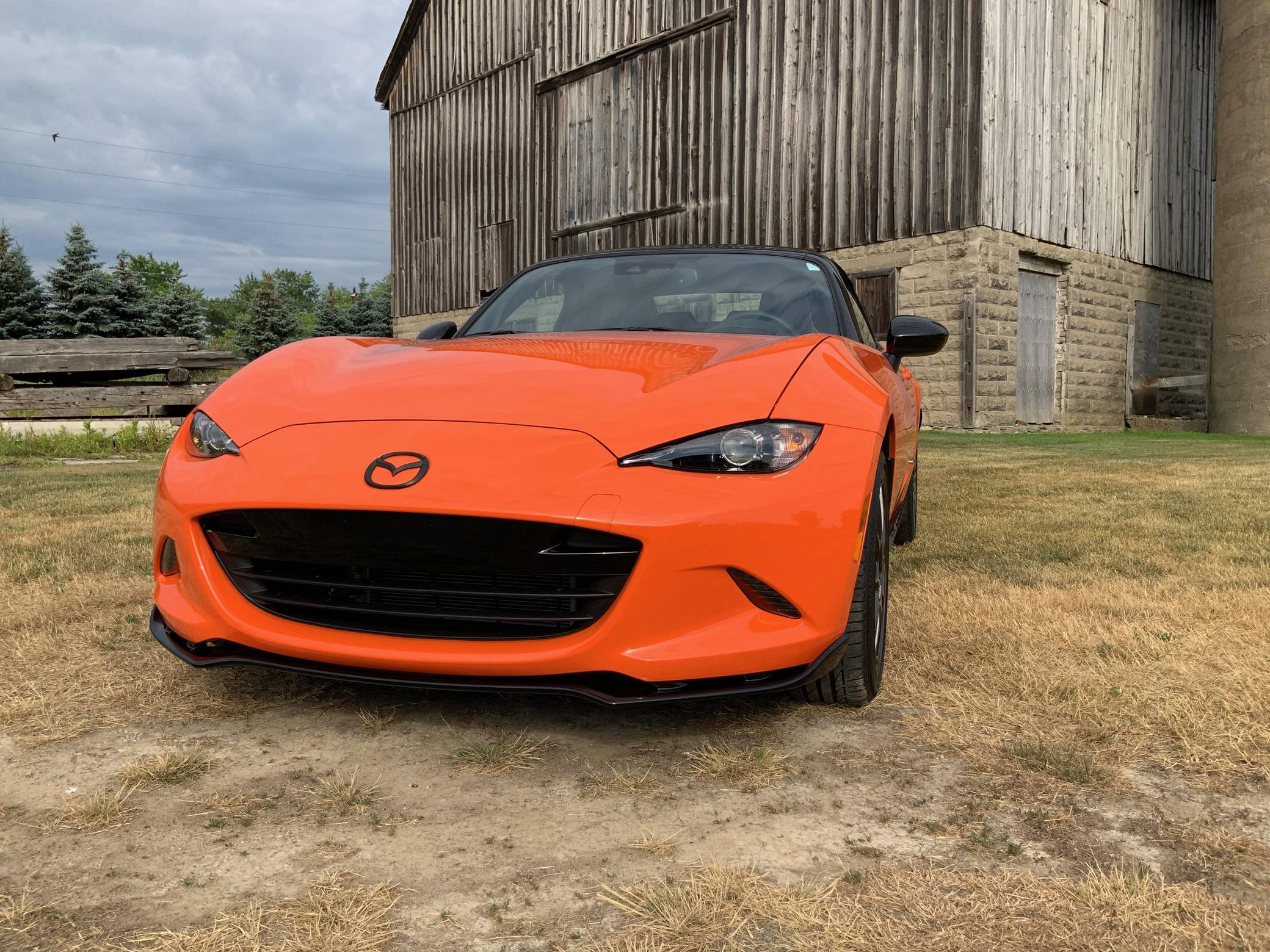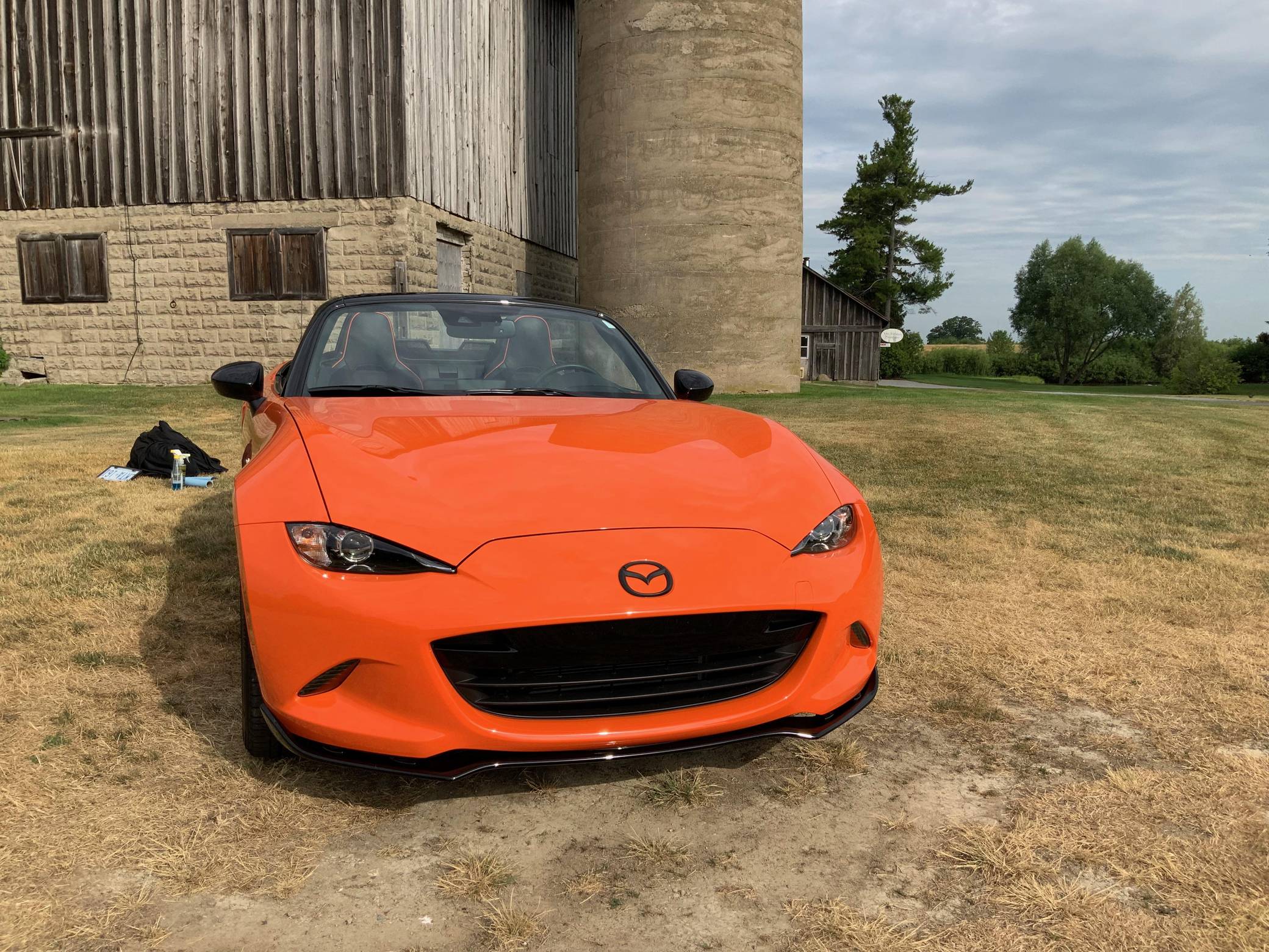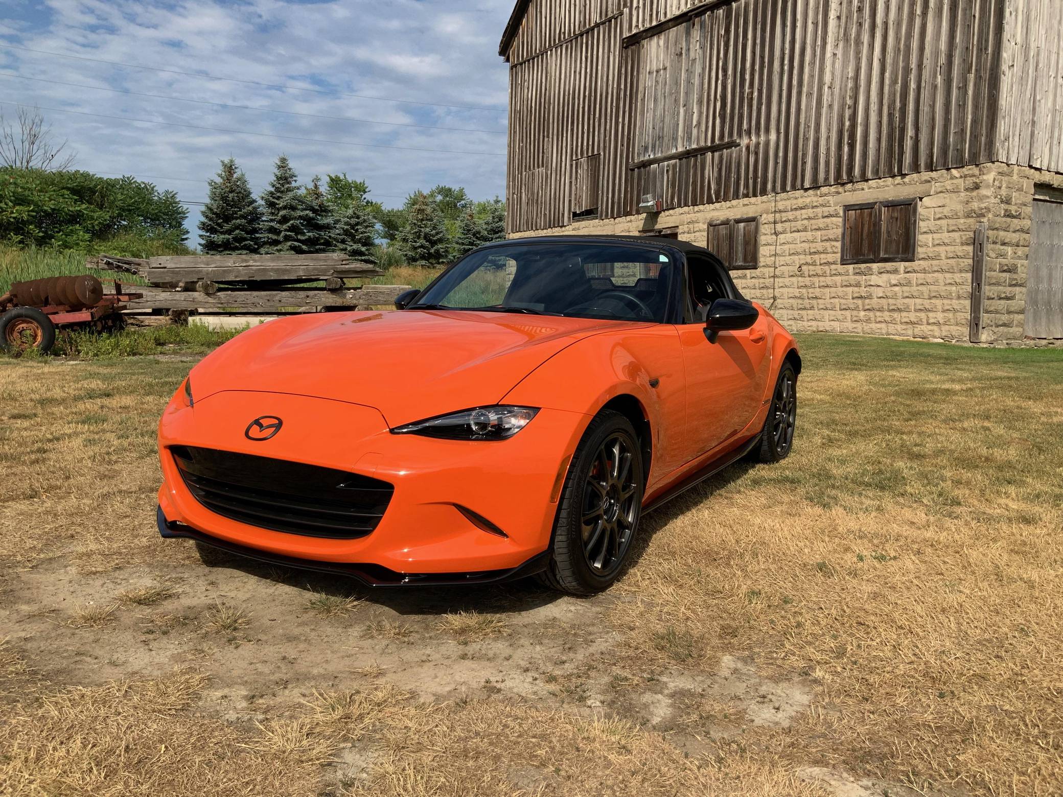 2019 Mazda MX-5 Miata 30th Anniversary Edition, finished in Racing Orange with a black soft top and a black interior. The instrument cluster is in metric units and the odometer currently displays approximately 5,100 kilometers or about 3,200 miles. This MX-5 is equipped with the desirable 6-speed manual transmission. Factory equipment includes 17-inch Rays forged wheels, a dealer-installed aero kit, Bilstein dampers, Brembo front brake calipers, aluminum hood and trunk lid, heated Recaro seats, a 9-speaker Bose sound system, and more detailed below. Modifications reported by the seller include LED tail lights and tinted LED side markers, chrome badges plasti-dipped black, and a corrosion control module. The "ND" Miata made its debut for the 2016 model year, and it strikes a balance as a modern, nicely-appointed roadster that still maintains the intended nature of a Miata as a fun, uncomplicated, and lightweight sports car at an accessible price. The "ND2" model arrived for the 2019 model year with revisions to the engine (including more power and a higher redline), a telescoping steering column, revised seat controls, and a new cupholder, among other improvements. It's still sold new in 2022. The 30th Anniversary Edition differentiates itself from other trim levels with a distinct - Racing Orange paint, Rays forged wheels, orange-painted brake calipers, and orange accents throughout the interior, as well as a few other unique features. 3,000 units were built, and this car is number 1920. Power comes from a 2. 0-liter 4-cylinder engine, rated at 181 horsepower and 151 lb-ft of torque. Output is sent to the rear wheels via a 6-speed manual transmission.