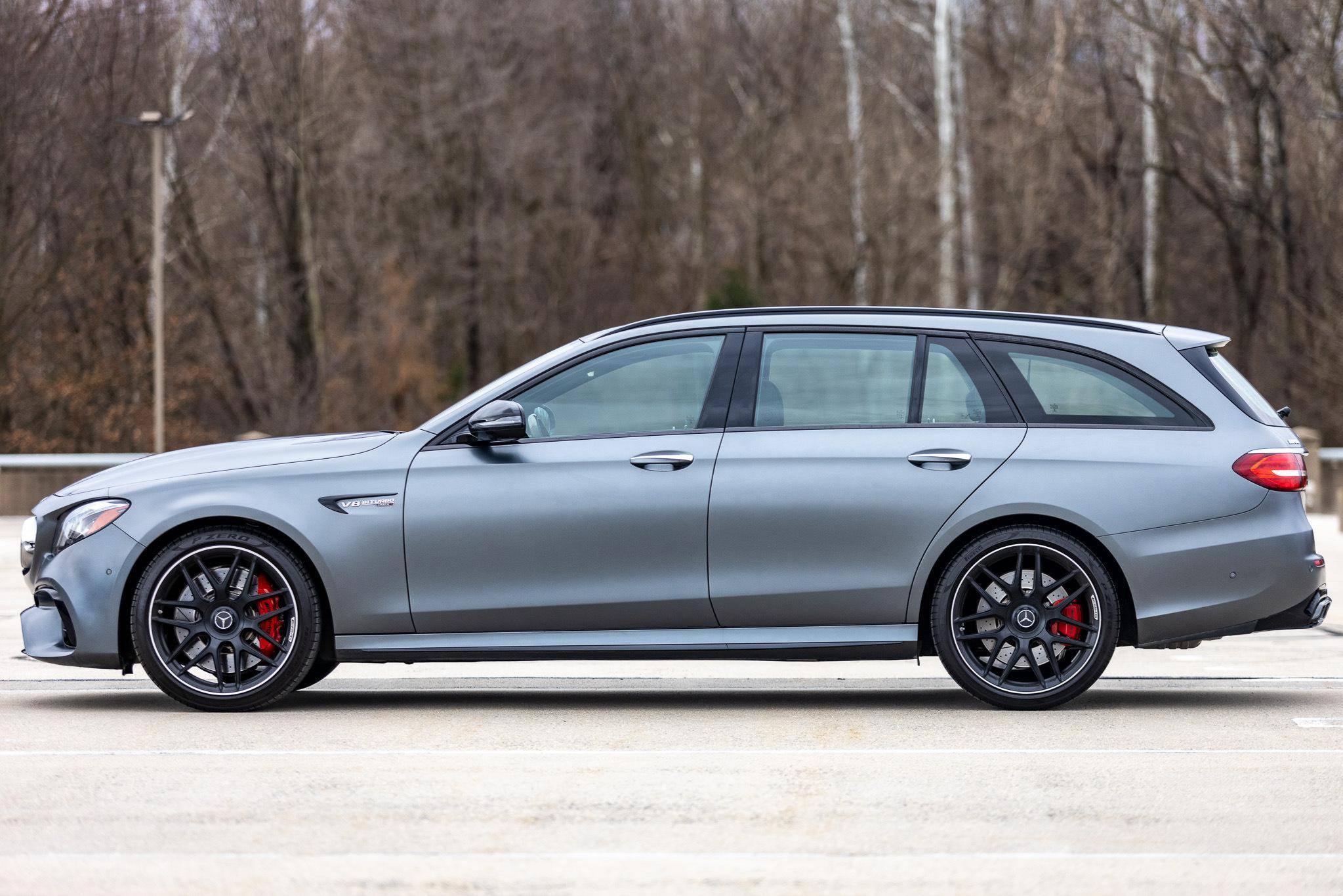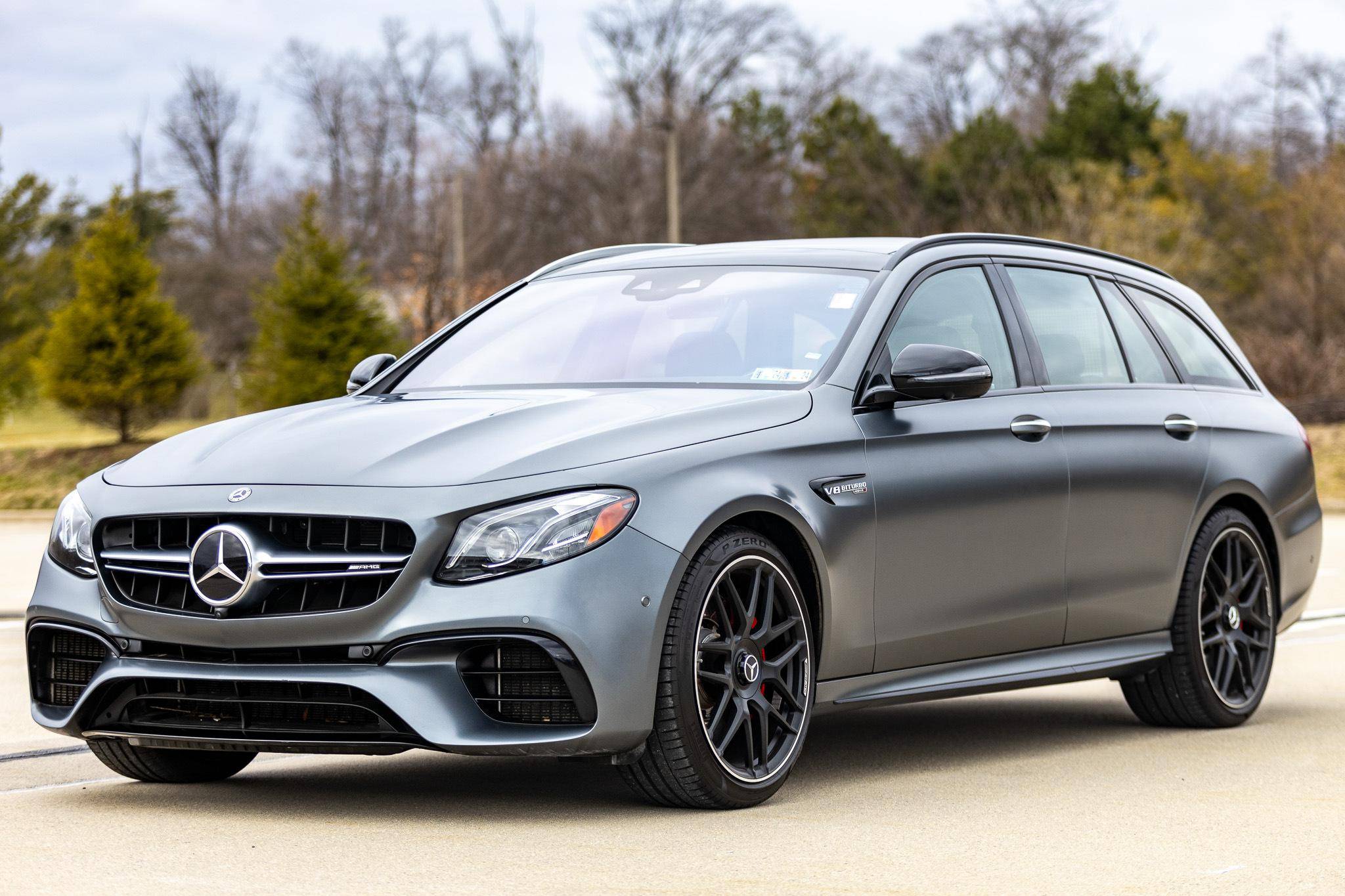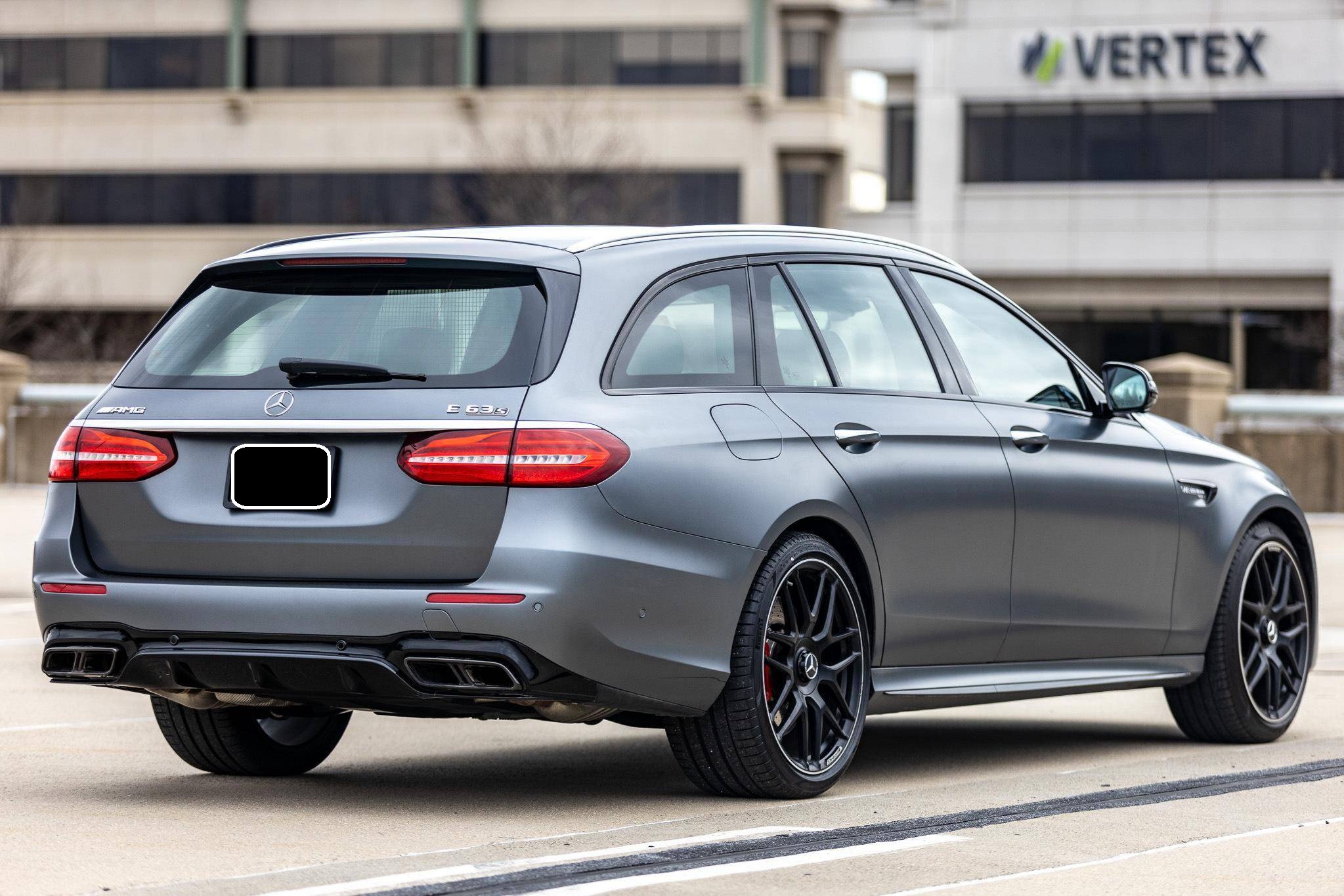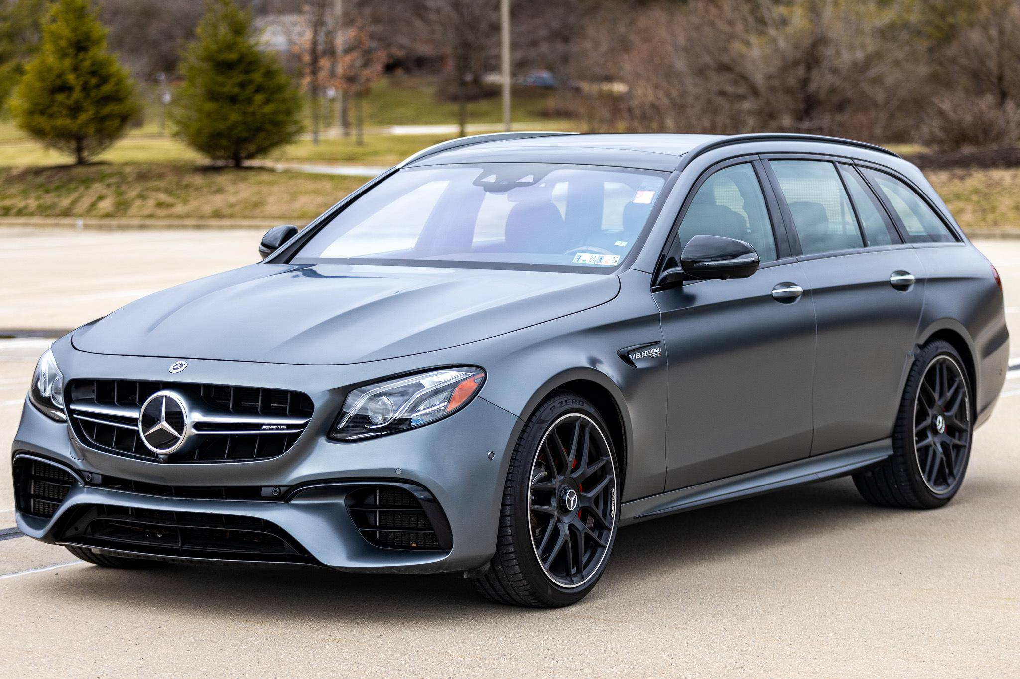 THIS… is a 2020 Mercedes-AMG E63 S Wagon, finished in Designo Selenite Grey Magno with a black interior. The seller reports no modifications. Released for 2018, the "W213"-based E63 and E63 S arrived with a more fluid design, a smaller yet more powerful engine, and a drift mode that can send 100% of the engine's torque to the rear wheels. The wagon variant (called "S213" internally) was exclusively offered in S tune, so it landed as the most expensive member of the E-Class range. Power comes from an "M177" twin-turbocharged 4. 0-liter V8, rated at 603 horsepower and 627 lb-ft of torque. Hand-built, it spins the four wheels via a 9-speed automatic transmission and Mercedes-Benz's 4Matic permanent all-wheel drive system.