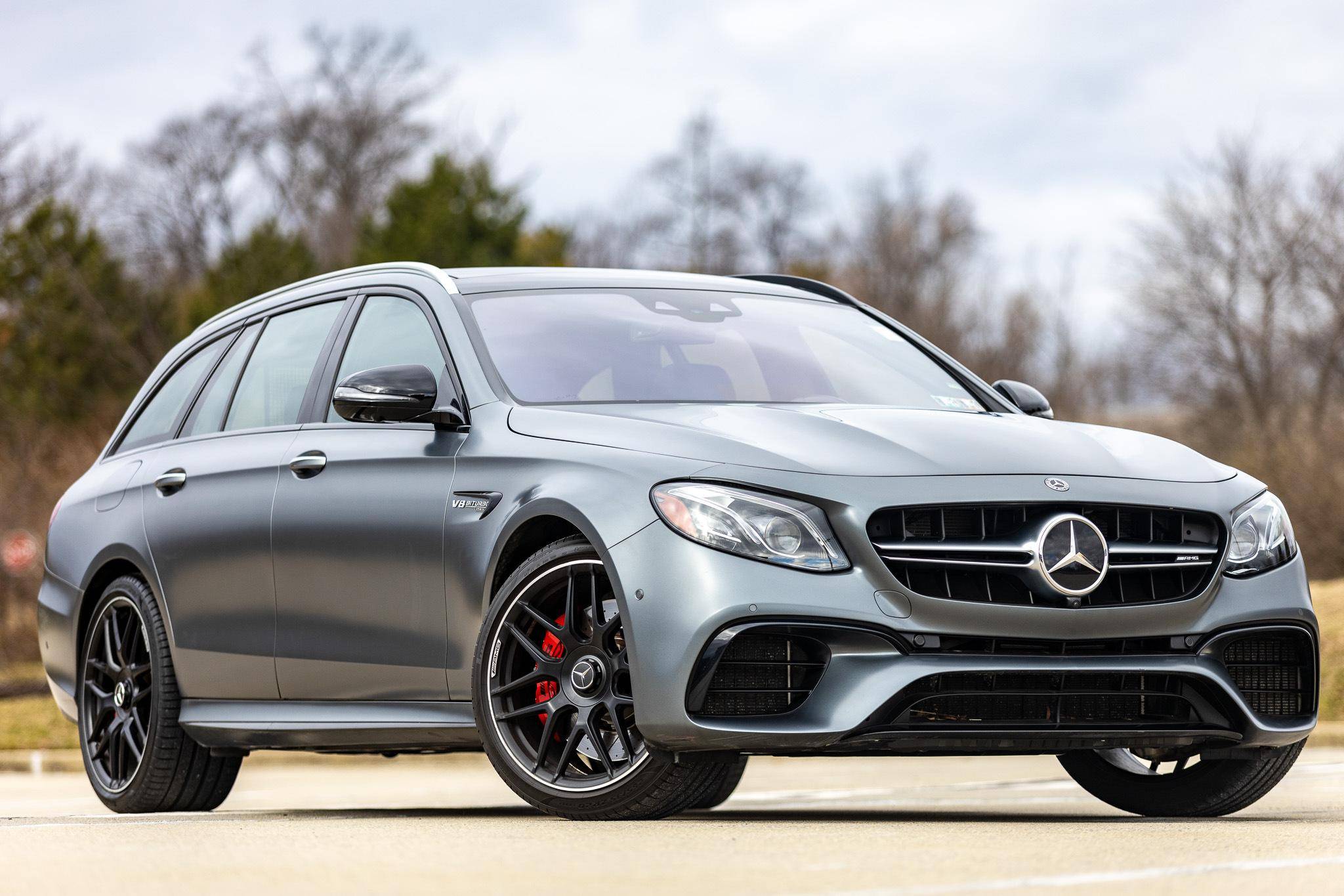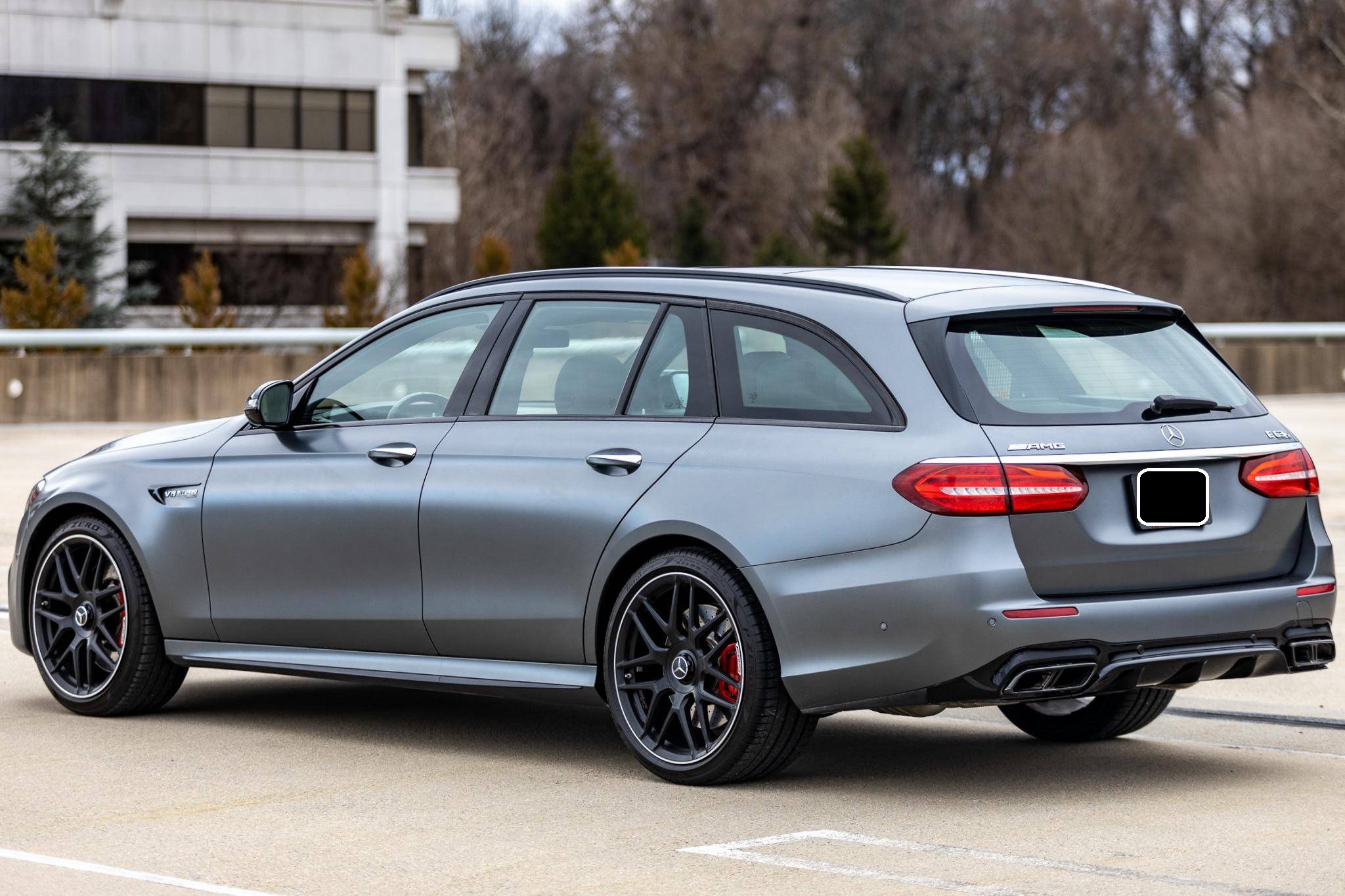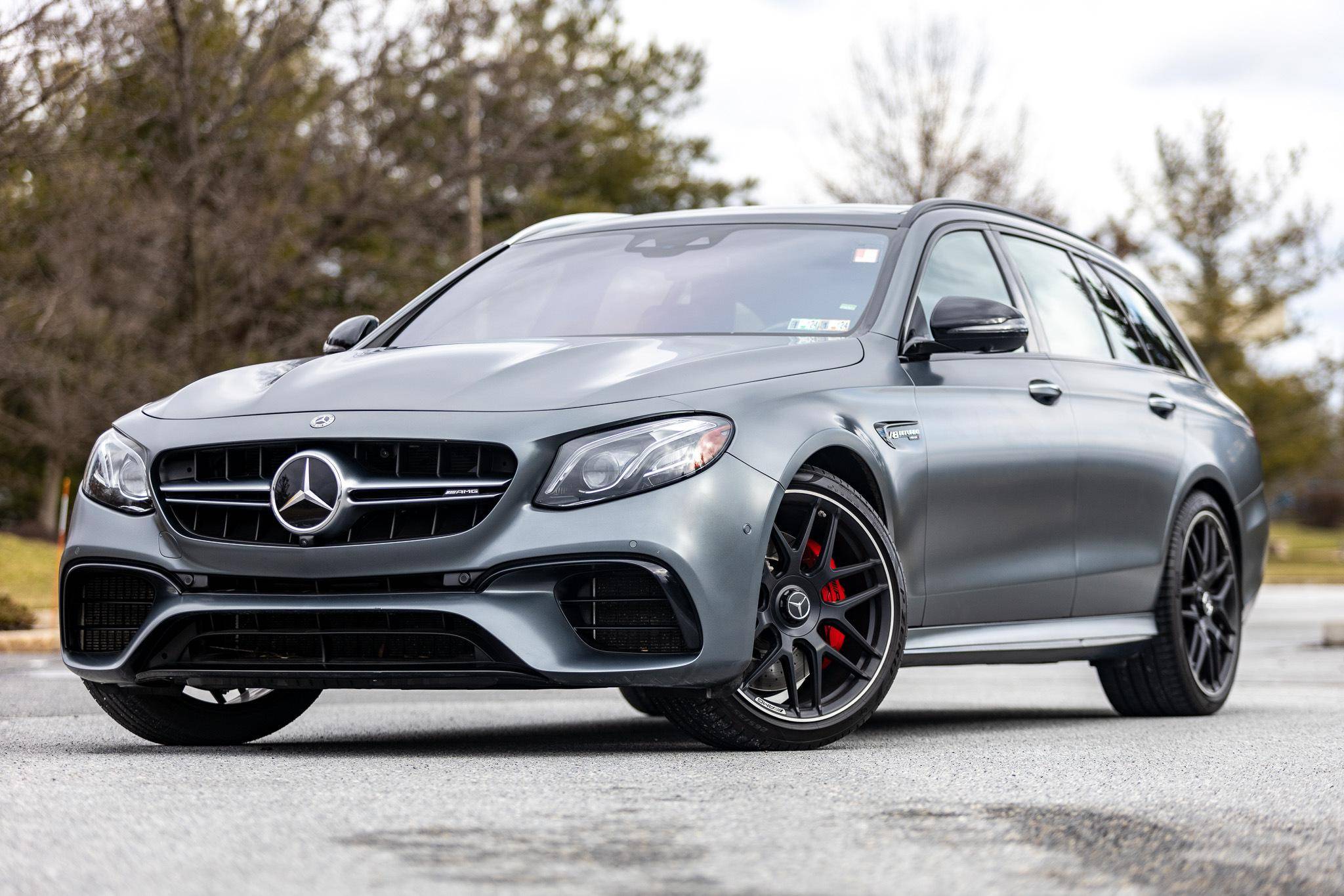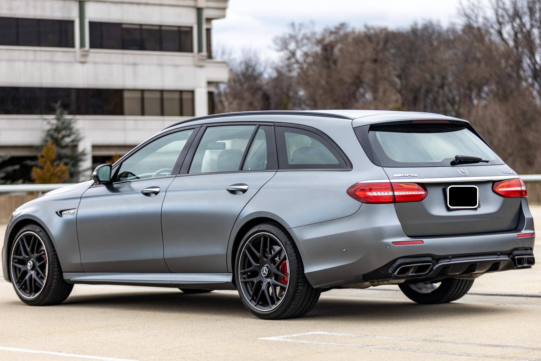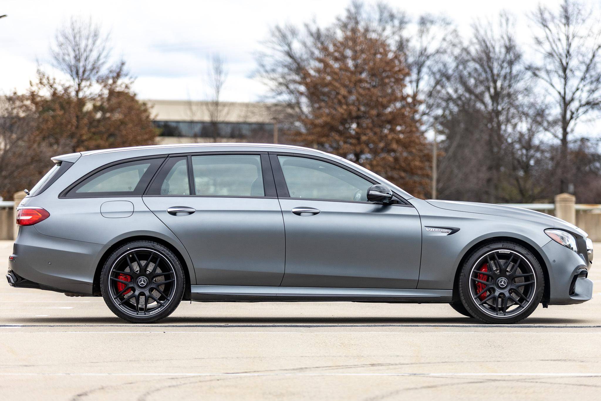 THIS… is a 2020 Mercedes-AMG E63 S Wagon, finished in Designo Selenite Grey Magno with a black interior. The seller reports no modifications. Released for 2018, the "W213"-based E63 and E63 S arrived with a more fluid design, a smaller yet more powerful engine, and a drift mode that can send 100% of the engine's torque to the rear wheels. The wagon variant (called "S213" internally) was exclusively offered in S tune, so it landed as the most expensive member of the E-Class range. Power comes from an "M177" twin-turbocharged 4. 0-liter V8, rated at 603 horsepower and 627 lb-ft of torque. Hand-built, it spins the four wheels via a 9-speed automatic transmission and Mercedes-Benz's 4Matic permanent all-wheel drive system.