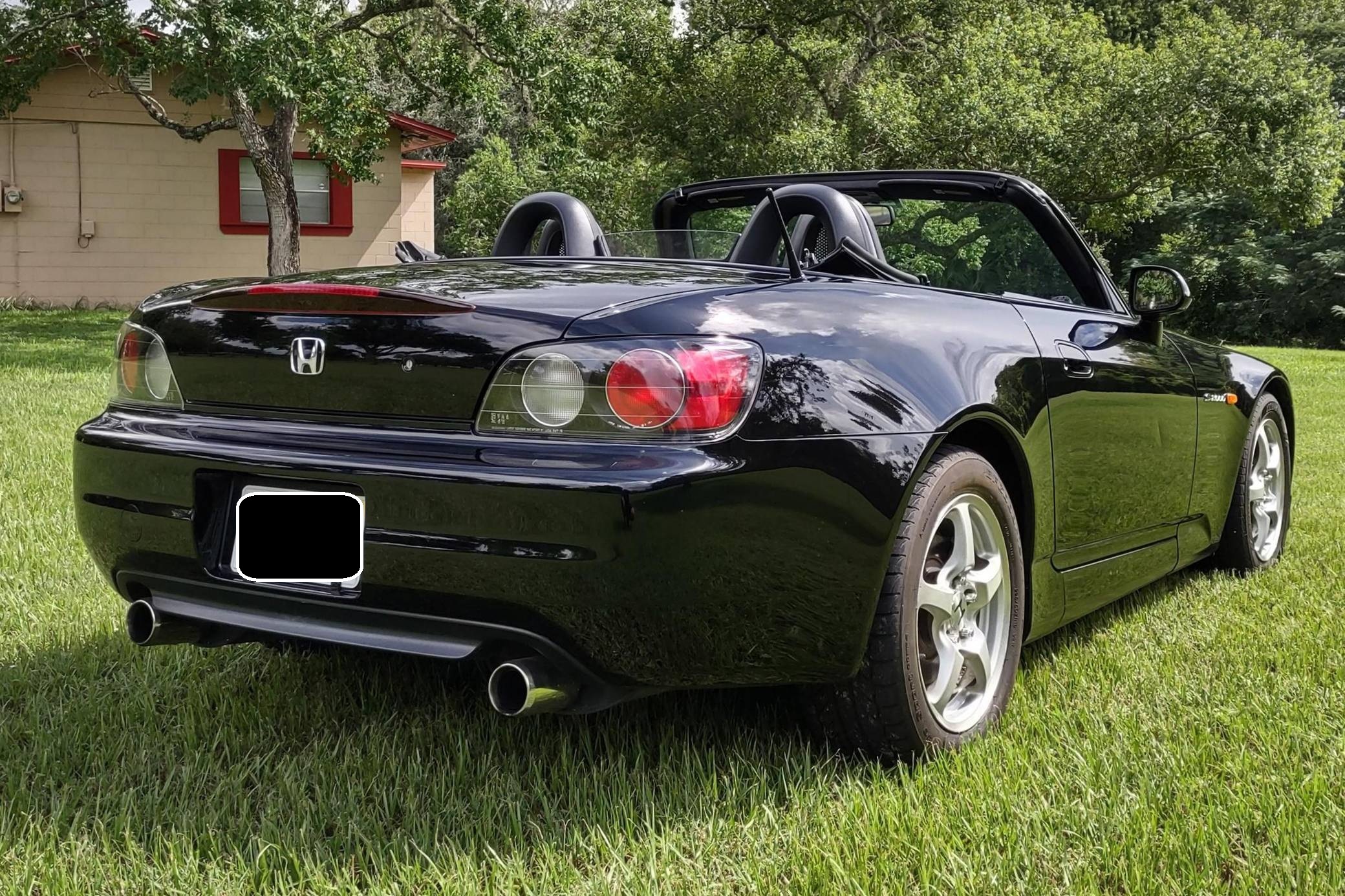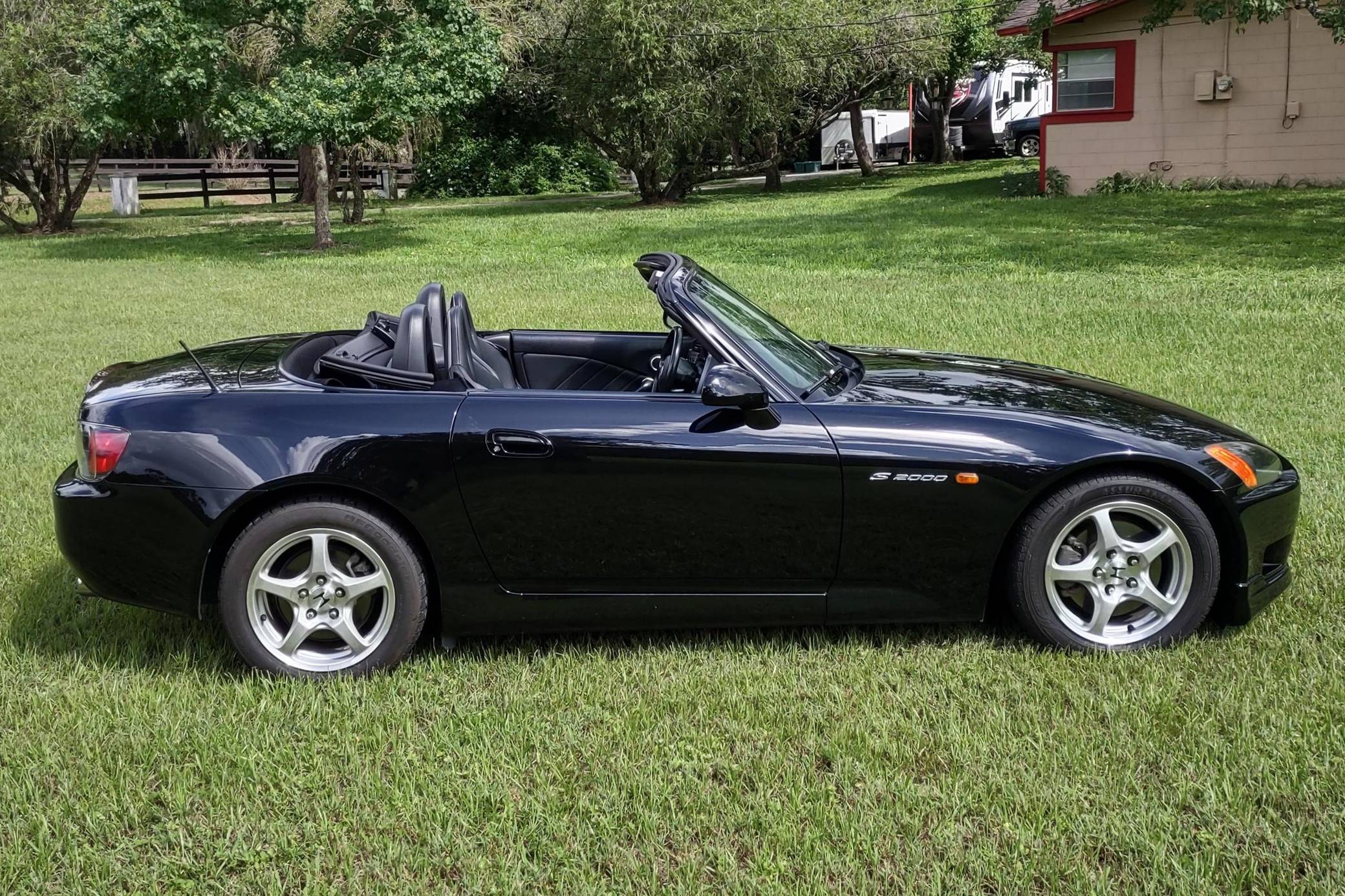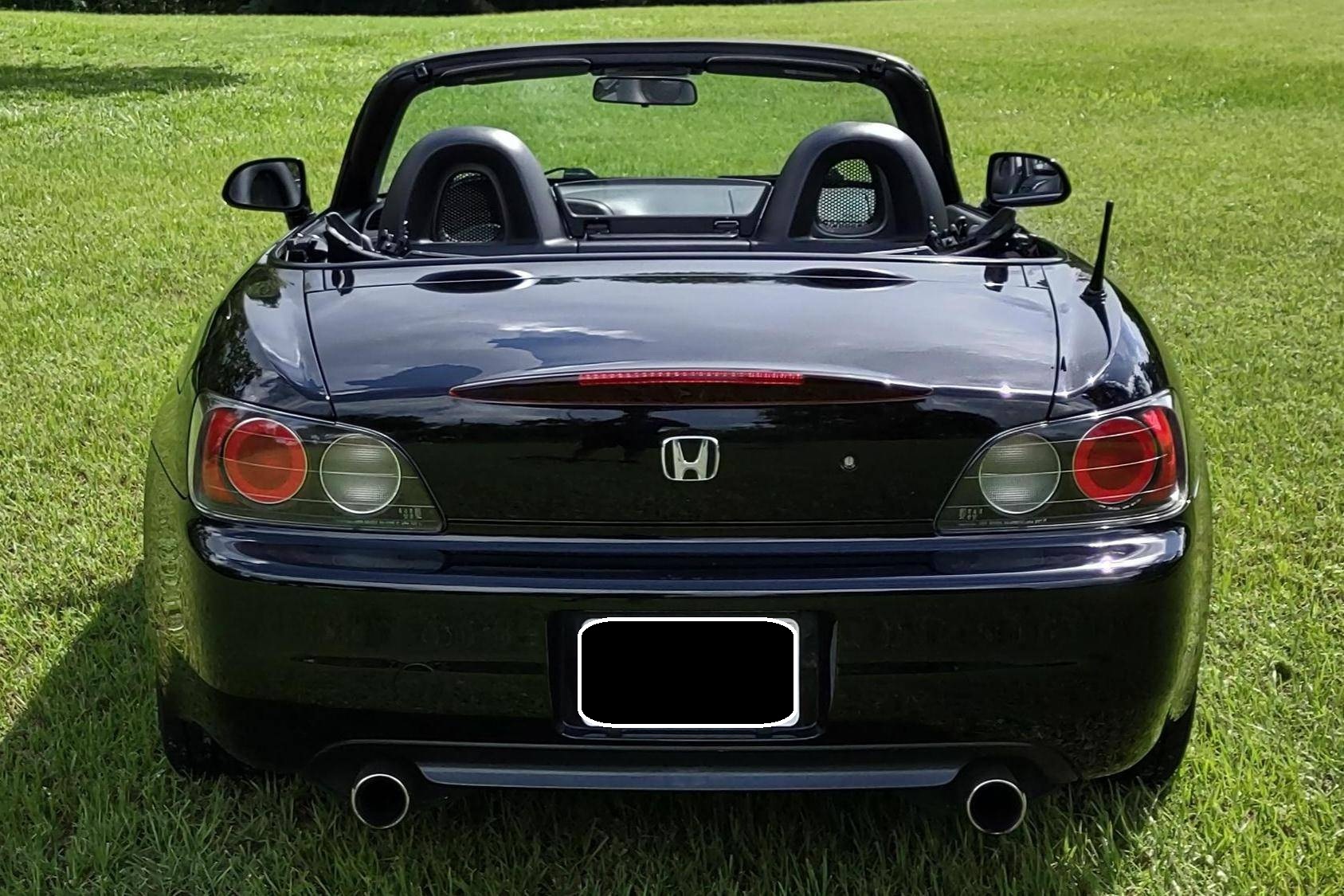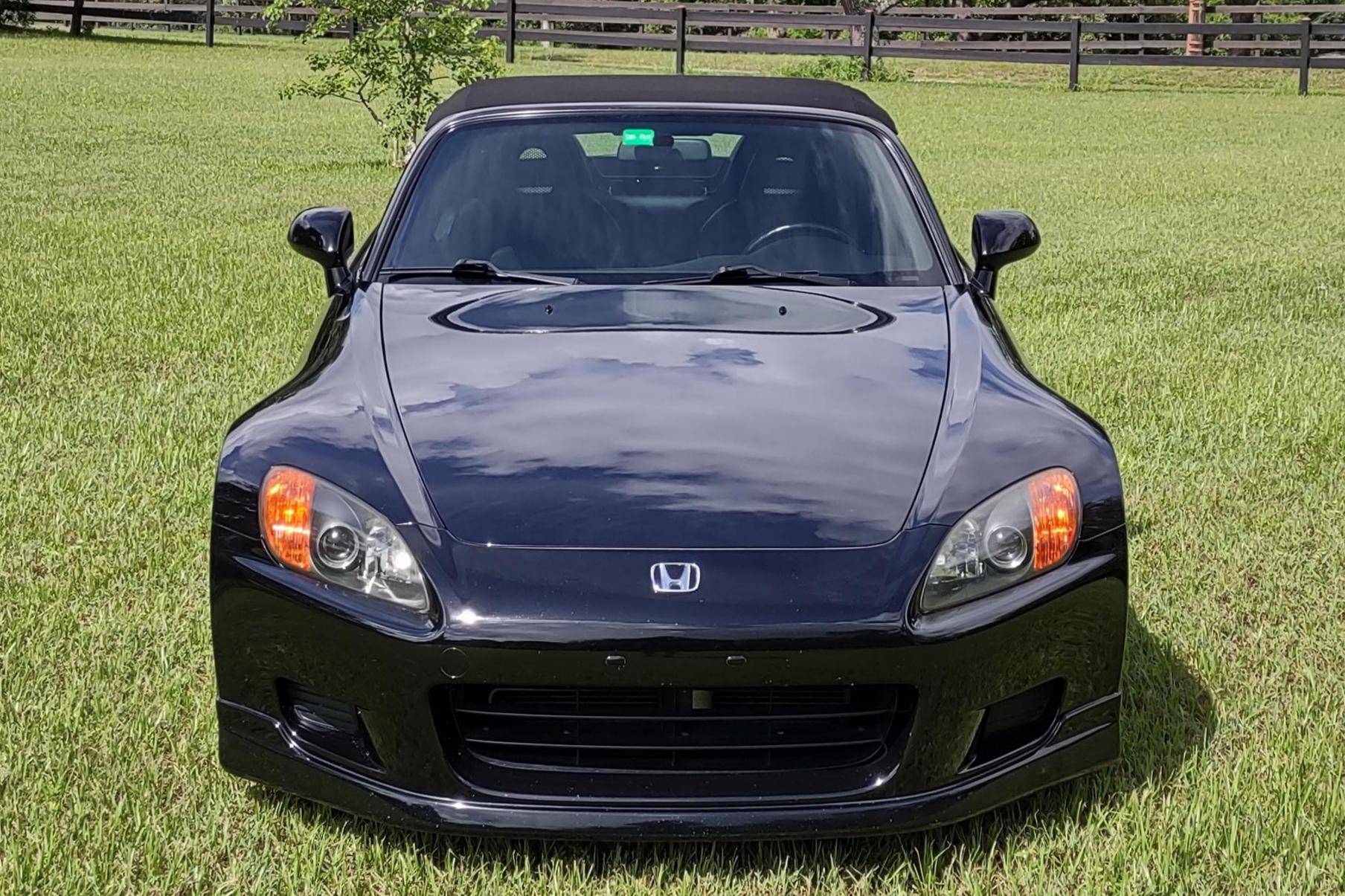 2002 Honda S2000, finished in Berlina Black with a black interior. Factory equipment includes 16-inch alloy wheels, a limited-slip differential, a power-retractable soft top, leather upholstery, an aluminum shift knob and pedals, air conditioning, cruise control, and a CD player. Modifications are limited to tinted windows. The Honda S2000 (known as "AP1" internally) was introduced for the 2000 model year; its model designation references the engine's 2000cc displacement, and its per-liter output was the highest of any naturally aspirated regular-production car. The AP1 also boasted 50/50 weight distribution and independently-sprung, double-wishbone suspension at each corner. Power comes from a 2. 0-liter inline-4 with VTEC technology, rated at 240 horsepower and 153 lb-ft of torque. Output is sent to the rear wheels via a 6-speed manual transmission.