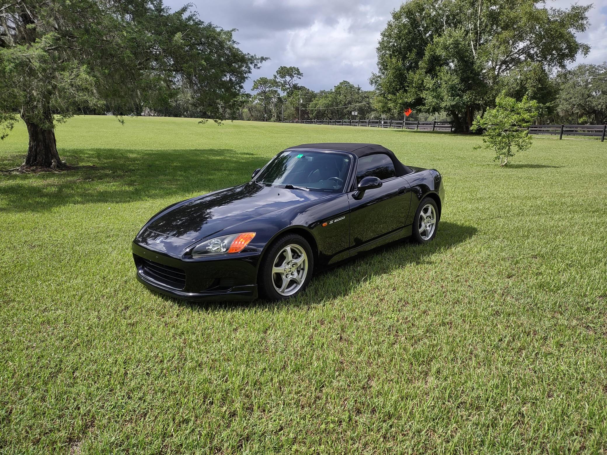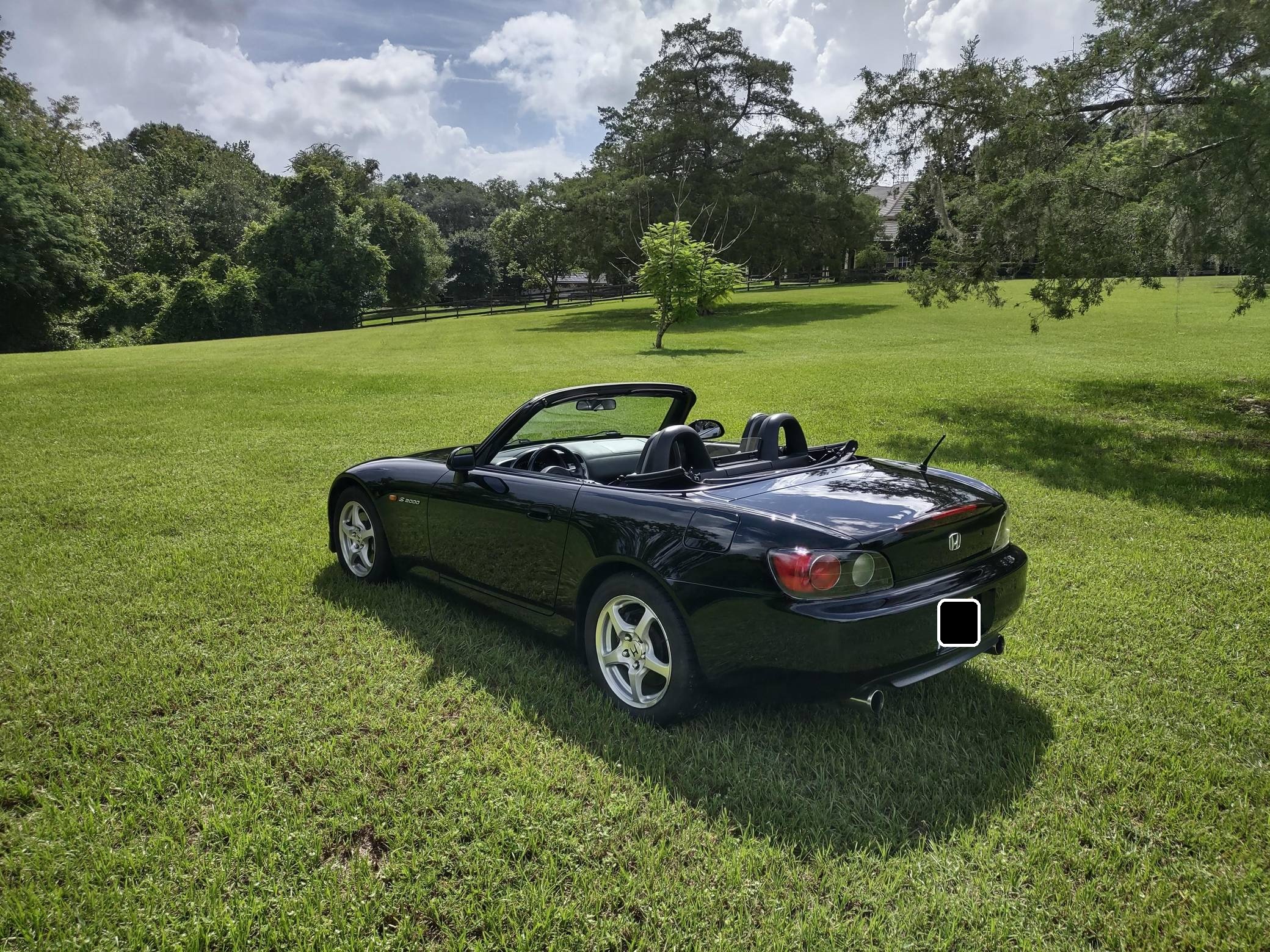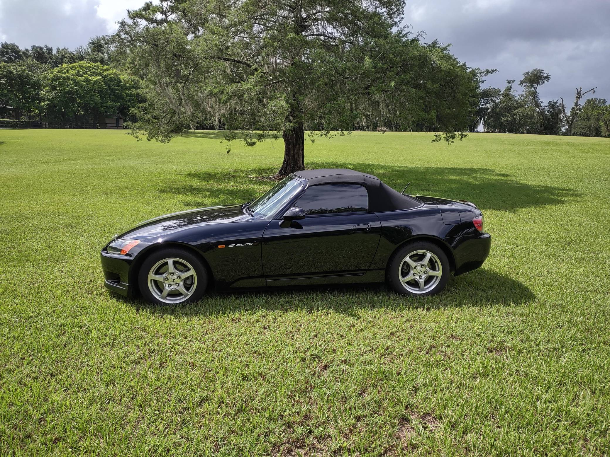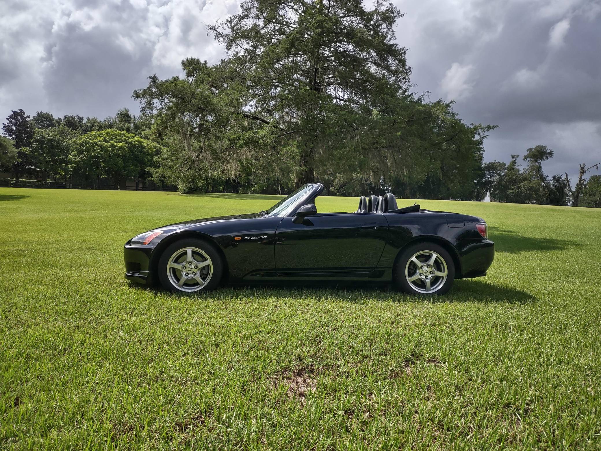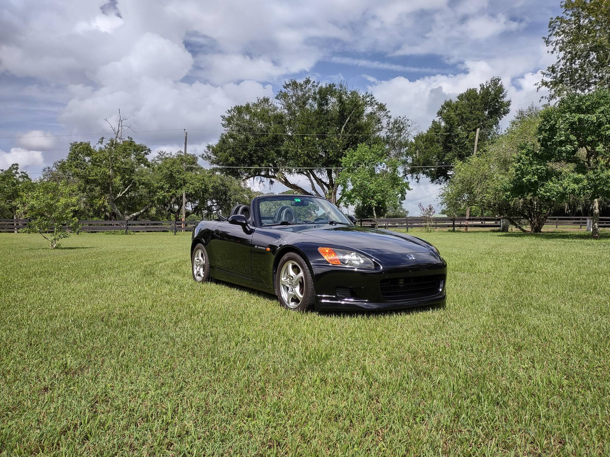 2002 Honda S2000, finished in Berlina Black with a black interior. Factory equipment includes 16-inch alloy wheels, a limited-slip differential, a power-retractable soft top, leather upholstery, an aluminum shift knob and pedals, air conditioning, cruise control, and a CD player. Modifications are limited to tinted windows. The Honda S2000 (known as "AP1" internally) was introduced for the 2000 model year; its model designation references the engine's 2000cc displacement, and its per-liter output was the highest of any naturally aspirated regular-production car. The AP1 also boasted 50/50 weight distribution and independently-sprung, double-wishbone suspension at each corner. Power comes from a 2. 0-liter inline-4 with VTEC technology, rated at 240 horsepower and 153 lb-ft of torque. Output is sent to the rear wheels via a 6-speed manual transmission.