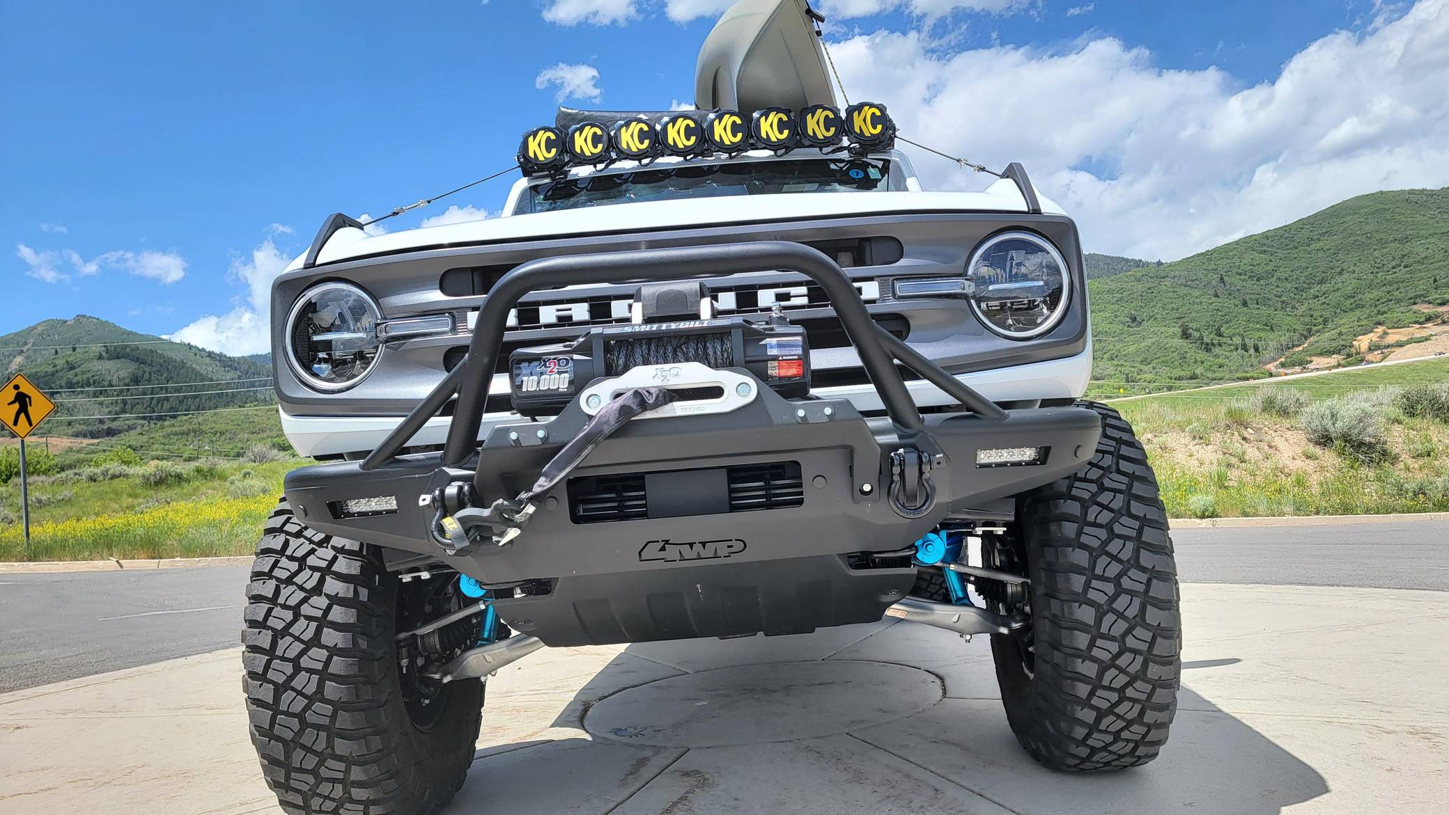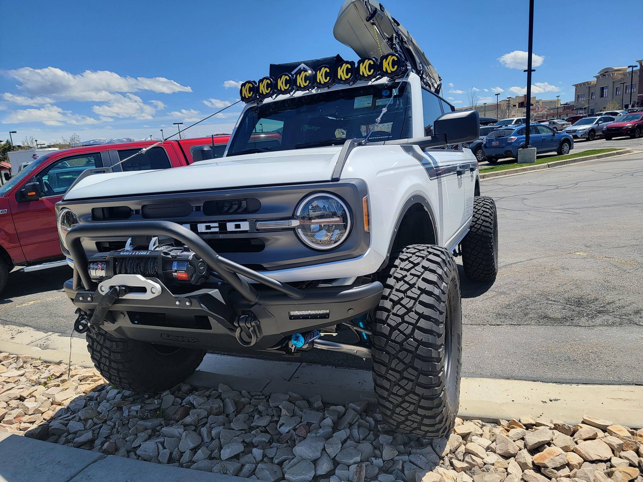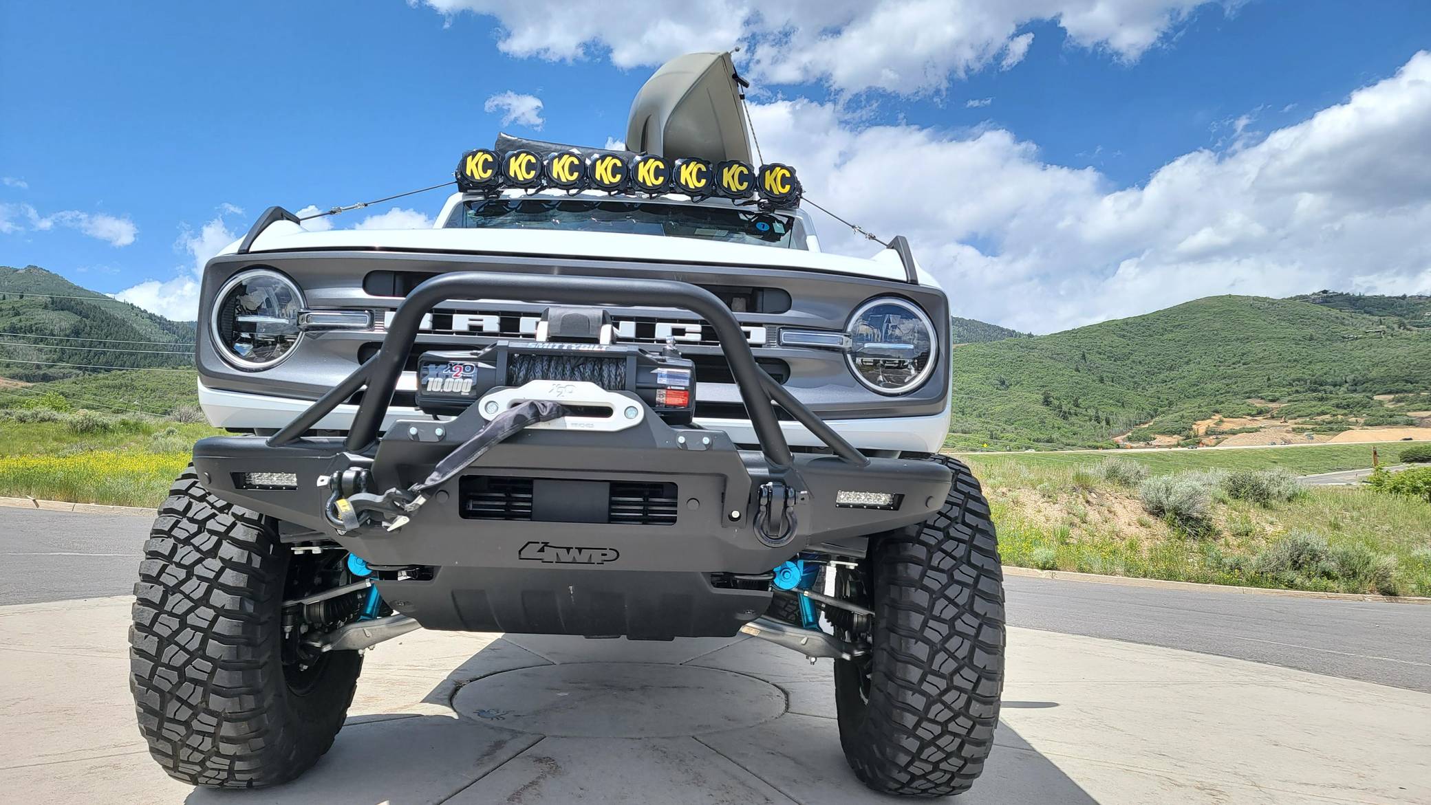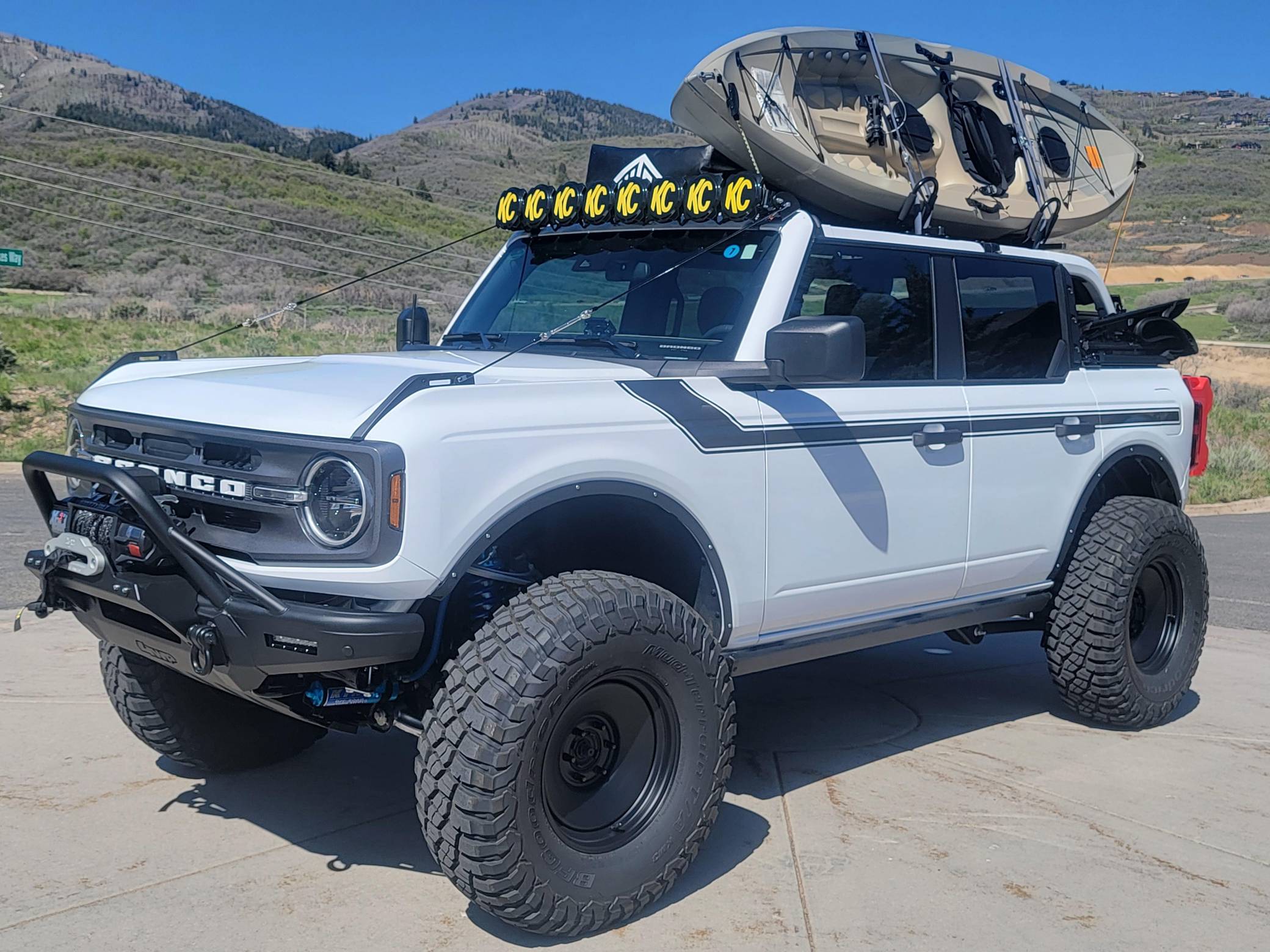 2021 Ford Bronco Big Bend, finished in Oxford White with a black and tan interior. This Bronco features the desirable 7-speed manual transmission, and its odometer currently indicates approximately 800 miles. Standard equipment on this Big Bend-trim Bronco includes a removable soft top and doors, three tow hooks, remote keyless entry, an 8-inch LCD instrument cluster, the Terrain Management System with 6 G. O. A. T. modes, a 6-speaker audio system, and more as detailed below. Modifications are extensive and include 4Wheel Parts front and rear steel bumpers, a King 2. 5-inch remote reservoir coilover suspension lift, a Smittybilt X20 10,000-lb waterproof wireless winch, custom fabricated rock sliders, Rough Country fender delete kit, 17-inch matte black US Wheels steel smoothies, and BF Goodrich Mud-Terrain T/A KM3 tires. A full list of modifications is shown below. The sixth-generation Bronco was introduced for the 2021 model year, ending a 25-year hiatus and nearly a decade of speculation about its return. Retro styling, body-on-frame construction, and a suite of off-road equipment help to ensure this truck lives up to the Bronco name. While the manual transmission and convertible soft top add to this Bronco's back-to-basics packaging, amenities like wireless Apple CarPlay and hill descent control bring a modern touch to the experience. Power comes from a 2. 3-liter turbocharged "Ecoboost" inline-four engine, rated at 300 horsepower and 325 lb-ft of torque. Output is sent to all four wheels via a 7-speed (6+1 crawler gear) manual transmission.