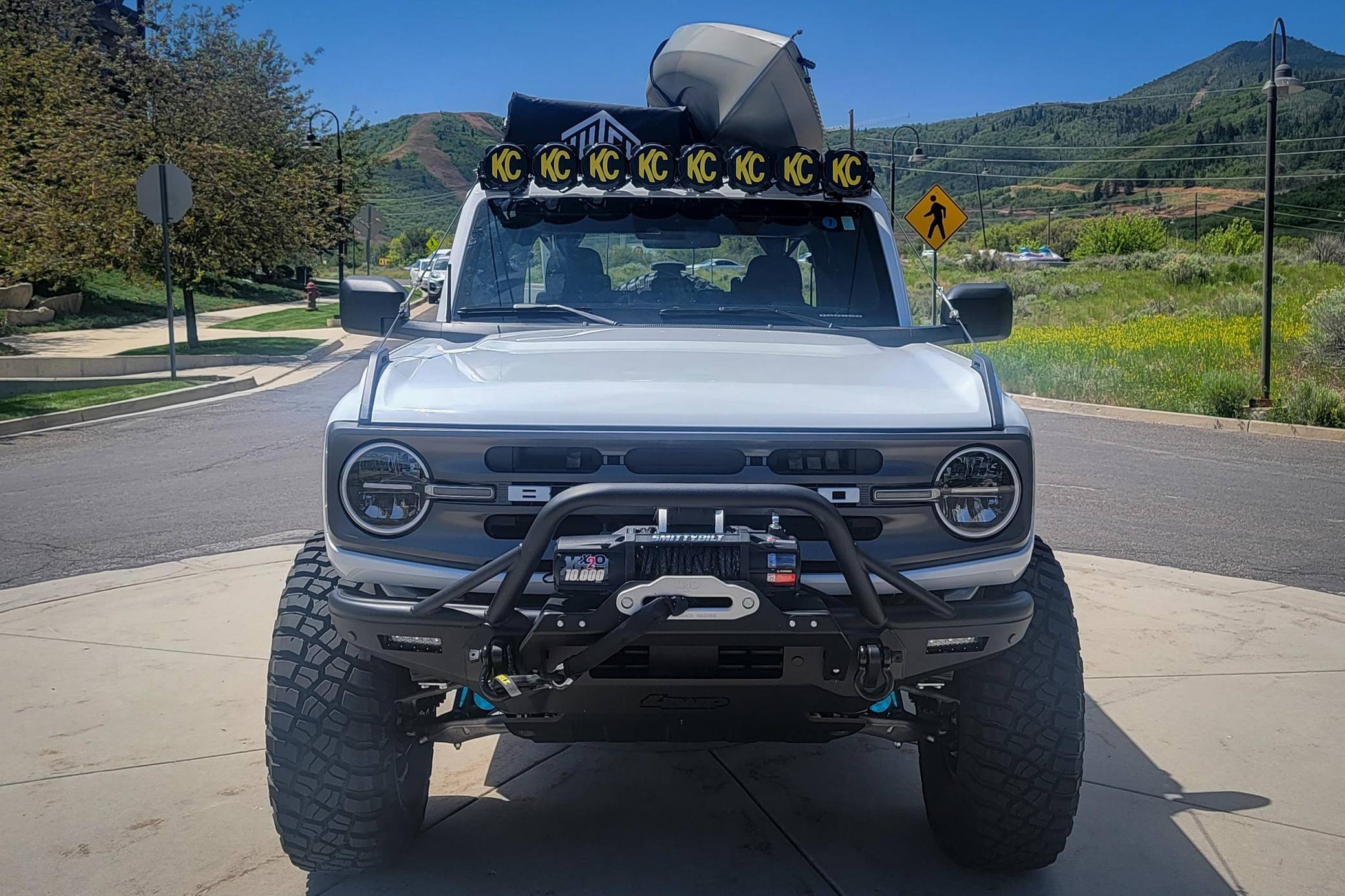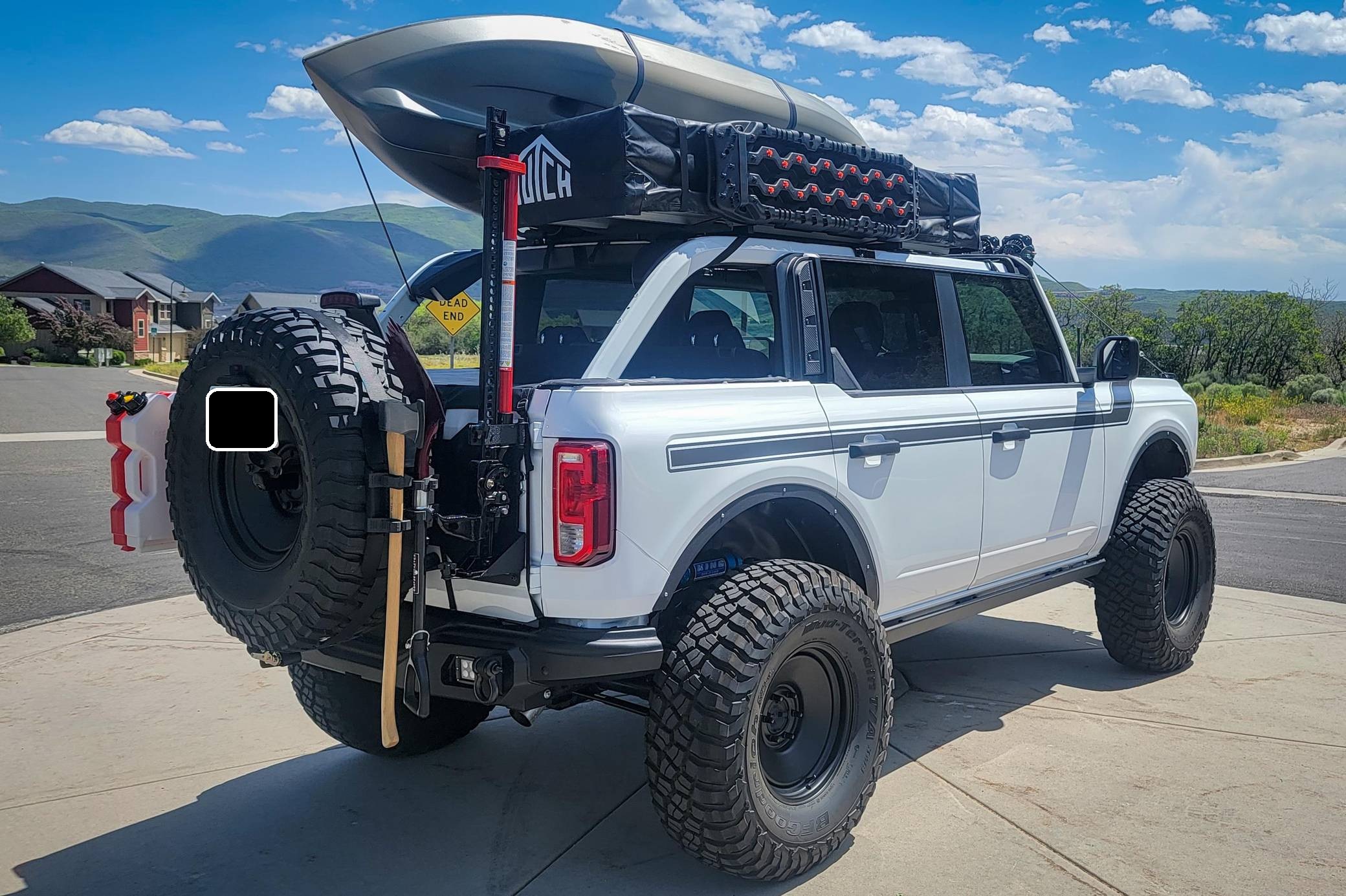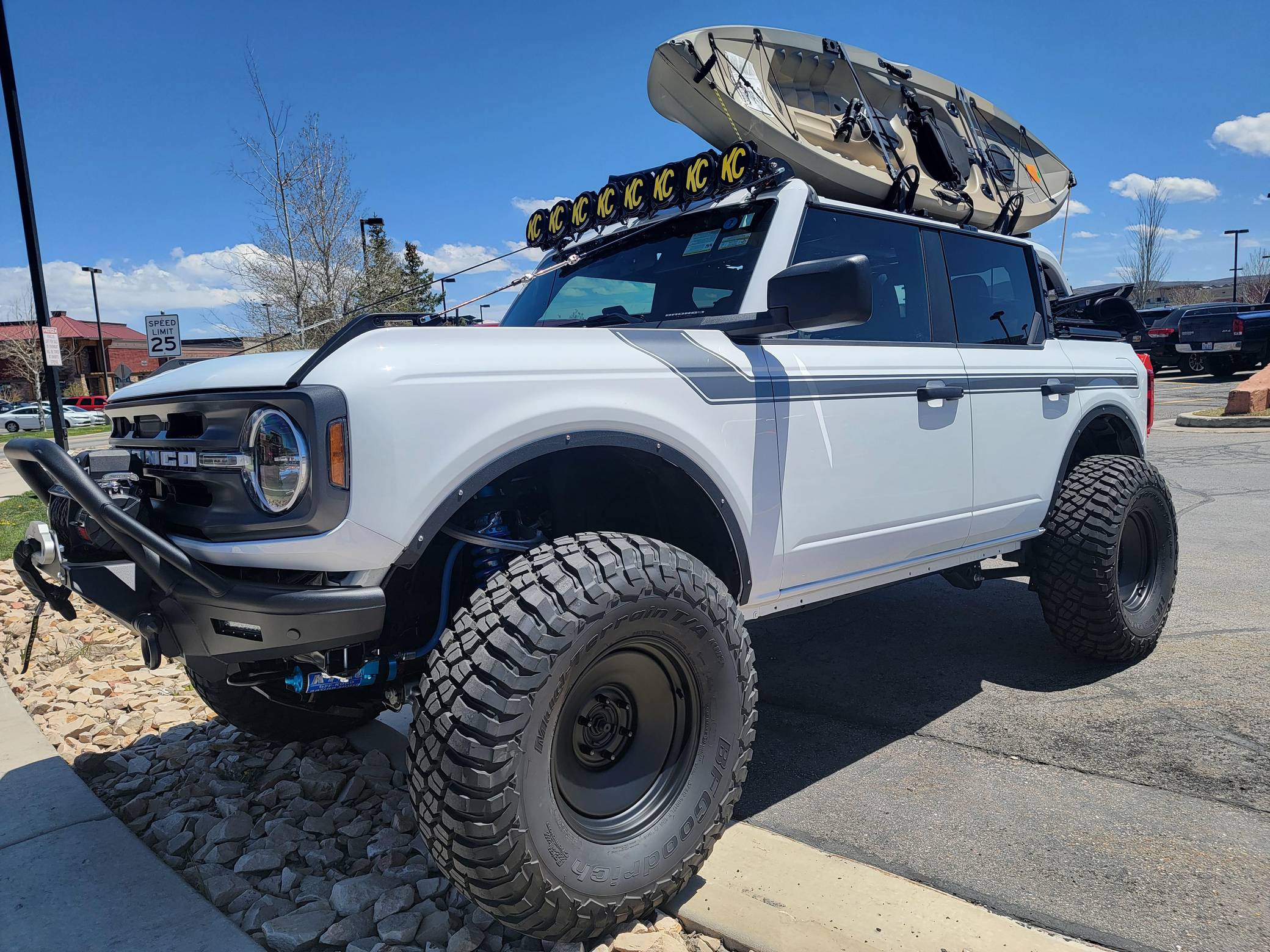 2021 Ford Bronco Big Bend, finished in Oxford White with a black and tan interior. This Bronco features the desirable 7-speed manual transmission, and its odometer currently indicates approximately 800 miles. Standard equipment on this Big Bend-trim Bronco includes a removable soft top and doors, three tow hooks, remote keyless entry, an 8-inch LCD instrument cluster, the Terrain Management System with 6 G. O. A. T. modes, a 6-speaker audio system, and more as detailed below. Modifications are extensive and include 4Wheel Parts front and rear steel bumpers, a King 2. 5-inch remote reservoir coilover suspension lift, a Smittybilt X20 10,000-lb waterproof wireless winch, custom fabricated rock sliders, Rough Country fender delete kit, 17-inch matte black US Wheels steel smoothies, and BF Goodrich Mud-Terrain T/A KM3 tires. A full list of modifications is shown below. The sixth-generation Bronco was introduced for the 2021 model year, ending a 25-year hiatus and nearly a decade of speculation about its return. Retro styling, body-on-frame construction, and a suite of off-road equipment help to ensure this truck lives up to the Bronco name. While the manual transmission and convertible soft top add to this Bronco's back-to-basics packaging, amenities like wireless Apple CarPlay and hill descent control bring a modern touch to the experience. Power comes from a 2. 3-liter turbocharged "Ecoboost" inline-four engine, rated at 300 horsepower and 325 lb-ft of torque. Output is sent to all four wheels via a 7-speed (6+1 crawler gear) manual transmission.