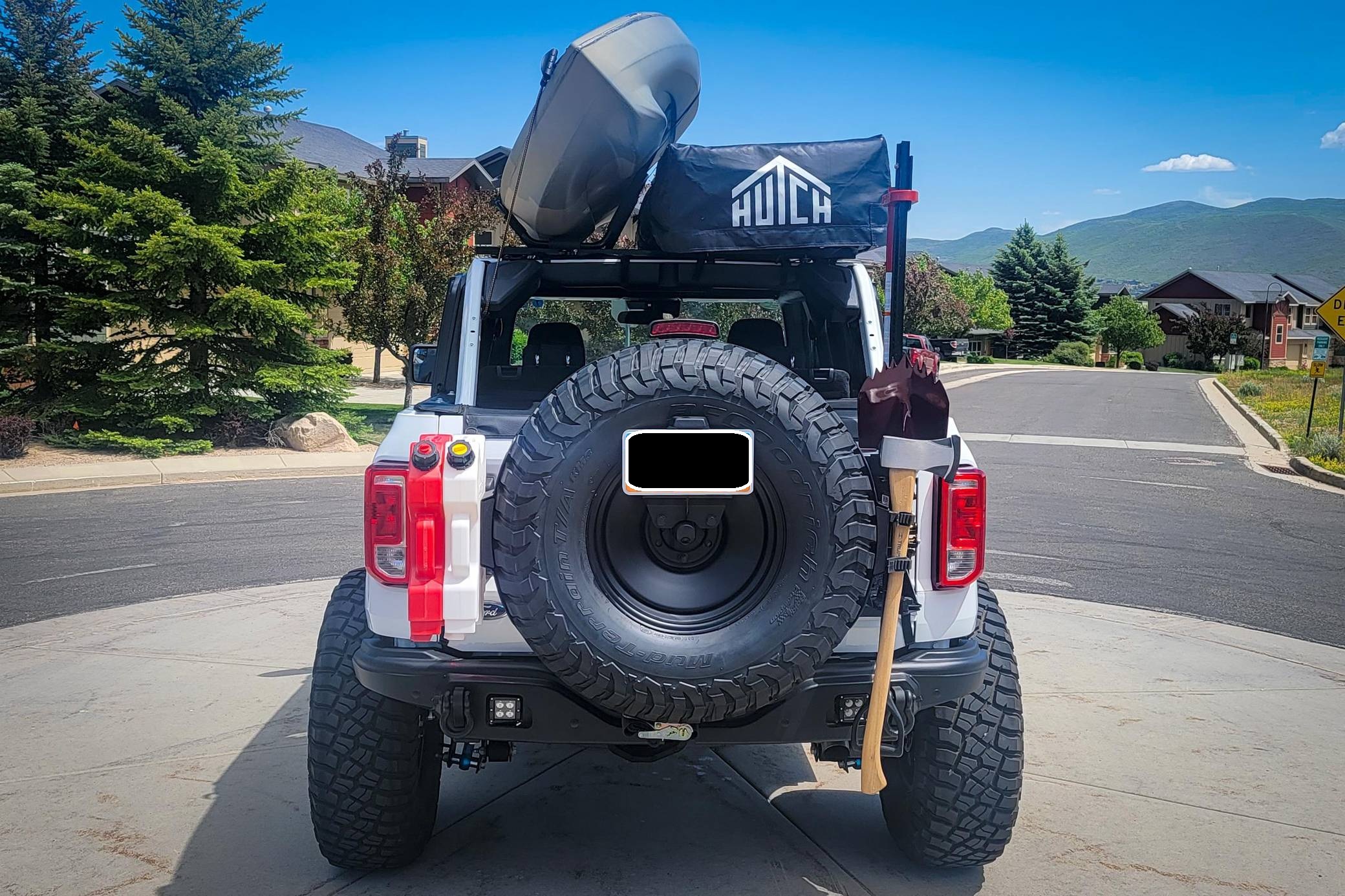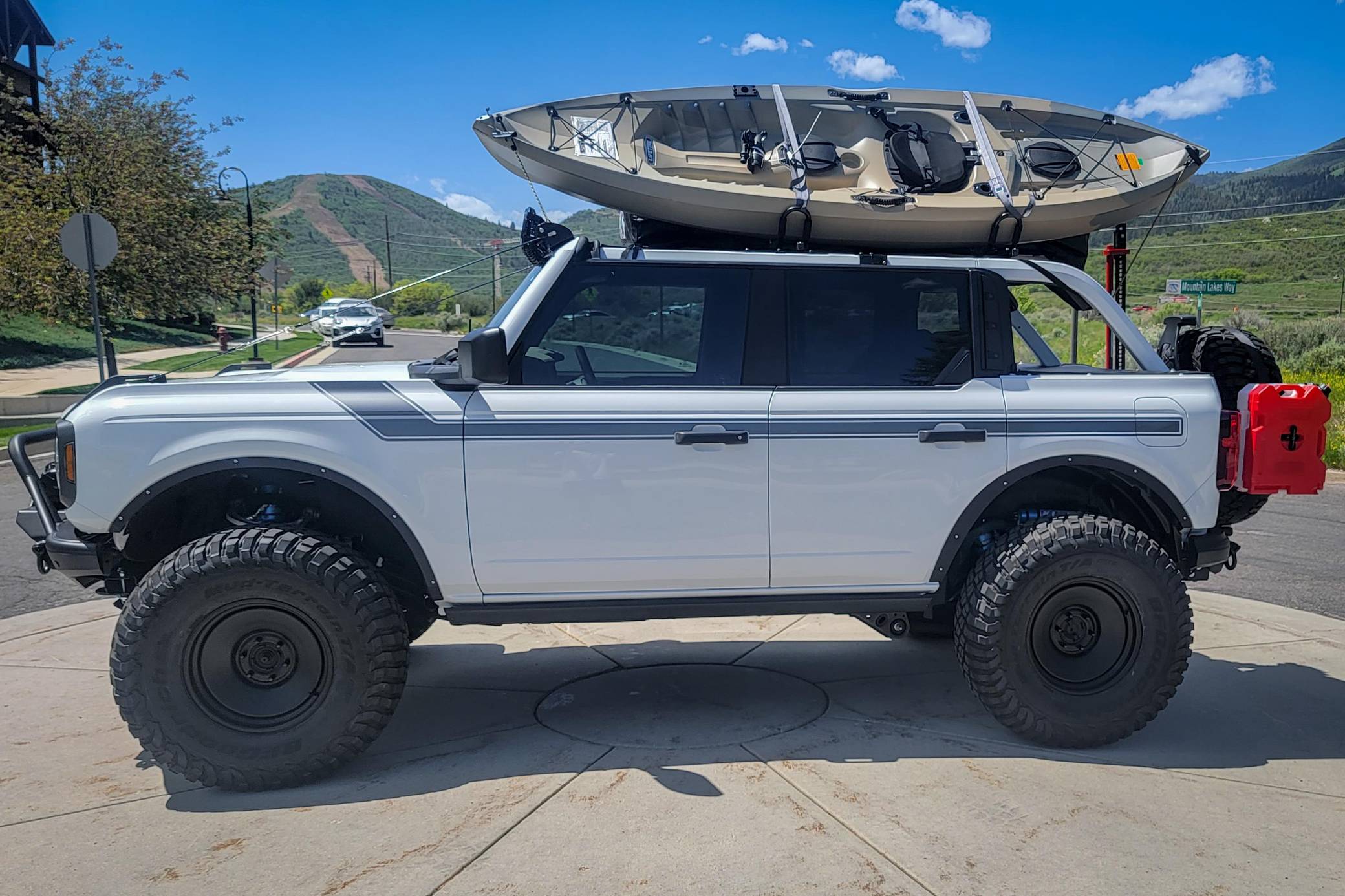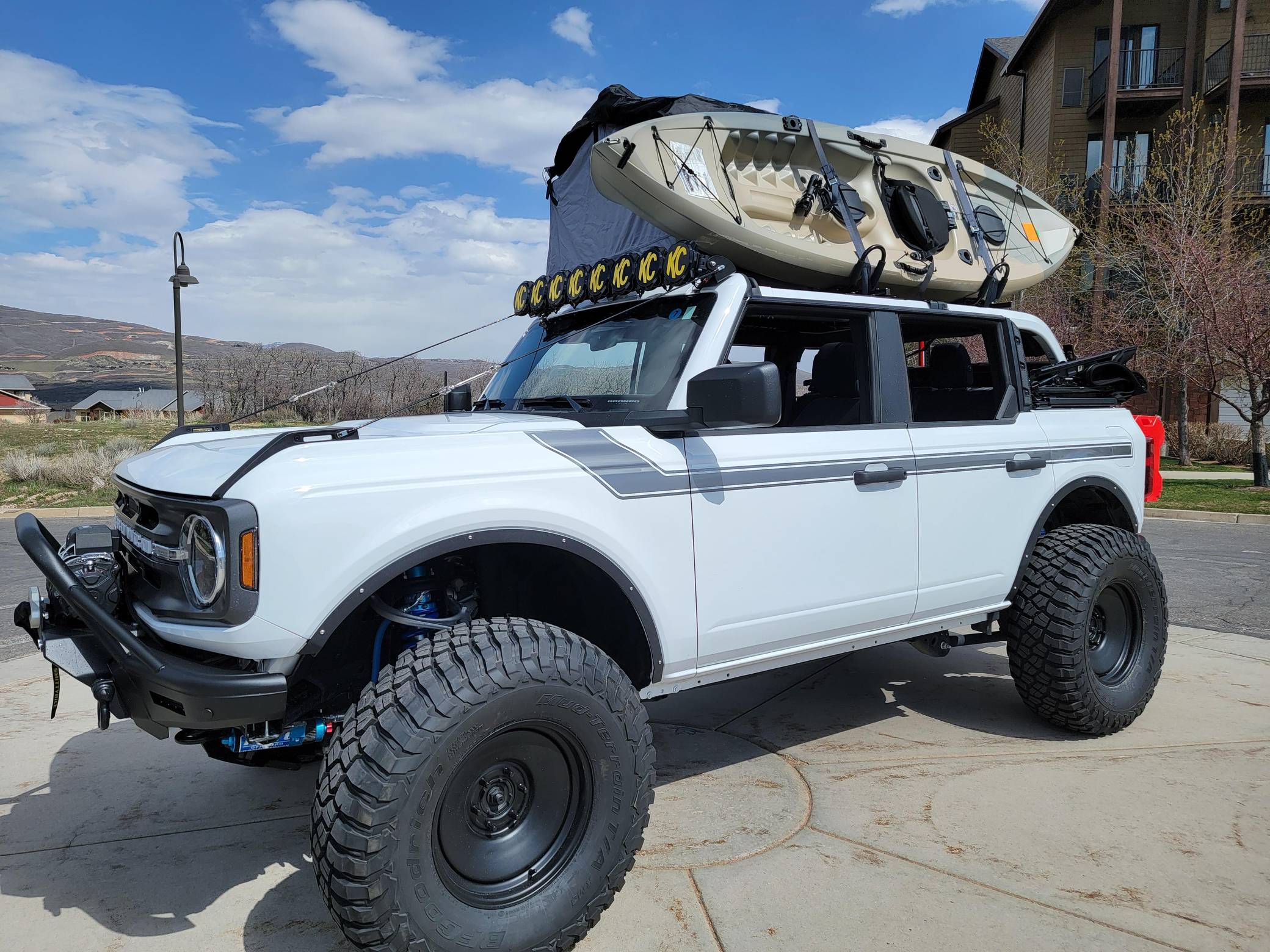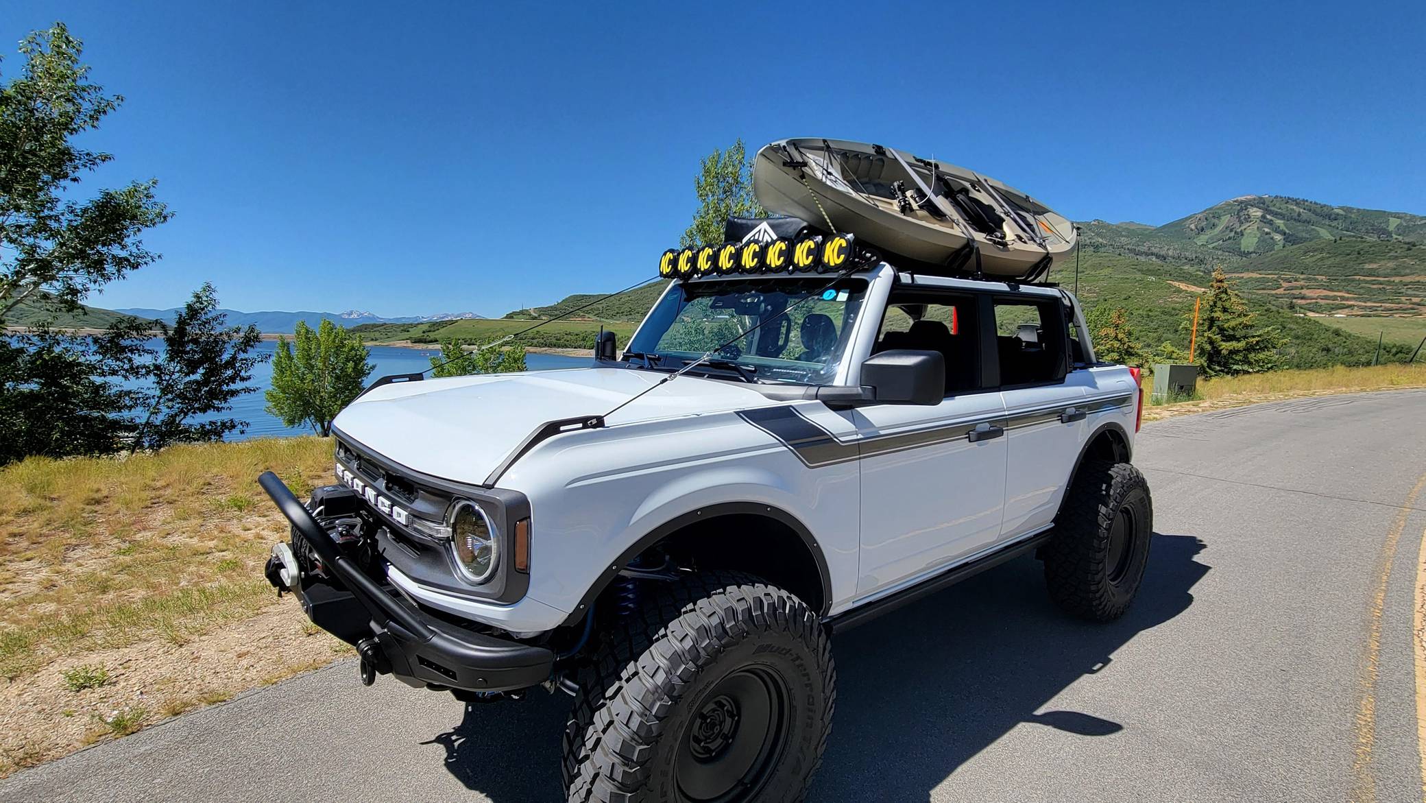 2021 Ford Bronco Big Bend, finished in Oxford White with a black and tan interior. This Bronco features the desirable 7-speed manual transmission, and its odometer currently indicates approximately 800 miles. Standard equipment on this Big Bend-trim Bronco includes a removable soft top and doors, three tow hooks, remote keyless entry, an 8-inch LCD instrument cluster, the Terrain Management System with 6 G. O. A. T. modes, a 6-speaker audio system, and more as detailed below. Modifications are extensive and include 4Wheel Parts front and rear steel bumpers, a King 2. 5-inch remote reservoir coilover suspension lift, a Smittybilt X20 10,000-lb waterproof wireless winch, custom fabricated rock sliders, Rough Country fender delete kit, 17-inch matte black US Wheels steel smoothies, and BF Goodrich Mud-Terrain T/A KM3 tires. A full list of modifications is shown below. The sixth-generation Bronco was introduced for the 2021 model year, ending a 25-year hiatus and nearly a decade of speculation about its return. Retro styling, body-on-frame construction, and a suite of off-road equipment help to ensure this truck lives up to the Bronco name. While the manual transmission and convertible soft top add to this Bronco's back-to-basics packaging, amenities like wireless Apple CarPlay and hill descent control bring a modern touch to the experience. Power comes from a 2. 3-liter turbocharged "Ecoboost" inline-four engine, rated at 300 horsepower and 325 lb-ft of torque. Output is sent to all four wheels via a 7-speed (6+1 crawler gear) manual transmission.