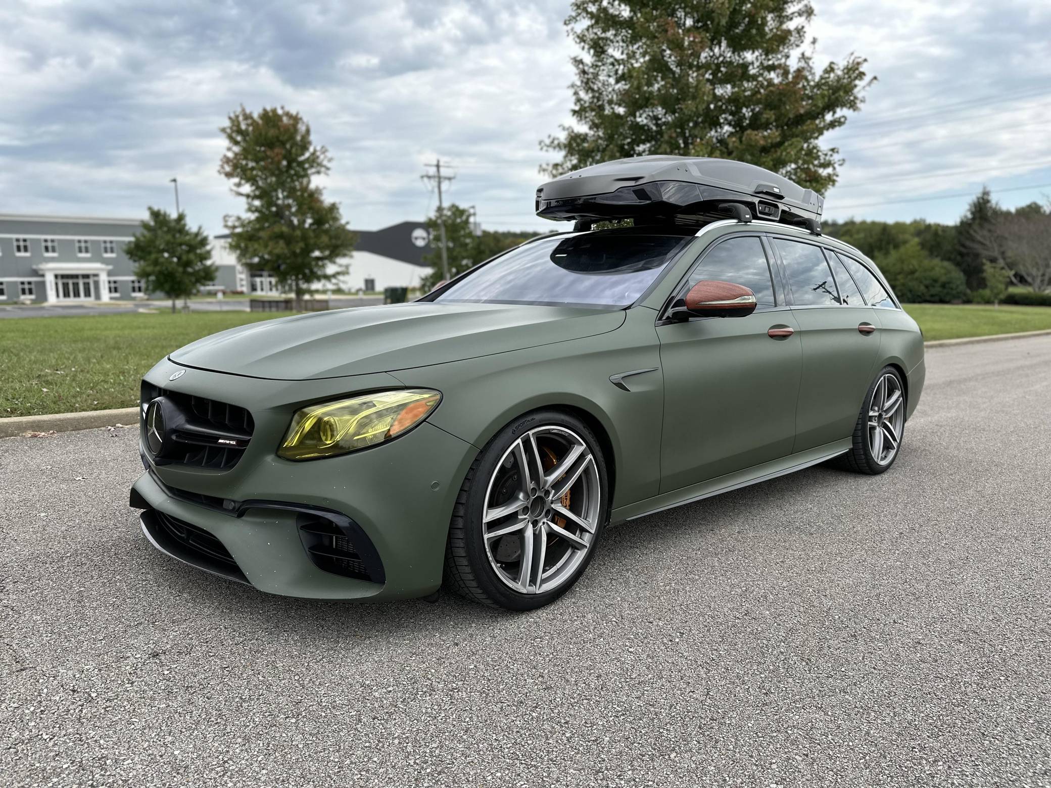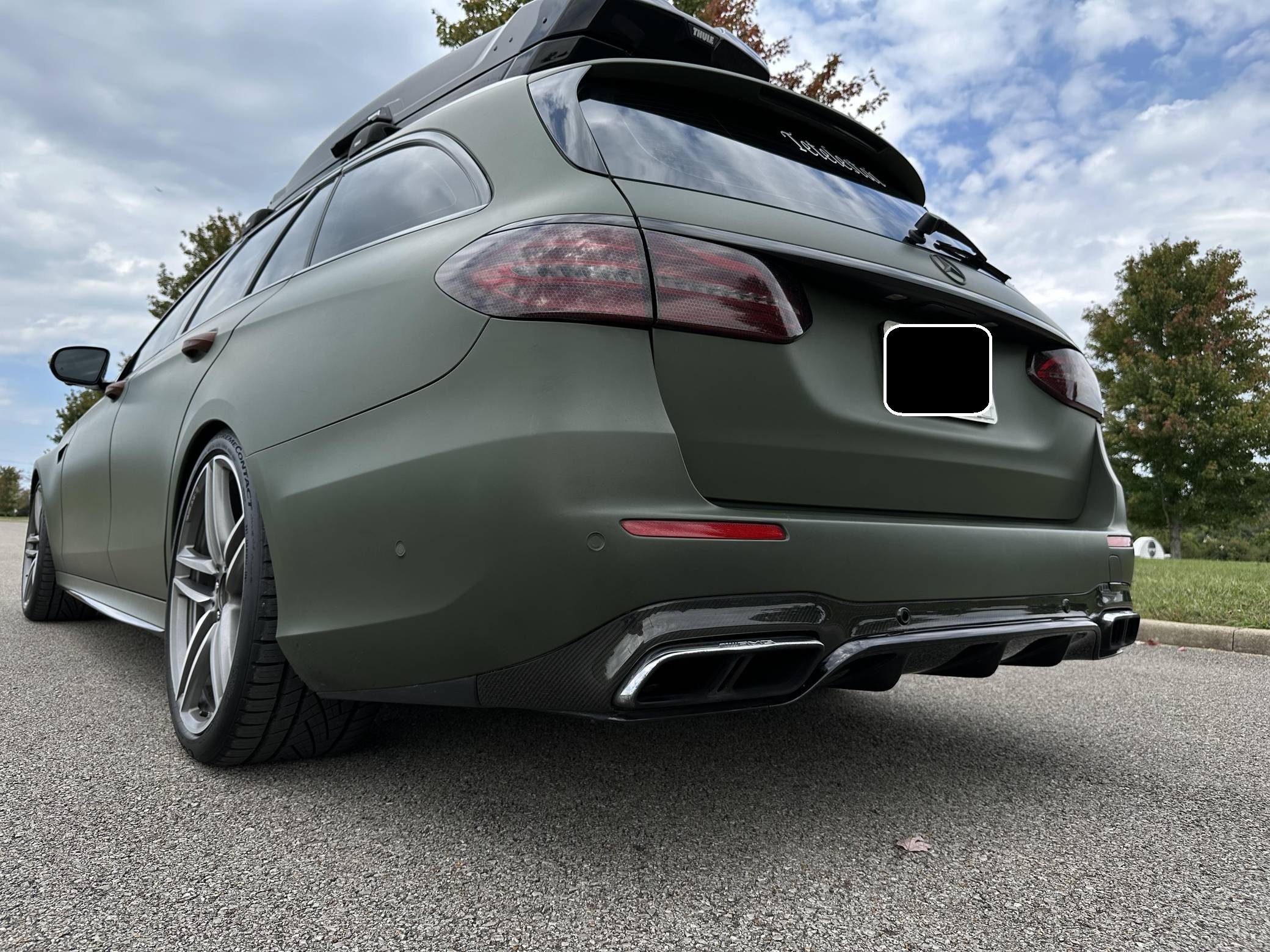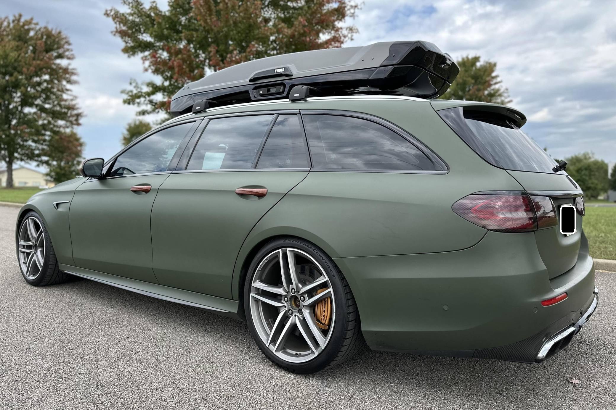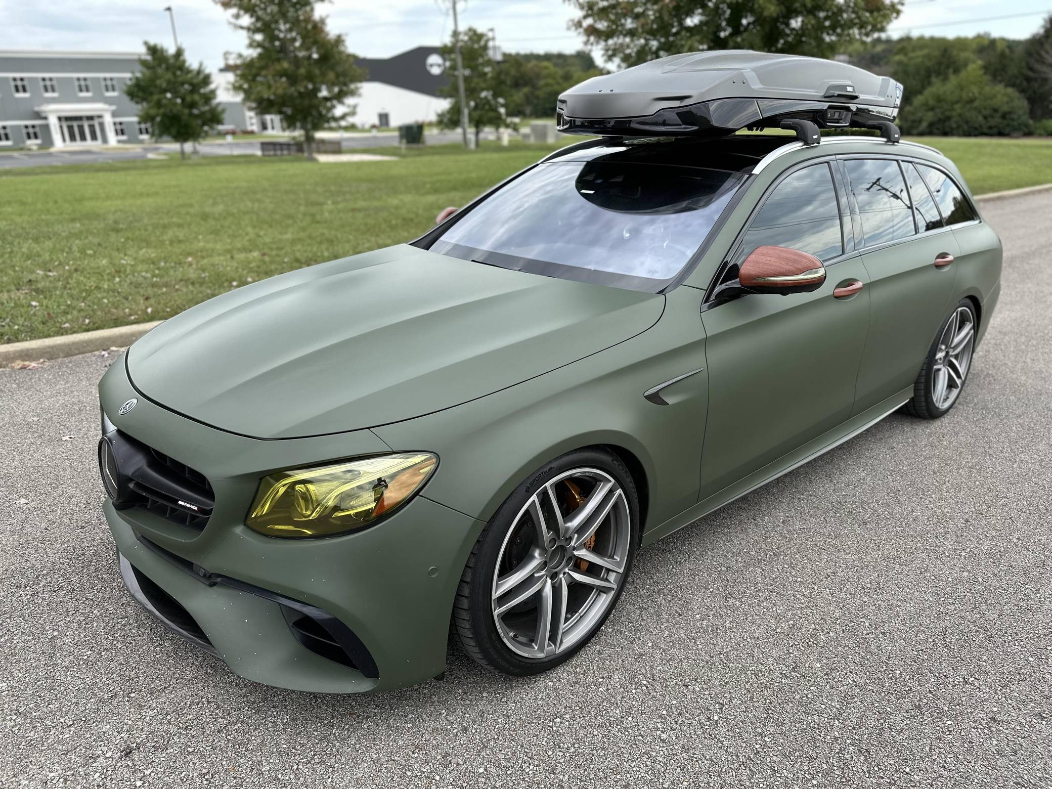 THIS. . . is a 2018 Mercedes-AMG E63 S Wagon, finished in Designo Diamond White Metallic with a green exterior wrap and a black interior. In addition to the Avery Dennison green wrap, the modifications reported by the seller include Eurocharged Performance ECU, CPC, and TCU tunes, a PureTurbos Pure 1000 turbocharger kit, a Spoolperformance "Stage 3" low-pressure fuel system, Eurocharged Performance downpipes without catalytic converters, an AWE Tuning SwitchPath exhaust system, and yellow film on the headlights. More details about the aftermarket parts installed on this car are provided below, and the Thule Vector Alpine roof box is included in the sale. Factory equipment includes the AMG Premium, Acoustic Comfort, Sun Protection, AMG Advanced Lighting, and AMG Exterior Carbon Fiber packages, 20-inch wheels, an AMG Performance ceramic composite braking system, an AMG Performance exhaust system, ventilated and power-adjustable AMG Performance front seats, a 12. 3-inch display for the instrument cluster, and a surround-view camera. A Monroney label for this E63 S is pictured in the gallery. Released for 2018, the W213-based E63 and E63 S arrived with a more fluid design, a smaller yet more powerful engine, and a drift mode that can send 100% of the engine's torque to the rear wheels. The wagon variant (called S213 internally) was exclusively offered in S tune, so it landed as the most expensive member of the E-Class range. Production continues today. Power comes from a 4. 0-liter twin-turbocharged V8, rated at 603 horsepower and 627 lb-ft of torque when left stock. The modifications increase horsepower to 806, according to a dyno sheet shown in the gallery. Called "M177" internally, it spins the four wheels via a 9-speed automatic transmission.