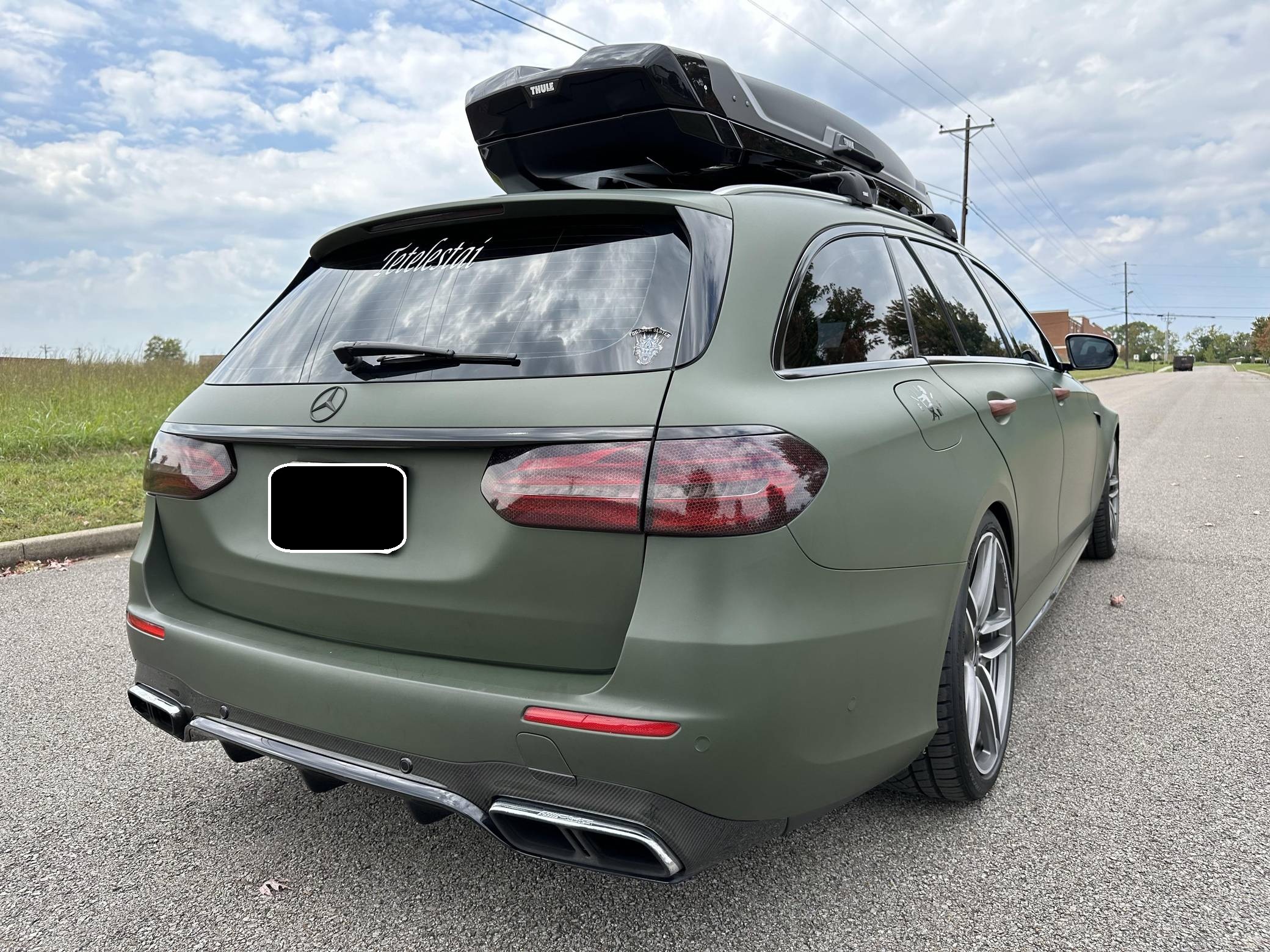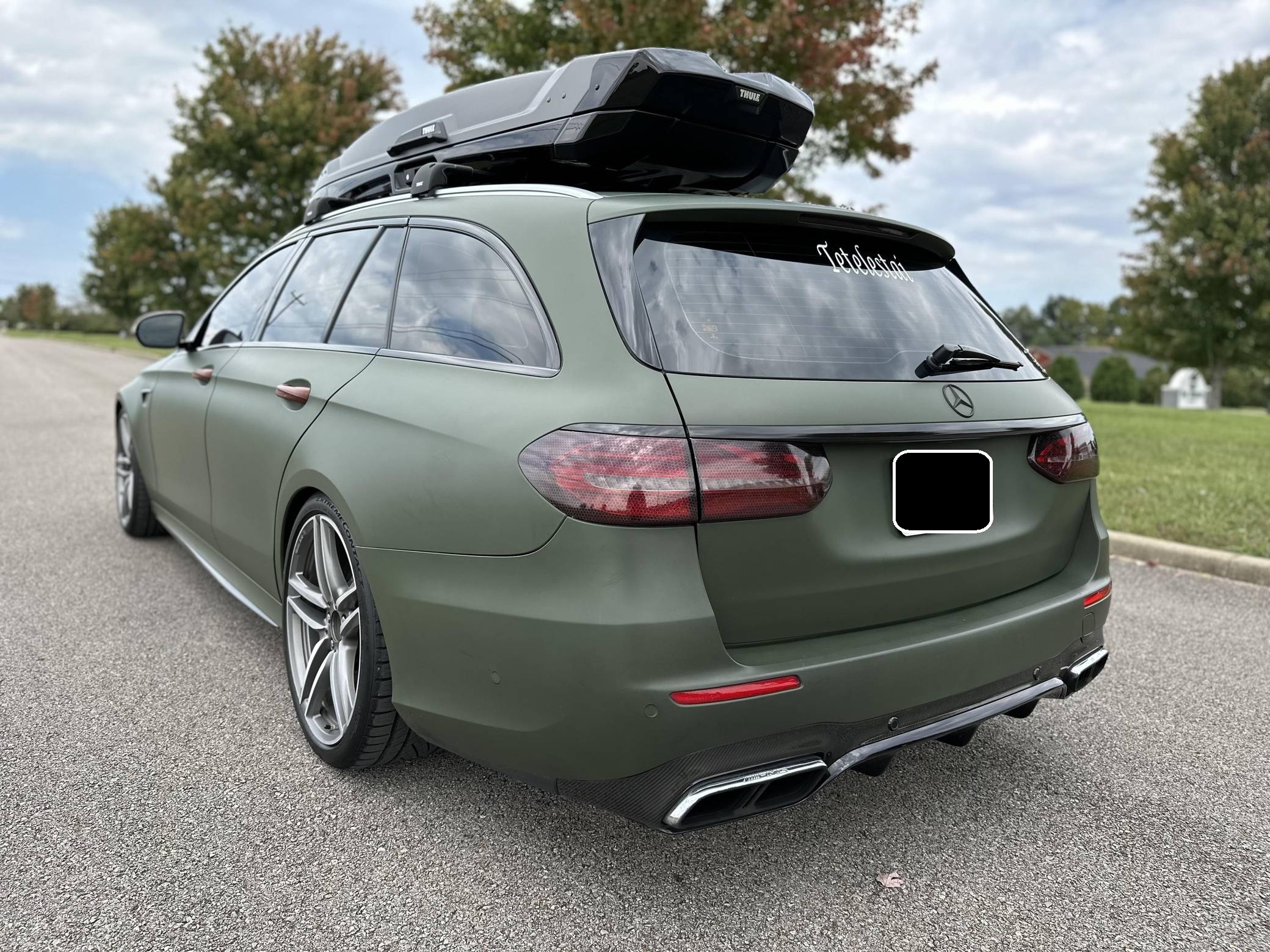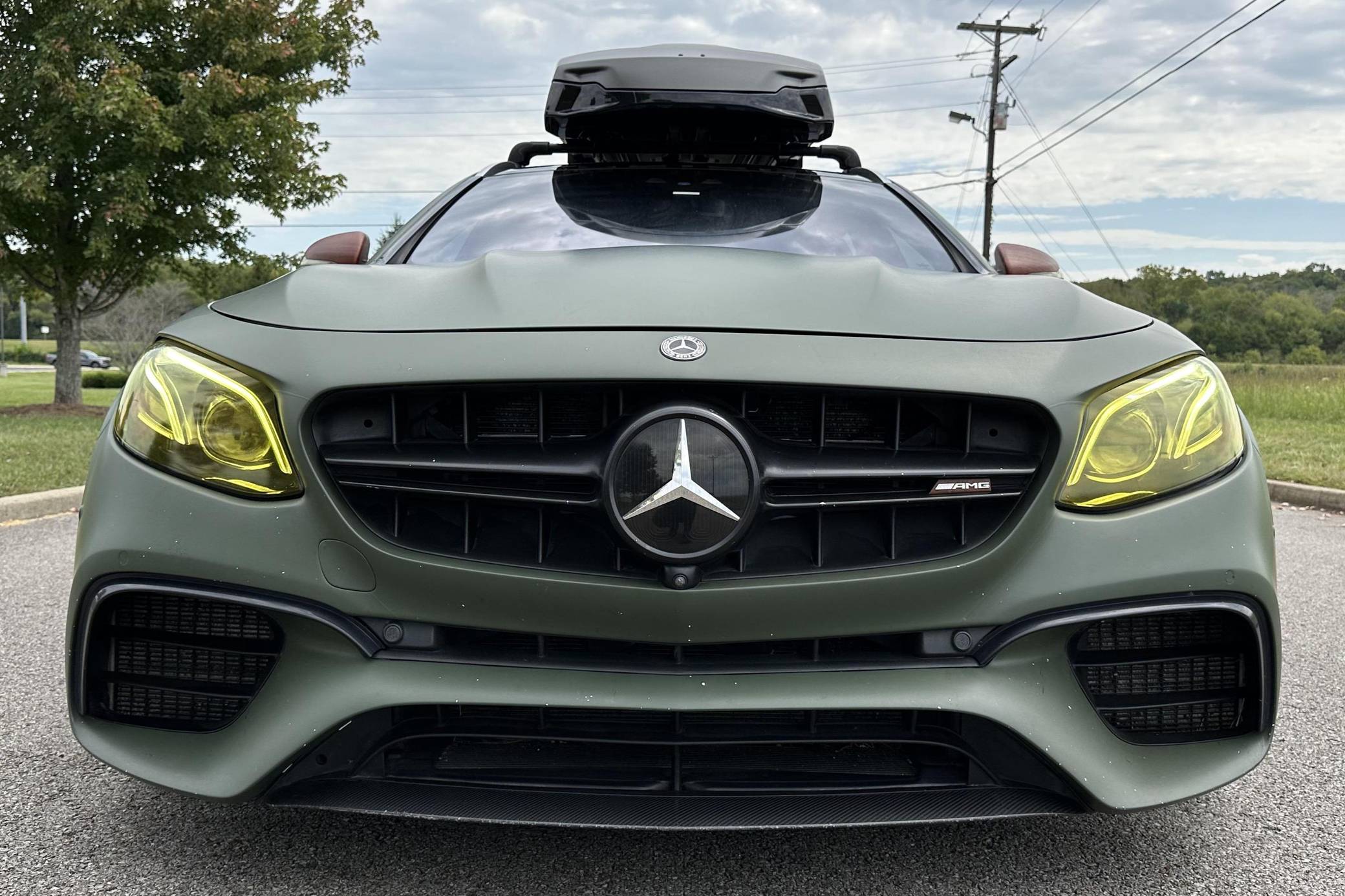 THIS. . . is a 2018 Mercedes-AMG E63 S Wagon, finished in Designo Diamond White Metallic with a green exterior wrap and a black interior. In addition to the Avery Dennison green wrap, the modifications reported by the seller include Eurocharged Performance ECU, CPC, and TCU tunes, a PureTurbos Pure 1000 turbocharger kit, a Spoolperformance "Stage 3" low-pressure fuel system, Eurocharged Performance downpipes without catalytic converters, an AWE Tuning SwitchPath exhaust system, and yellow film on the headlights. More details about the aftermarket parts installed on this car are provided below, and the Thule Vector Alpine roof box is included in the sale. Factory equipment includes the AMG Premium, Acoustic Comfort, Sun Protection, AMG Advanced Lighting, and AMG Exterior Carbon Fiber packages, 20-inch wheels, an AMG Performance ceramic composite braking system, an AMG Performance exhaust system, ventilated and power-adjustable AMG Performance front seats, a 12. 3-inch display for the instrument cluster, and a surround-view camera. A Monroney label for this E63 S is pictured in the gallery. Released for 2018, the W213-based E63 and E63 S arrived with a more fluid design, a smaller yet more powerful engine, and a drift mode that can send 100% of the engine's torque to the rear wheels. The wagon variant (called S213 internally) was exclusively offered in S tune, so it landed as the most expensive member of the E-Class range. Production continues today. Power comes from a 4. 0-liter twin-turbocharged V8, rated at 603 horsepower and 627 lb-ft of torque when left stock. The modifications increase horsepower to 806, according to a dyno sheet shown in the gallery. Called "M177" internally, it spins the four wheels via a 9-speed automatic transmission.