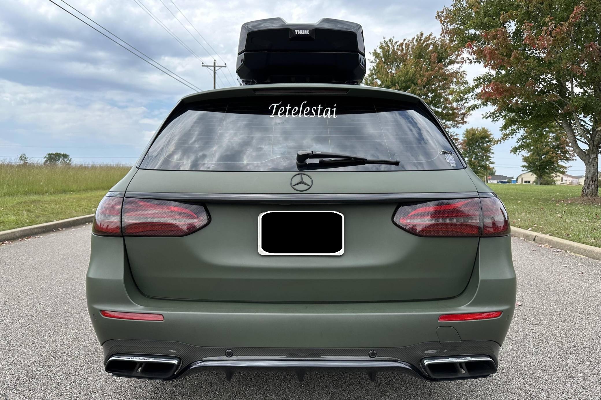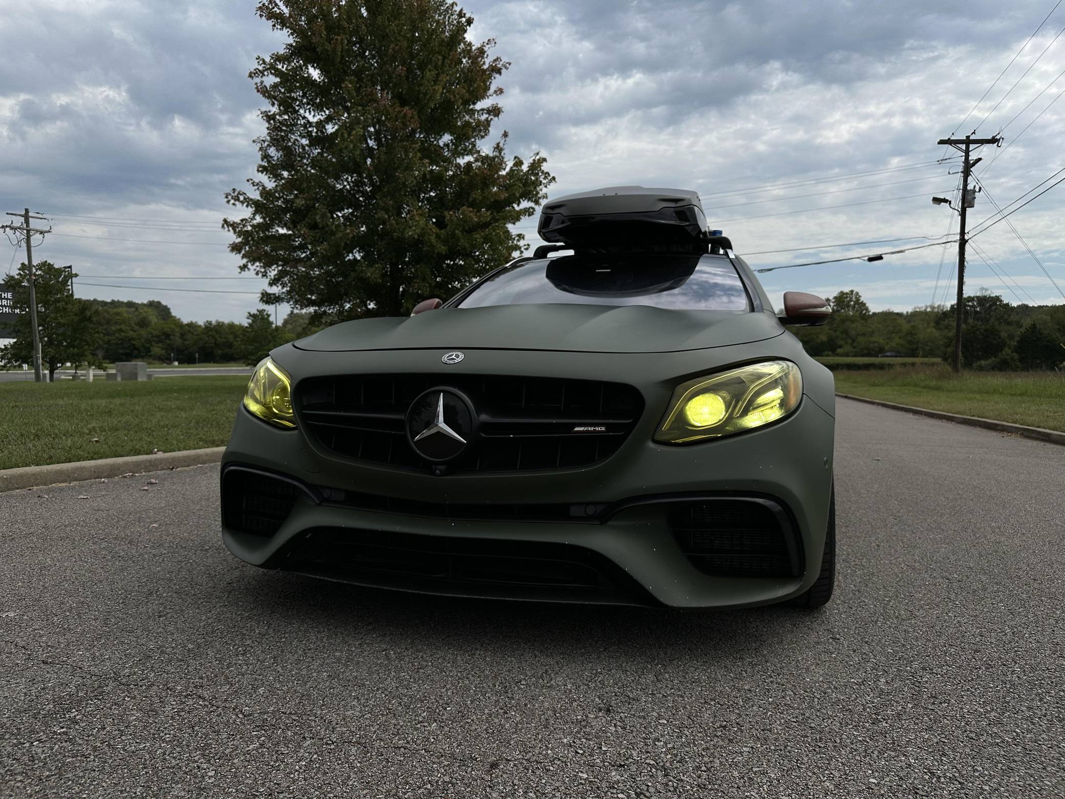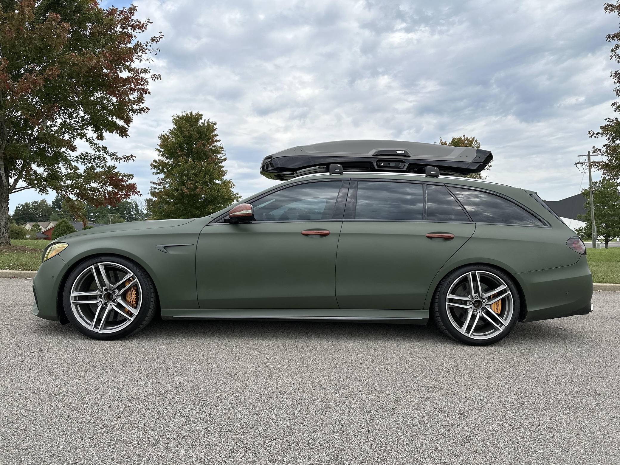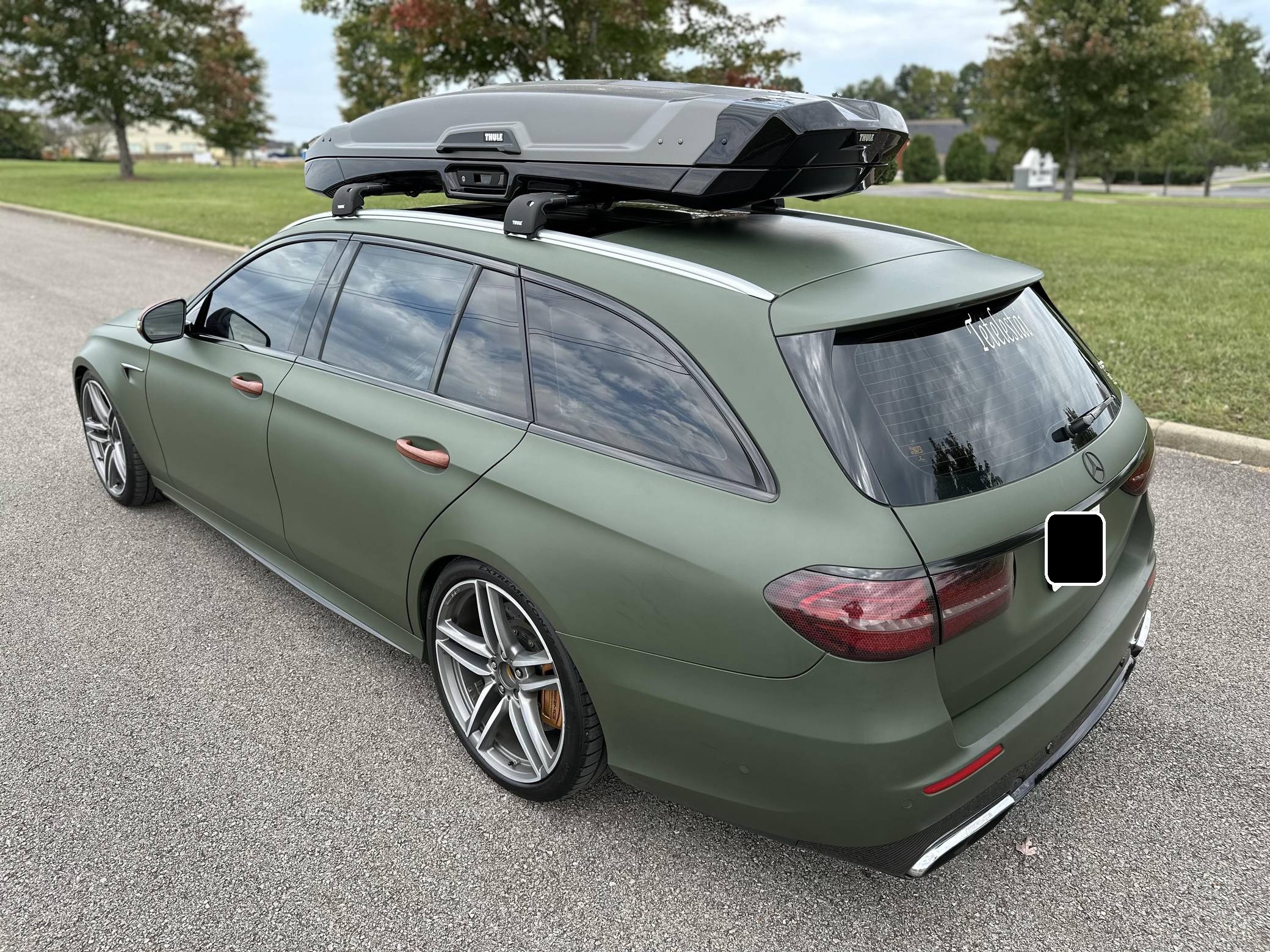 THIS. . . is a 2018 Mercedes-AMG E63 S Wagon, finished in Designo Diamond White Metallic with a green exterior wrap and a black interior. In addition to the Avery Dennison green wrap, the modifications reported by the seller include Eurocharged Performance ECU, CPC, and TCU tunes, a PureTurbos Pure 1000 turbocharger kit, a Spoolperformance "Stage 3" low-pressure fuel system, Eurocharged Performance downpipes without catalytic converters, an AWE Tuning SwitchPath exhaust system, and yellow film on the headlights. More details about the aftermarket parts installed on this car are provided below, and the Thule Vector Alpine roof box is included in the sale. Factory equipment includes the AMG Premium, Acoustic Comfort, Sun Protection, AMG Advanced Lighting, and AMG Exterior Carbon Fiber packages, 20-inch wheels, an AMG Performance ceramic composite braking system, an AMG Performance exhaust system, ventilated and power-adjustable AMG Performance front seats, a 12. 3-inch display for the instrument cluster, and a surround-view camera. A Monroney label for this E63 S is pictured in the gallery. Released for 2018, the W213-based E63 and E63 S arrived with a more fluid design, a smaller yet more powerful engine, and a drift mode that can send 100% of the engine's torque to the rear wheels. The wagon variant (called S213 internally) was exclusively offered in S tune, so it landed as the most expensive member of the E-Class range. Production continues today. Power comes from a 4. 0-liter twin-turbocharged V8, rated at 603 horsepower and 627 lb-ft of torque when left stock. The modifications increase horsepower to 806, according to a dyno sheet shown in the gallery. Called "M177" internally, it spins the four wheels via a 9-speed automatic transmission.