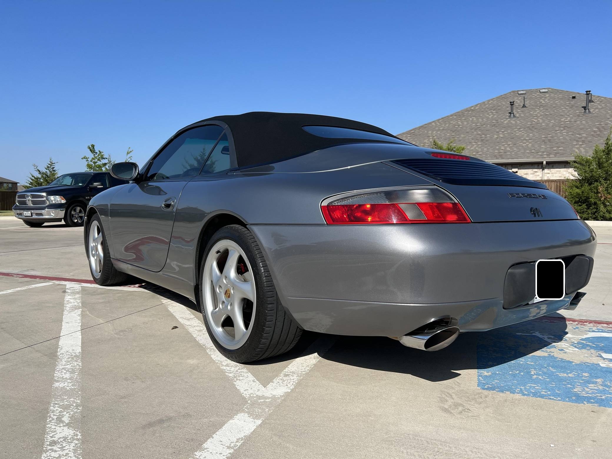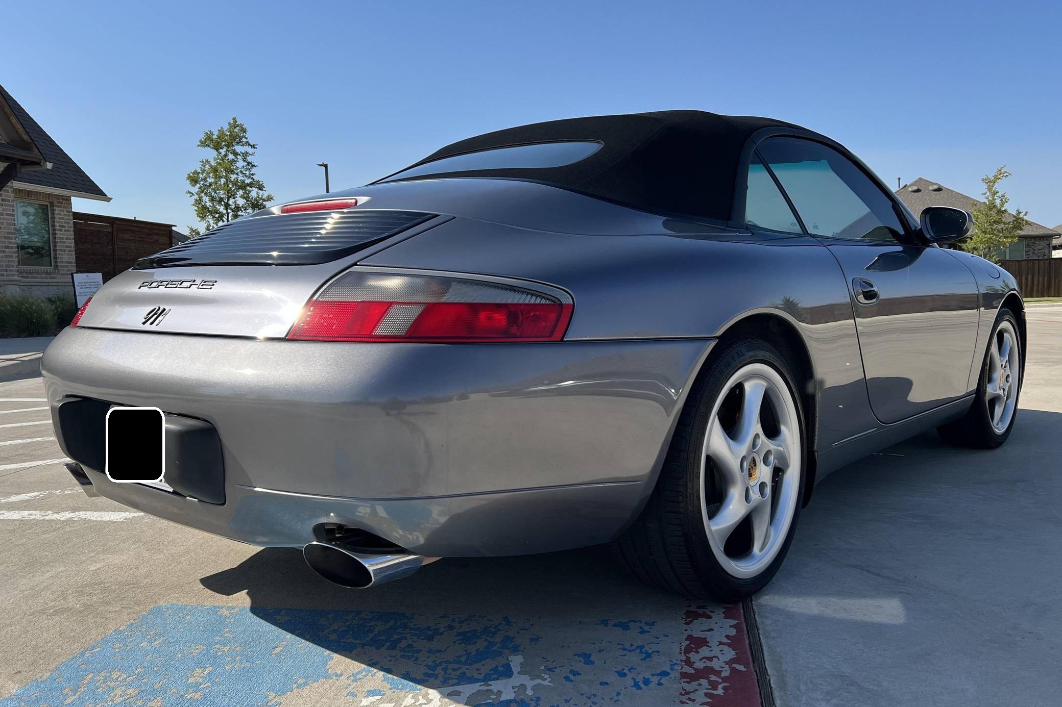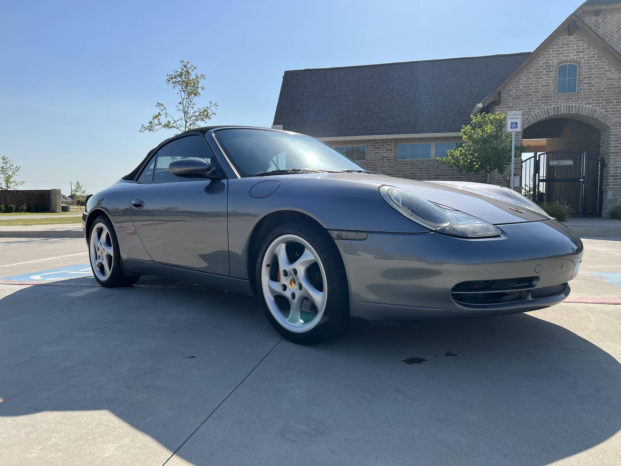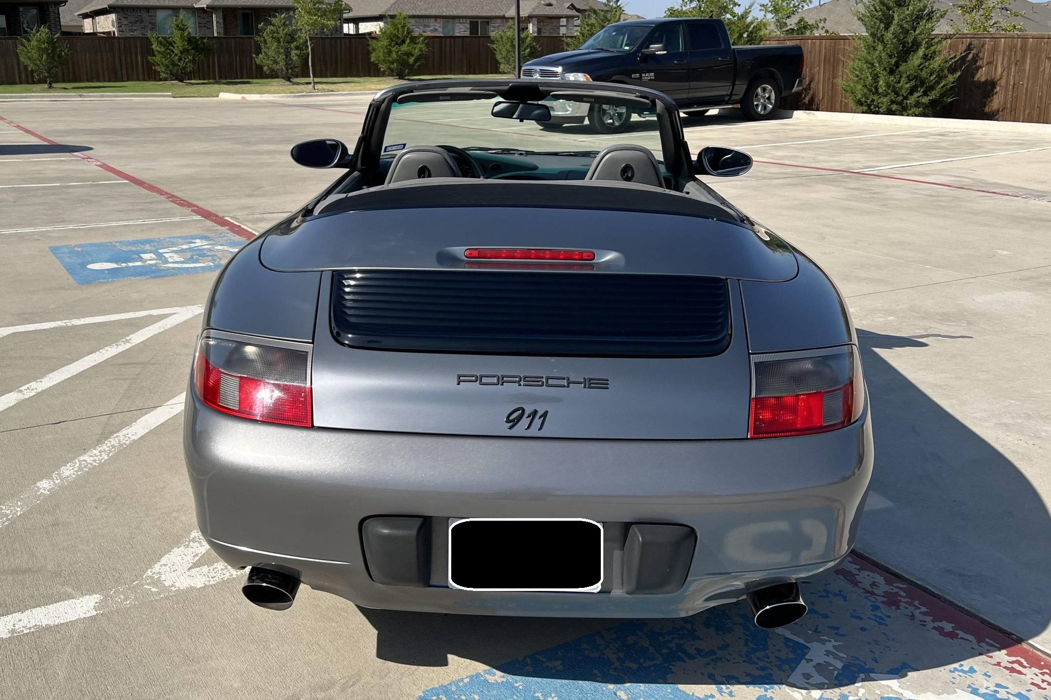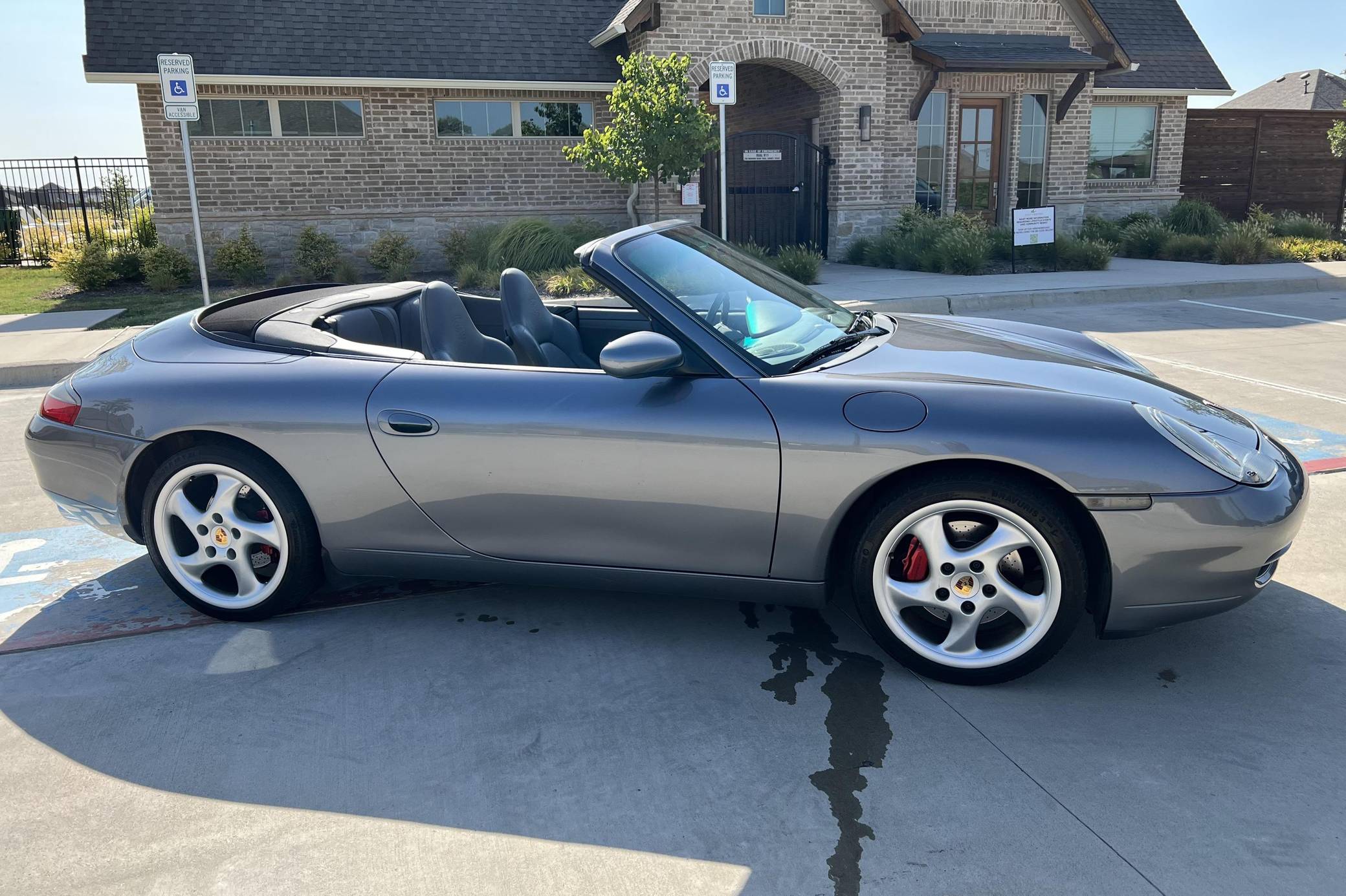 2001 Porsche 911 Carrera Cabriolet, finished in Seal Grey Metallic with a black soft top and a Graphite Grey interior. This 911 features the desirable 6-speed manual transmission, and its odometer currently displays approximately 56,500 miles. According to the build sheet provided in the gallery, factory equipment includes cross-drilled brake rotors, a power-retractable soft top, leather upholstery, heated sport seats, automatic climate control, and cruise control. The full list of modifications reported by the seller is detailed below. include an LN Engineering IMS bearing retrofit kit, 18-inch Turbo Look wheels, and a Pioneer touchscreen head unit with aftermarket rear view camera. The fifth-generation "996" 911 was introduced for the 1999 model year and was the first 911 to be completely redesigned from its predecessors. While its water-cooled engine and distinctive headlights irked some Porsche purists, the 996 is appreciated by enthusiasts for providing an analog driving experience compared to later generations and is considered to be the last "affordable" 911. As a result, the 996 and its unique styling has experienced a recent rise in popularity. Power comes from a 3. 4-liter flat-6, rated at 300 horsepower and 258 lb-ft of torque. Output is sent to the rear wheels via a 6-speed manual transmission.