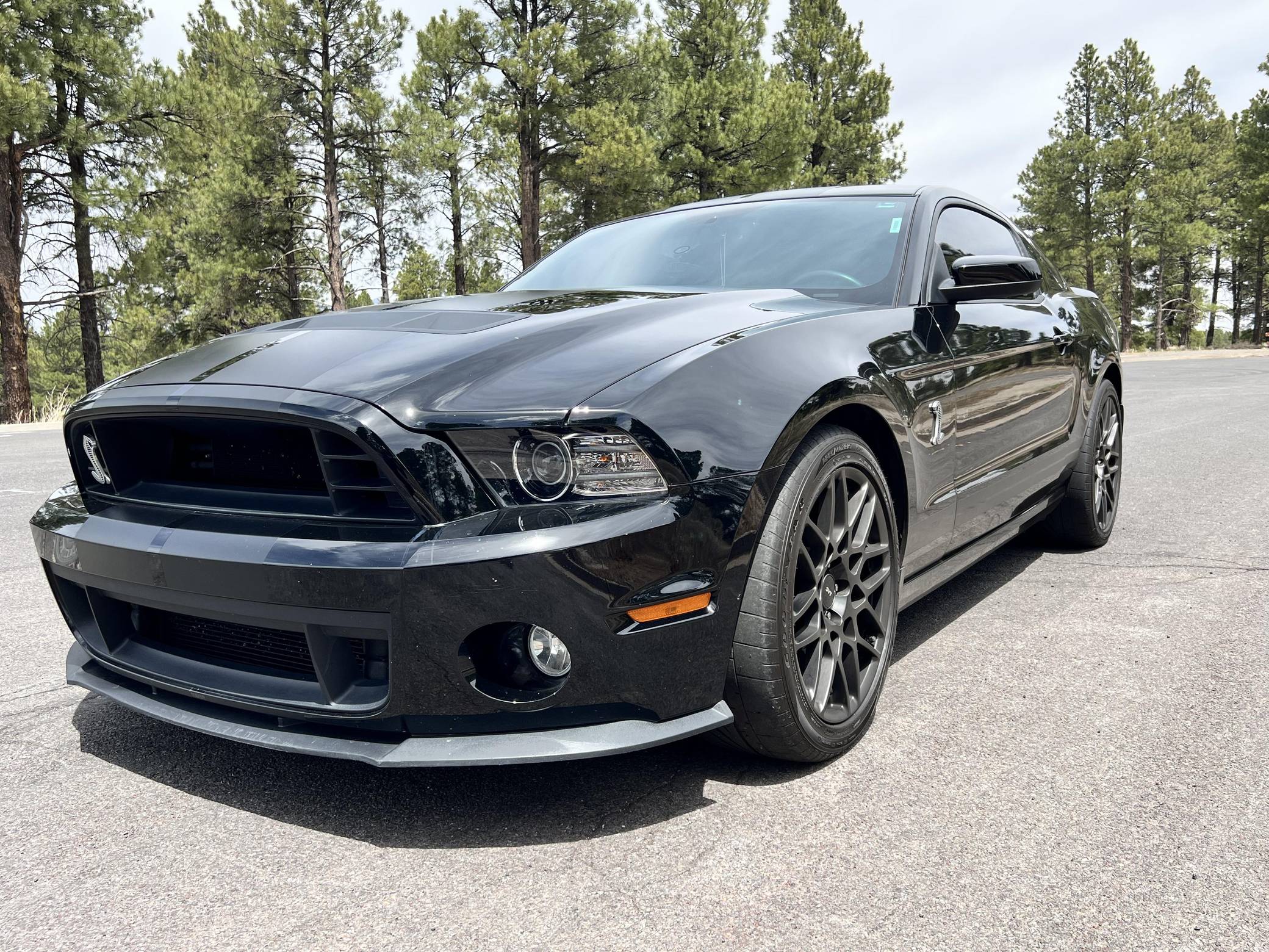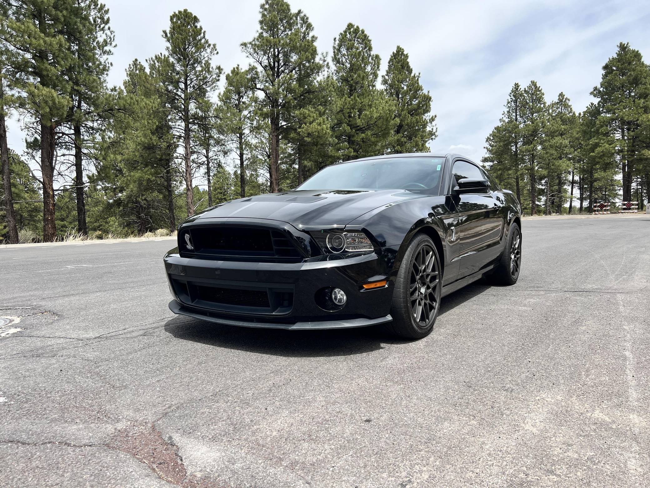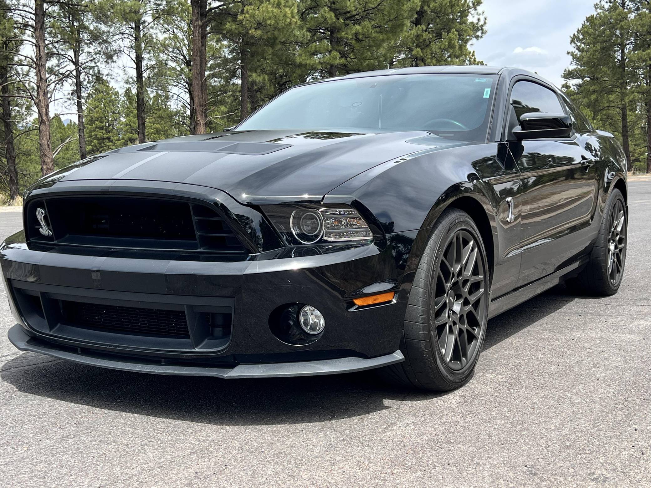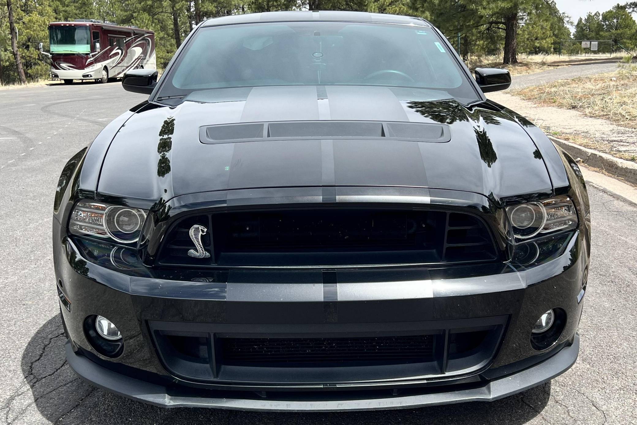 2013 Ford Mustang Shelby GT500, finished in black with a black interior. This GT500 is equipped with a 6-speed manual transmission, and the odometer indicates roughly 30,100 miles. A partial list of notable equipment includes the SVT Performance Package, SVT Track Package, the Electronics Package, a limited-slip differential, SVT engineered Bilstein cockpit-select dampers, Shelby Recaro seats, a Shaker Pro audio system, and more listed below. The seller reports no modifications. The 2013 Ford Mustang Shelby GT500 was the first factory Mustang to achieve a top speed of over 200 mph, stopping at 202 mph. This is also the last Shelby GT500 variant of the “S197” generation of the Mustang, featuring many chassis upgrades over its predecessor along with the final styling revisions introduced for the 2013 model year. Power comes from a supercharged 5. 8-liter V8, rated at 662 horsepower and 631 lb-ft of torque. It powers the rear wheels via a 6-speed manual transmission.