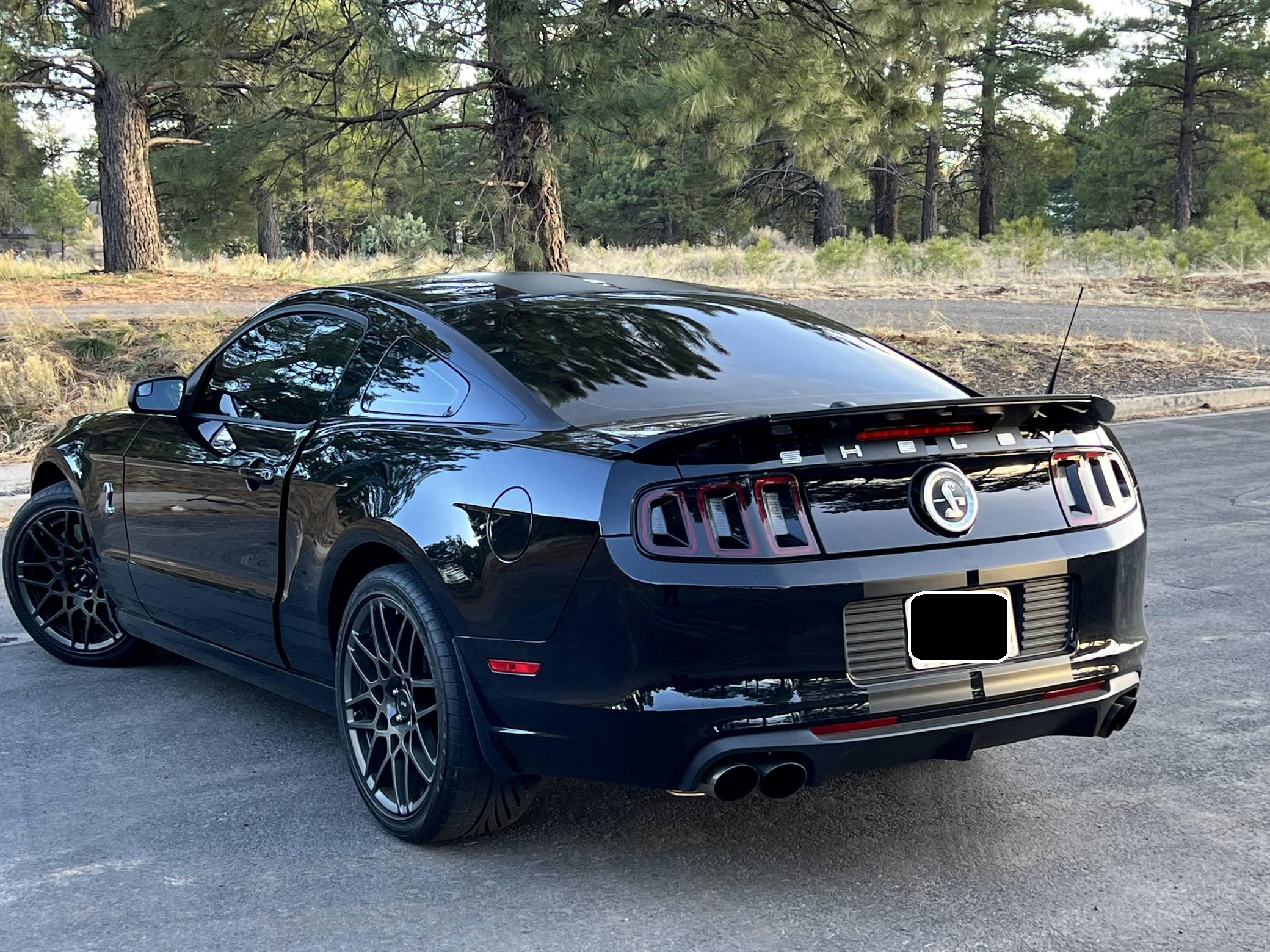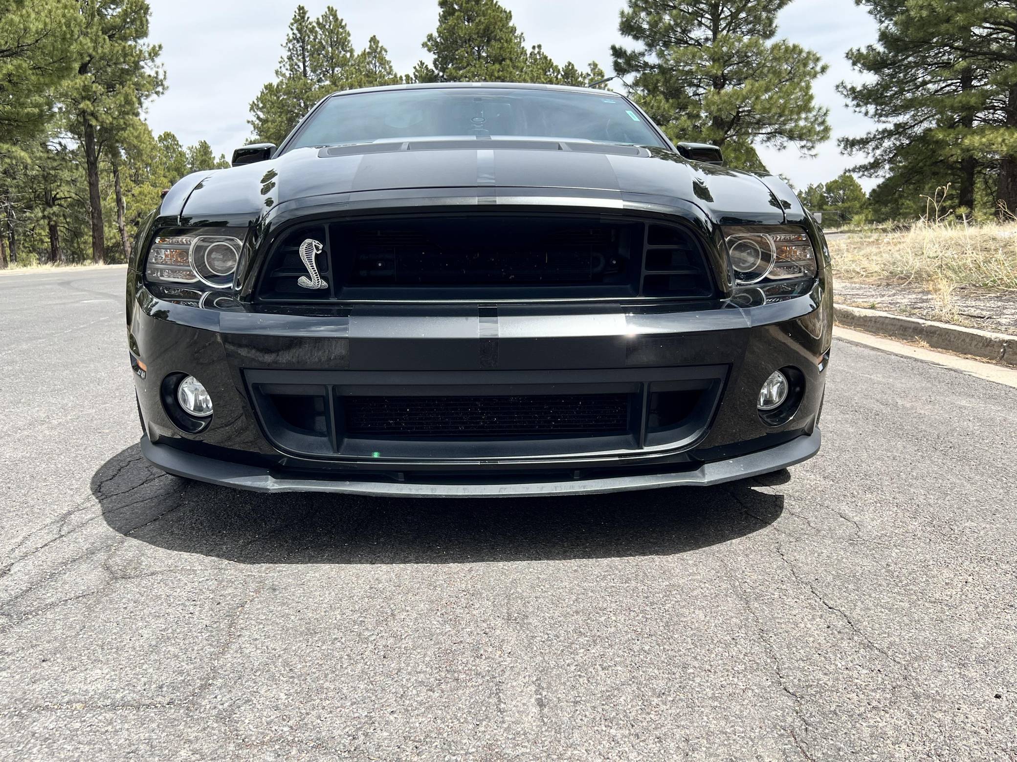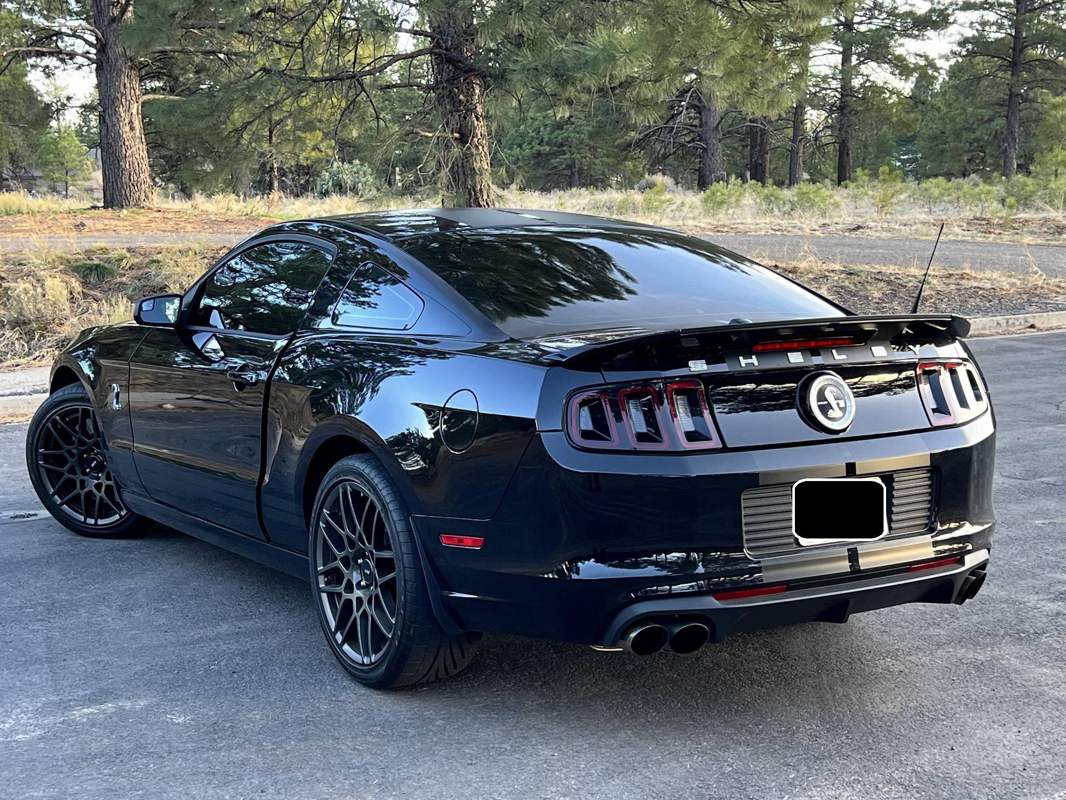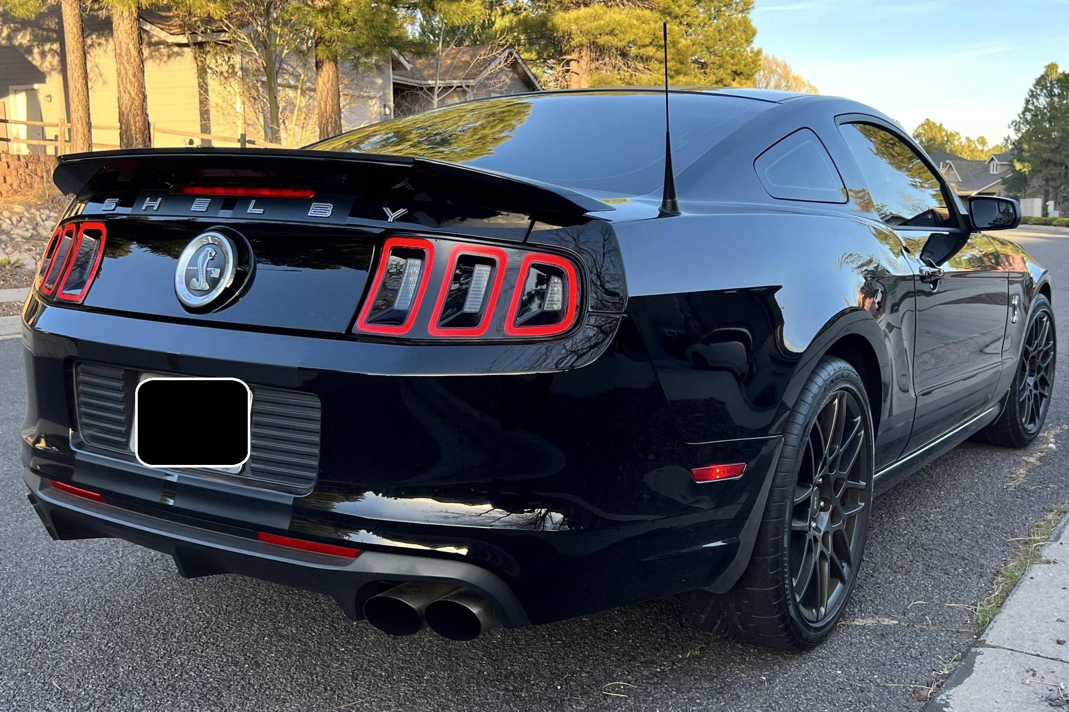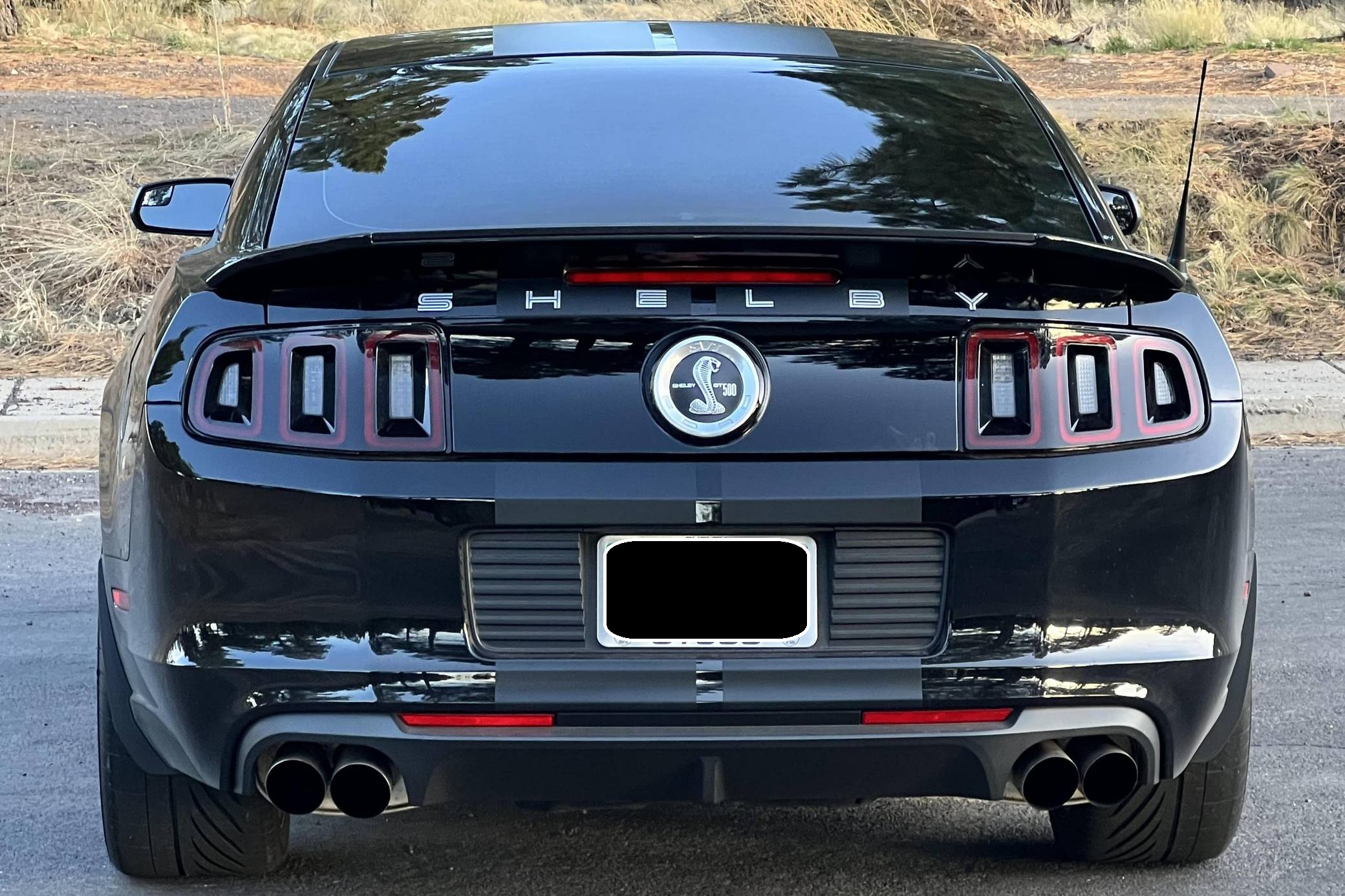 2013 Ford Mustang Shelby GT500, finished in black with a black interior. This GT500 is equipped with a 6-speed manual transmission, and the odometer indicates roughly 30,100 miles. A partial list of notable equipment includes the SVT Performance Package, SVT Track Package, the Electronics Package, a limited-slip differential, SVT engineered Bilstein cockpit-select dampers, Shelby Recaro seats, a Shaker Pro audio system, and more listed below. The seller reports no modifications. The 2013 Ford Mustang Shelby GT500 was the first factory Mustang to achieve a top speed of over 200 mph, stopping at 202 mph. This is also the last Shelby GT500 variant of the “S197” generation of the Mustang, featuring many chassis upgrades over its predecessor along with the final styling revisions introduced for the 2013 model year. Power comes from a supercharged 5. 8-liter V8, rated at 662 horsepower and 631 lb-ft of torque. It powers the rear wheels via a 6-speed manual transmission.