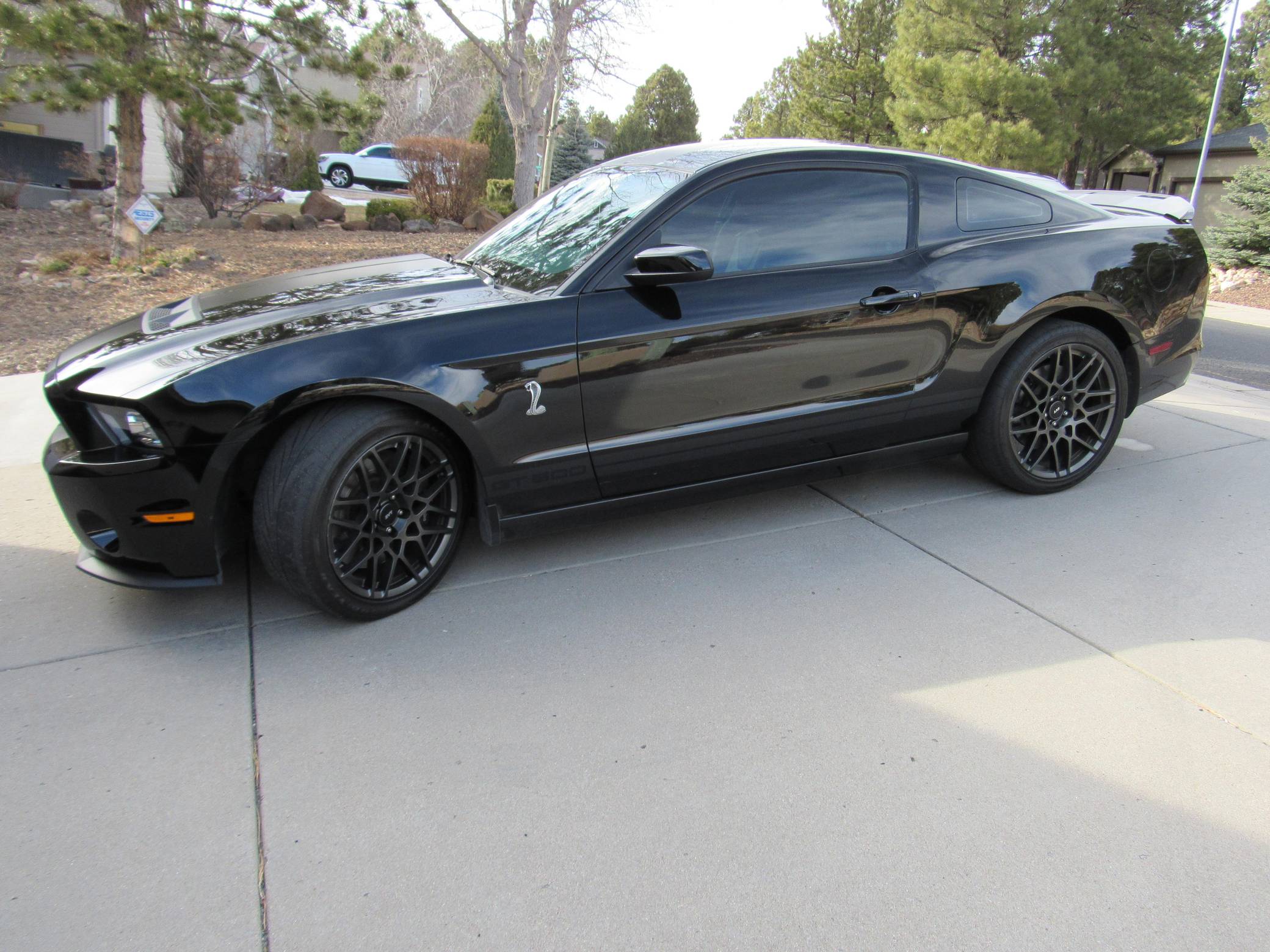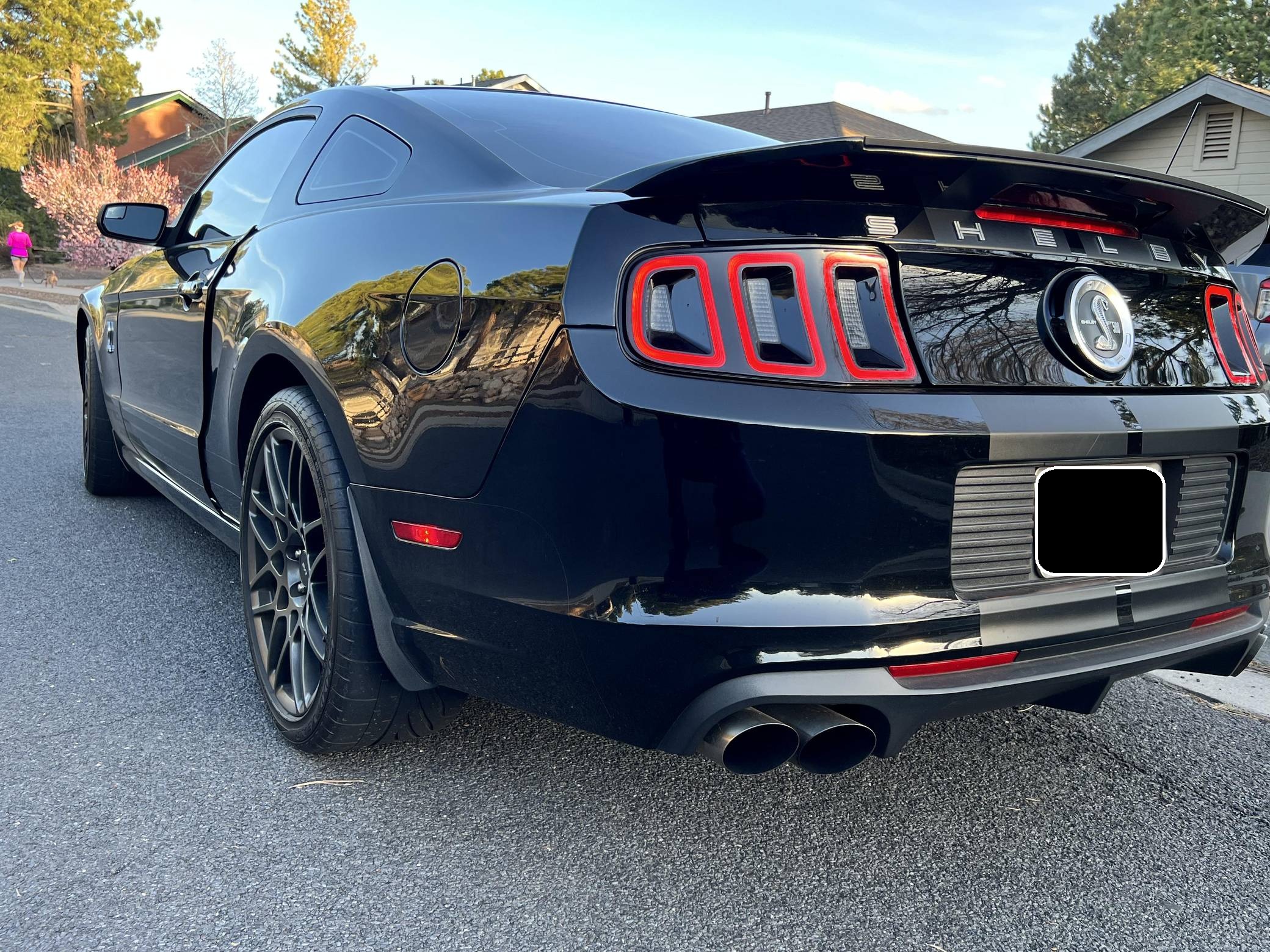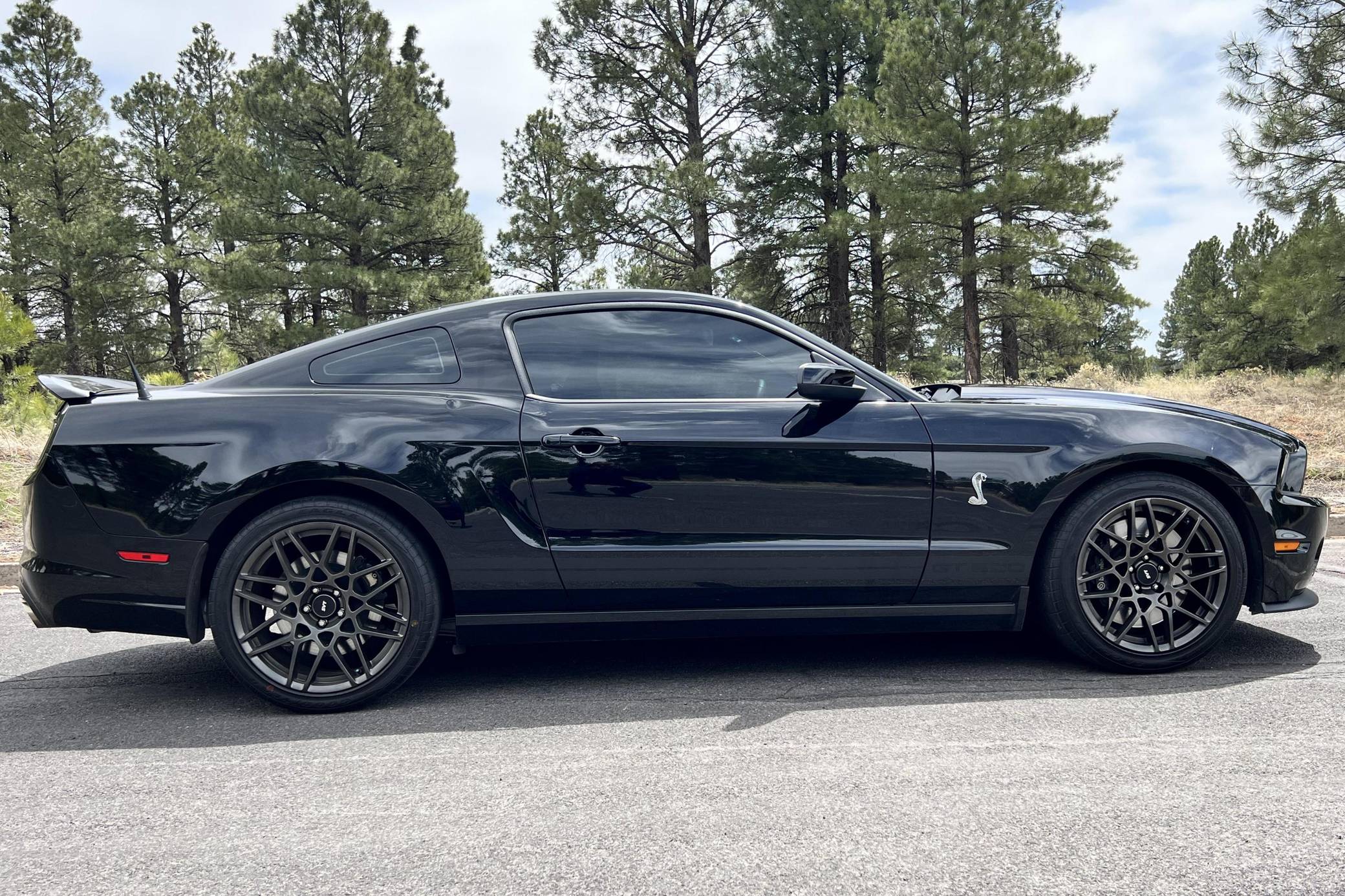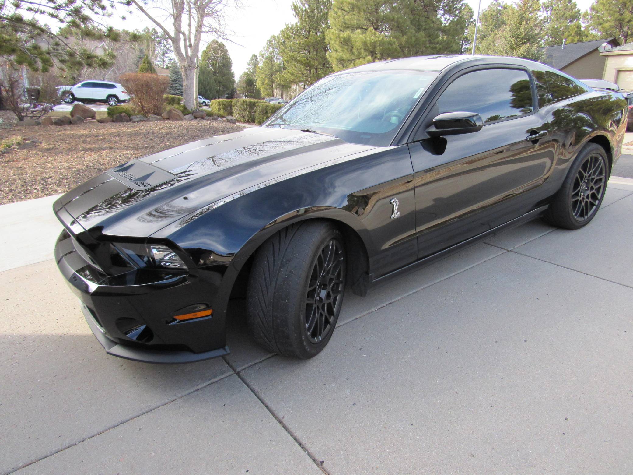 2013 Ford Mustang Shelby GT500, finished in black with a black interior. This GT500 is equipped with a 6-speed manual transmission, and the odometer indicates roughly 30,100 miles. A partial list of notable equipment includes the SVT Performance Package, SVT Track Package, the Electronics Package, a limited-slip differential, SVT engineered Bilstein cockpit-select dampers, Shelby Recaro seats, a Shaker Pro audio system, and more listed below. The seller reports no modifications. The 2013 Ford Mustang Shelby GT500 was the first factory Mustang to achieve a top speed of over 200 mph, stopping at 202 mph. This is also the last Shelby GT500 variant of the “S197” generation of the Mustang, featuring many chassis upgrades over its predecessor along with the final styling revisions introduced for the 2013 model year. Power comes from a supercharged 5. 8-liter V8, rated at 662 horsepower and 631 lb-ft of torque. It powers the rear wheels via a 6-speed manual transmission.