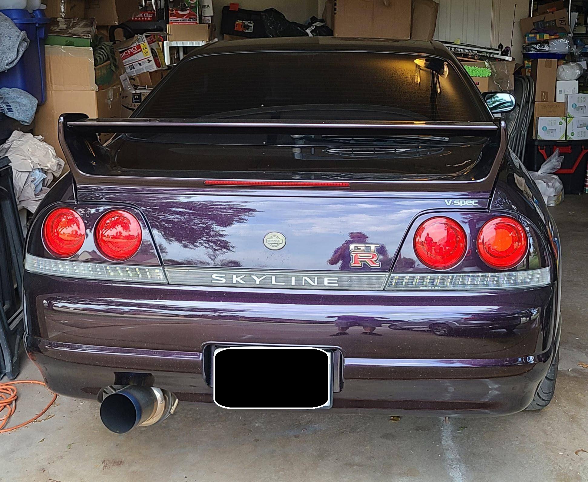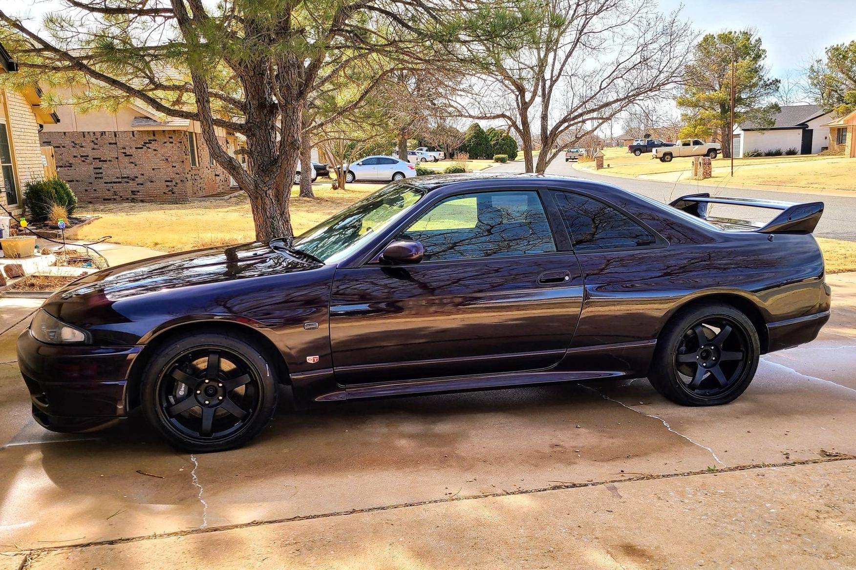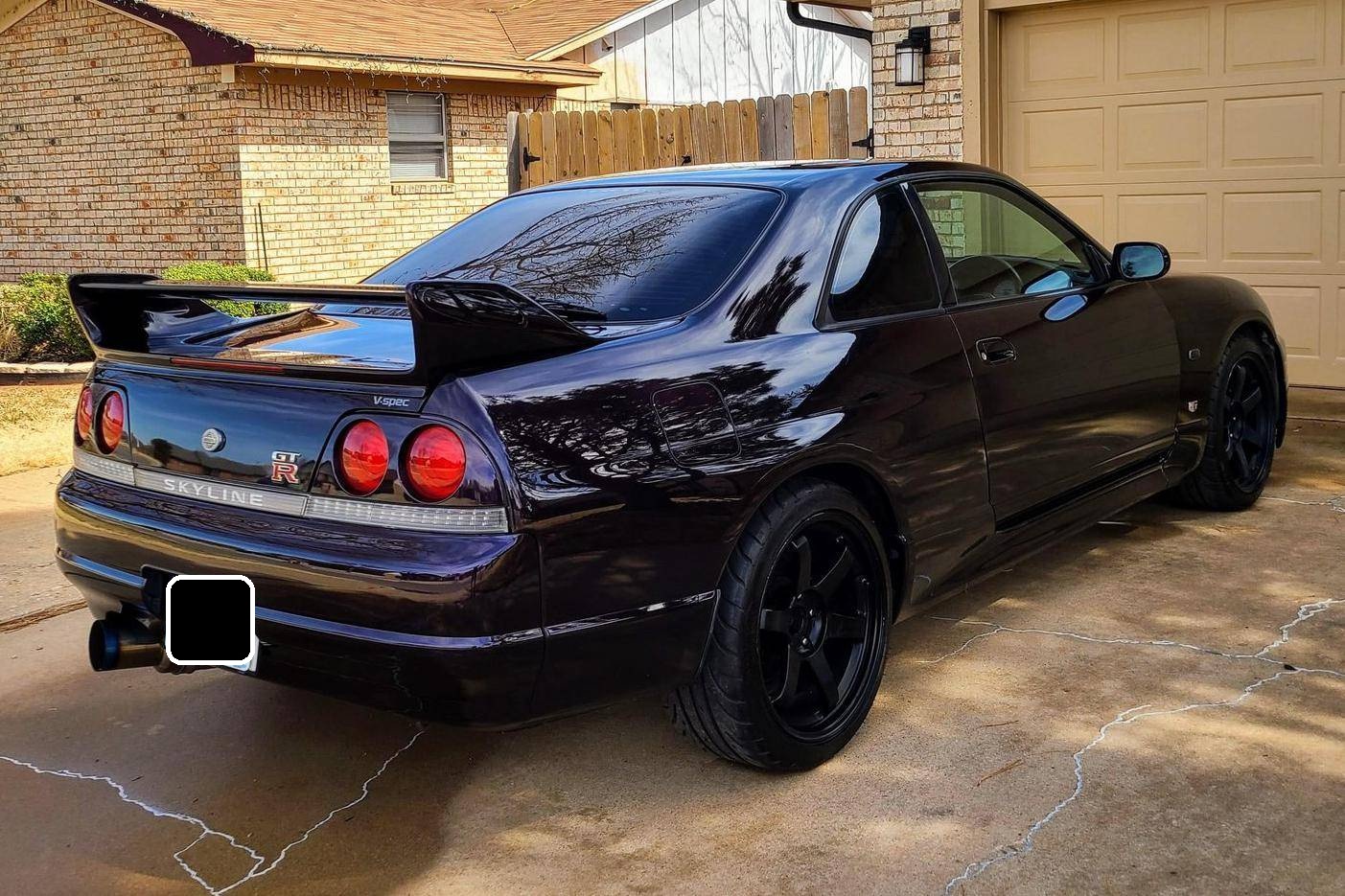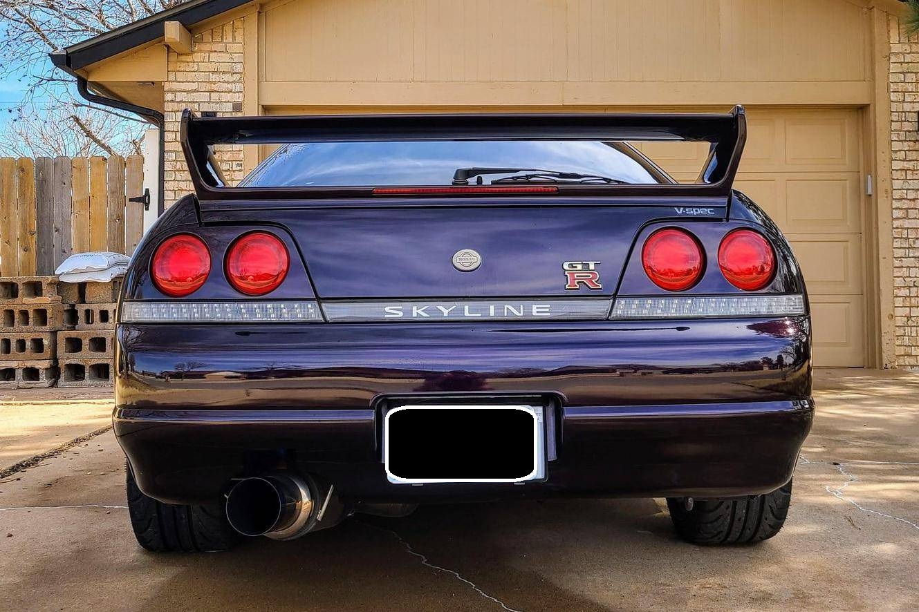 1995 Nissan Skyline GT-R V-Spec, finished in Midnight Purple with a black interior. This GT-R is a Japanese-spec, right-hand-drive car. Said to be imported from Japan in 2020, it's equipped with a metric instrument cluster, and the odometer shows about 156,200 kilometers, which represents approximately 97,100 miles. Equipment includes the ATTESA E-TS Pro all-wheel-drive system with active limited-slip differential, Brembo brakes, Super HICAS 4-wheel steering, a rear spoiler, cloth upholstery, air conditioning, and more as detailed below. A partial list of modifications reported by the seller includes an R34 block, bottom end, and head, dual Borg-Warner 6258 turbochargers, Tomei camshafts, GReddy intercooler, Tomei titanium exhaust system, an ECU tune, 18-inch aftermarket wheels, Blitz coilovers, a MOMO steering wheel, and a Kenwood head unit with remote. The ninth-generation Skyline was introduced in 1993, and the range-topping GT-R model was renowned for its impressive power and exceptional handling, aided by its all-wheel-drive system and available rear-wheel steering. Power comes from a rebuilt 2. 6-liter twin-turbocharged inline-6 that was donated from an R34 Skyline. It features strengthened internals and is highly modified, though a dyno sheet was not provided to confirm horsepower numbers. Output is sent to all four wheels through a 5-speed manual transmission.