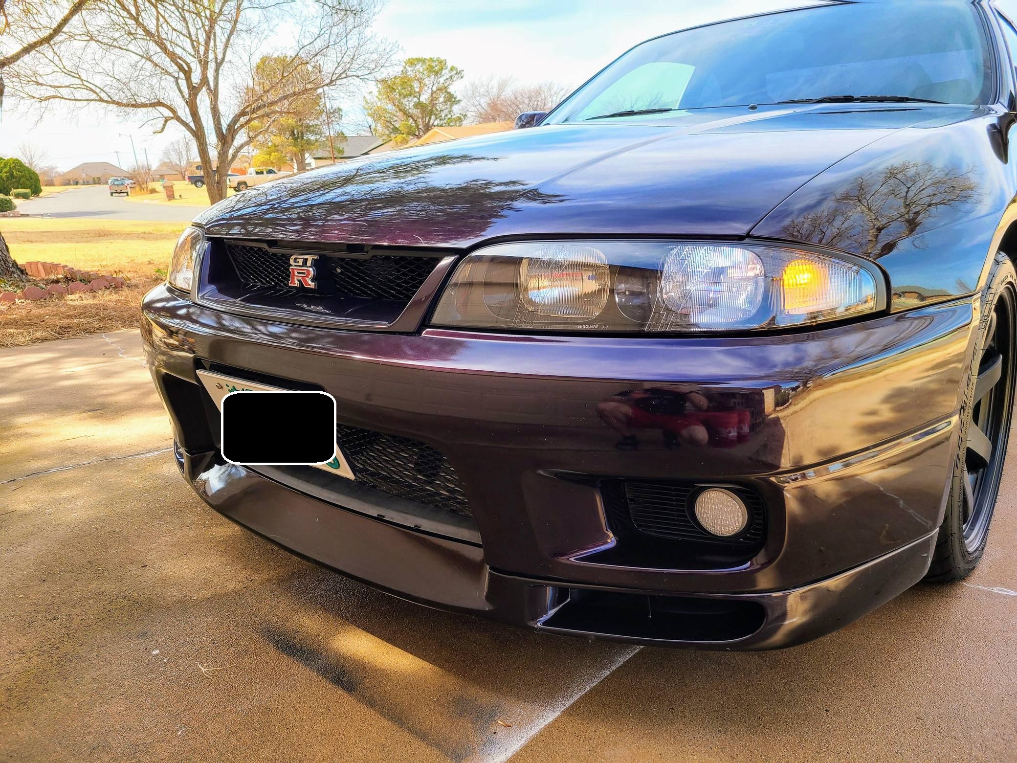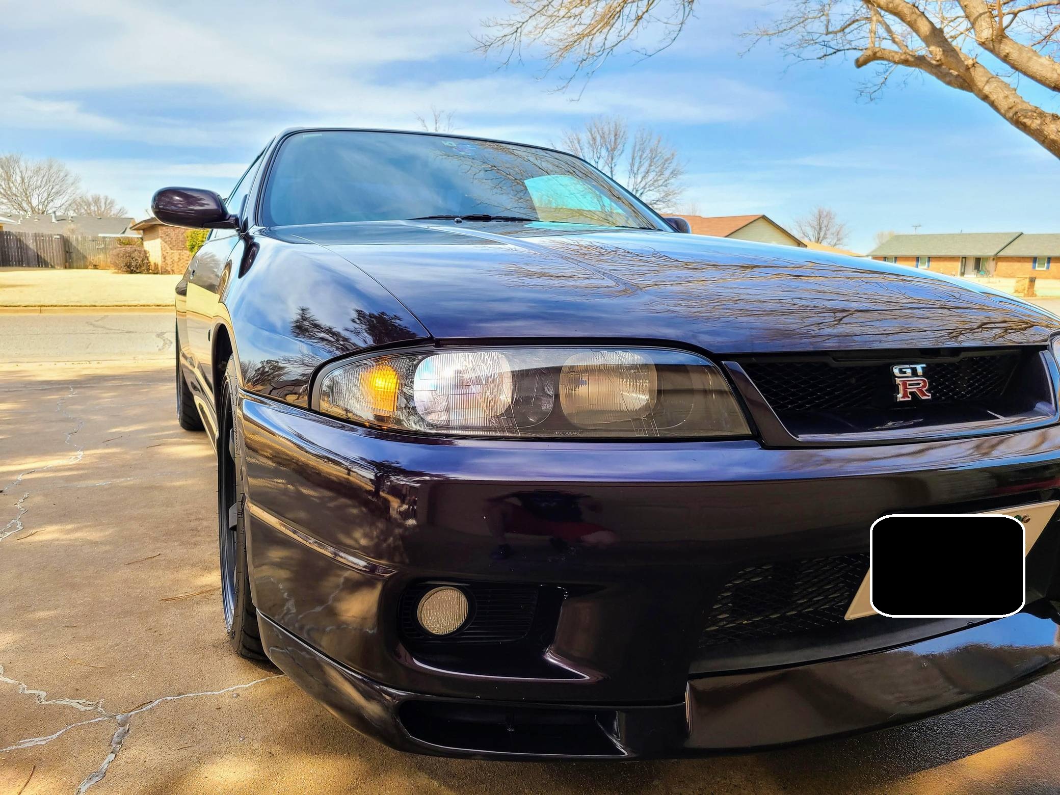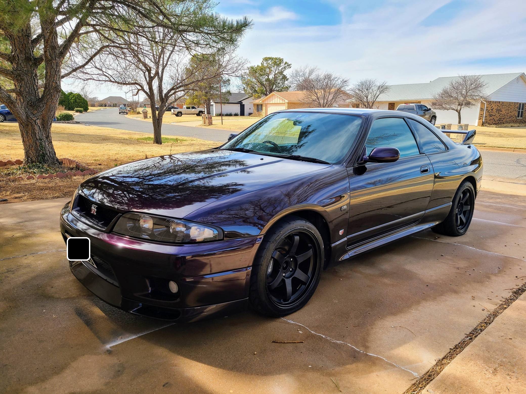 1995 Nissan Skyline GT-R V-Spec, finished in Midnight Purple with a black interior. This GT-R is a Japanese-spec, right-hand-drive car. Said to be imported from Japan in 2020, it's equipped with a metric instrument cluster, and the odometer shows about 156,200 kilometers, which represents approximately 97,100 miles. Equipment includes the ATTESA E-TS Pro all-wheel-drive system with active limited-slip differential, Brembo brakes, Super HICAS 4-wheel steering, a rear spoiler, cloth upholstery, air conditioning, and more as detailed below. A partial list of modifications reported by the seller includes an R34 block, bottom end, and head, dual Borg-Warner 6258 turbochargers, Tomei camshafts, GReddy intercooler, Tomei titanium exhaust system, an ECU tune, 18-inch aftermarket wheels, Blitz coilovers, a MOMO steering wheel, and a Kenwood head unit with remote. The ninth-generation Skyline was introduced in 1993, and the range-topping GT-R model was renowned for its impressive power and exceptional handling, aided by its all-wheel-drive system and available rear-wheel steering. Power comes from a rebuilt 2. 6-liter twin-turbocharged inline-6 that was donated from an R34 Skyline. It features strengthened internals and is highly modified, though a dyno sheet was not provided to confirm horsepower numbers. Output is sent to all four wheels through a 5-speed manual transmission.