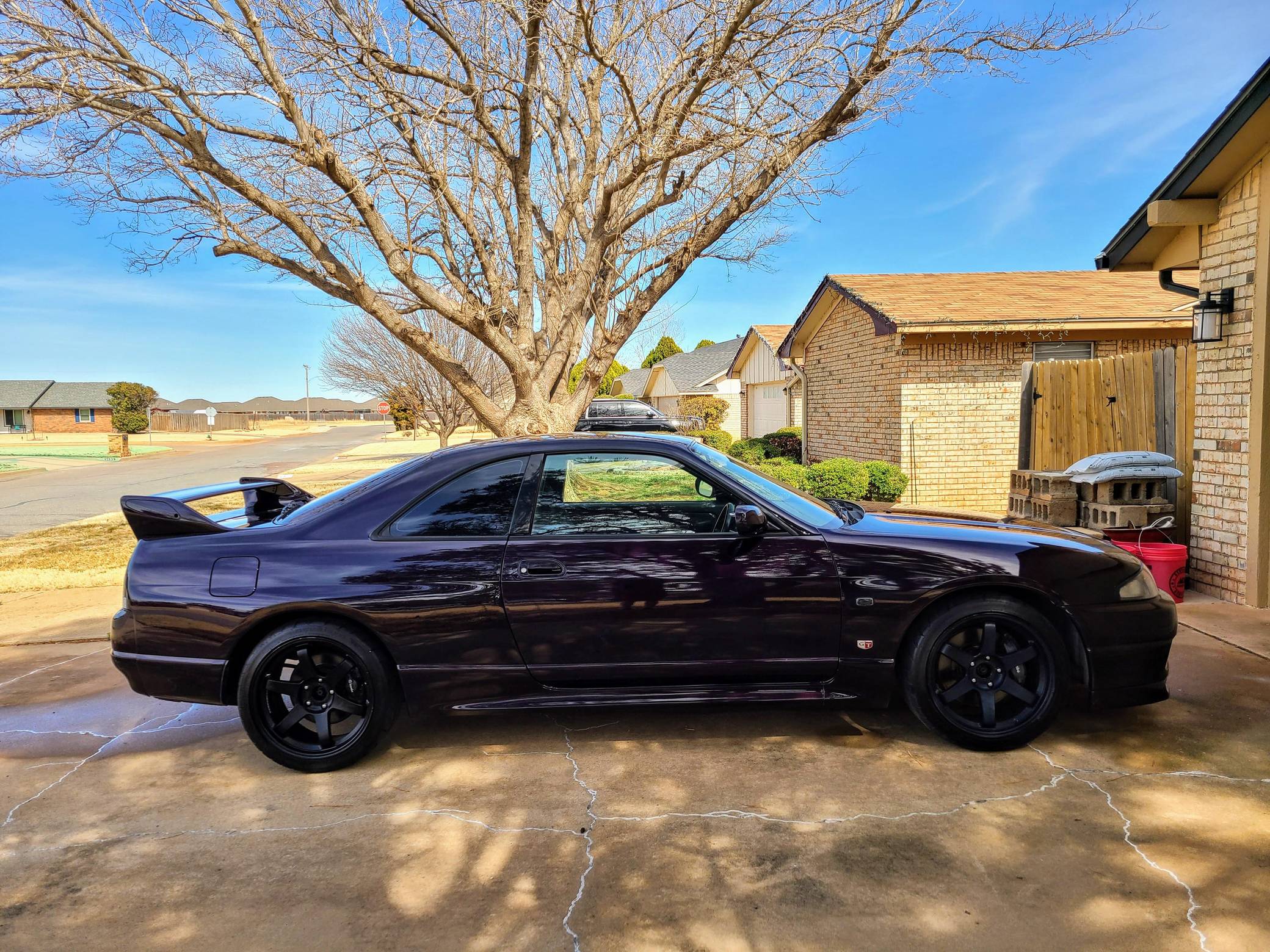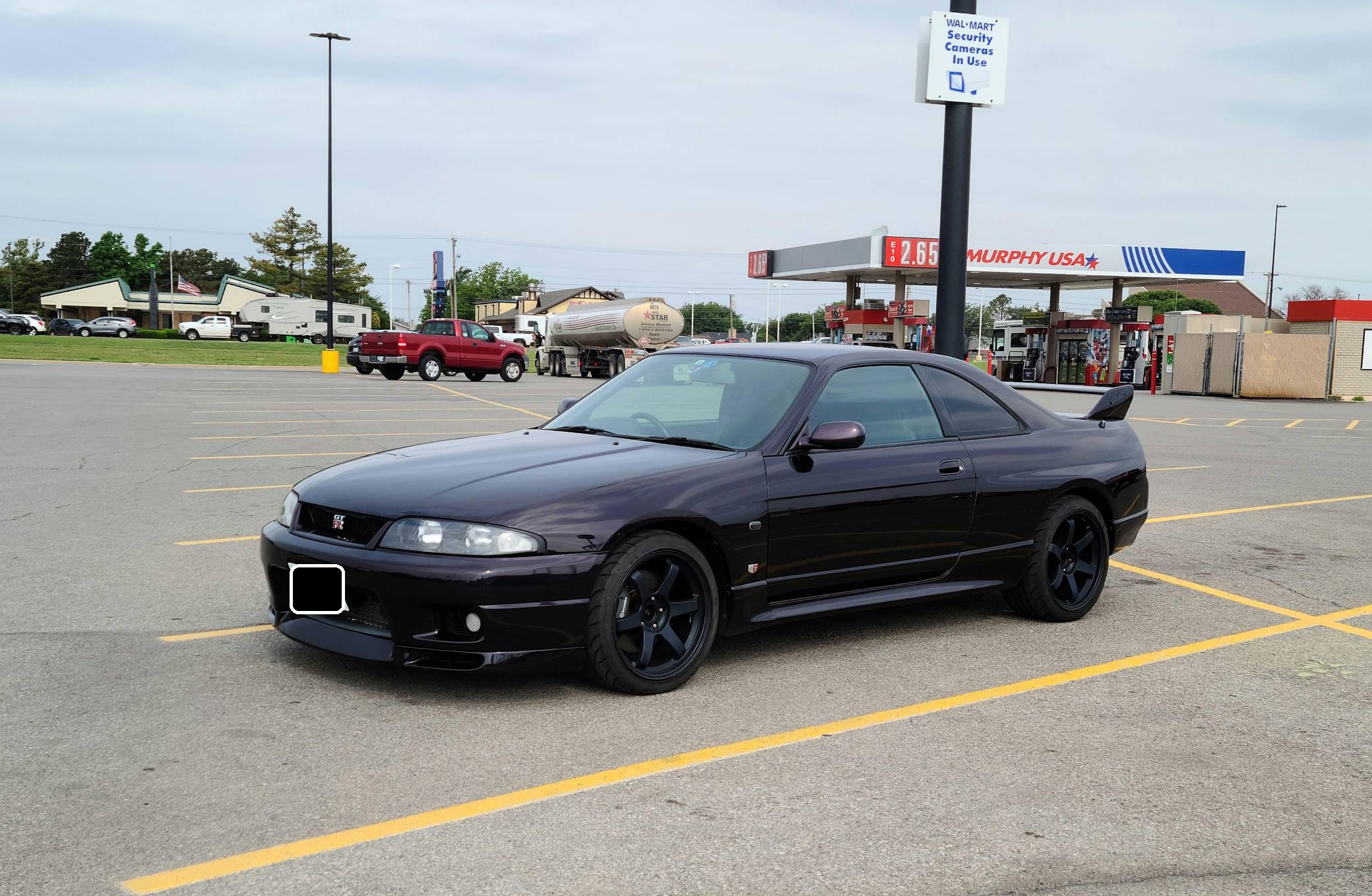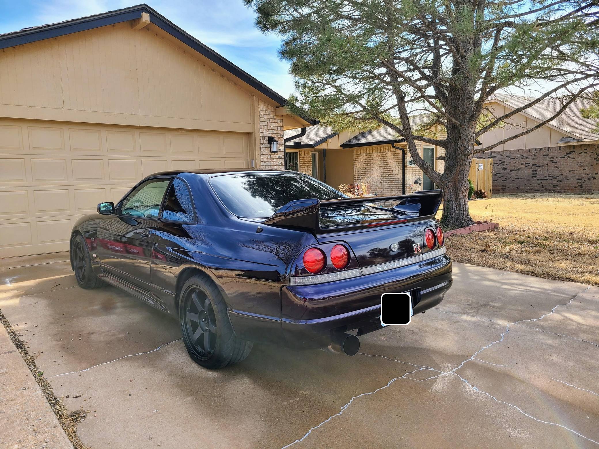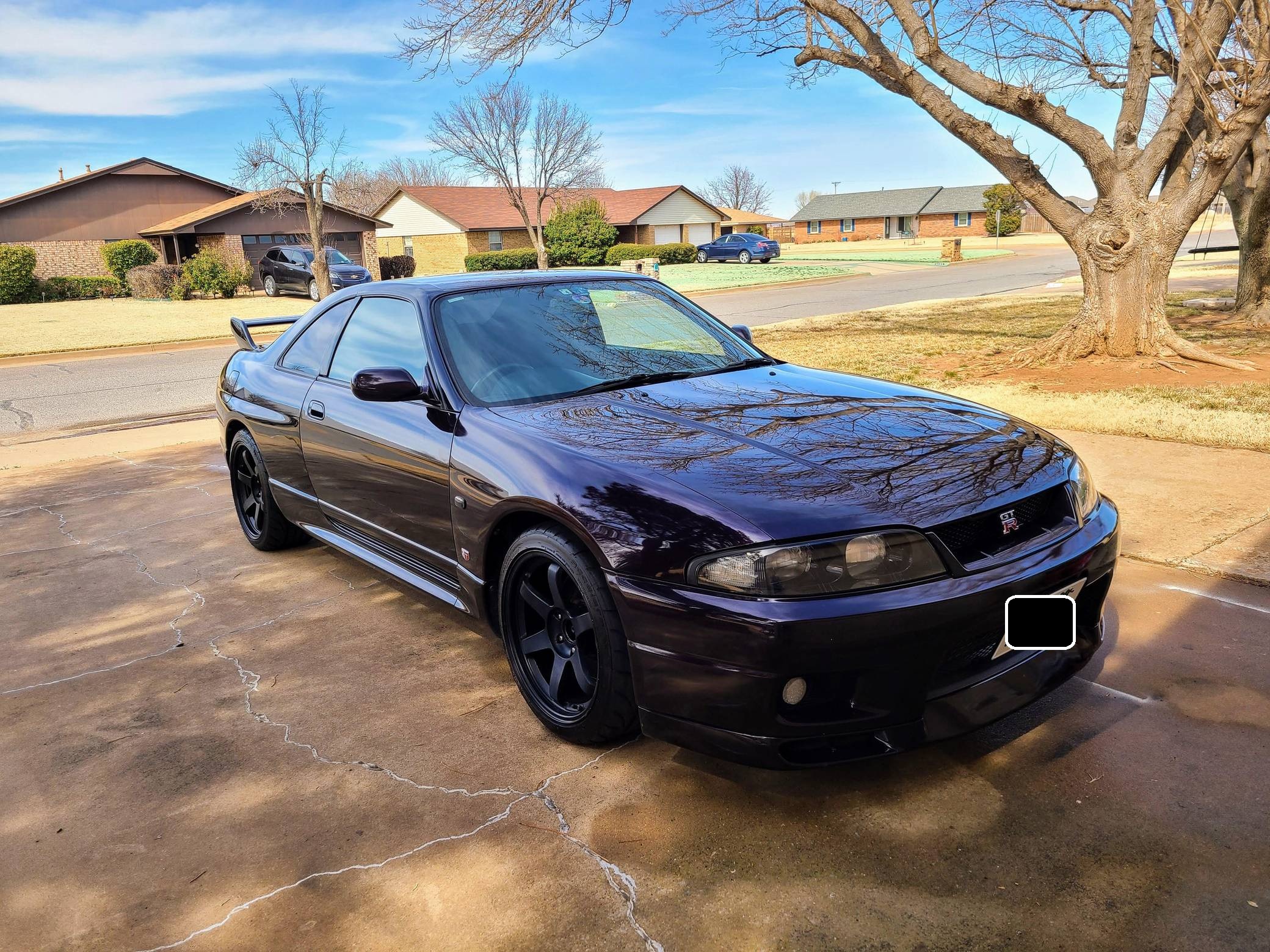 1995 Nissan Skyline GT-R V-Spec, finished in Midnight Purple with a black interior. This GT-R is a Japanese-spec, right-hand-drive car. Said to be imported from Japan in 2020, it's equipped with a metric instrument cluster, and the odometer shows about 156,200 kilometers, which represents approximately 97,100 miles. Equipment includes the ATTESA E-TS Pro all-wheel-drive system with active limited-slip differential, Brembo brakes, Super HICAS 4-wheel steering, a rear spoiler, cloth upholstery, air conditioning, and more as detailed below. A partial list of modifications reported by the seller includes an R34 block, bottom end, and head, dual Borg-Warner 6258 turbochargers, Tomei camshafts, GReddy intercooler, Tomei titanium exhaust system, an ECU tune, 18-inch aftermarket wheels, Blitz coilovers, a MOMO steering wheel, and a Kenwood head unit with remote. The ninth-generation Skyline was introduced in 1993, and the range-topping GT-R model was renowned for its impressive power and exceptional handling, aided by its all-wheel-drive system and available rear-wheel steering. Power comes from a rebuilt 2. 6-liter twin-turbocharged inline-6 that was donated from an R34 Skyline. It features strengthened internals and is highly modified, though a dyno sheet was not provided to confirm horsepower numbers. Output is sent to all four wheels through a 5-speed manual transmission.