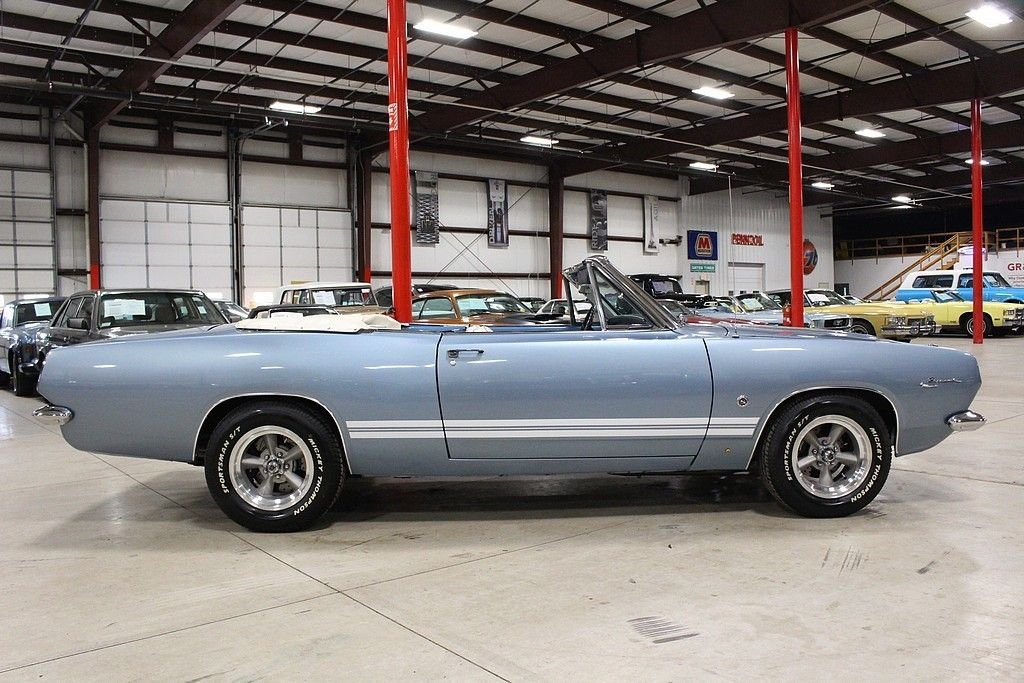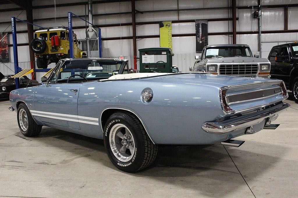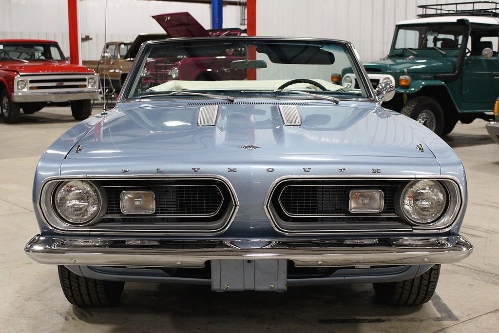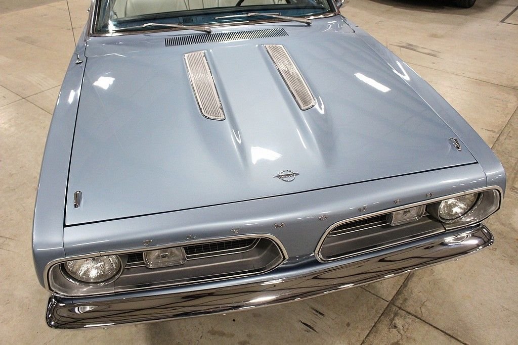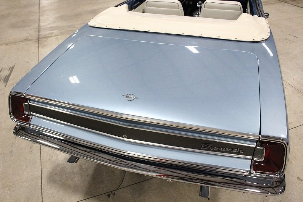 This Barracuda, though mostly stock in appearance, has been thoughtfully upgraded in areas of performance and drivability. This rare, fully restored example is powered by a professionally prepared by Ray Barton 383 bored and stroked to 471 CID , fortified with Edlebrock aluminum heads, aluminum intake, 650 CFM carb, intake cleaner and valve covers. The build also features Diamond pistons, Melling high volume oil pump, aluminum water pump, MSD ignition and other top of the line internal goodies. Previous owner states that the car dyno's at a healthy 504 horsepower. The transmission is a Hughes built and upgraded 727 transmission. Other mechanical highlights include: Wilwood disc brakes, 8 ¾ inch rear end, anti sway bars front and rear, new wheels and tires, new battery, Shumauker headers, stainless steel fuel lines, new tire rods and ball joints, etc. Cosmetically, the car features excellent exterior paint, retains the original bright work, the blue and white interior is excellent and features bucket seats and the original console shift, the engine compartment is detailed and beautiful, and trunk is excellent. The underside frame and floors have been restored and show wonderful. Our test drive revealed a very powerful convertible and possess excellent handling and drivability. It behaves well in all situations from stop and go traffic, country cruising to flat out on the highway. This car gets out of the hole fast and possess excellent acceleration when driving from light to light. The power convertible top works perfectly. There is less than 500 miles on the motor build, it has never been raced and always cared for as a part of a private collection. Added value is the underside of the rear deck lid is signed by “Big Daddy” Don Garlits. Just in time for spring, this car is ready to show and go.