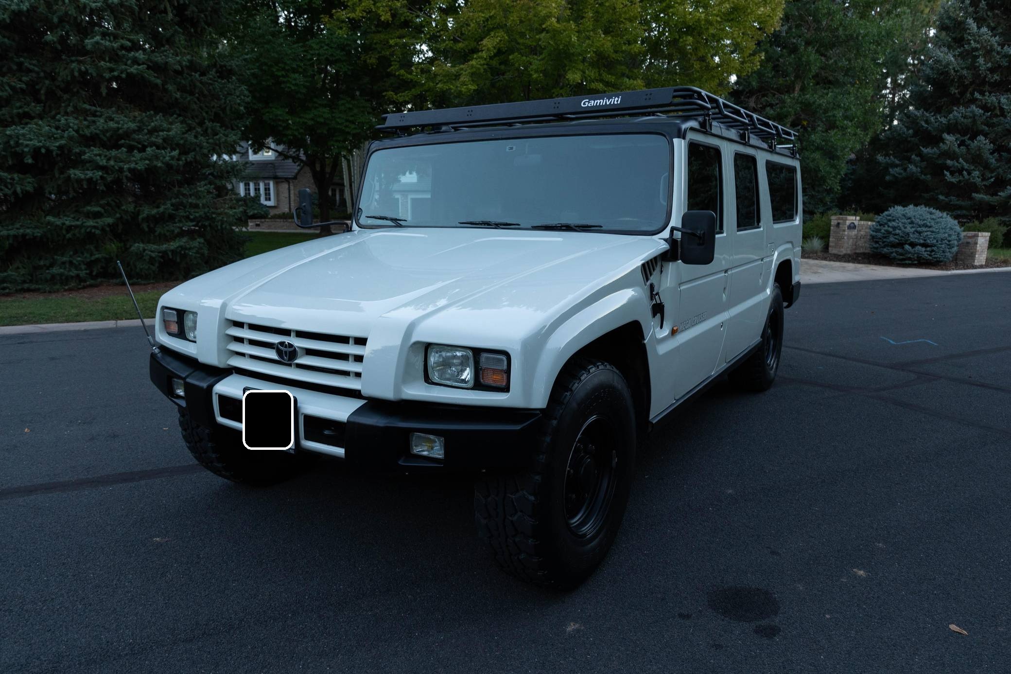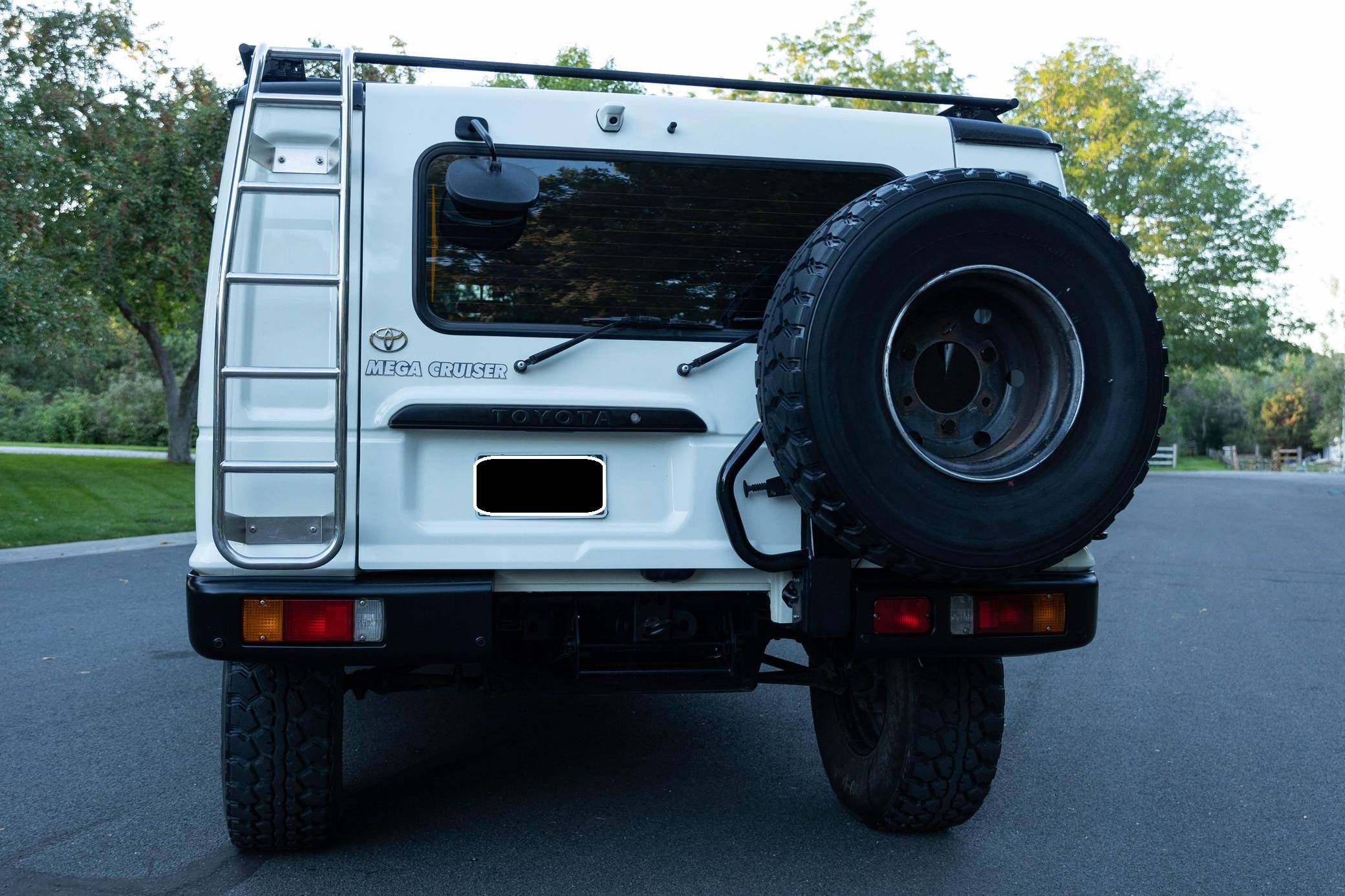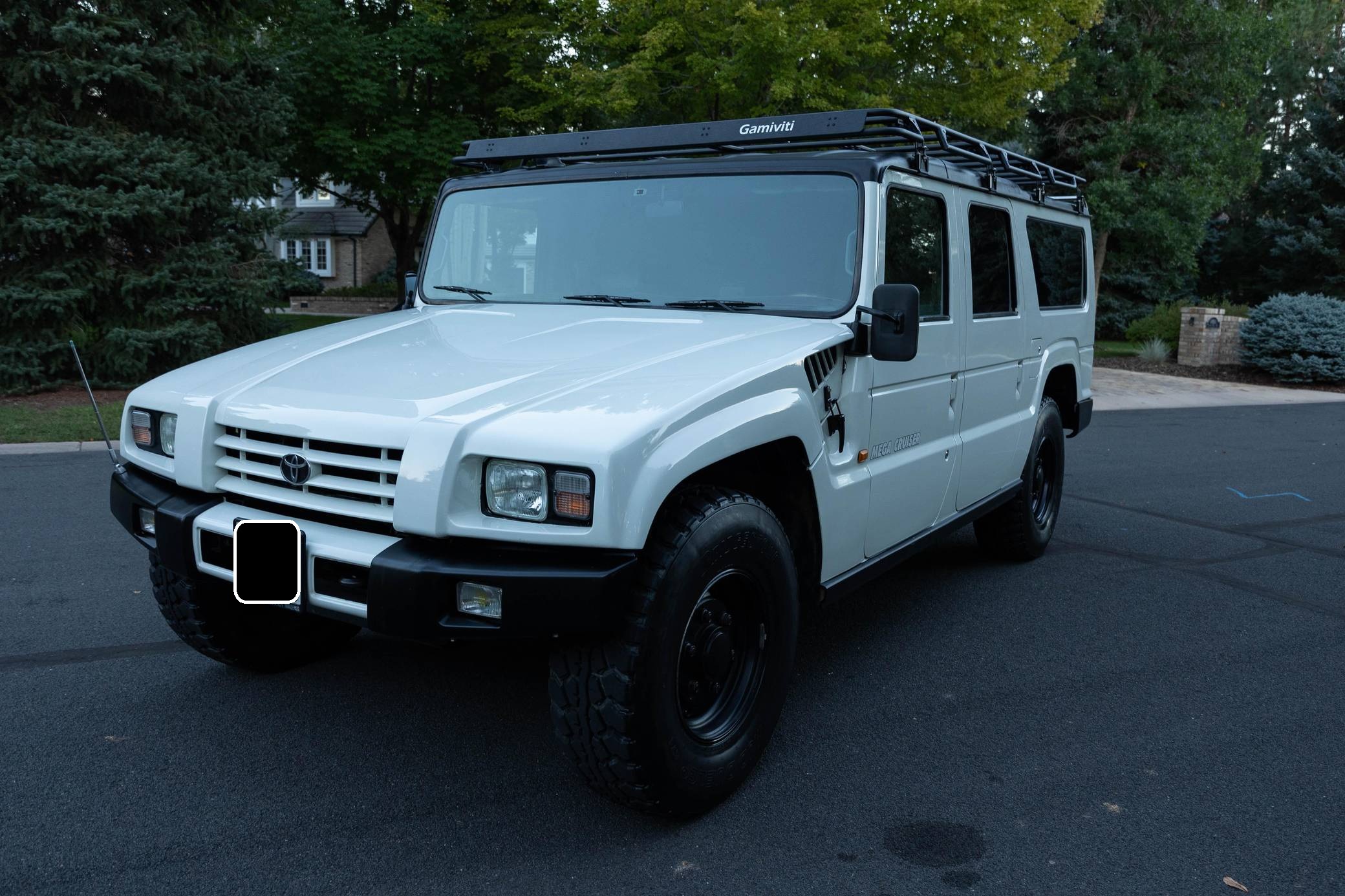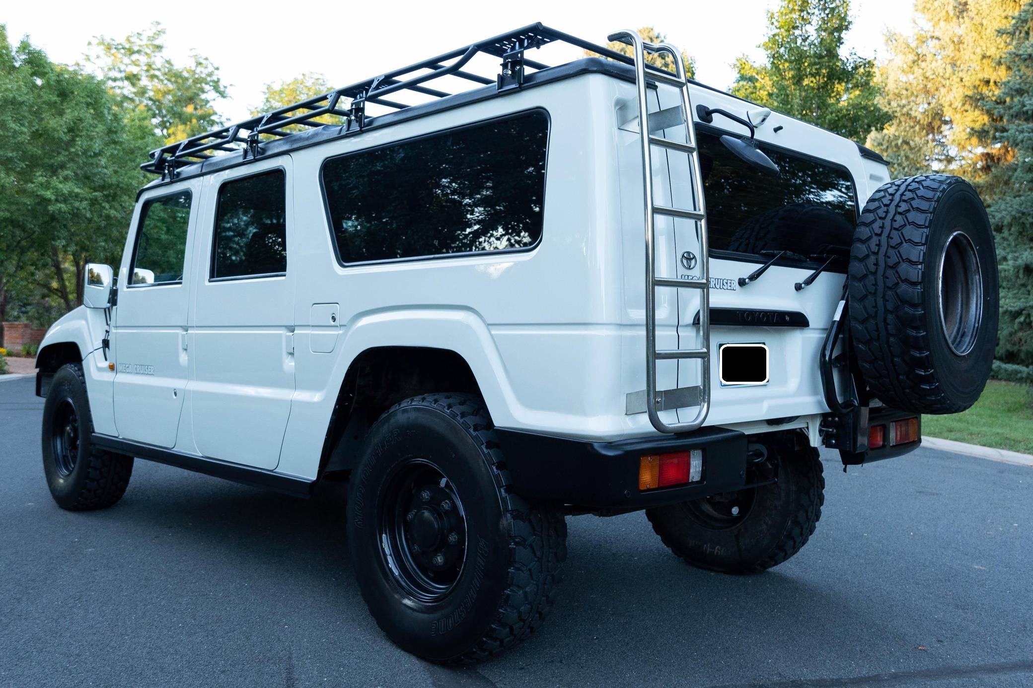THIS. . . is a 1996 Toyota Mega Cruiser, finished in white with a gray interior. Reportedly imported from Kazakhstan, it's equipped with a metric instrument cluster and its odometer displays about 90,900 kilometers, which represents around 56,500 miles. Doug DeMuro recently reviewed this Mega Cruiser and his video is viewable below. Factory equipment includes 17. 5-inch wheels, portal axles, locking front, center, and rear differentials, a four-wheel steering system, a rear-mounted ladder, and a folding rear step. This Mega Cruiser has been converted from right-hand-drive to left-hand-drive. The list of modifications reported by the seller also includes a fuel system pre-heating kit, a parking pole, a Gamiviti roof rack, wood interior trim, heated front and rear seats, LED interior lighting, and a trunk-mounted subwoofer. Like the Hummer H1, the Toyota Mega Cruiser started life as a tough, go-anywhere off-roader designed for military use. Toyota launched a civilian model, called "BXD20" internally, in 1996 and marketed it as its flagship SUV. Buyers got what they paid for: big enough to dwarf a Land Cruiser, the aptly-named Mega Cruiser featured portal axles, locking differentials, a four-wheel steering system, and a cavernous interior. Production ended in 2001 and most historians agree fewer than 150 civilian units were built. Power comes from a 4. 1-liter turbodiesel 4-cylinder engine, rated at about 155 horsepower and 282 lb-ft of torque. Called "15B-FT" internally, it spins the four wheels via a 4-speed automatic transmission and a 2-speed transfer case.