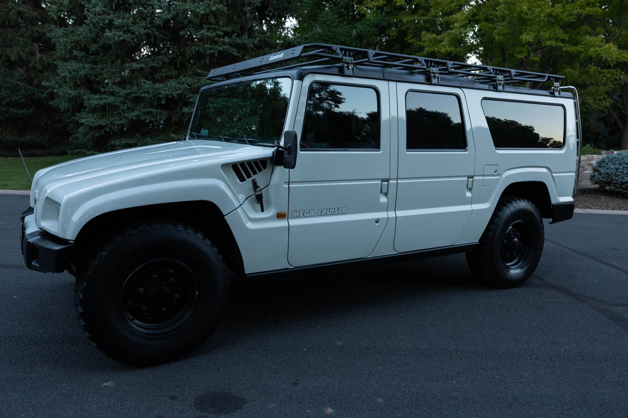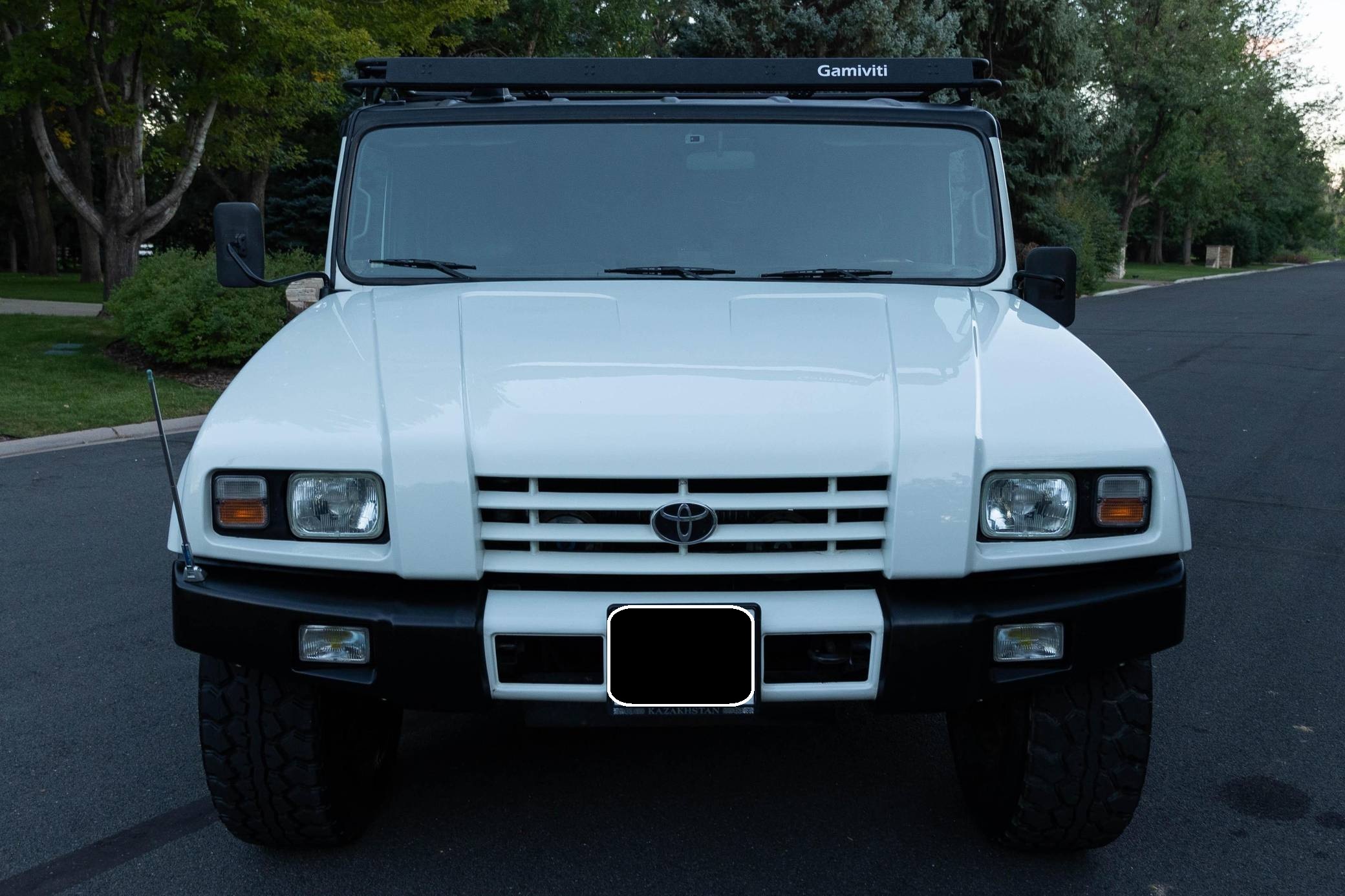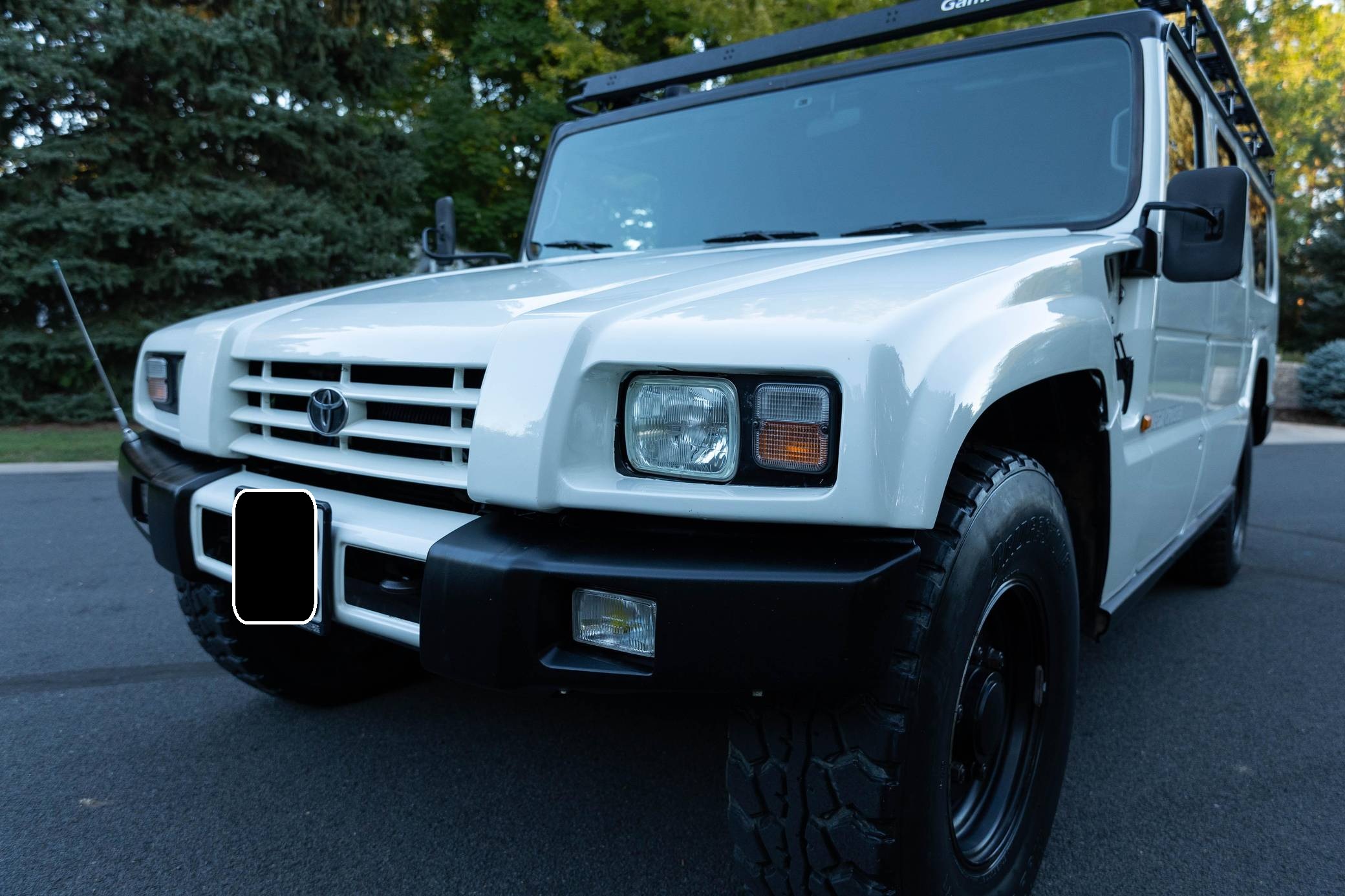 THIS. . . is a 1996 Toyota Mega Cruiser, finished in white with a gray interior. Reportedly imported from Kazakhstan, it's equipped with a metric instrument cluster and its odometer displays about 90,900 kilometers, which represents around 56,500 miles. Doug DeMuro recently reviewed this Mega Cruiser and his video is viewable below. Factory equipment includes 17. 5-inch wheels, portal axles, locking front, center, and rear differentials, a four-wheel steering system, a rear-mounted ladder, and a folding rear step. This Mega Cruiser has been converted from right-hand-drive to left-hand-drive. The list of modifications reported by the seller also includes a fuel system pre-heating kit, a parking pole, a Gamiviti roof rack, wood interior trim, heated front and rear seats, LED interior lighting, and a trunk-mounted subwoofer. Like the Hummer H1, the Toyota Mega Cruiser started life as a tough, go-anywhere off-roader designed for military use. Toyota launched a civilian model, called "BXD20" internally, in 1996 and marketed it as its flagship SUV. Buyers got what they paid for: big enough to dwarf a Land Cruiser, the aptly-named Mega Cruiser featured portal axles, locking differentials, a four-wheel steering system, and a cavernous interior. Production ended in 2001 and most historians agree fewer than 150 civilian units were built. Power comes from a 4. 1-liter turbodiesel 4-cylinder engine, rated at about 155 horsepower and 282 lb-ft of torque. Called "15B-FT" internally, it spins the four wheels via a 4-speed automatic transmission and a 2-speed transfer case.