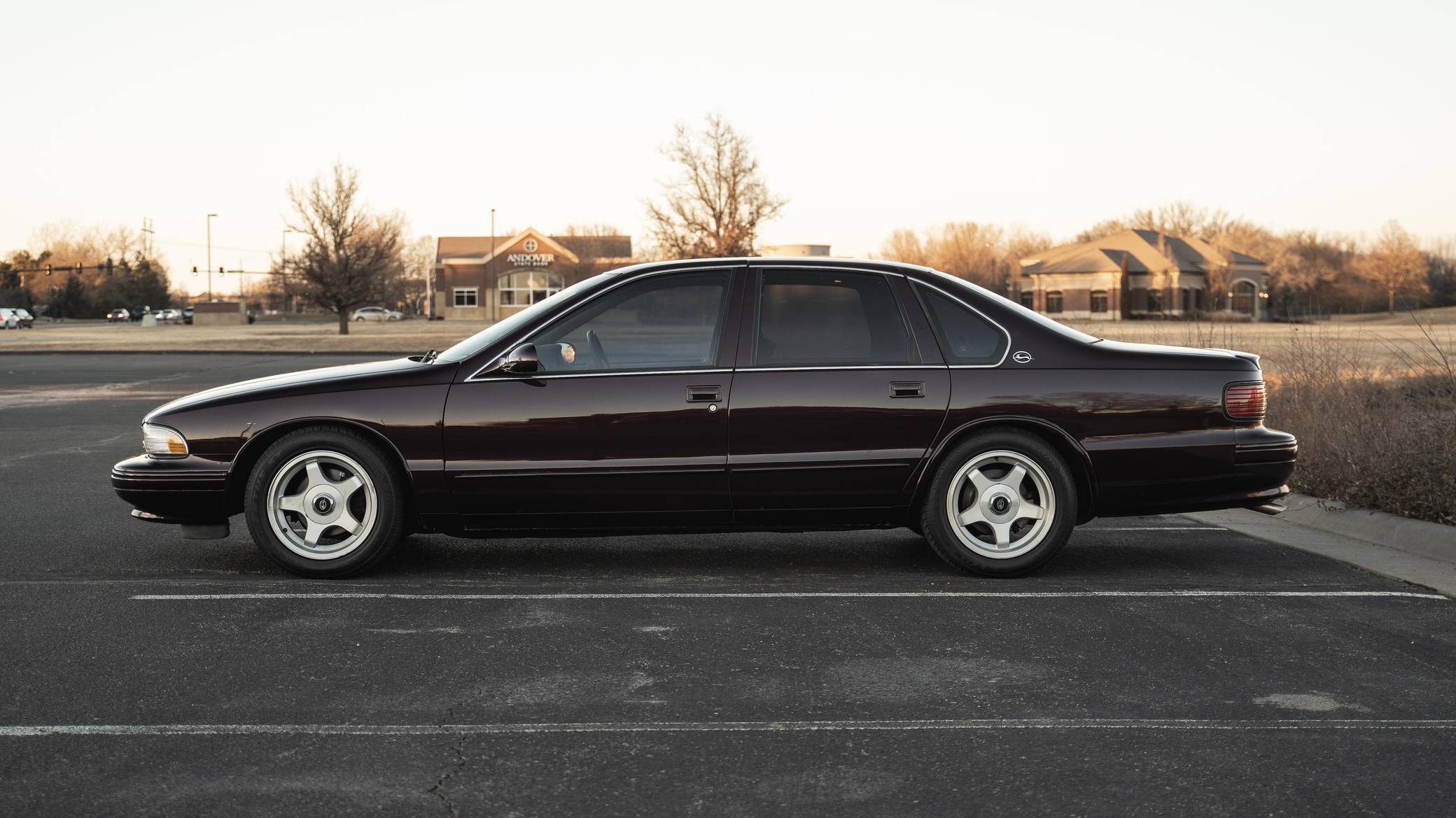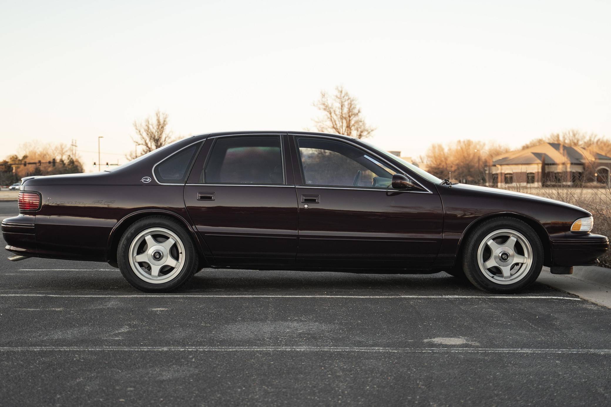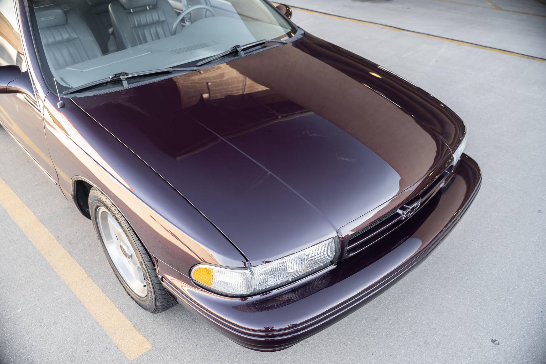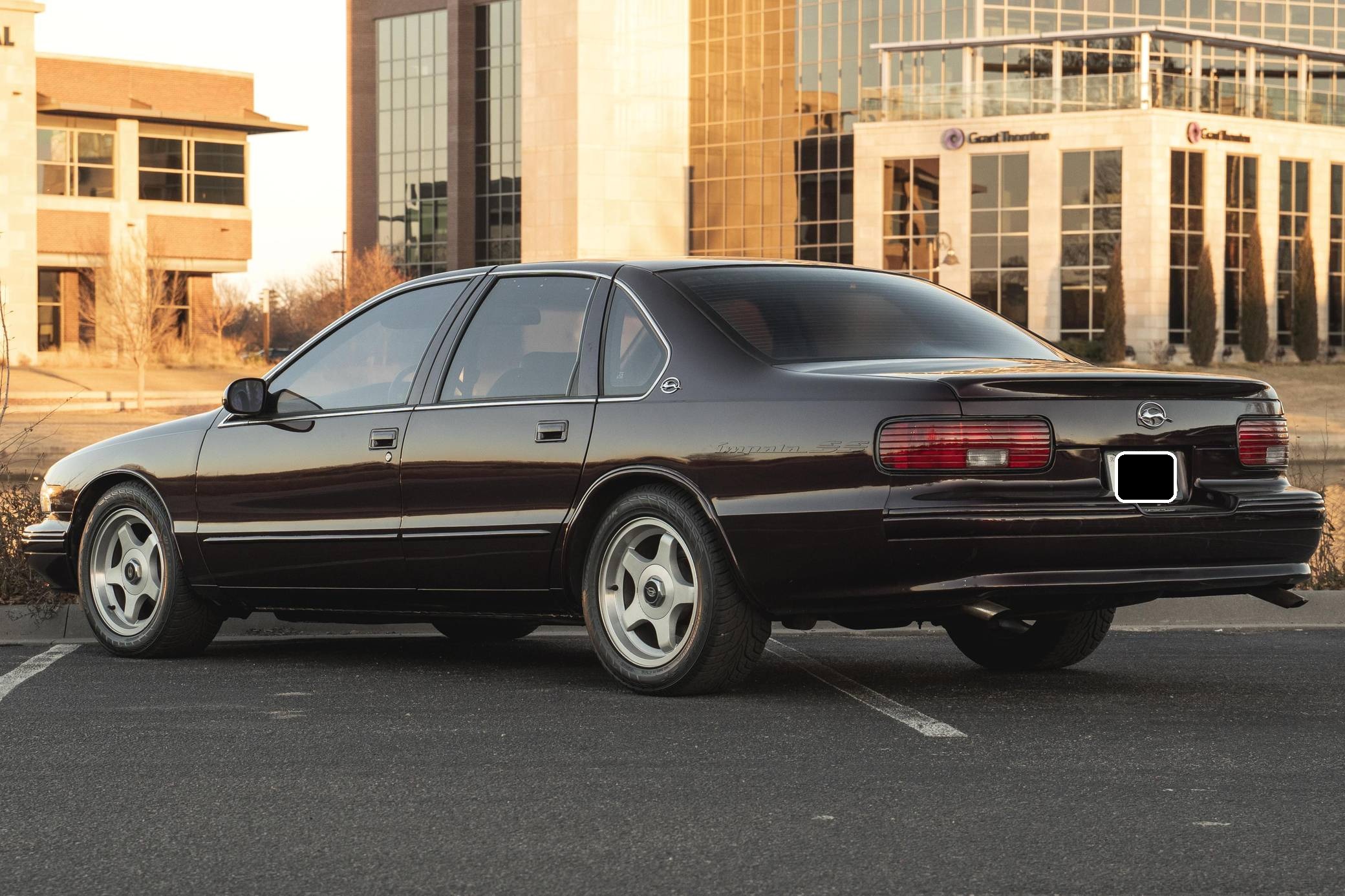 1996 Chevrolet Impala SS, finished in Dark Cherry Metallic with a grey interior. The odometer currently reads approximately 30,200 miles. Service documentation included in the photo gallery details a reconditioning of this Impala SS in 2021, including replacing the fuel pump, fuel injectors, brake rotors and pads, tires, water pump, sway bar end links, and more. The seller also reports that the car was repainted in its factory Dark Cherry Metallic color. An RPO sheet is provided in the photo gallery, and a partial list of notable equipment includes a sport-tuned suspension, limited-slip differential, transmission cooler, power-adjustable front seats, and air conditioning, among other standard and optional equipment. This Impala SS is unmodified. Sold between the 1994 and 1996 model years, the Impala SS was based on the B-Body Caprice of the same era. The "SS" moniker cars sported a Corvette-derived LT1 V8 with iron heads along with a revised intake and exhaust. The chassis featured the police package's suspension system, De Carbon monotube shocks, a lower ride height, and huge disc brakes at all four corners. Power for this Impala SS comes from an LT1 5. 7-liter V8 engine, rated at 260 horsepower and 330 lb-ft of torque. Output is sent to the rear wheels via a 4-speed automatic transmission.