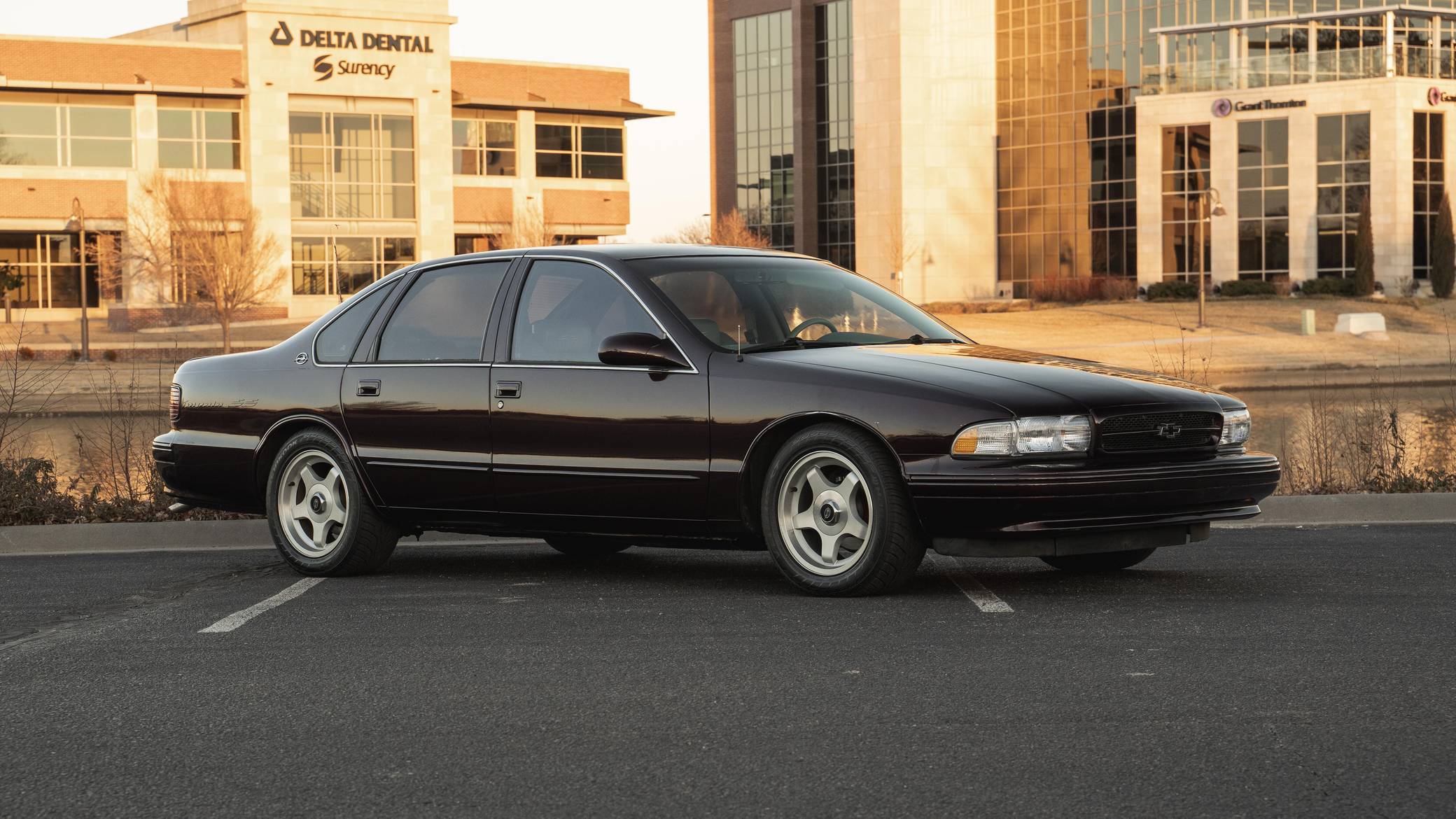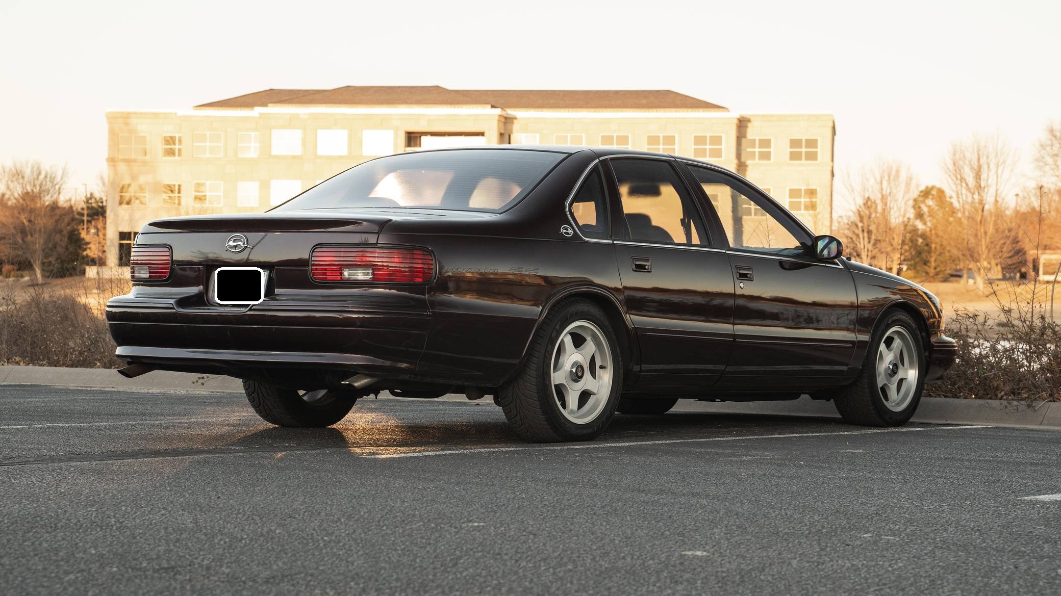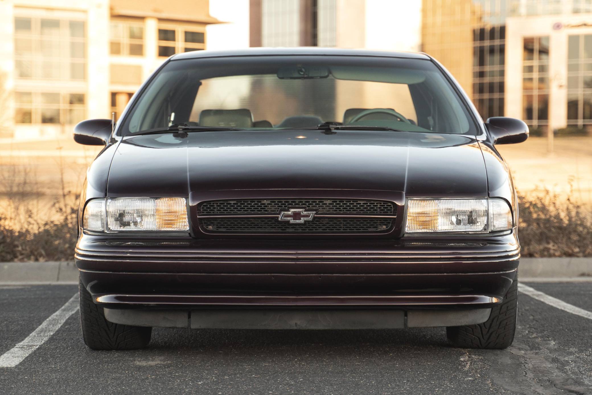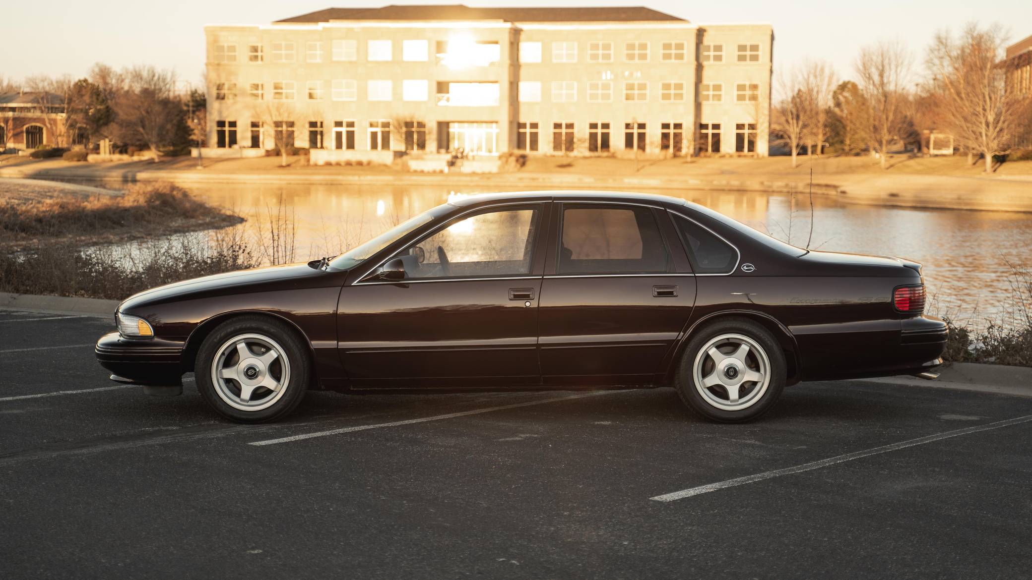 1996 Chevrolet Impala SS, finished in Dark Cherry Metallic with a grey interior. The odometer currently reads approximately 30,200 miles. Service documentation included in the photo gallery details a reconditioning of this Impala SS in 2021, including replacing the fuel pump, fuel injectors, brake rotors and pads, tires, water pump, sway bar end links, and more. The seller also reports that the car was repainted in its factory Dark Cherry Metallic color. An RPO sheet is provided in the photo gallery, and a partial list of notable equipment includes a sport-tuned suspension, limited-slip differential, transmission cooler, power-adjustable front seats, and air conditioning, among other standard and optional equipment. This Impala SS is unmodified. Sold between the 1994 and 1996 model years, the Impala SS was based on the B-Body Caprice of the same era. The "SS" moniker cars sported a Corvette-derived LT1 V8 with iron heads along with a revised intake and exhaust. The chassis featured the police package's suspension system, De Carbon monotube shocks, a lower ride height, and huge disc brakes at all four corners. Power for this Impala SS comes from an LT1 5. 7-liter V8 engine, rated at 260 horsepower and 330 lb-ft of torque. Output is sent to the rear wheels via a 4-speed automatic transmission.