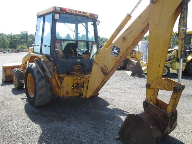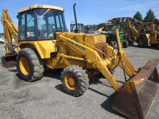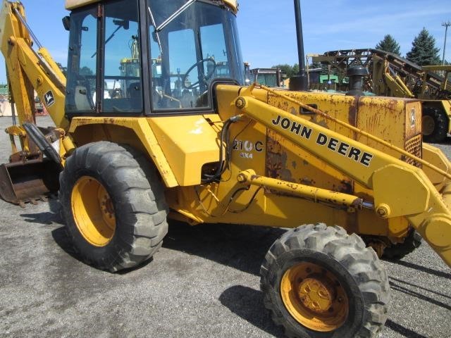 1988 John Deere 210C backhoe, hp 55, 4WD, cab, heat, std hoe, 36" rear bucket, 16.9-24 rear tires, 12-16.5 front tires, 91" front bucket, 4 cyl John Deere diesel, 2 lever backhoe controls, 4-speed shuttle trans, digs 14' deep, weighs 11,500lbs, runs and operates great.