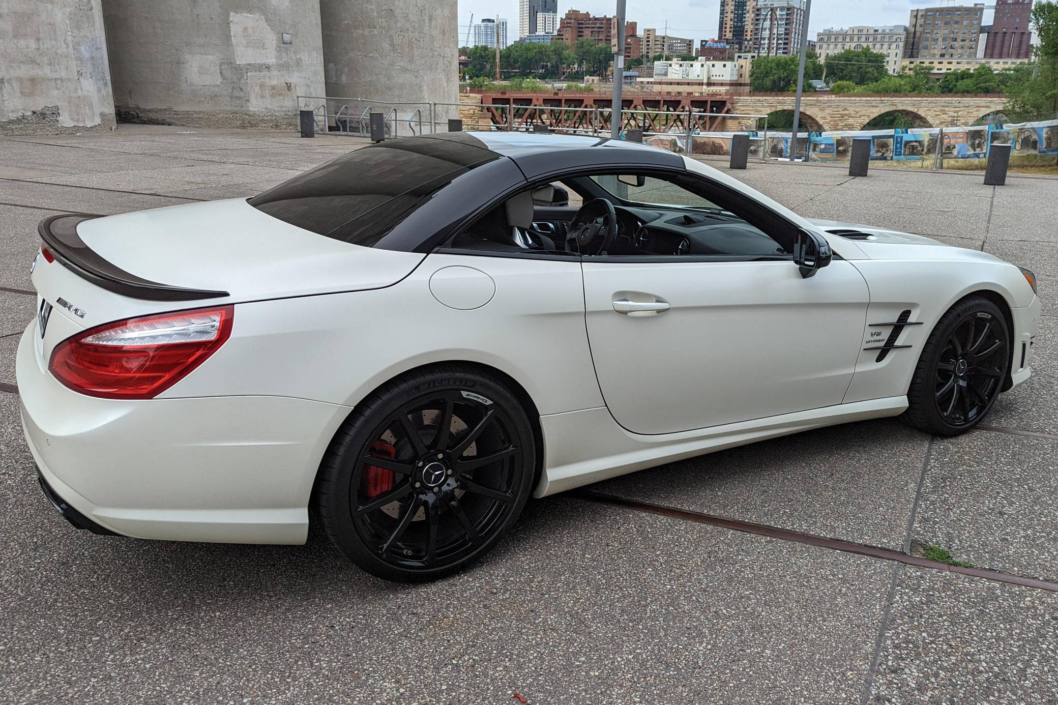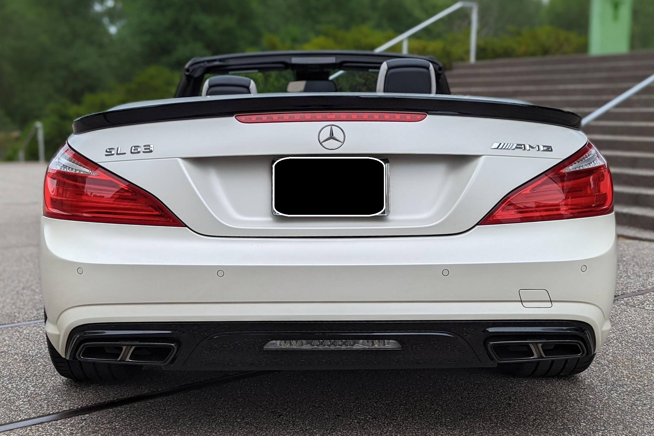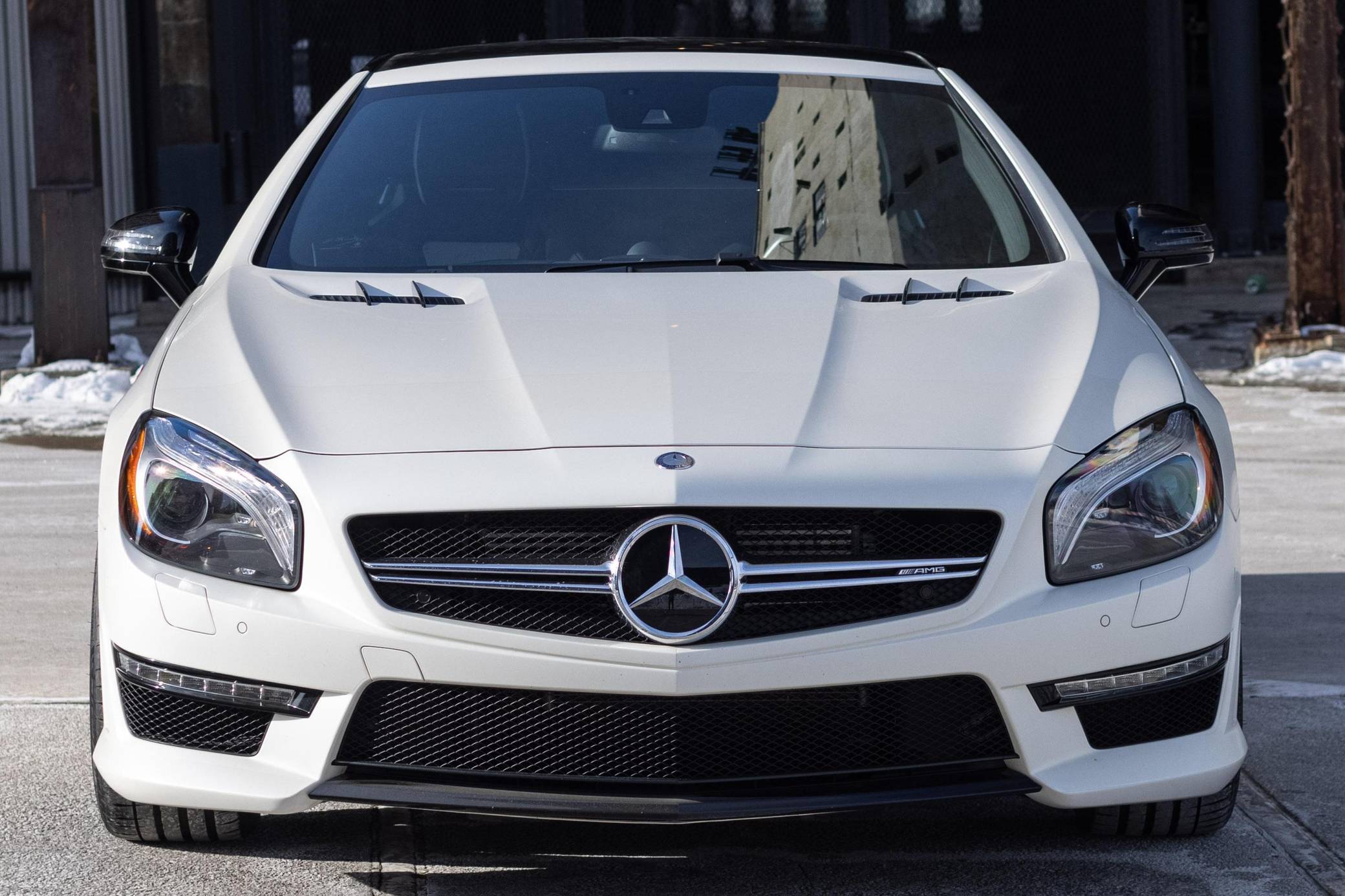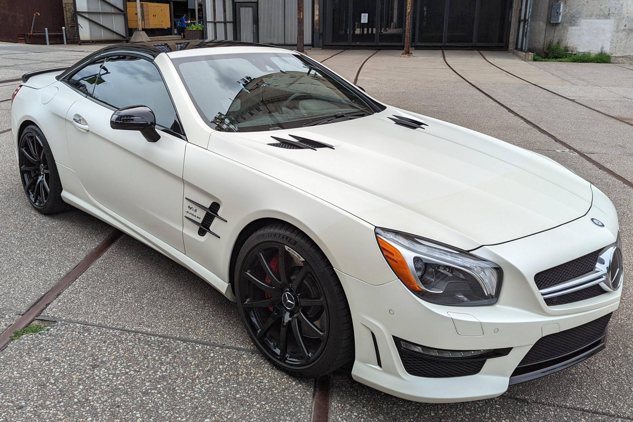 2015 Mercedes-Benz SL63 AMG, finished in Designo Magno Kashmir White with a black and Designo Platinum White interior. Factory equipment includes the Premium, AMG High Contrast Styling and Driver Assistance packages, 19-inch front and 20-inch rear wheels, AMG-calibrated Active Body Control (ABC) suspension, adaptive bi-xenon headlights, a power-retractable hardtop, Nappa leather upholstery, power-adjustable heated and ventilated seats, and more as detailed below. Modifications reported by the seller are limited to Weistec ECU tune and spark plugs, paint protection film on the front end, and a set of KW DZX wheel spacers. In the sixth-generation R231 SL roadster, the AMG models utilized aluminum and carbon-fiber bodywork. The SL63 AMG saw the 6. 2-liter naturally aspirated V8 replaced with a twin-turbocharged 5. 5-liter, which made even more power despite its reduced displacement. Other AMG special equipment included a 7-speed Speedshift M-DCT transmission with Race Start function, AMG high-performance compound disc brakes with six-piston front calipers, and an AMG sports exhaust system. Power comes from an "M157" twin-turbo 5. 5-liter V8, rated at 577 horsepower and 664 lb-ft of torque in stock form. Due to the modifications performed to this SL63, it likely produces more power, but a dyno sheet was not provided to confirm. Output is sent to the rear wheels via a 7-speed M-DCT automatic transmission and a limited-slip rear differential.