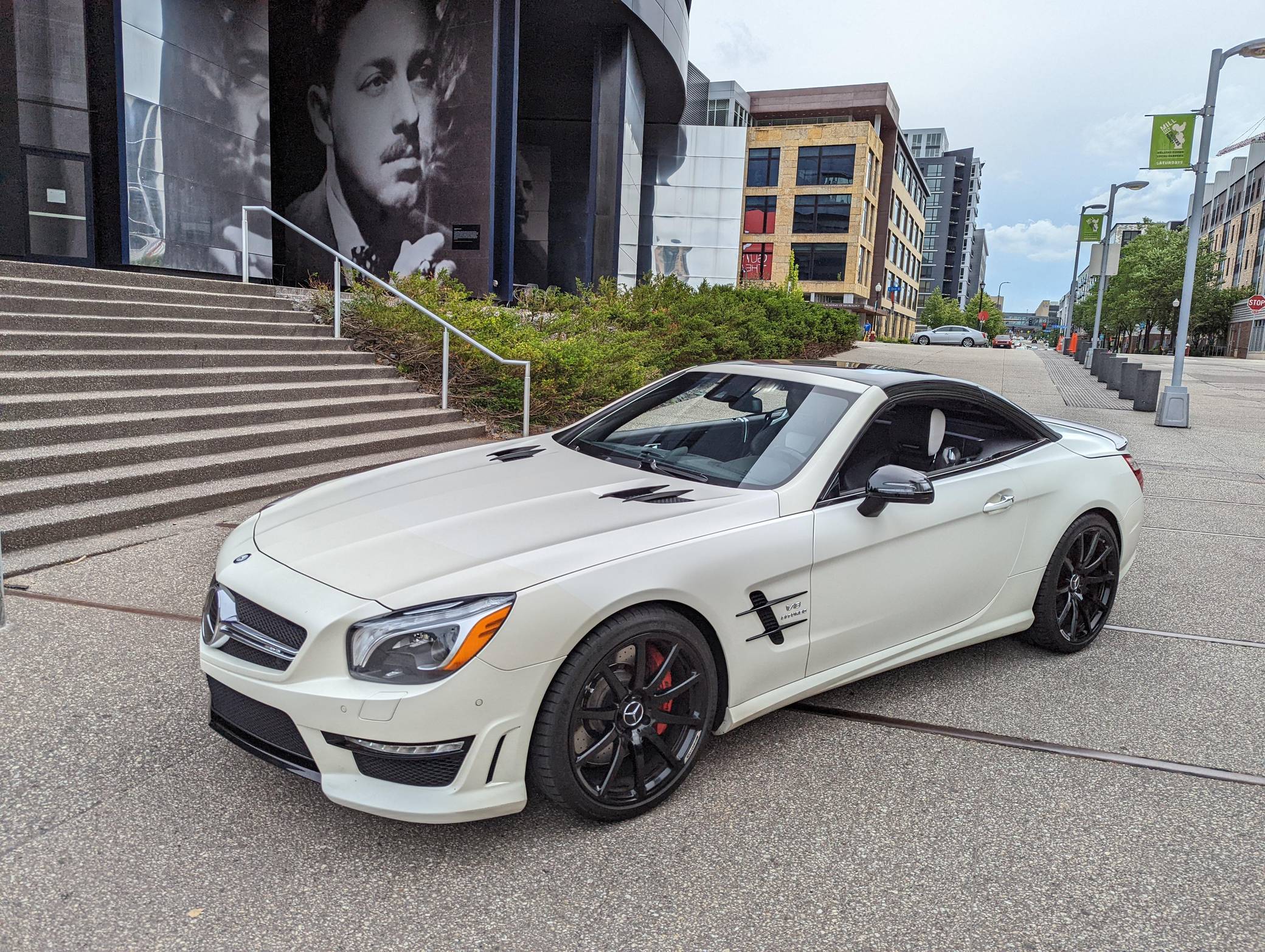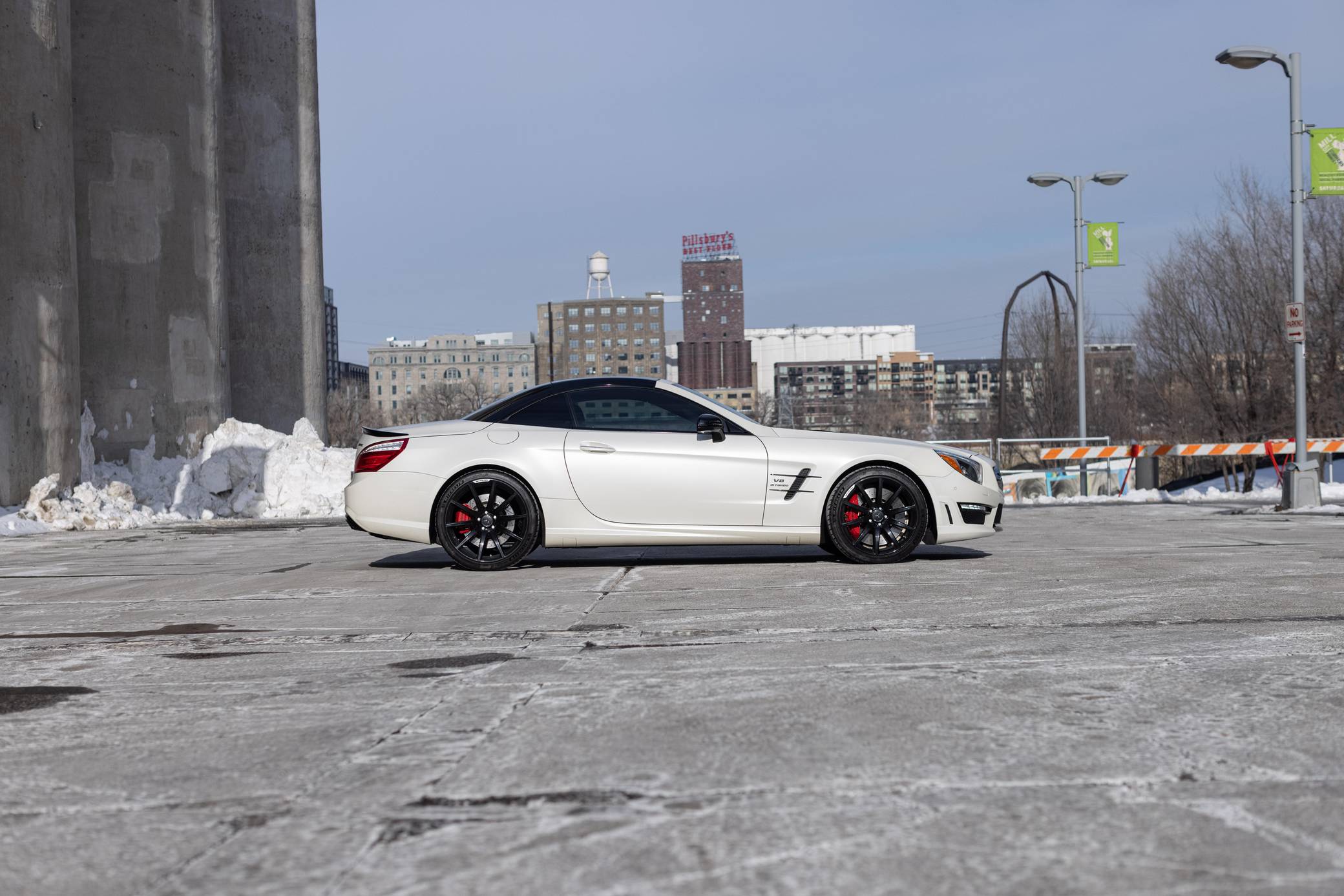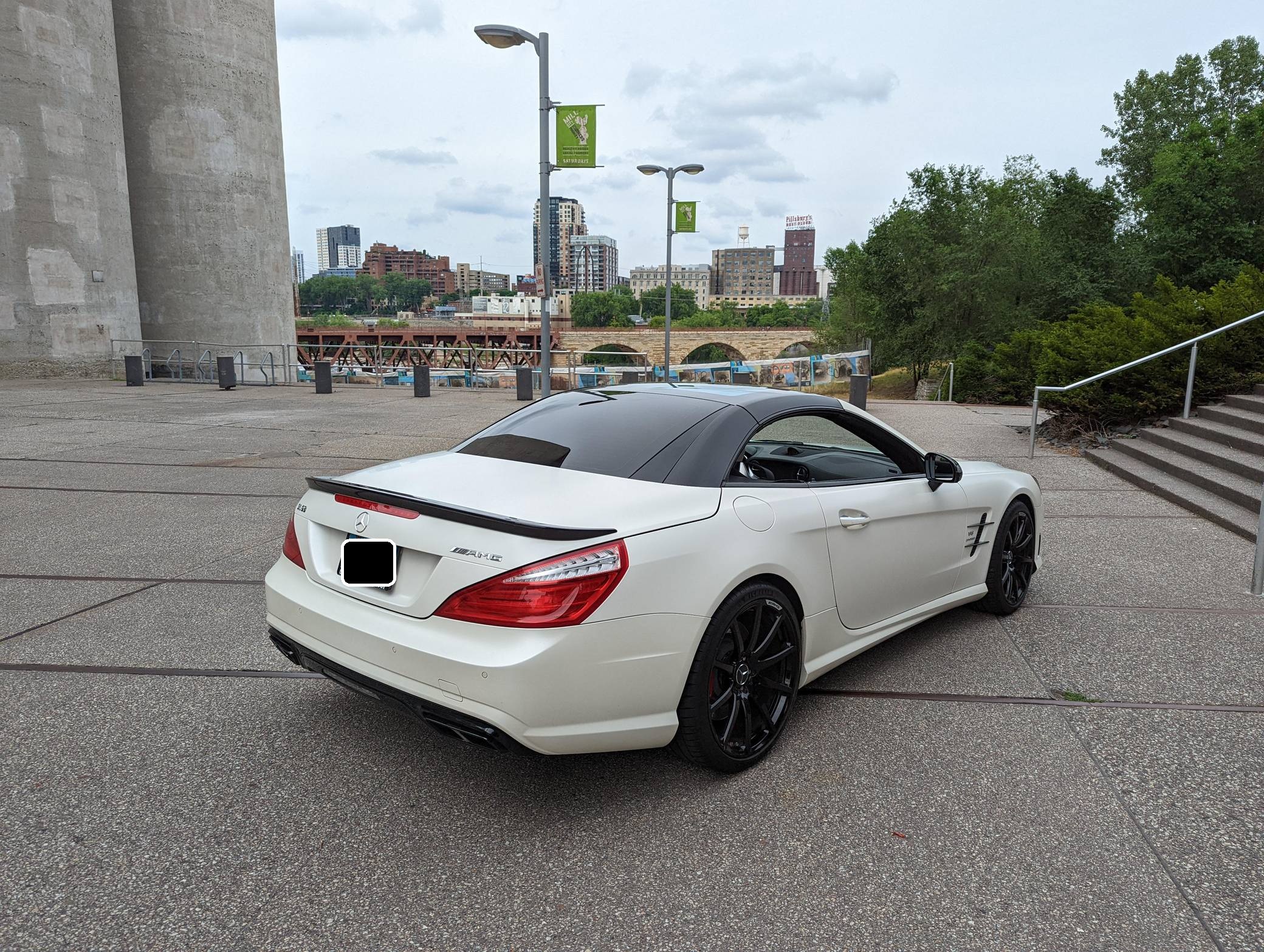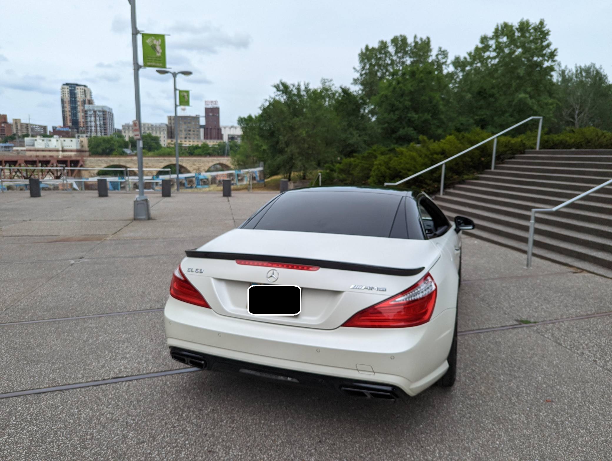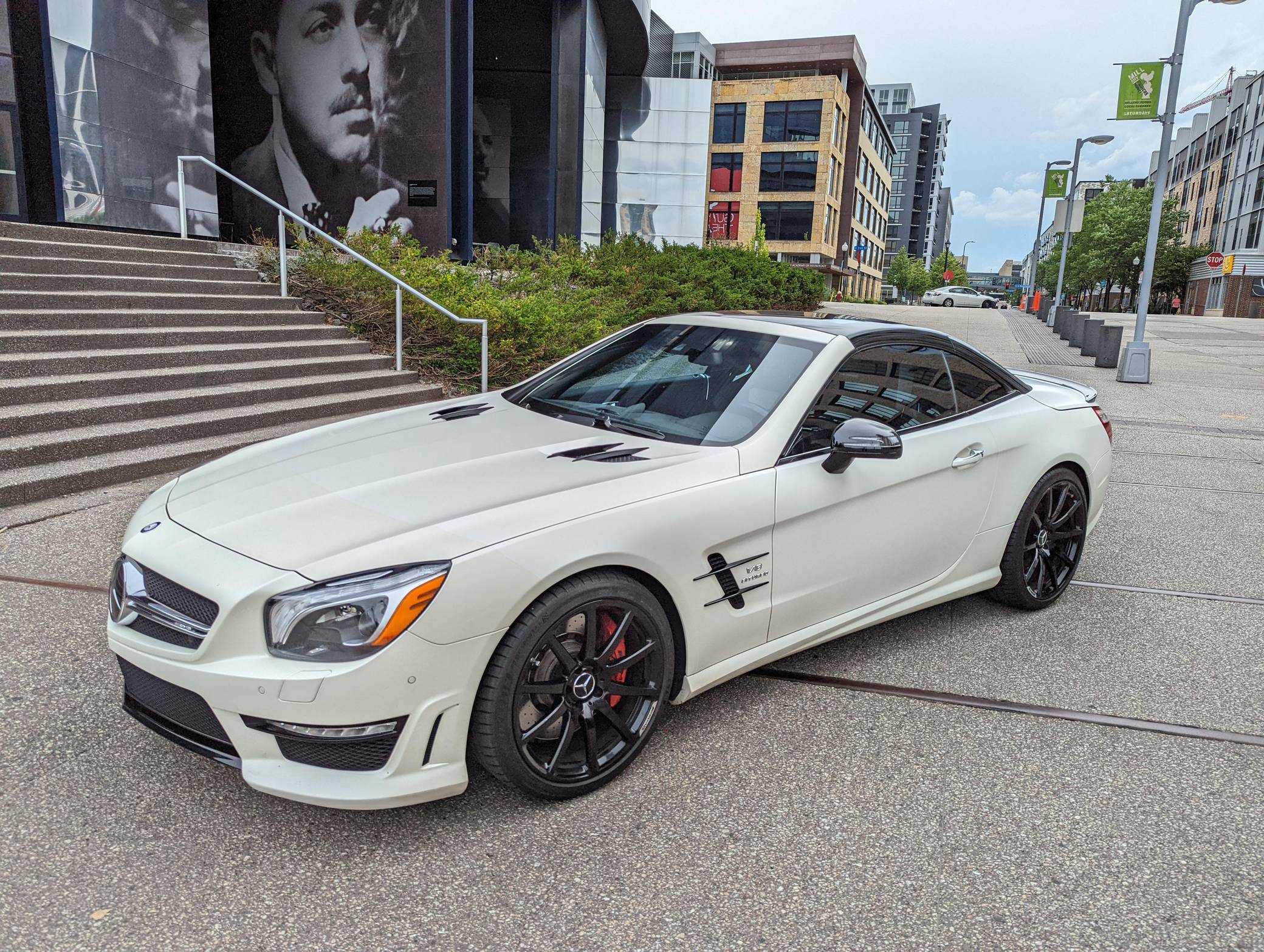 2015 Mercedes-Benz SL63 AMG, finished in Designo Magno Kashmir White with a black and Designo Platinum White interior. Factory equipment includes the Premium, AMG High Contrast Styling and Driver Assistance packages, 19-inch front and 20-inch rear wheels, AMG-calibrated Active Body Control (ABC) suspension, adaptive bi-xenon headlights, a power-retractable hardtop, Nappa leather upholstery, power-adjustable heated and ventilated seats, and more as detailed below. Modifications reported by the seller are limited to Weistec ECU tune and spark plugs, paint protection film on the front end, and a set of KW DZX wheel spacers. In the sixth-generation R231 SL roadster, the AMG models utilized aluminum and carbon-fiber bodywork. The SL63 AMG saw the 6. 2-liter naturally aspirated V8 replaced with a twin-turbocharged 5. 5-liter, which made even more power despite its reduced displacement. Other AMG special equipment included a 7-speed Speedshift M-DCT transmission with Race Start function, AMG high-performance compound disc brakes with six-piston front calipers, and an AMG sports exhaust system. Power comes from an "M157" twin-turbo 5. 5-liter V8, rated at 577 horsepower and 664 lb-ft of torque in stock form. Due to the modifications performed to this SL63, it likely produces more power, but a dyno sheet was not provided to confirm. Output is sent to the rear wheels via a 7-speed M-DCT automatic transmission and a limited-slip rear differential.