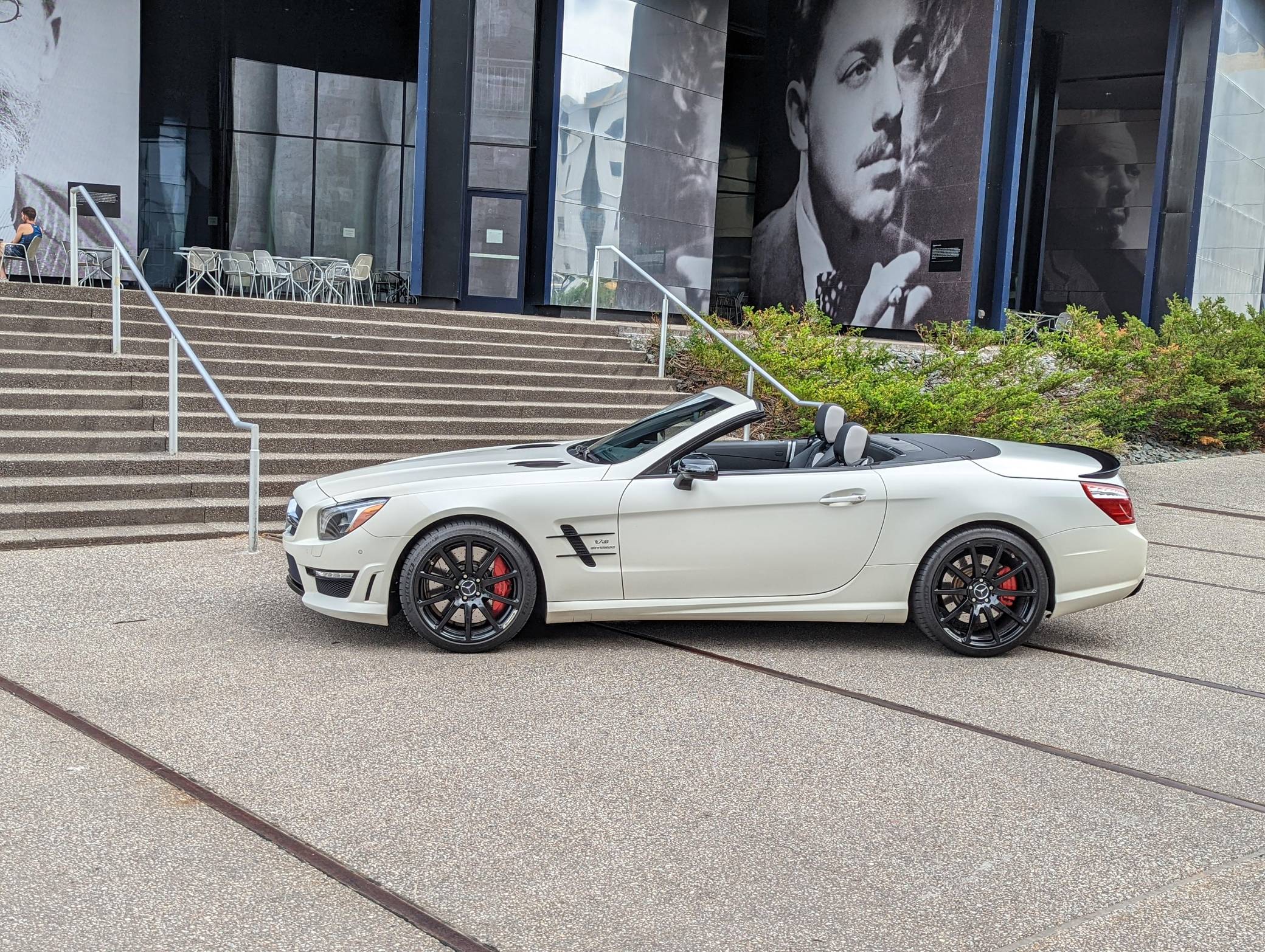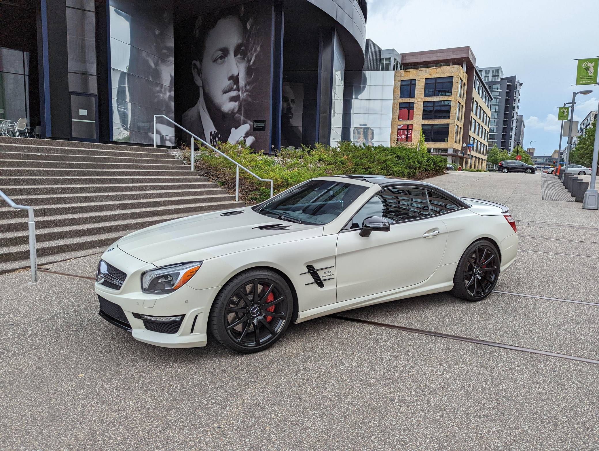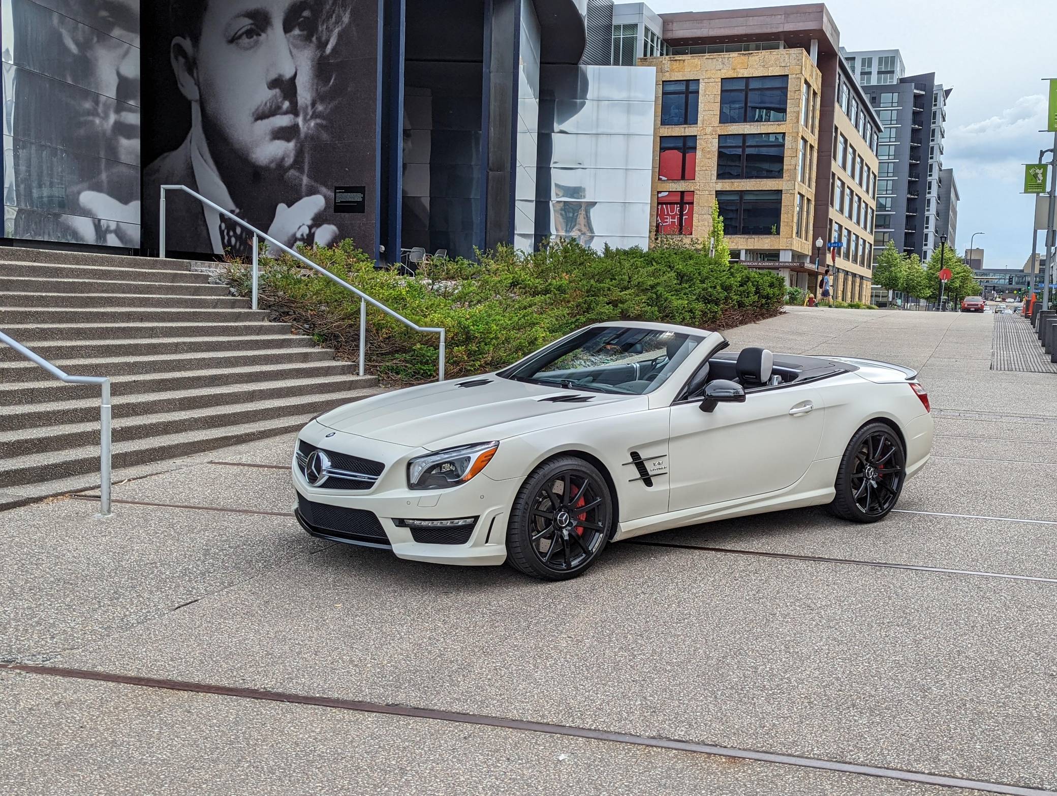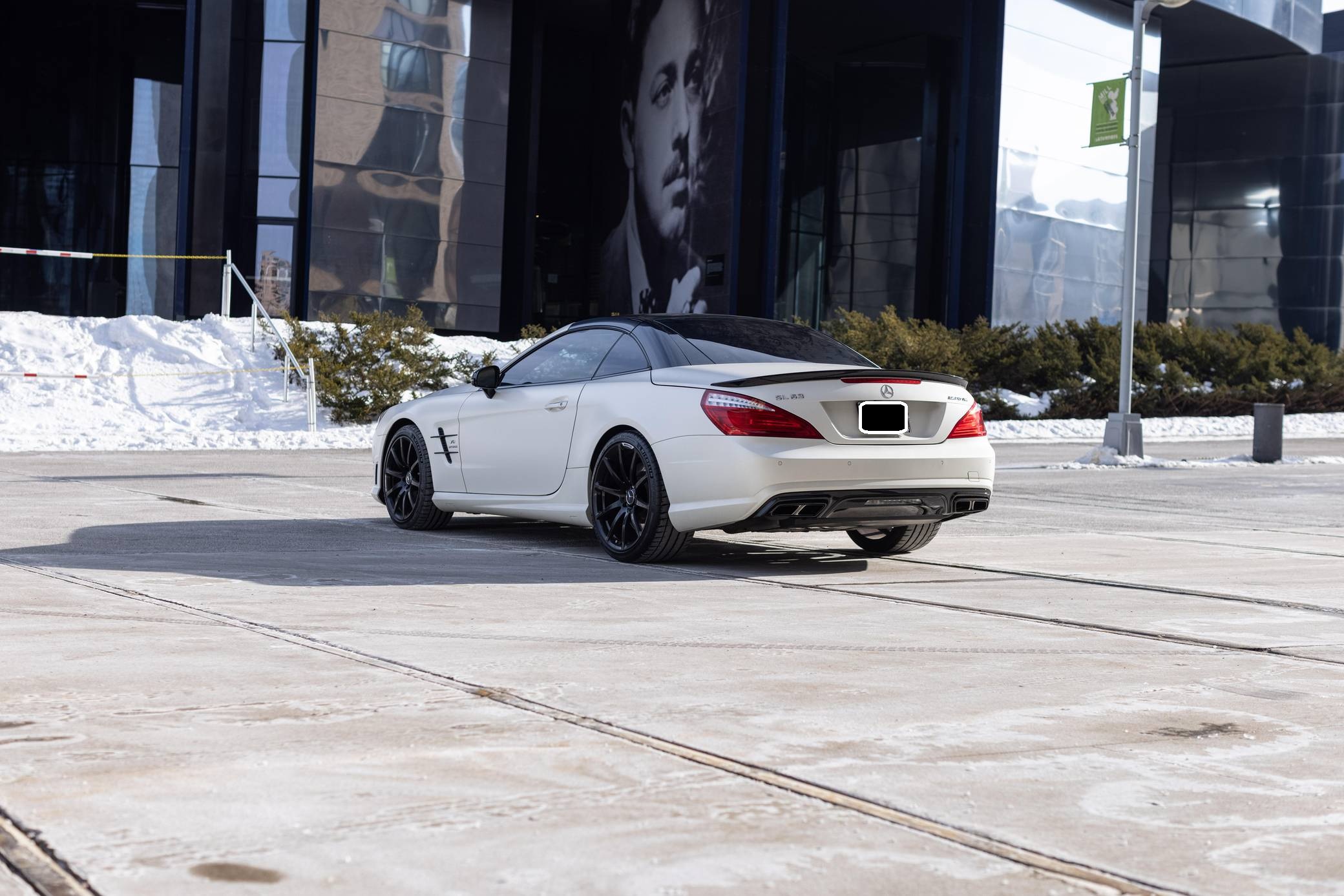 2015 Mercedes-Benz SL63 AMG, finished in Designo Magno Kashmir White with a black and Designo Platinum White interior. Factory equipment includes the Premium, AMG High Contrast Styling and Driver Assistance packages, 19-inch front and 20-inch rear wheels, AMG-calibrated Active Body Control (ABC) suspension, adaptive bi-xenon headlights, a power-retractable hardtop, Nappa leather upholstery, power-adjustable heated and ventilated seats, and more as detailed below. Modifications reported by the seller are limited to Weistec ECU tune and spark plugs, paint protection film on the front end, and a set of KW DZX wheel spacers. In the sixth-generation R231 SL roadster, the AMG models utilized aluminum and carbon-fiber bodywork. The SL63 AMG saw the 6. 2-liter naturally aspirated V8 replaced with a twin-turbocharged 5. 5-liter, which made even more power despite its reduced displacement. Other AMG special equipment included a 7-speed Speedshift M-DCT transmission with Race Start function, AMG high-performance compound disc brakes with six-piston front calipers, and an AMG sports exhaust system. Power comes from an "M157" twin-turbo 5. 5-liter V8, rated at 577 horsepower and 664 lb-ft of torque in stock form. Due to the modifications performed to this SL63, it likely produces more power, but a dyno sheet was not provided to confirm. Output is sent to the rear wheels via a 7-speed M-DCT automatic transmission and a limited-slip rear differential.