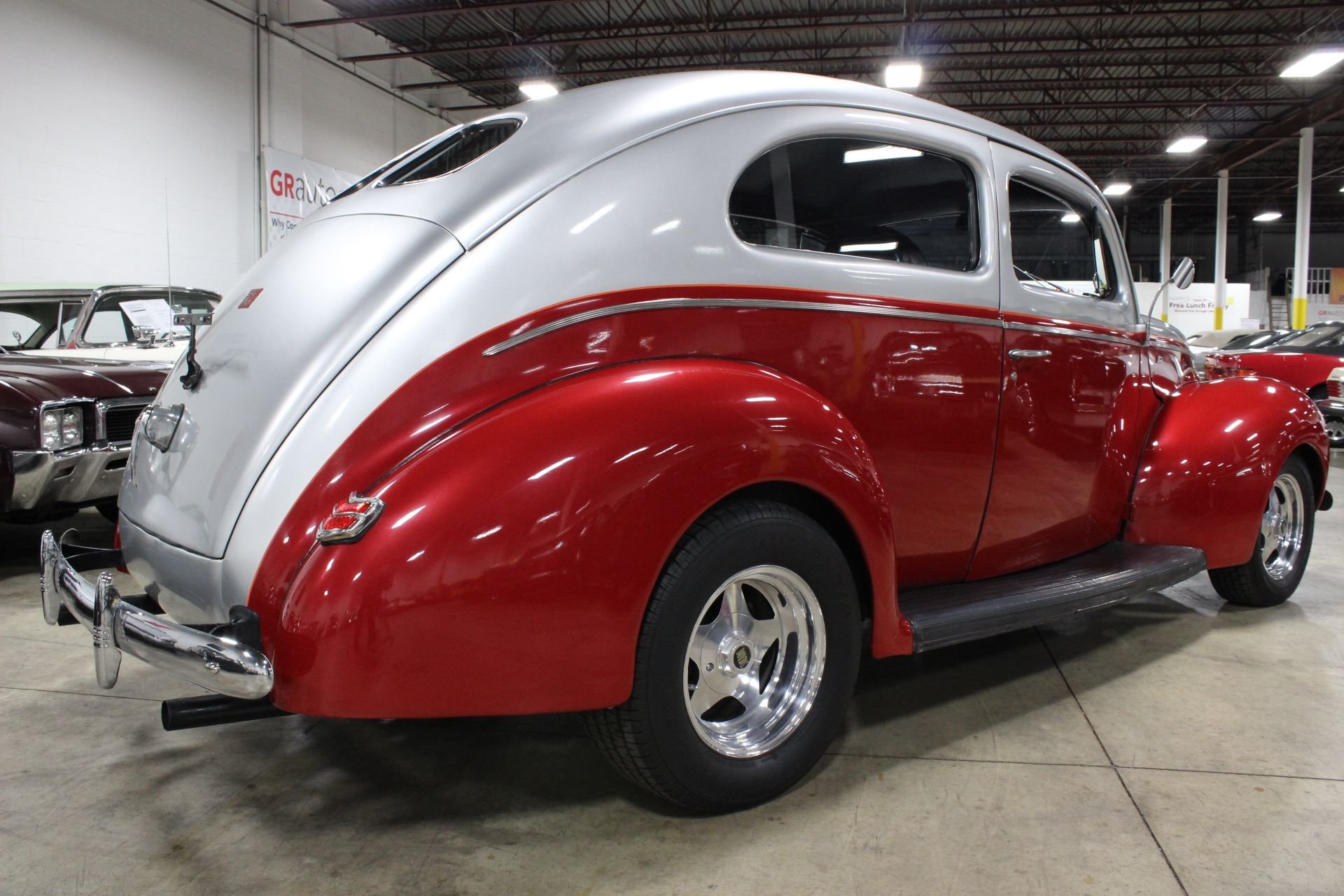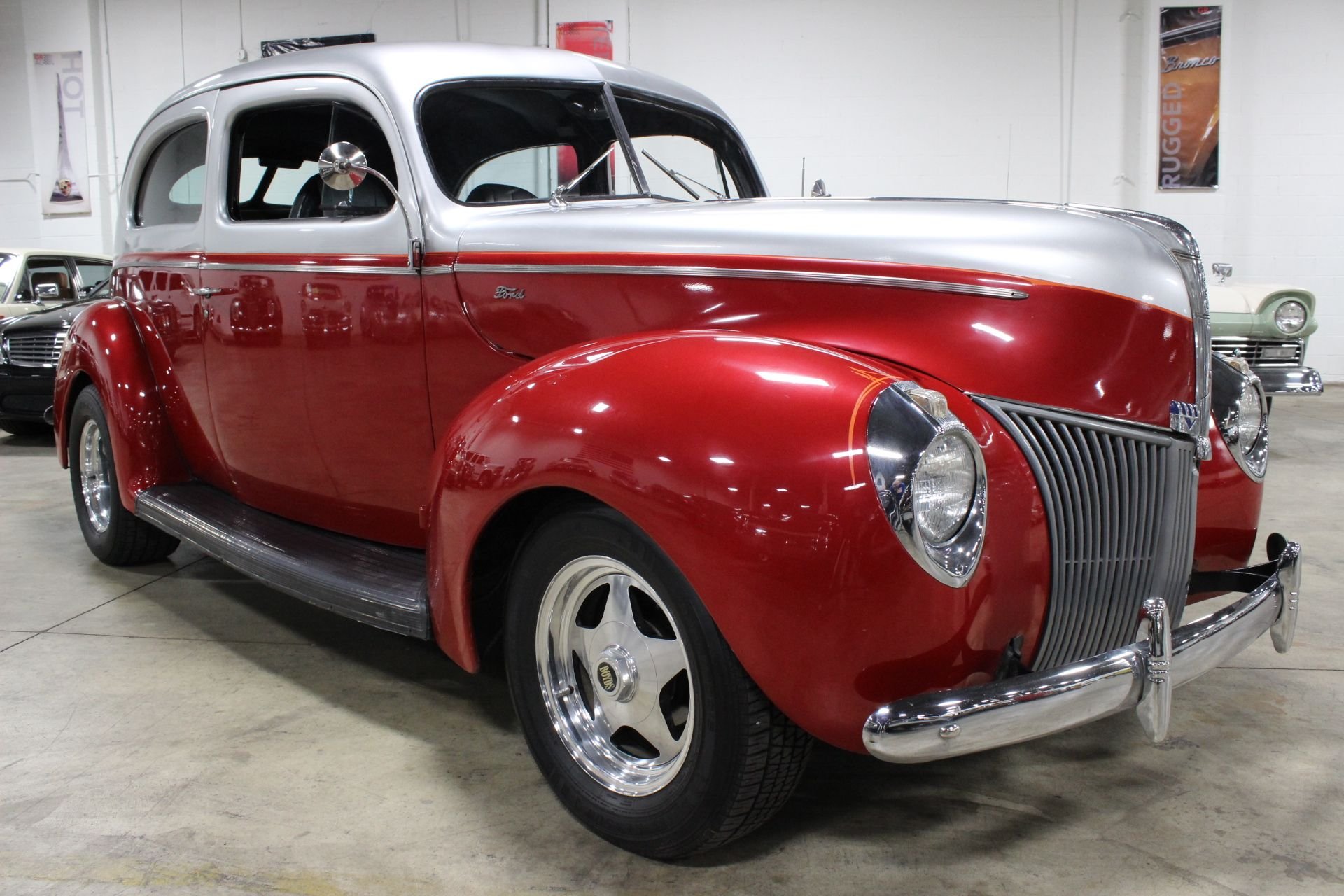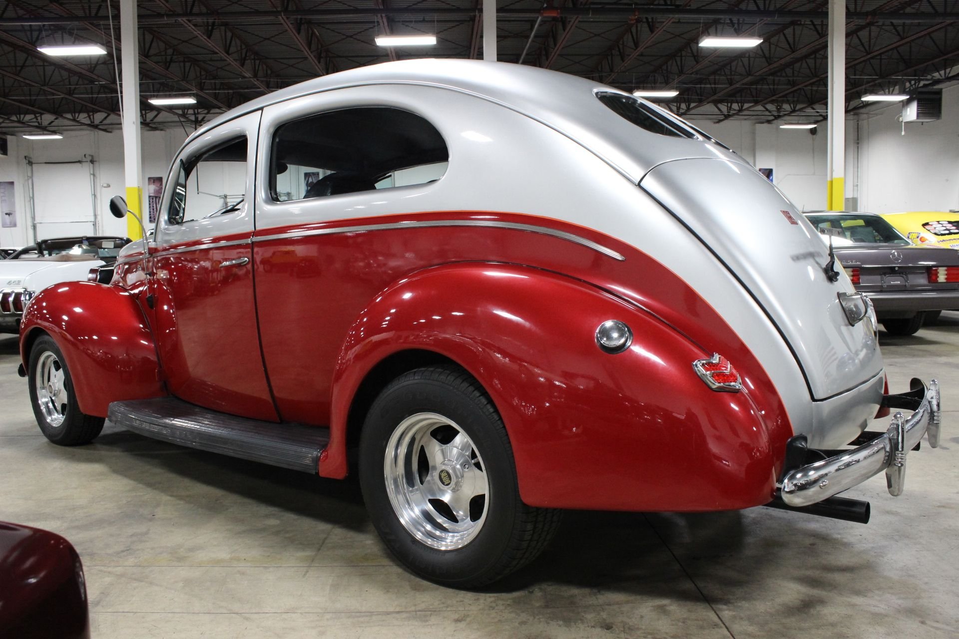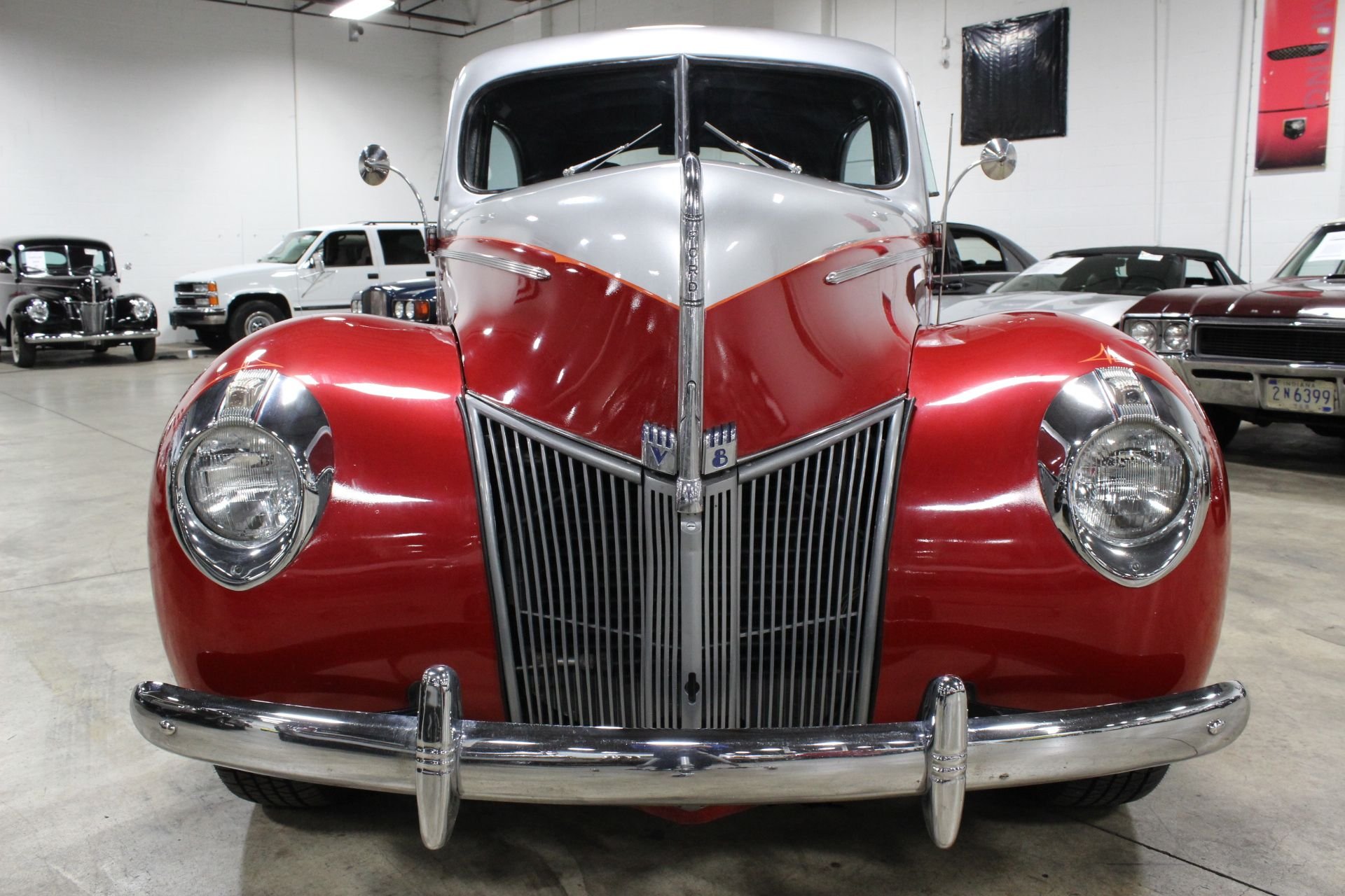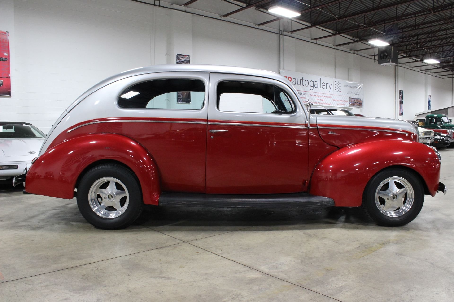 A high flat-topped hood was all the rage of this era and was very predominant of the 1940 model, as the grille spread out to reach the fenders. The standard Ford continued to use the grille of the 1939 model with blackout on each side of the chrome center and bolder headlight surrounds were another tell tale of the changes made from its predecessor. 1940 was the last year of the 1937 design and its smaller V8 engine, with an inline six cylinder to be put back into production the following year. The 1937-1940 generation of Fords is one of the most popular automobiles for making custom hot rods out of and that still stands true to this day. Early stock car drivers also used Fords of this era as one of the most recognized racers amongst all other models. This Ford was also the most recognizable design and style assimilated to dirt track racing. A rich history that has carried through the generations, not many vehicles have the same desire as these do after 70+ years. This 1940 Ford Sedan has all the great curves and lines of the original model with a lot of nice touches to really make this model stand out. Starting with the exterior you will see a great metallic two-tone paint which is wonderfully done to match the historical shape of itself. A few fine touches of pin-striping along the headlights and to divide the primary paint colors help aid in the uniqueness of this particular model and a great set of Boyd brushed aluminum wheels really go a long way in its overall curb appeal. The interior is a comfortable neutral look with a black and grey scheme spread throughout the leather seats and dash. An aftermarket AM/FM/CD/ USB media center allows you to enjoy your favorites as you cruise along in this smooth shifting automatic transmission. Most of the mechanics and drivetrain have seen updates with a newer Chevrolet V8 engine to power it, a new wire harness has been installed when restored, R&P power radiator added as well as power steering to assist with the comfort of driving this ride! A wonderful driver for those looking for that next summer toy or for someone who just loves the old style of the Fords from back then, ready and running well for its next owner to enjoy!