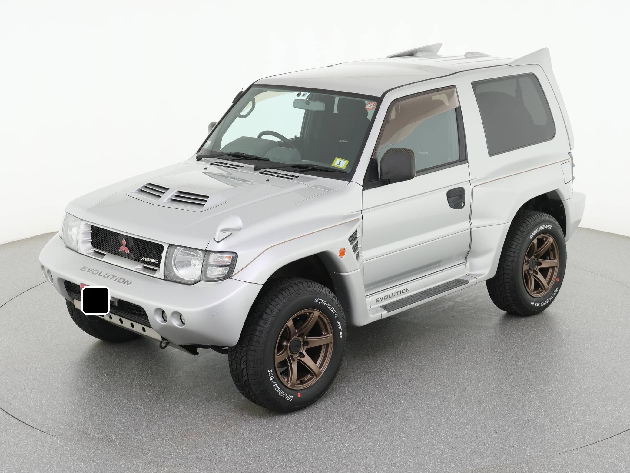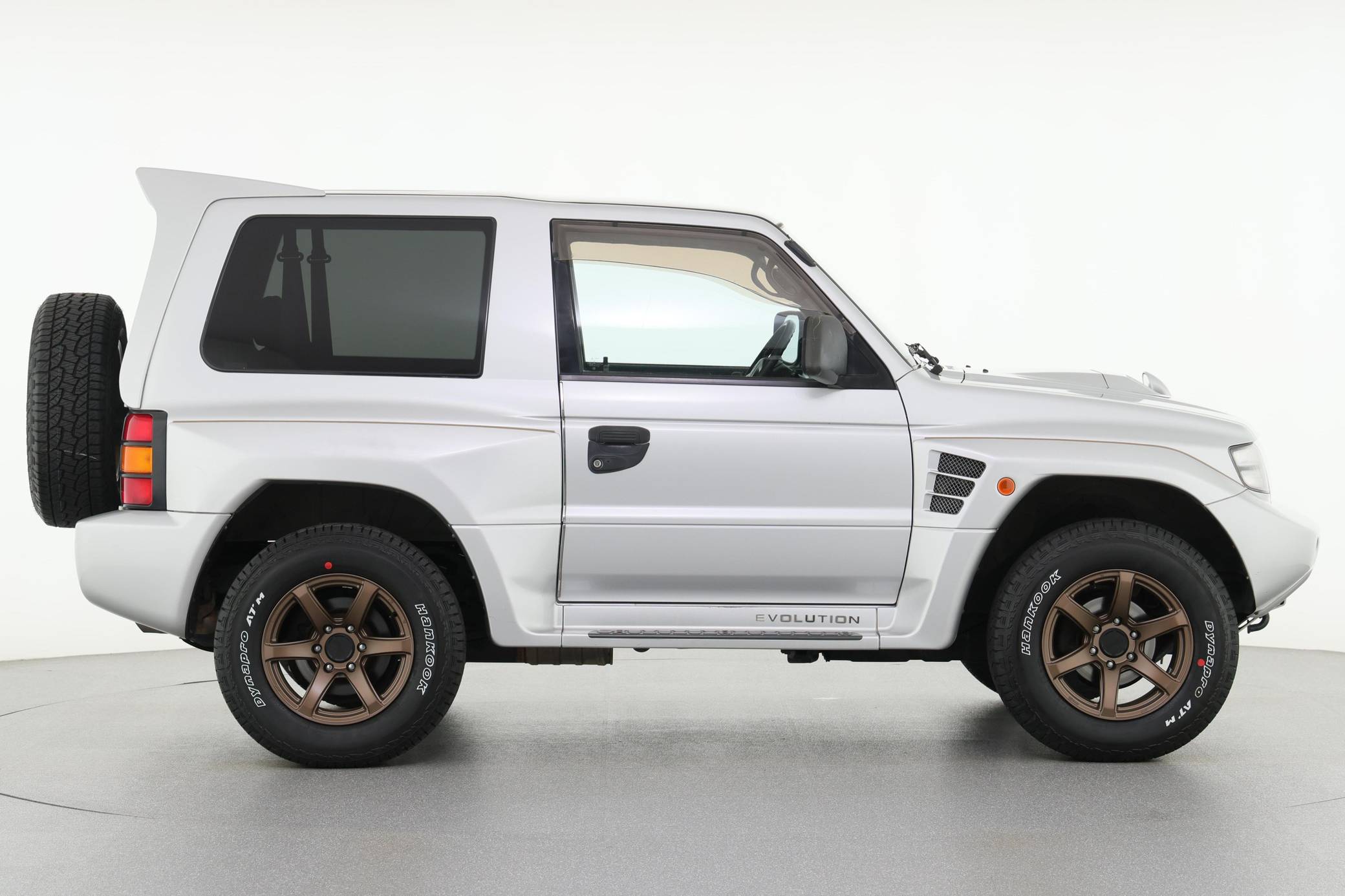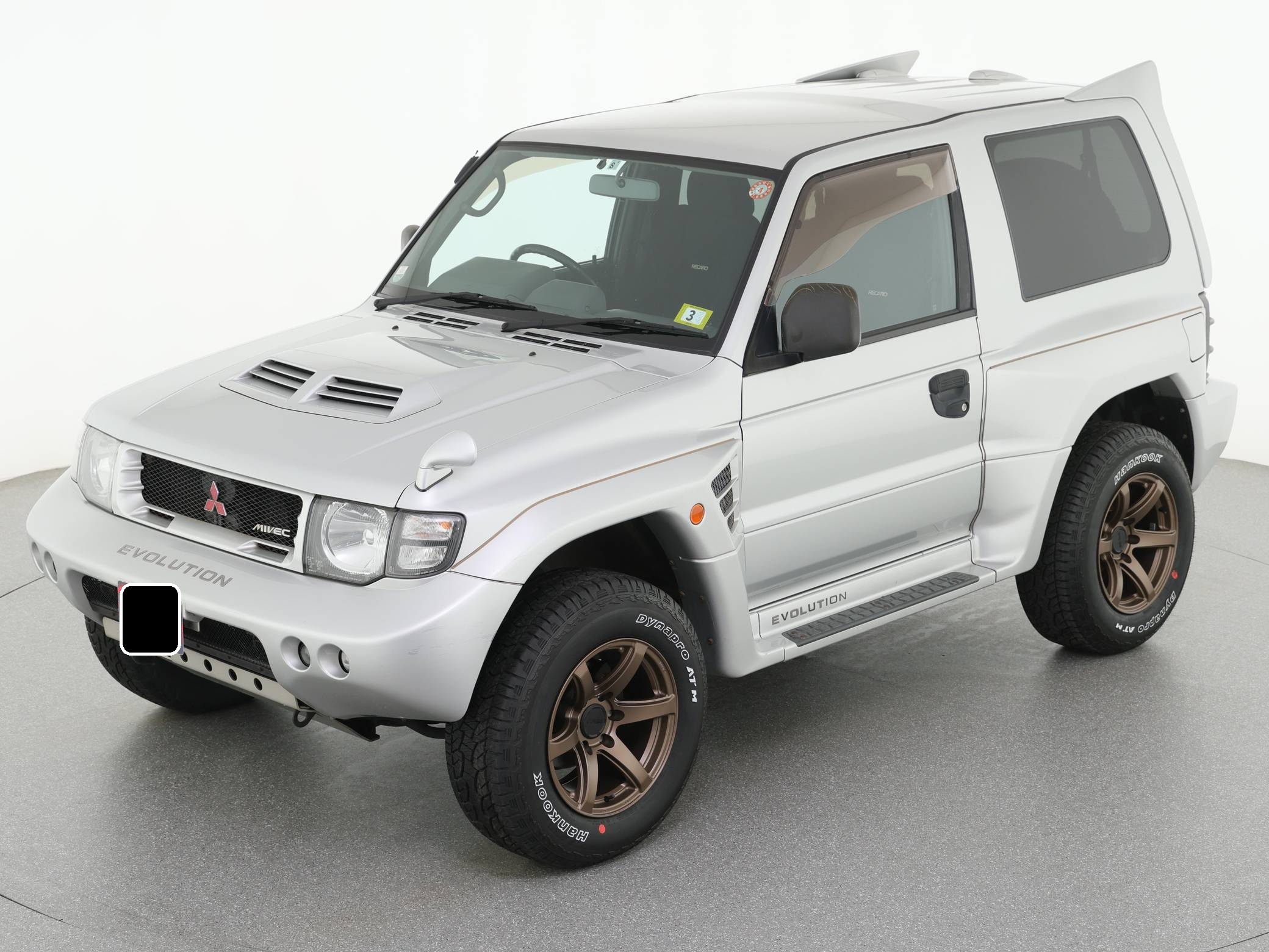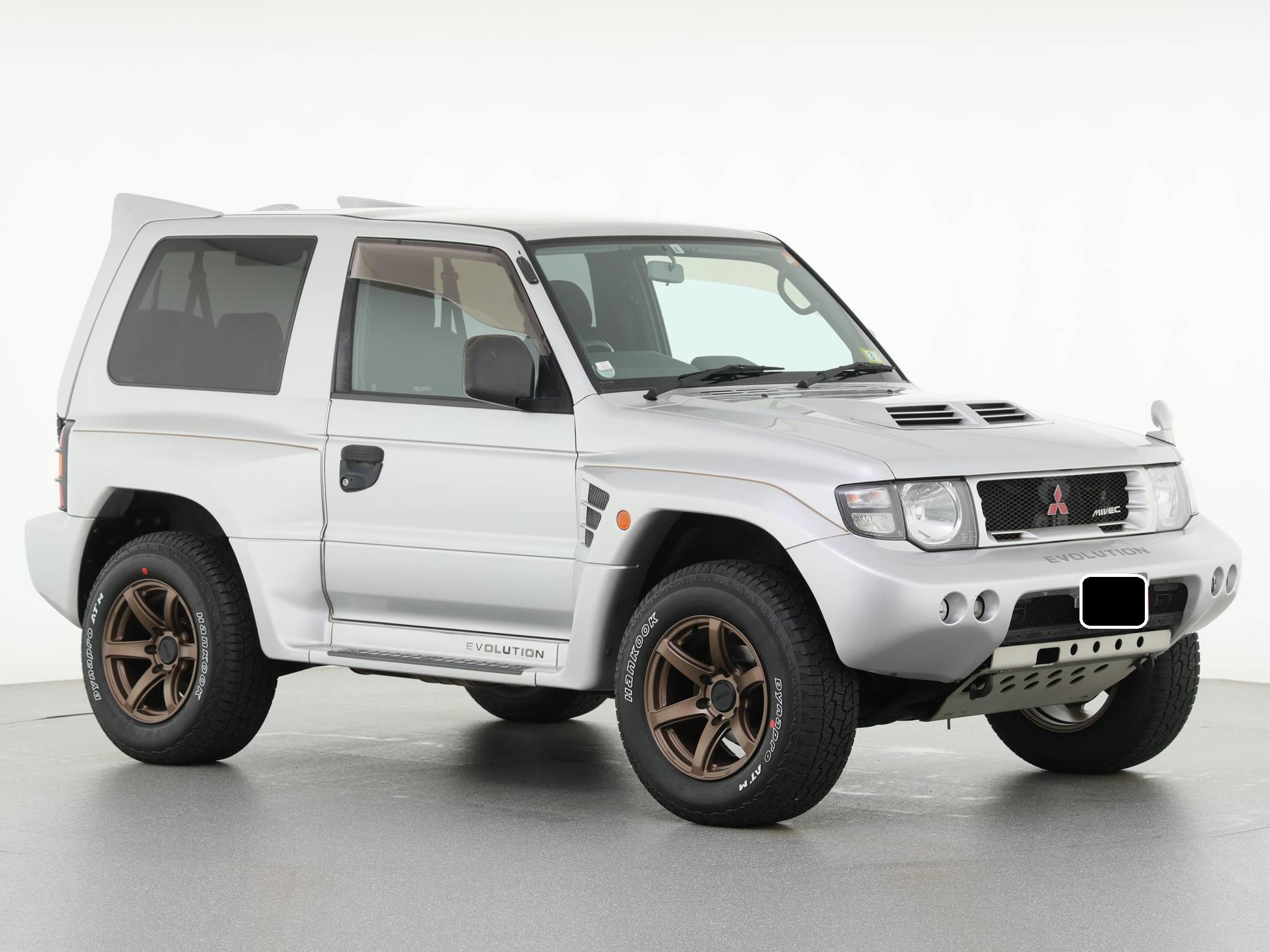 1997 Mitsubishi Pajero Evolution, finished in silver with a black interior. Reportedly imported in 2022, it's equipped with a metric instrument cluster and its odometer displays about 169,800 kilometers, which represents approximately 105,500 miles. Factory equipment includes a locking center differential, skid plates, an Evolution-specific body kit, a trailer hitch, Recaro front sport seats, an information display on the dashboard, and air conditioning. Modifications reported by the seller include 17-inch Enkei Cyclone wheels, a Kenwood CD player, and a Japanese toll card reader. Mitsubishi released the Pajero Evolution in 1997 to homologate the SUV in the Dakar Rally. Starting with the short-wheelbase model, the company added a full body kit characterized by wheel arch flares, an all-around independent suspension system, a quicker steering system, and a more powerful engine, among other rally-inspired changes. Its efforts paid off: the Pajero took first, second, third, and fourth in the 1998 Dakar. Most historians agree that approximately 2,500 street-legal Evolution models were built. Power comes from a 3. 5-liter V6, rated at about 276 horsepower and 257 lb-ft of torque. Called "6G74" internally, it spins the rear or the four wheels via a 5-speed automatic transmission and a 2-speed transfer case.