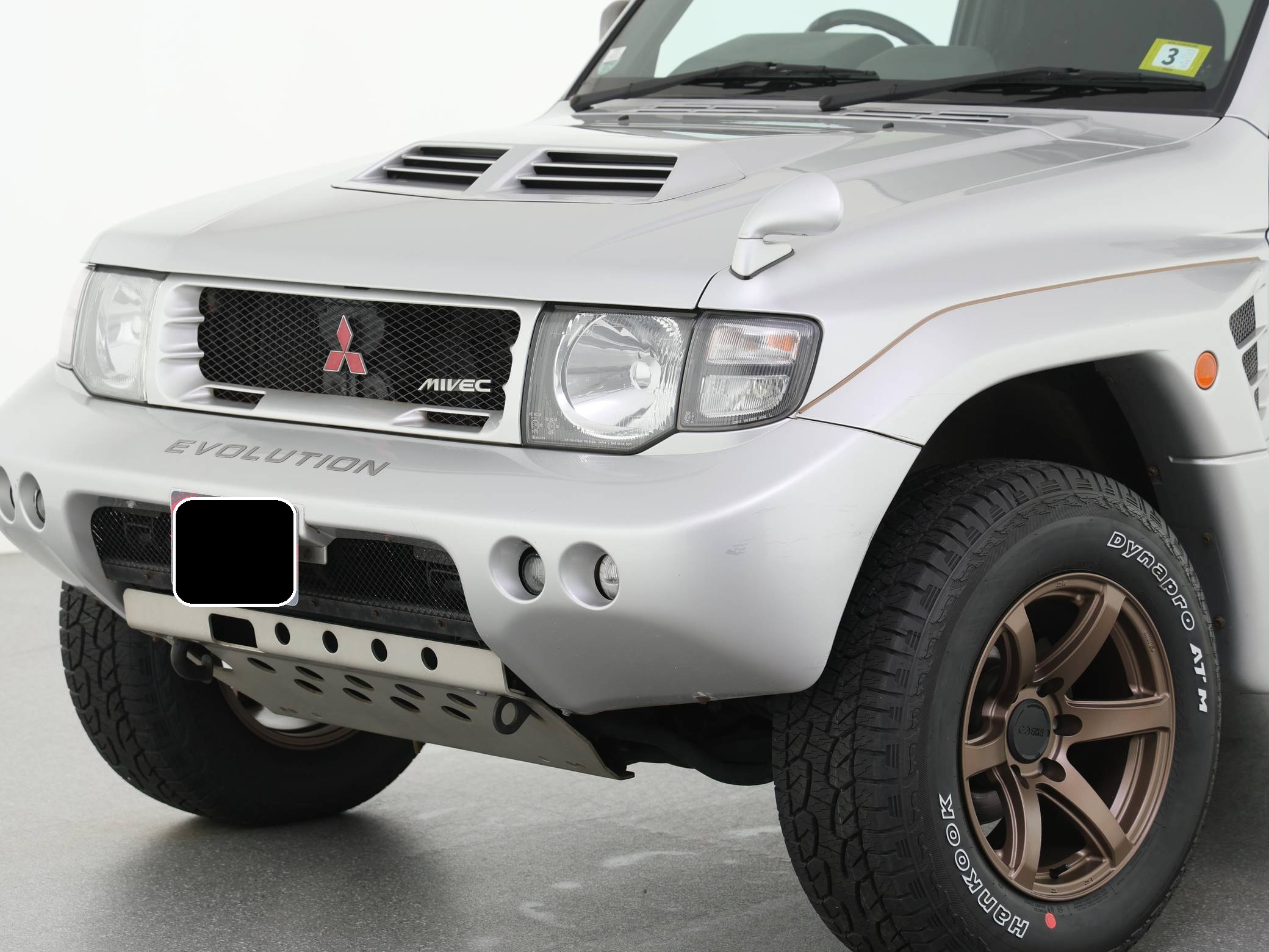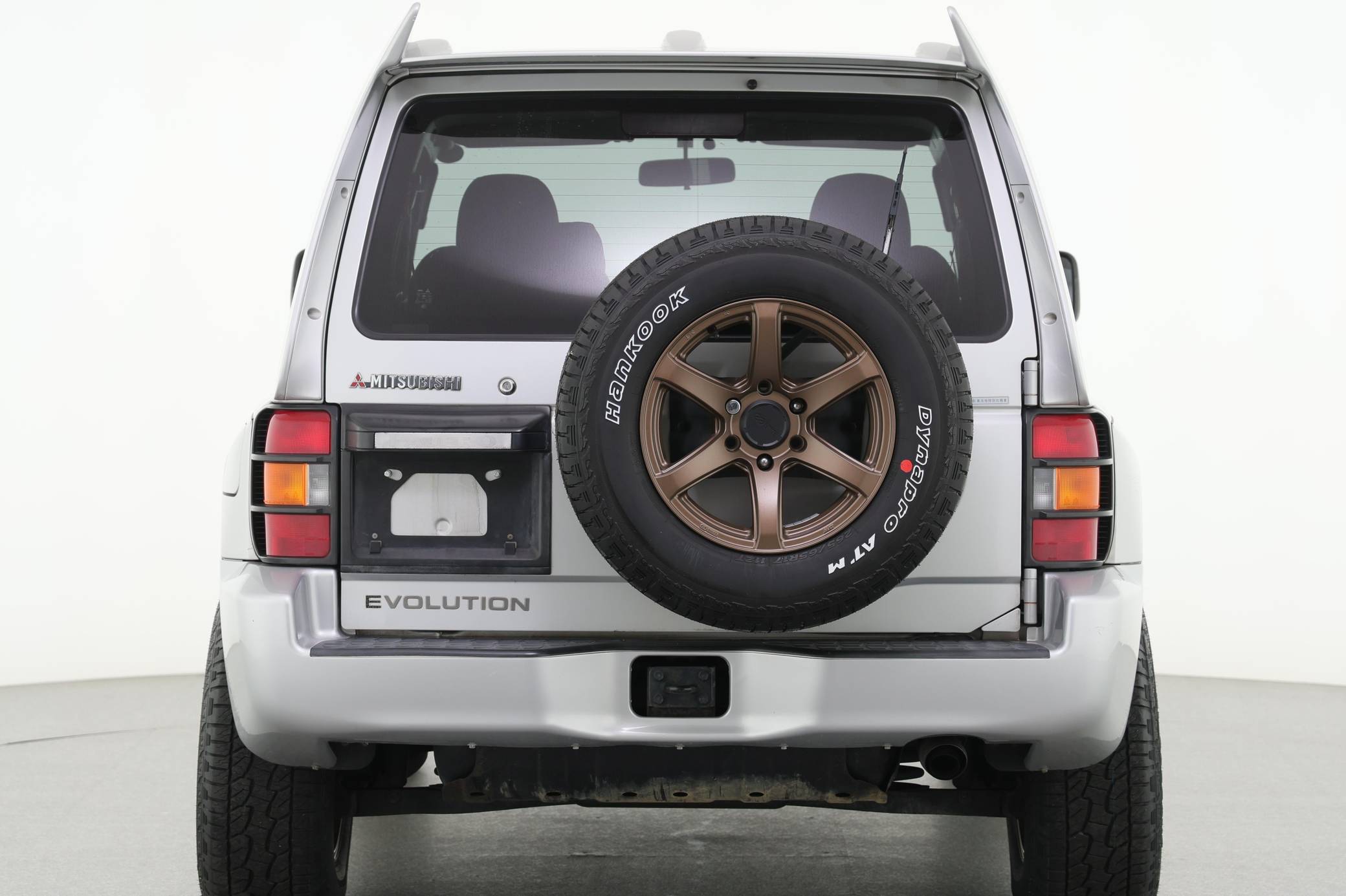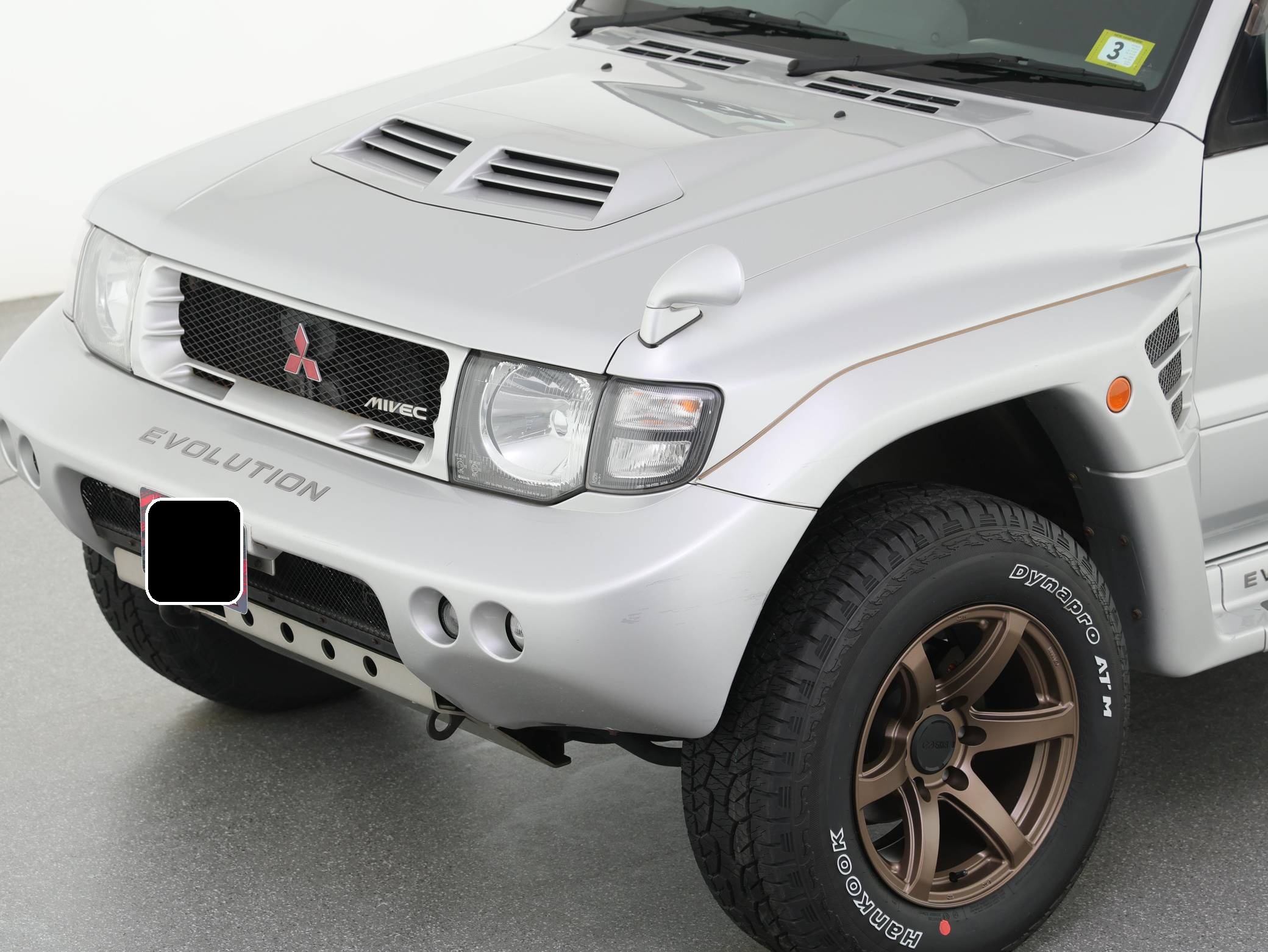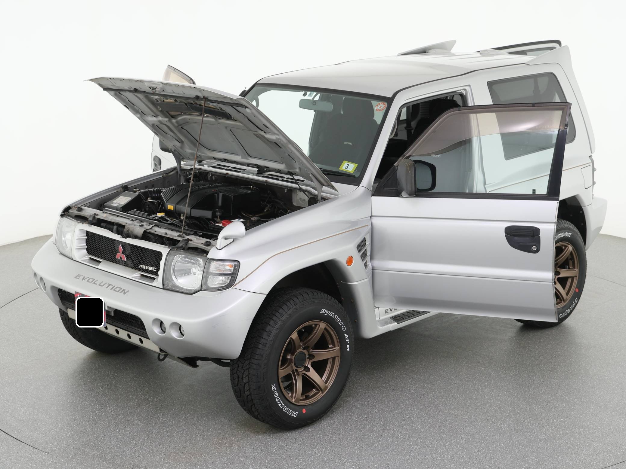 1997 Mitsubishi Pajero Evolution, finished in silver with a black interior. Reportedly imported in 2022, it's equipped with a metric instrument cluster and its odometer displays about 169,800 kilometers, which represents approximately 105,500 miles. Factory equipment includes a locking center differential, skid plates, an Evolution-specific body kit, a trailer hitch, Recaro front sport seats, an information display on the dashboard, and air conditioning. Modifications reported by the seller include 17-inch Enkei Cyclone wheels, a Kenwood CD player, and a Japanese toll card reader. Mitsubishi released the Pajero Evolution in 1997 to homologate the SUV in the Dakar Rally. Starting with the short-wheelbase model, the company added a full body kit characterized by wheel arch flares, an all-around independent suspension system, a quicker steering system, and a more powerful engine, among other rally-inspired changes. Its efforts paid off: the Pajero took first, second, third, and fourth in the 1998 Dakar. Most historians agree that approximately 2,500 street-legal Evolution models were built. Power comes from a 3. 5-liter V6, rated at about 276 horsepower and 257 lb-ft of torque. Called "6G74" internally, it spins the rear or the four wheels via a 5-speed automatic transmission and a 2-speed transfer case.