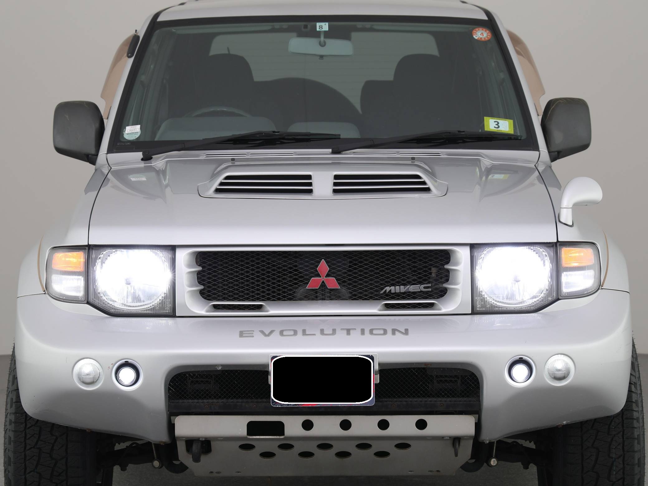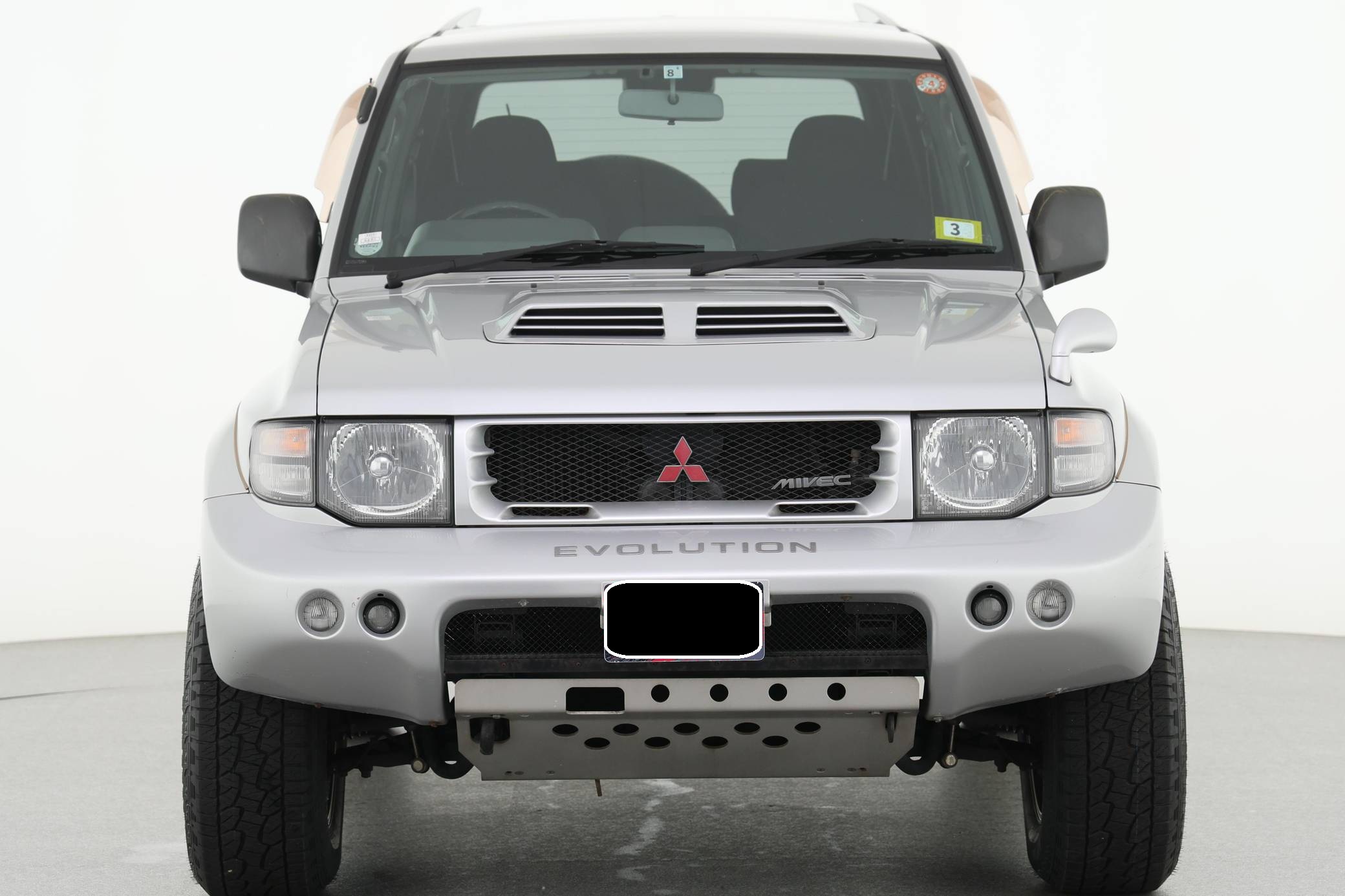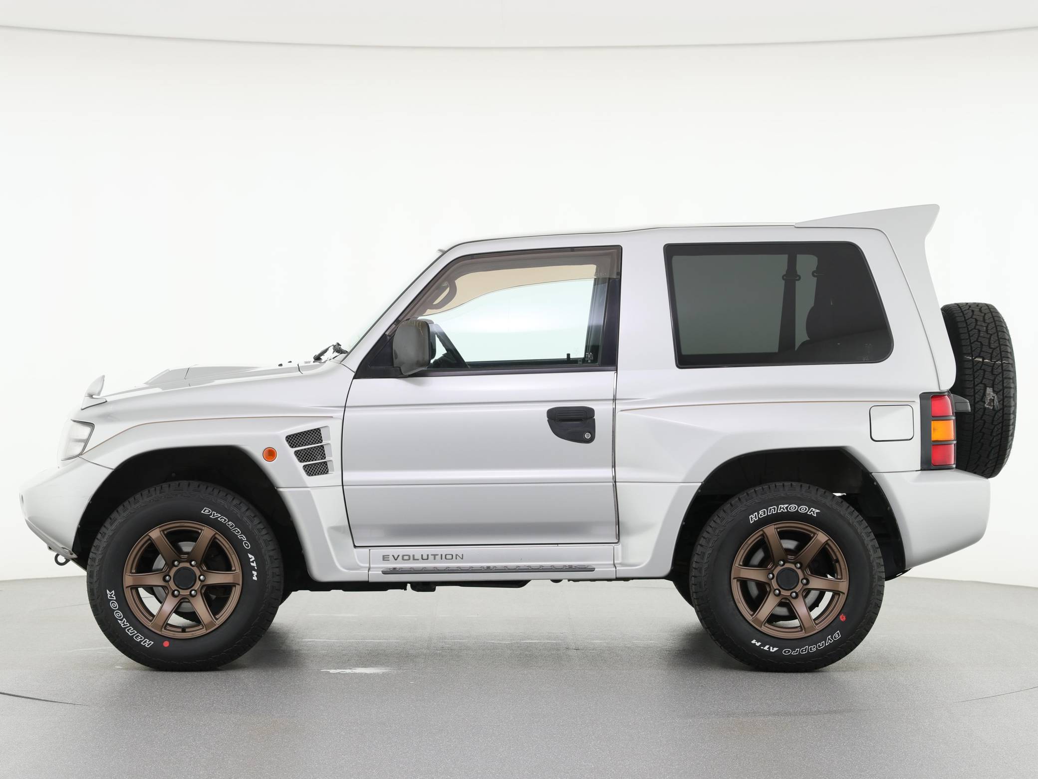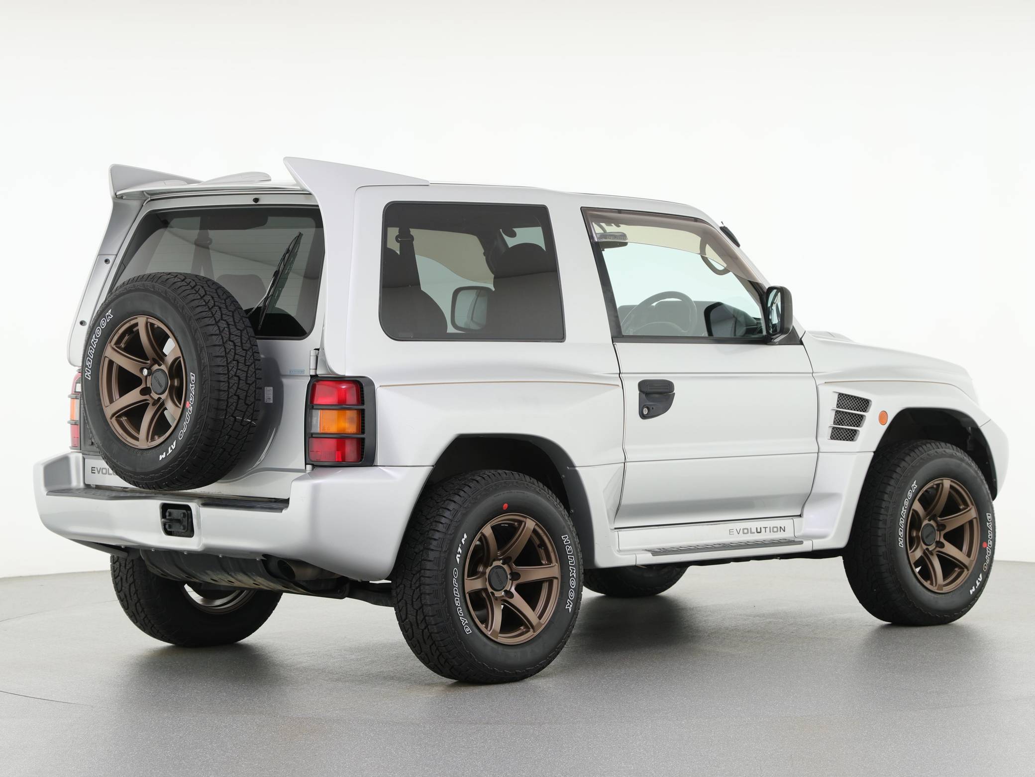 1997 Mitsubishi Pajero Evolution, finished in silver with a black interior. Reportedly imported in 2022, it's equipped with a metric instrument cluster and its odometer displays about 169,800 kilometers, which represents approximately 105,500 miles. Factory equipment includes a locking center differential, skid plates, an Evolution-specific body kit, a trailer hitch, Recaro front sport seats, an information display on the dashboard, and air conditioning. Modifications reported by the seller include 17-inch Enkei Cyclone wheels, a Kenwood CD player, and a Japanese toll card reader. Mitsubishi released the Pajero Evolution in 1997 to homologate the SUV in the Dakar Rally. Starting with the short-wheelbase model, the company added a full body kit characterized by wheel arch flares, an all-around independent suspension system, a quicker steering system, and a more powerful engine, among other rally-inspired changes. Its efforts paid off: the Pajero took first, second, third, and fourth in the 1998 Dakar. Most historians agree that approximately 2,500 street-legal Evolution models were built. Power comes from a 3. 5-liter V6, rated at about 276 horsepower and 257 lb-ft of torque. Called "6G74" internally, it spins the rear or the four wheels via a 5-speed automatic transmission and a 2-speed transfer case.