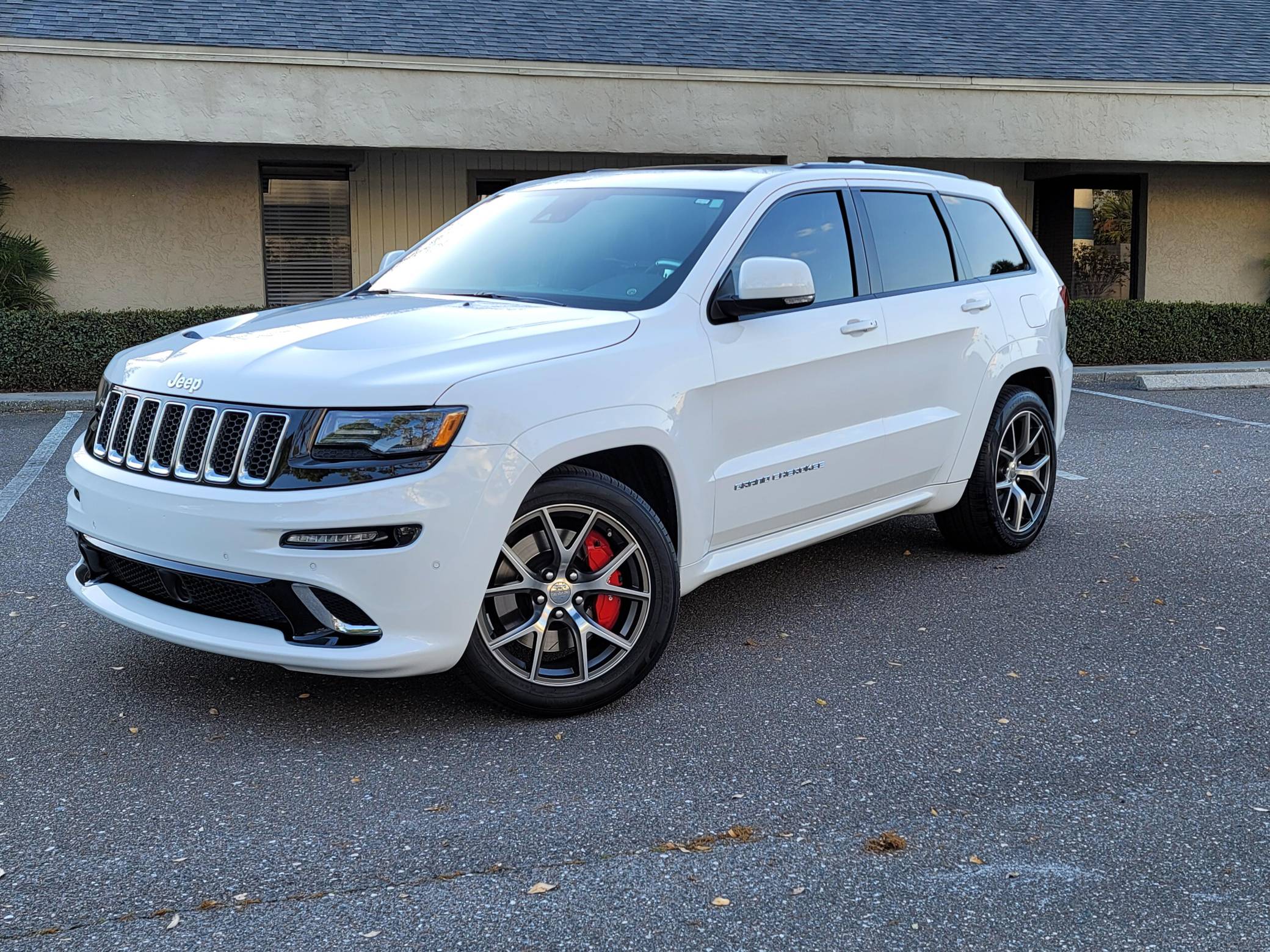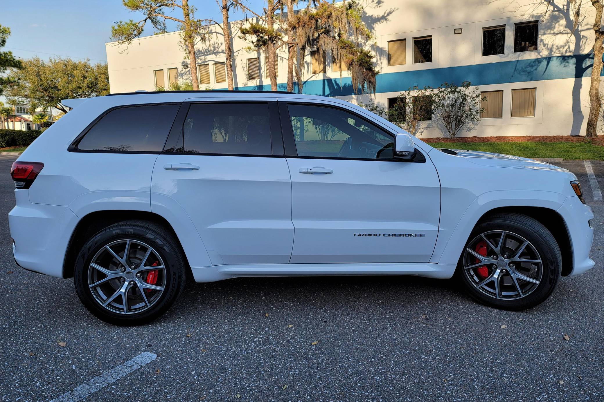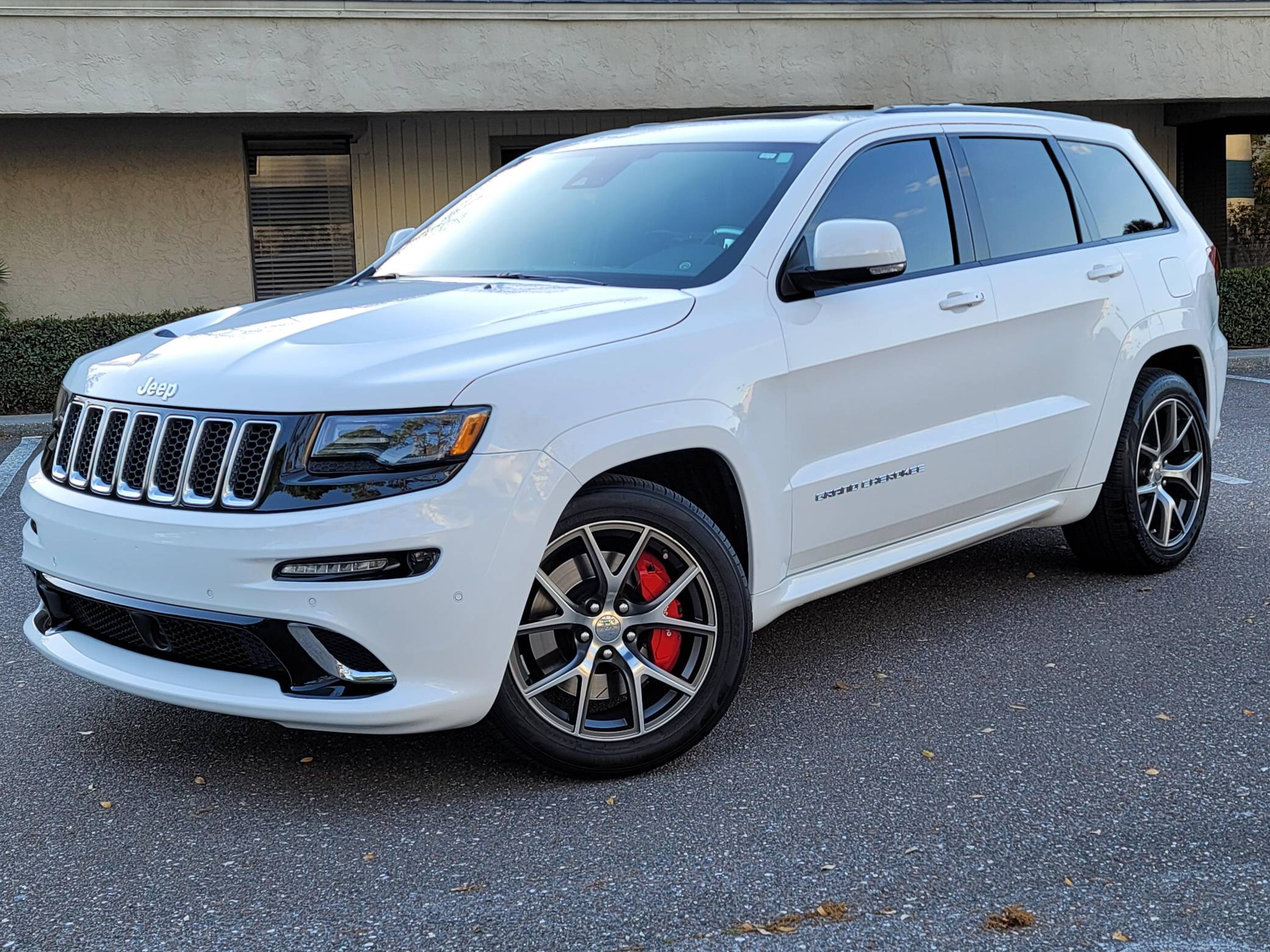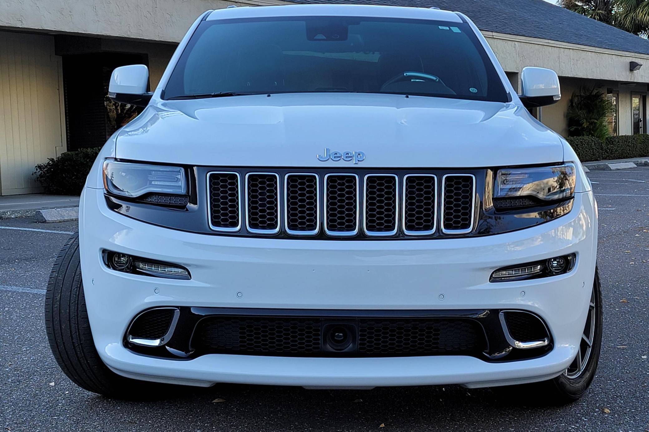 2016 Jeep Grand Cherokee SRT, finished in Bright White with a black interior. This SUV's odometer displays about 28,300 miles. Factory equipment includes 20-inch forged wheels, an electronic rear limited-slip differential, a trailer hitch, heated, ventilated, and power-adjustable front seats, heated rear seats, a 19-speaker Harman Kardon sound system with a subwoofer, and adaptive cruise control. The seller reports no modifications. Jeep demonstrated a completely different side of the "WK2"-generation Grand Cherokee when it released the SRT8 model for 2012. This version of the big SUV wasn't built to explore the wilderness: it was developed for on-pavement performance thanks to a Hemi V8 engine, an adaptive suspension system, and massive brakes. Jeep dropped the "8" from the name in 2014, and production ended in 2021. Power comes from a 6. 4-liter Hemi V8, rated at 475 horsepower and 470 lb-ft of torque. It spins the four wheels via an 8-speed automatic transmission.
