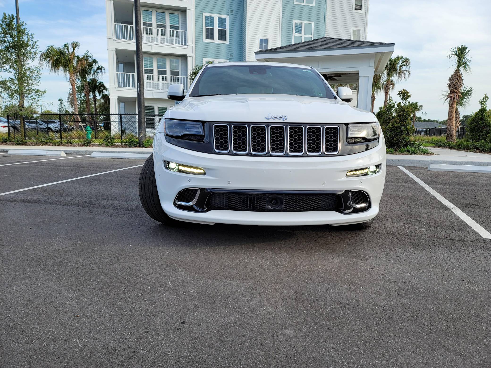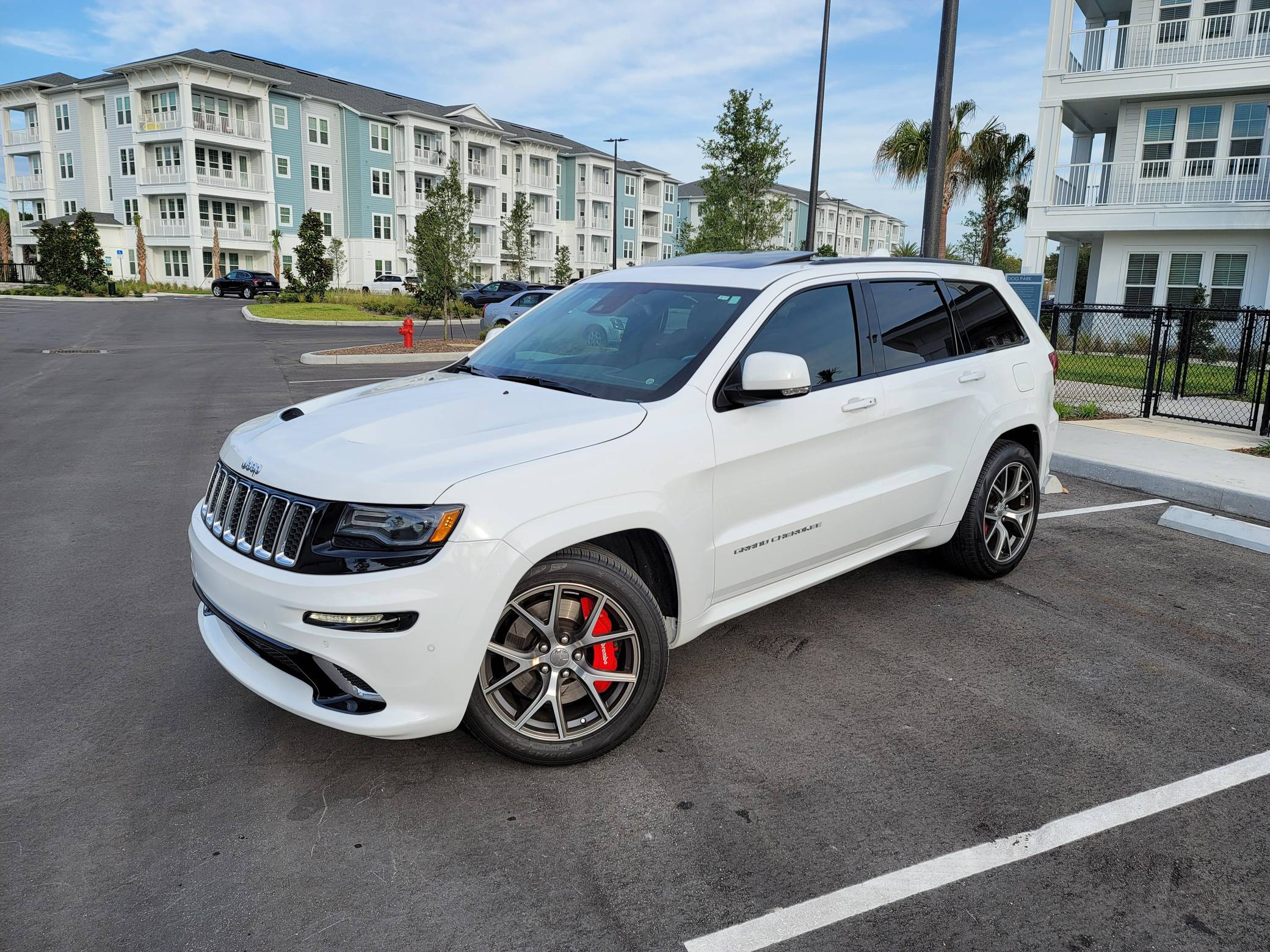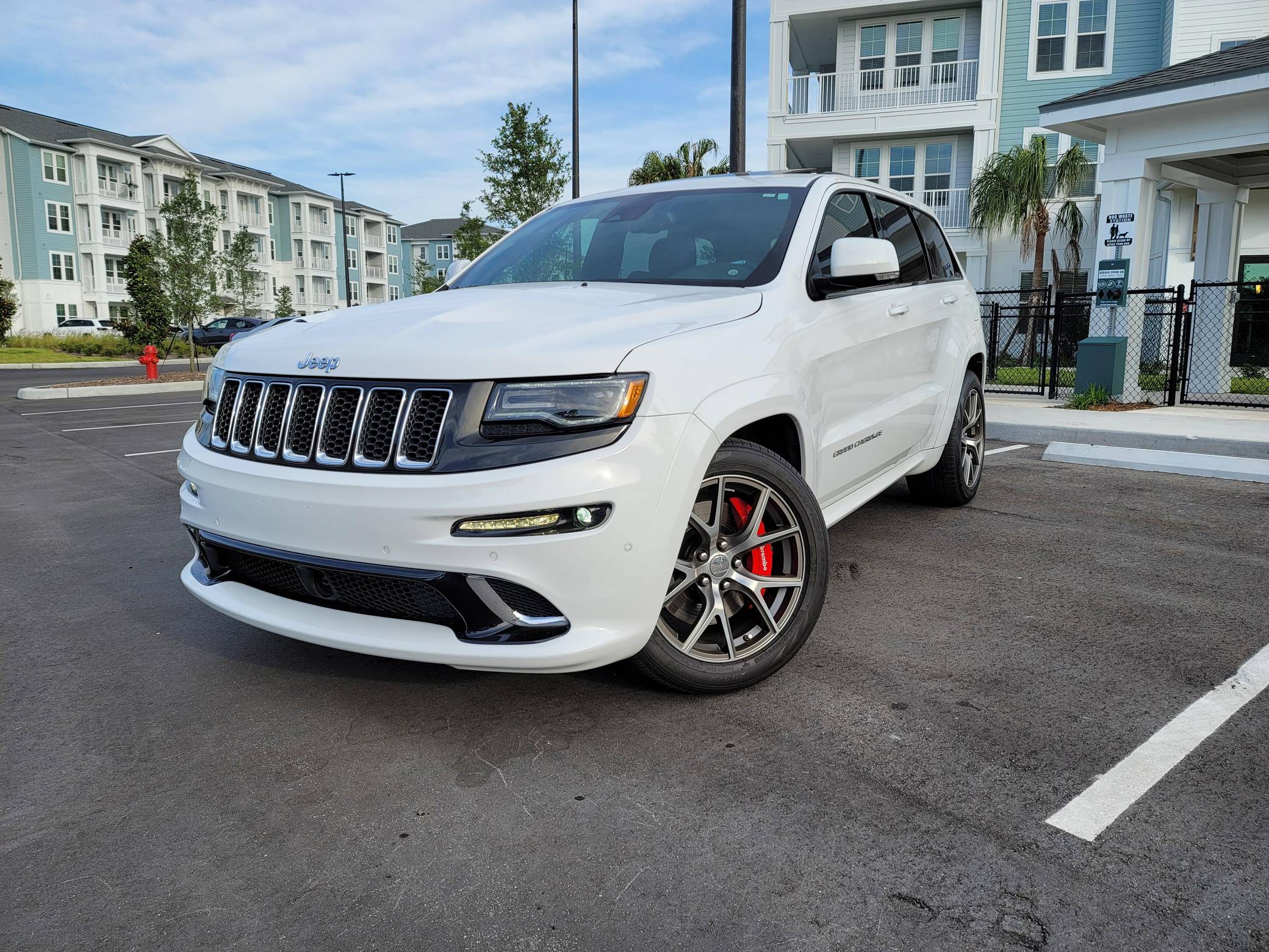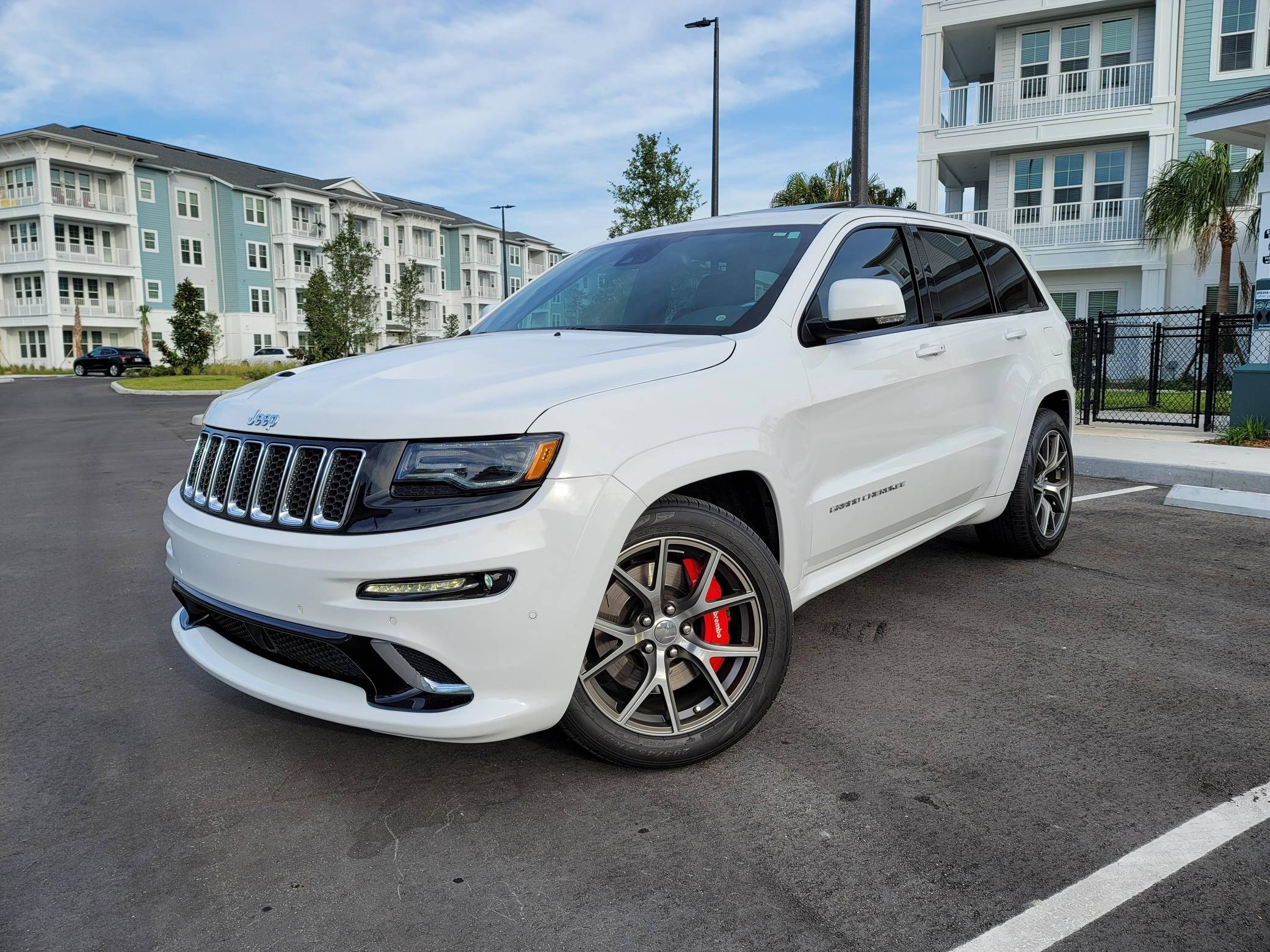 2016 Jeep Grand Cherokee SRT, finished in Bright White with a black interior. This SUV's odometer displays about 28,300 miles. Factory equipment includes 20-inch forged wheels, an electronic rear limited-slip differential, a trailer hitch, heated, ventilated, and power-adjustable front seats, heated rear seats, a 19-speaker Harman Kardon sound system with a subwoofer, and adaptive cruise control. The seller reports no modifications. Jeep demonstrated a completely different side of the "WK2"-generation Grand Cherokee when it released the SRT8 model for 2012. This version of the big SUV wasn't built to explore the wilderness: it was developed for on-pavement performance thanks to a Hemi V8 engine, an adaptive suspension system, and massive brakes. Jeep dropped the "8" from the name in 2014, and production ended in 2021. Power comes from a 6. 4-liter Hemi V8, rated at 475 horsepower and 470 lb-ft of torque. It spins the four wheels via an 8-speed automatic transmission.