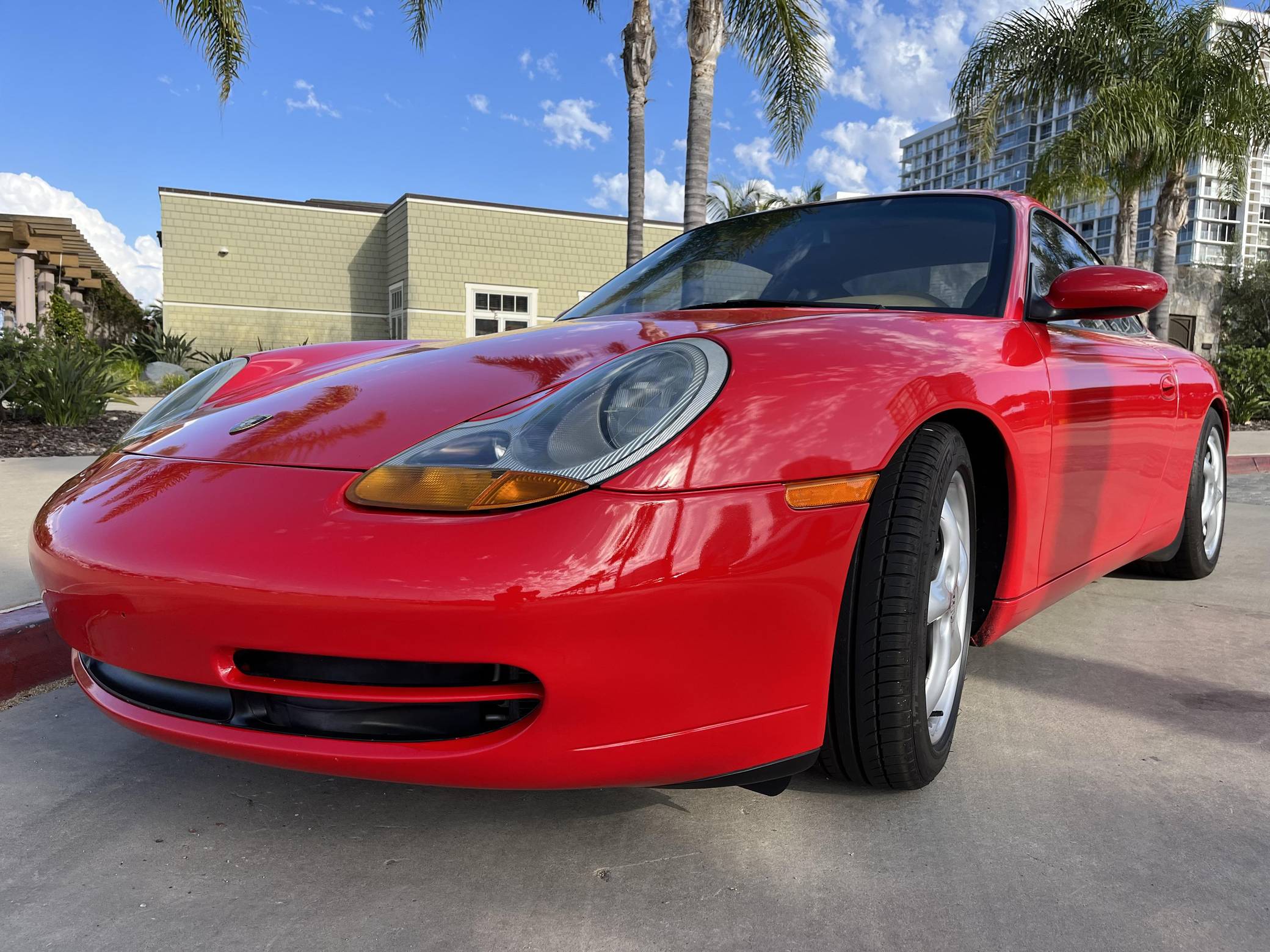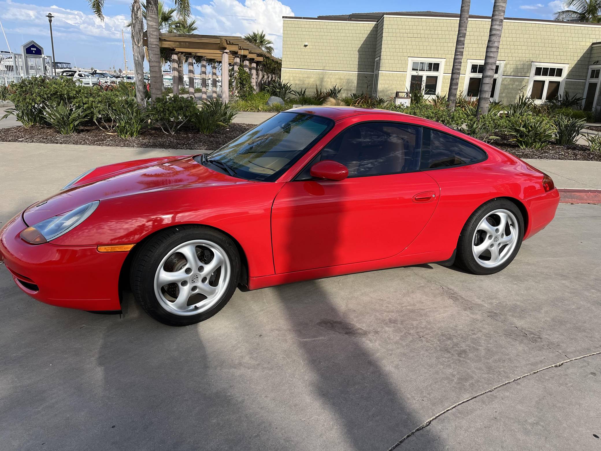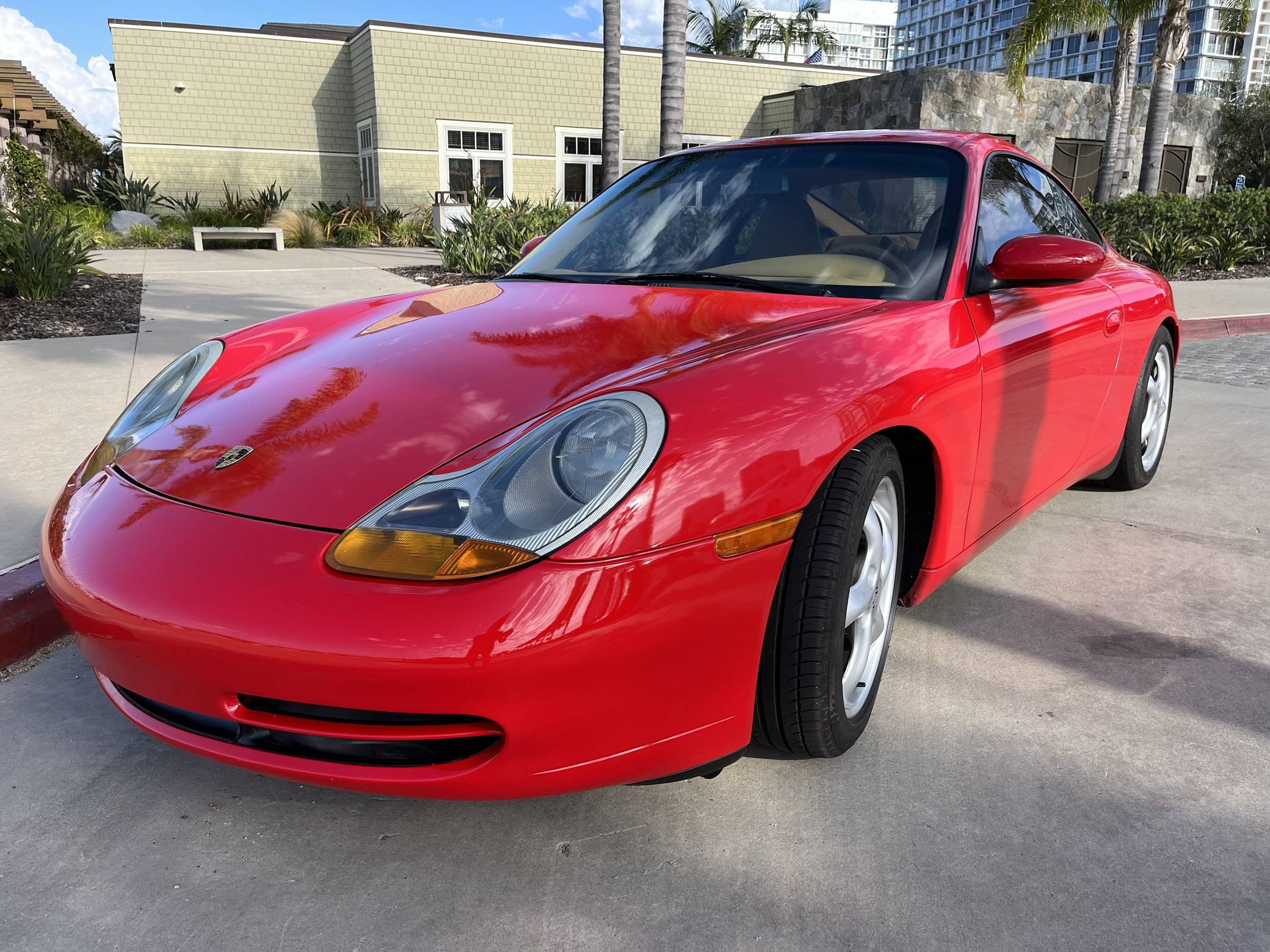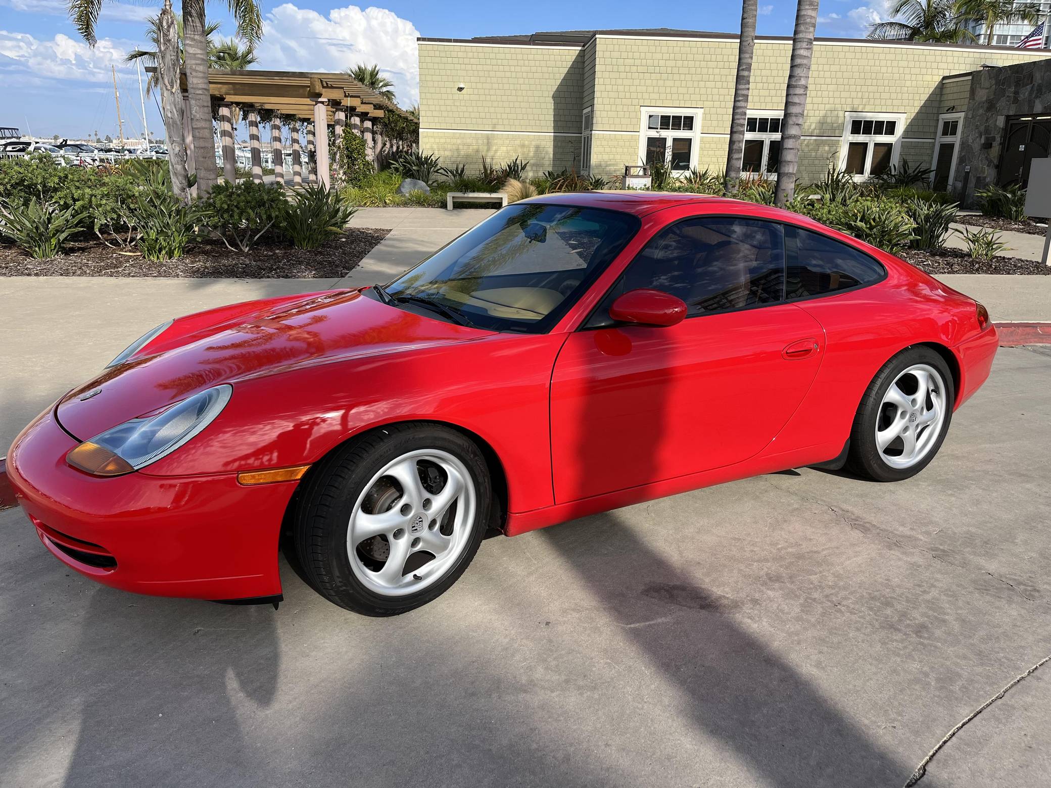 1999 Porsche 911 Carrera Coupe, finished in Guards Red with a Savannah Beige interior. This 911 is equipped with the desirable 6-speed manual transmission. A partial list of factory equipment includes a retractable rear spoiler, sunroof, leather upholstery, and 8-way power-adjustable front seats with driver's seat memory function. Some notable modifications reported by the seller include Feal 441+ coilovers, a Fabspeed Motorsport silicone intake hose, Fister exhaust system, and a Kenwood KMM-BT728HD radio unit. A set of gold-finished 18-inch Porsche Sport Design wheels is included in the sale. The fifth-generation "996" 911 was introduced for the 1999 model year and was the first 911 to be completely redesigned from its predecessors. While its water-cooled engine and distinctive headlights irked some Porsche purists, the 996 is appreciated by enthusiasts for providing an analog driving experience in a smaller, lighter package than the 911s that followed it. Rear-wheel drive 1999 model year cars, like this one, are the only version of the 996 to come with a cable throttle, as opposed to throttle-by-wire on later cars and all-wheel drive models. Power comes from a 3. 4-liter flat-6, rated at 296 horsepower and 258 lb-ft of torque. Output is sent to the rear wheels via a 6-speed manual transmission.
