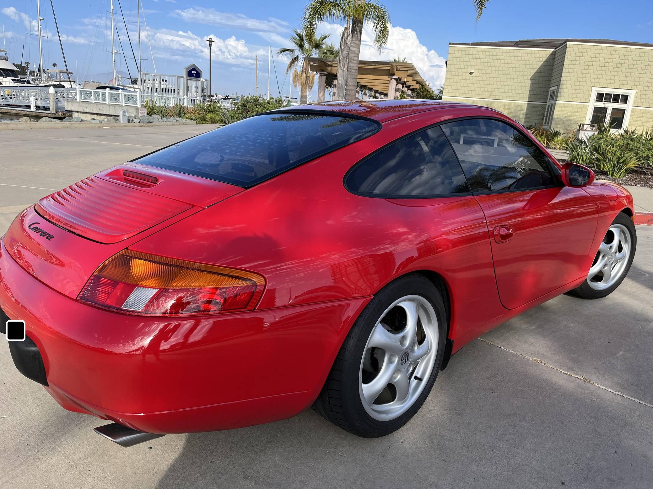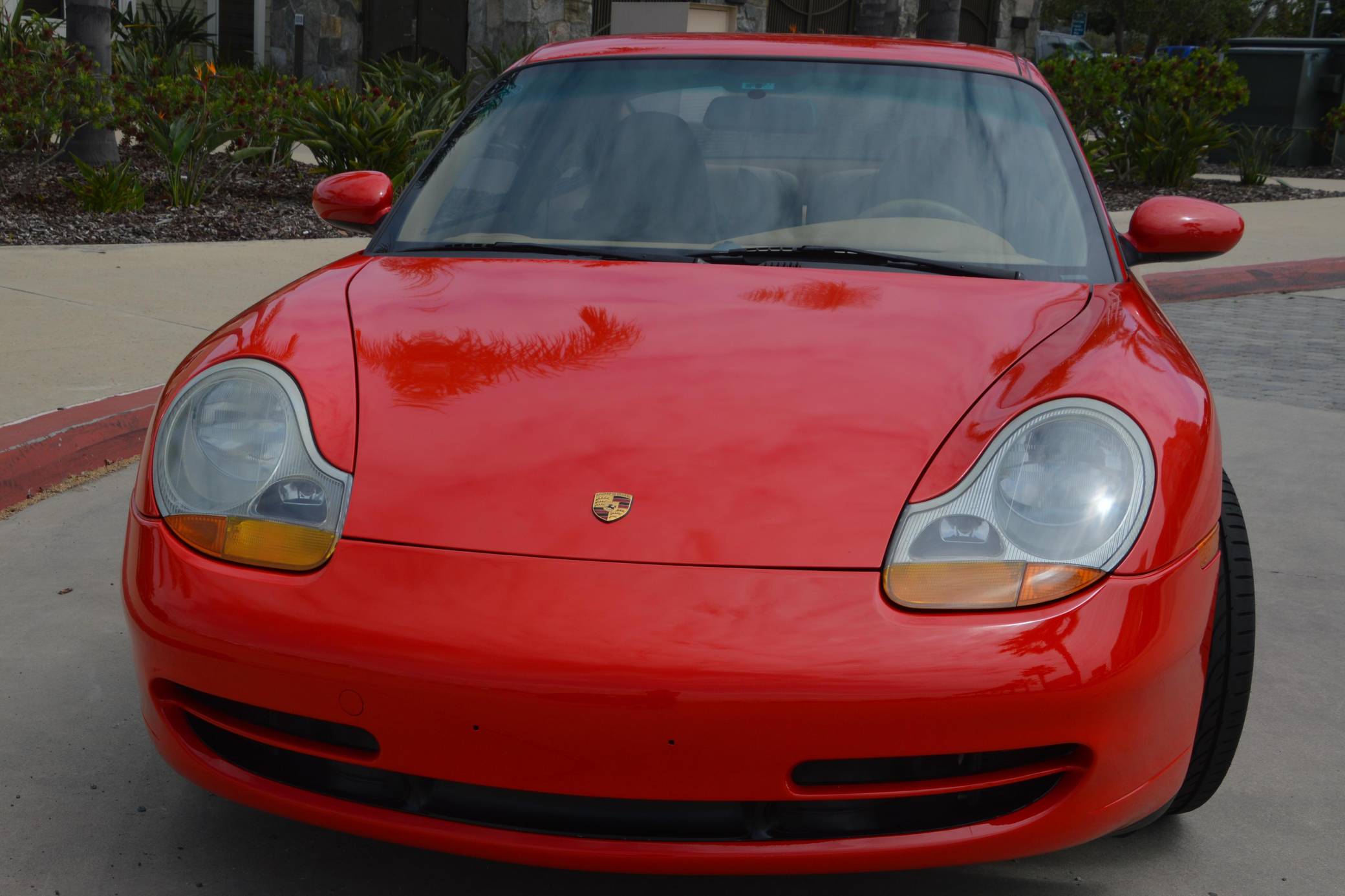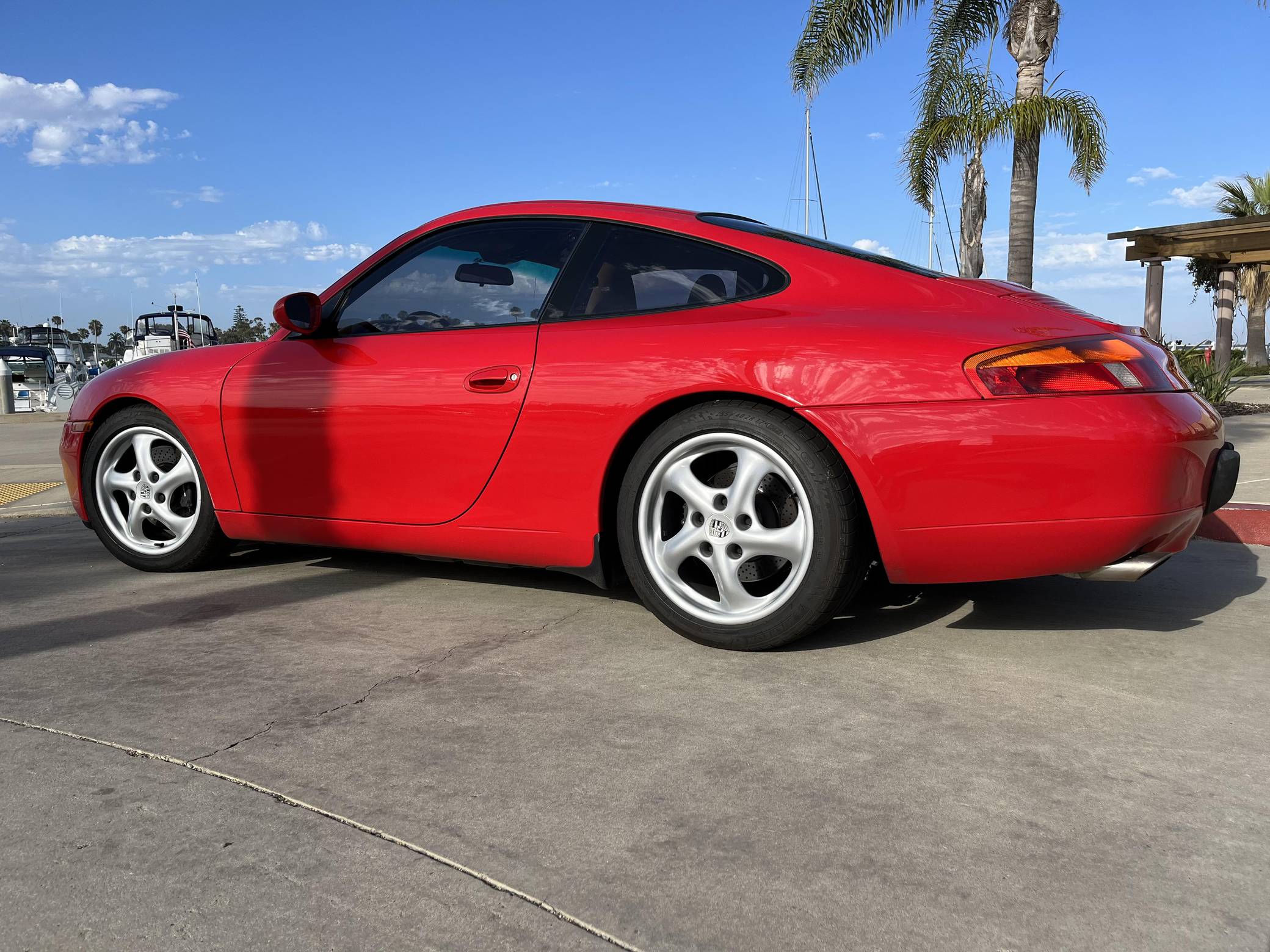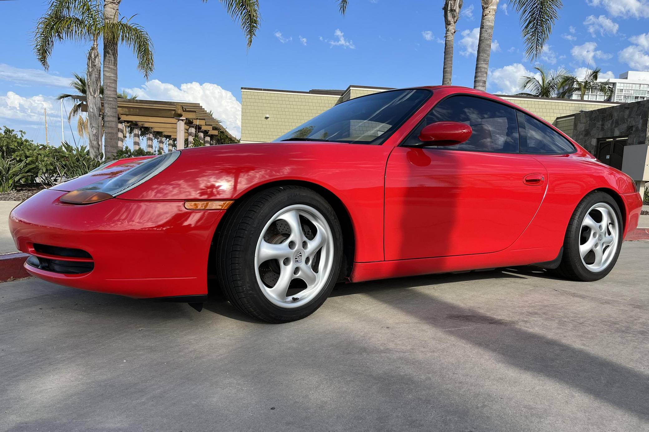 1999 Porsche 911 Carrera Coupe, finished in Guards Red with a Savannah Beige interior. This 911 is equipped with the desirable 6-speed manual transmission. A partial list of factory equipment includes a retractable rear spoiler, sunroof, leather upholstery, and 8-way power-adjustable front seats with driver's seat memory function. Some notable modifications reported by the seller include Feal 441+ coilovers, a Fabspeed Motorsport silicone intake hose, Fister exhaust system, and a Kenwood KMM-BT728HD radio unit. A set of gold-finished 18-inch Porsche Sport Design wheels is included in the sale. The fifth-generation "996" 911 was introduced for the 1999 model year and was the first 911 to be completely redesigned from its predecessors. While its water-cooled engine and distinctive headlights irked some Porsche purists, the 996 is appreciated by enthusiasts for providing an analog driving experience in a smaller, lighter package than the 911s that followed it. Rear-wheel drive 1999 model year cars, like this one, are the only version of the 996 to come with a cable throttle, as opposed to throttle-by-wire on later cars and all-wheel drive models. Power comes from a 3. 4-liter flat-6, rated at 296 horsepower and 258 lb-ft of torque. Output is sent to the rear wheels via a 6-speed manual transmission.
