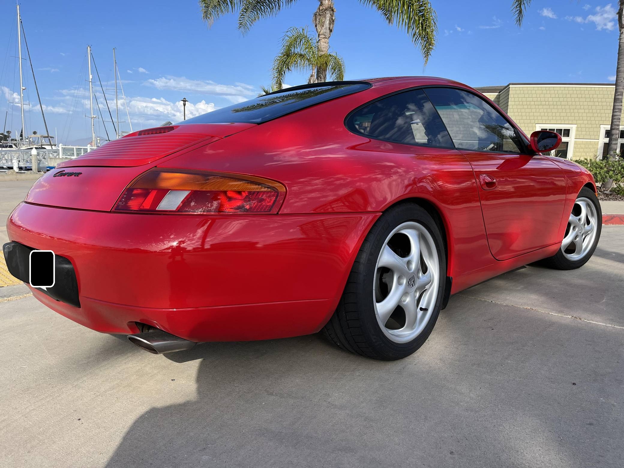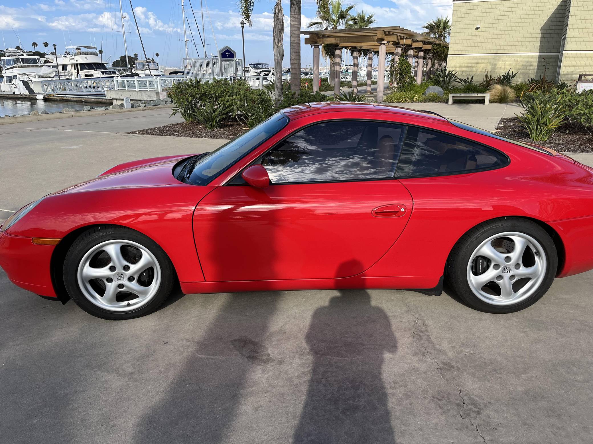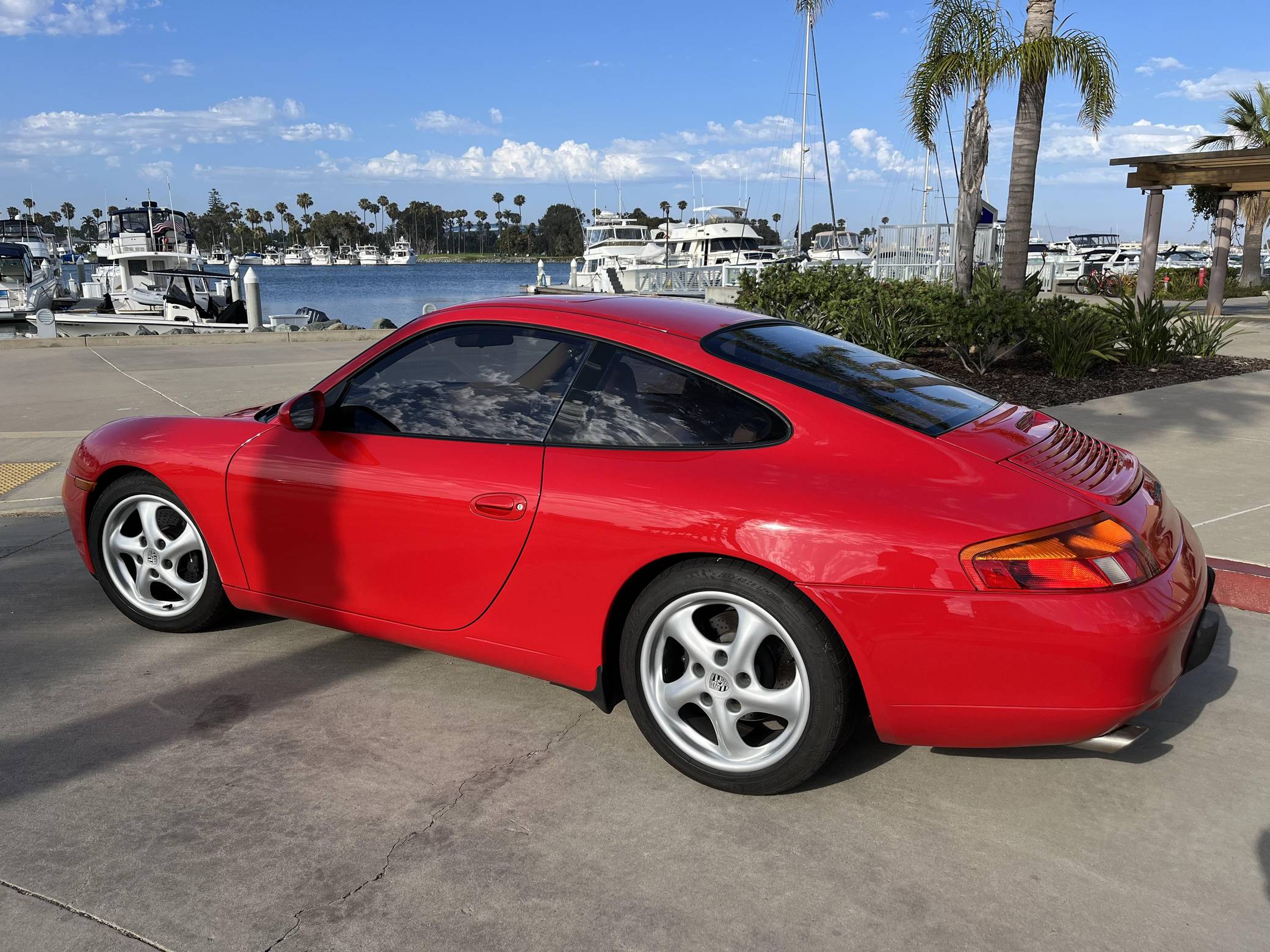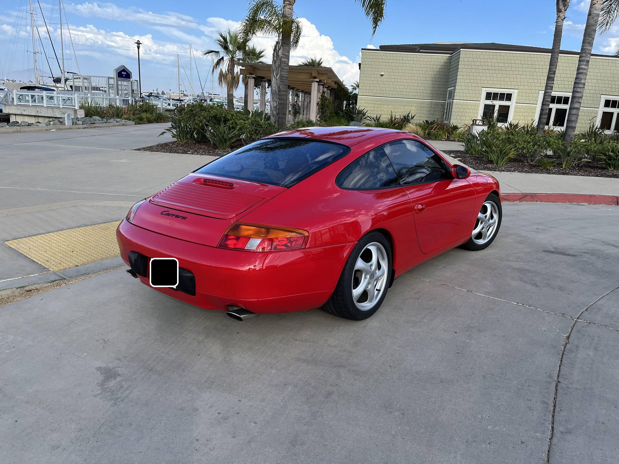 1999 Porsche 911 Carrera Coupe, finished in Guards Red with a Savannah Beige interior. This 911 is equipped with the desirable 6-speed manual transmission. A partial list of factory equipment includes a retractable rear spoiler, sunroof, leather upholstery, and 8-way power-adjustable front seats with driver's seat memory function. Some notable modifications reported by the seller include Feal 441+ coilovers, a Fabspeed Motorsport silicone intake hose, Fister exhaust system, and a Kenwood KMM-BT728HD radio unit. A set of gold-finished 18-inch Porsche Sport Design wheels is included in the sale. The fifth-generation "996" 911 was introduced for the 1999 model year and was the first 911 to be completely redesigned from its predecessors. While its water-cooled engine and distinctive headlights irked some Porsche purists, the 996 is appreciated by enthusiasts for providing an analog driving experience in a smaller, lighter package than the 911s that followed it. Rear-wheel drive 1999 model year cars, like this one, are the only version of the 996 to come with a cable throttle, as opposed to throttle-by-wire on later cars and all-wheel drive models. Power comes from a 3. 4-liter flat-6, rated at 296 horsepower and 258 lb-ft of torque. Output is sent to the rear wheels via a 6-speed manual transmission.