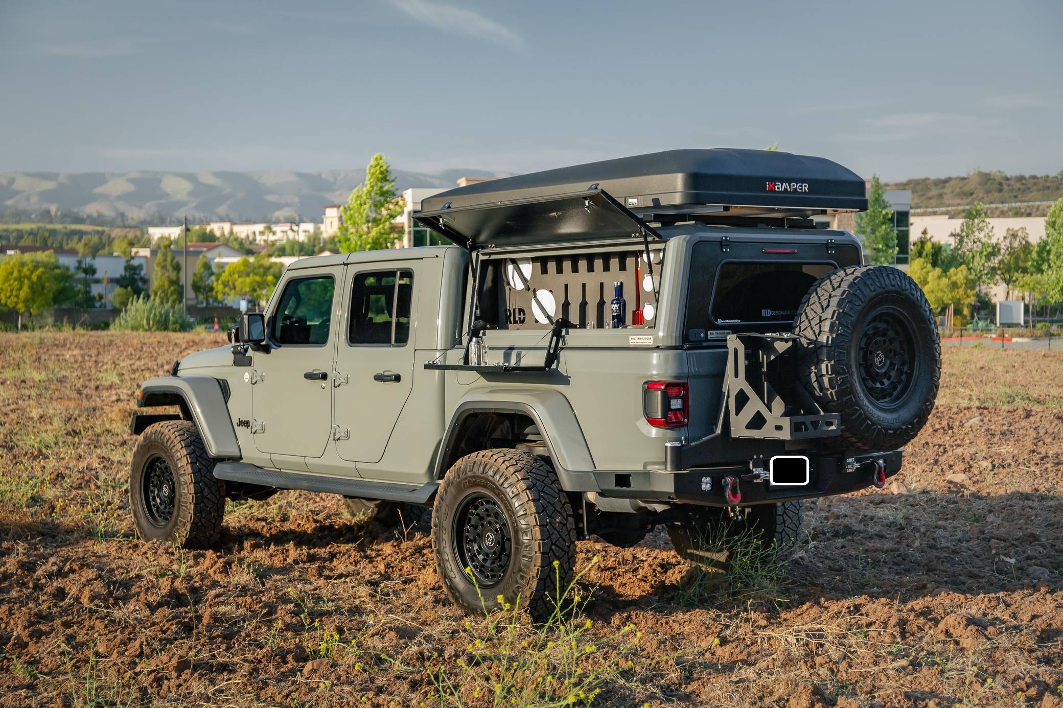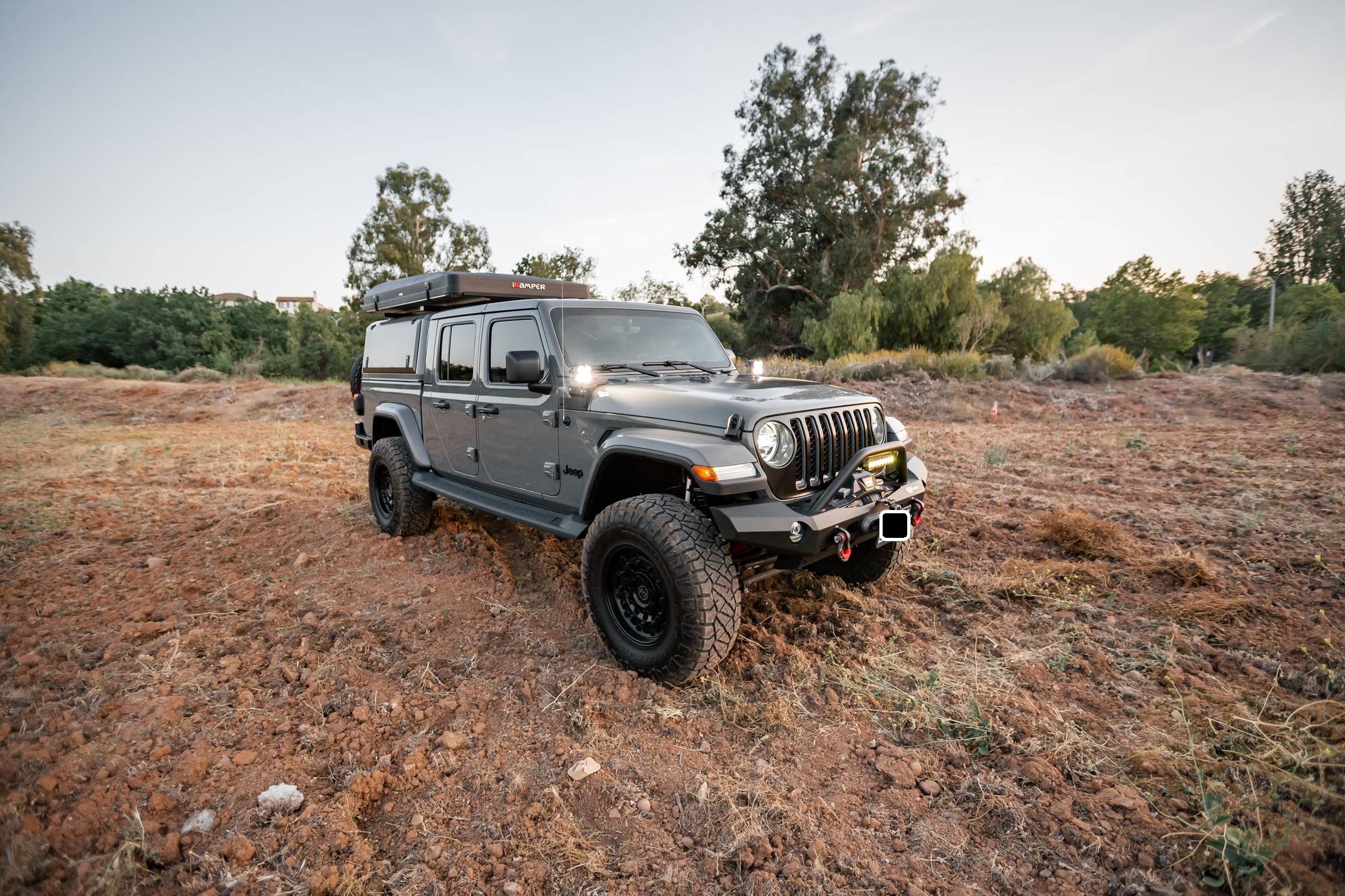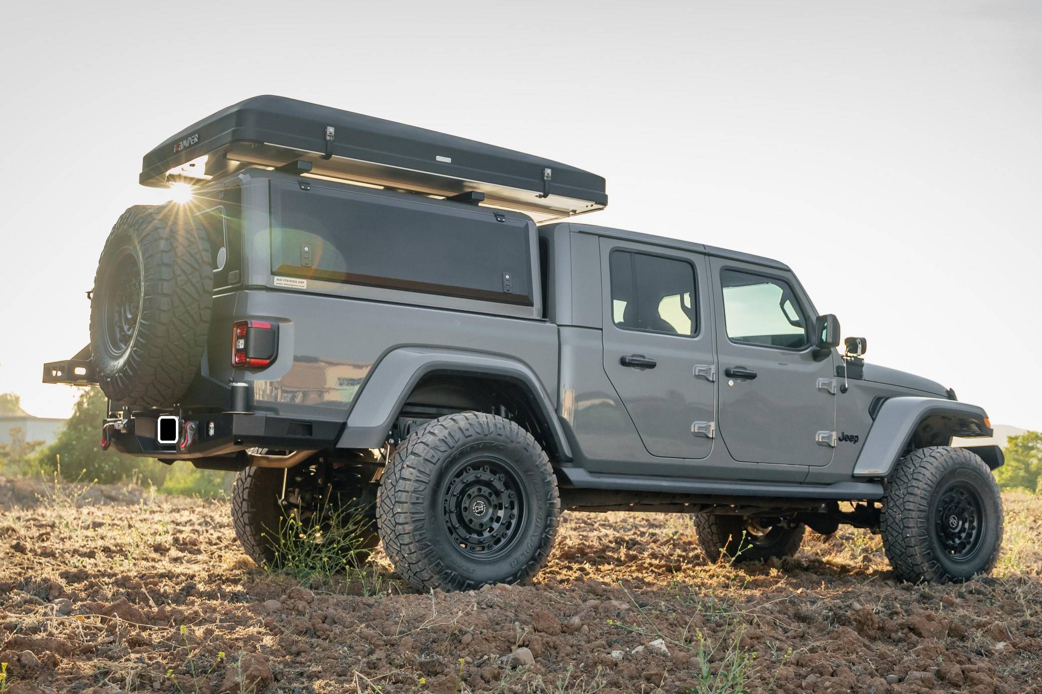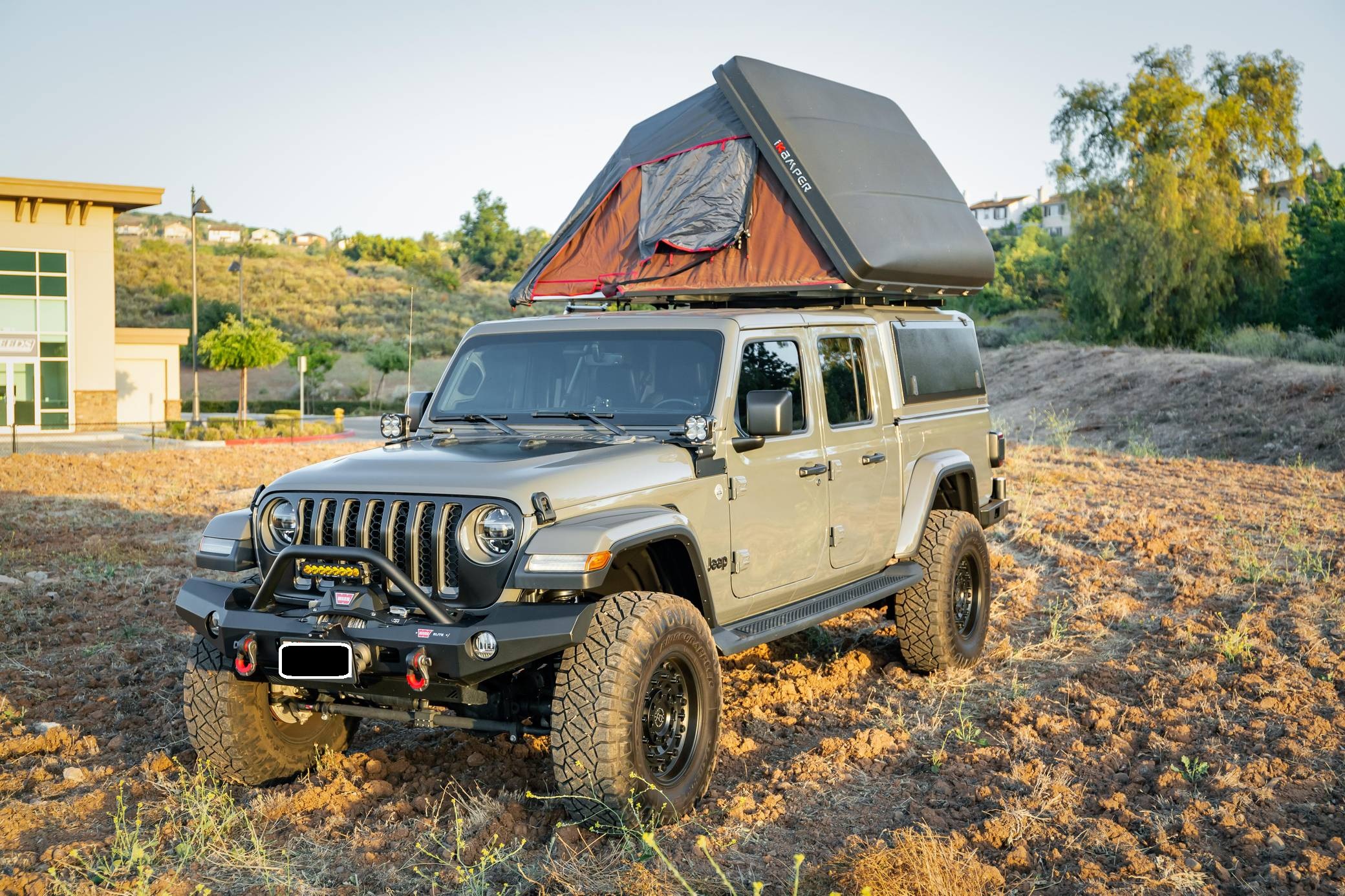 2020 Jeep Gladiator Overland, finished in Sting-Gray with a body-colored hardtop and a black interior. Modifications reported by the seller include 18-inch Black Rhino wheels, a Fabtech Motorsports 5-inch Trail Systems suspension lift kit with Dirt Logic shocks, a WARN Industries Elite Series front bumper with a winch, Baja Designs exterior lights, an RLD Design camper shell with a built-in kitchen, and an iKamper roof-mounted pop-up tent. More details about the aftermarket parts installed on this truck are provided below, and the removed factory 18-inch wheels are included in the sale. It's equipped with the Cold Weather, Premium LED Lighting, and 8. 4-inch Radio and Premium Audio packages, a transmission skid plate, side steps, a 3-piece removable hardtop, and leather upholstery, among other features. Jeep returned to the pickup segment after a long hiatus when it released the Gladiator for 2020. Offered only with four doors, it’s closely related to the fourth-generation Wrangler so it offers heritage-laced styling, body-on-frame construction, and excellent off-road capacity. It’s still sold new in 2022. Power comes from a 3. 6-liter V6, rated at 285 horsepower and 260 lb-ft of torque. It spins the four wheels via an 8-speed automatic transmission and a 2-speed transfer case.
