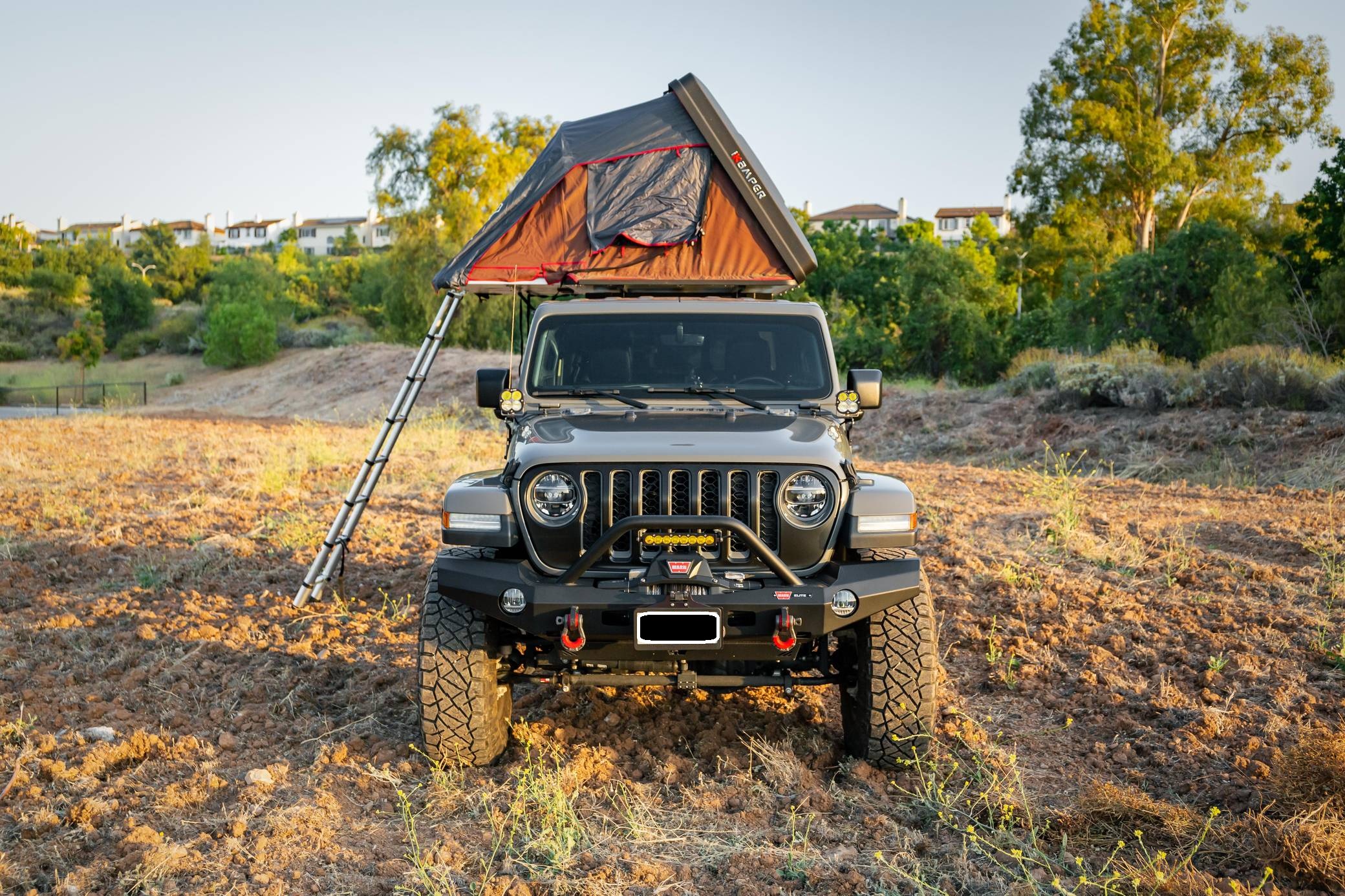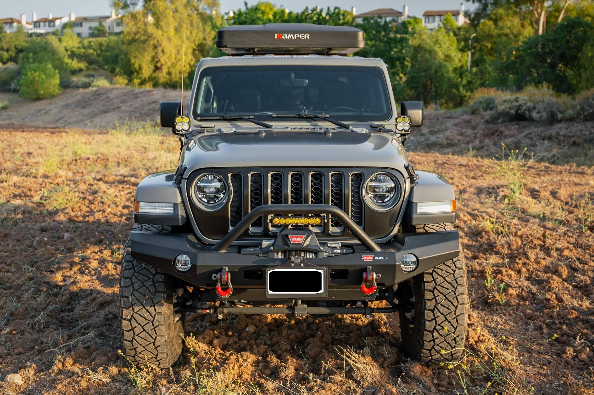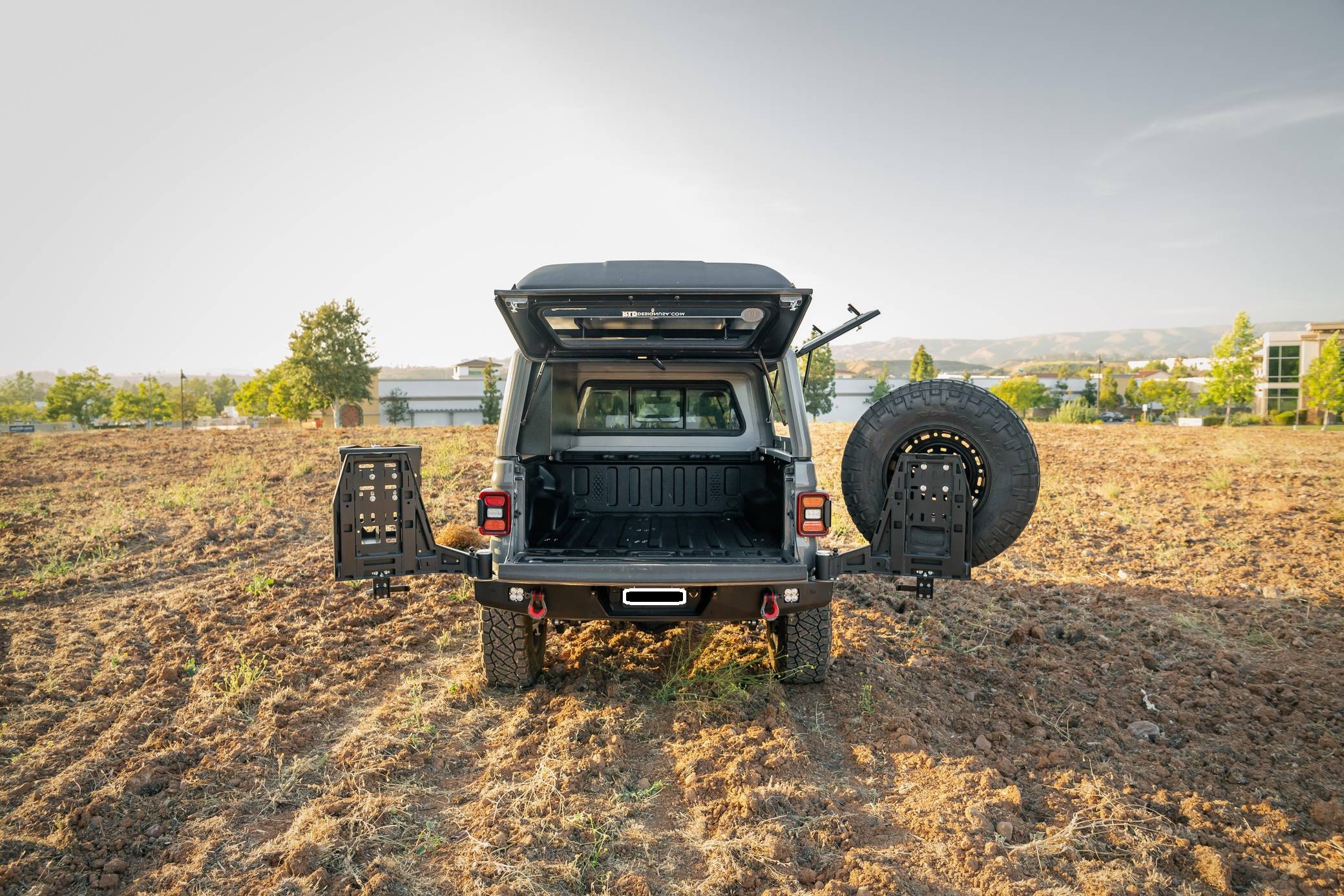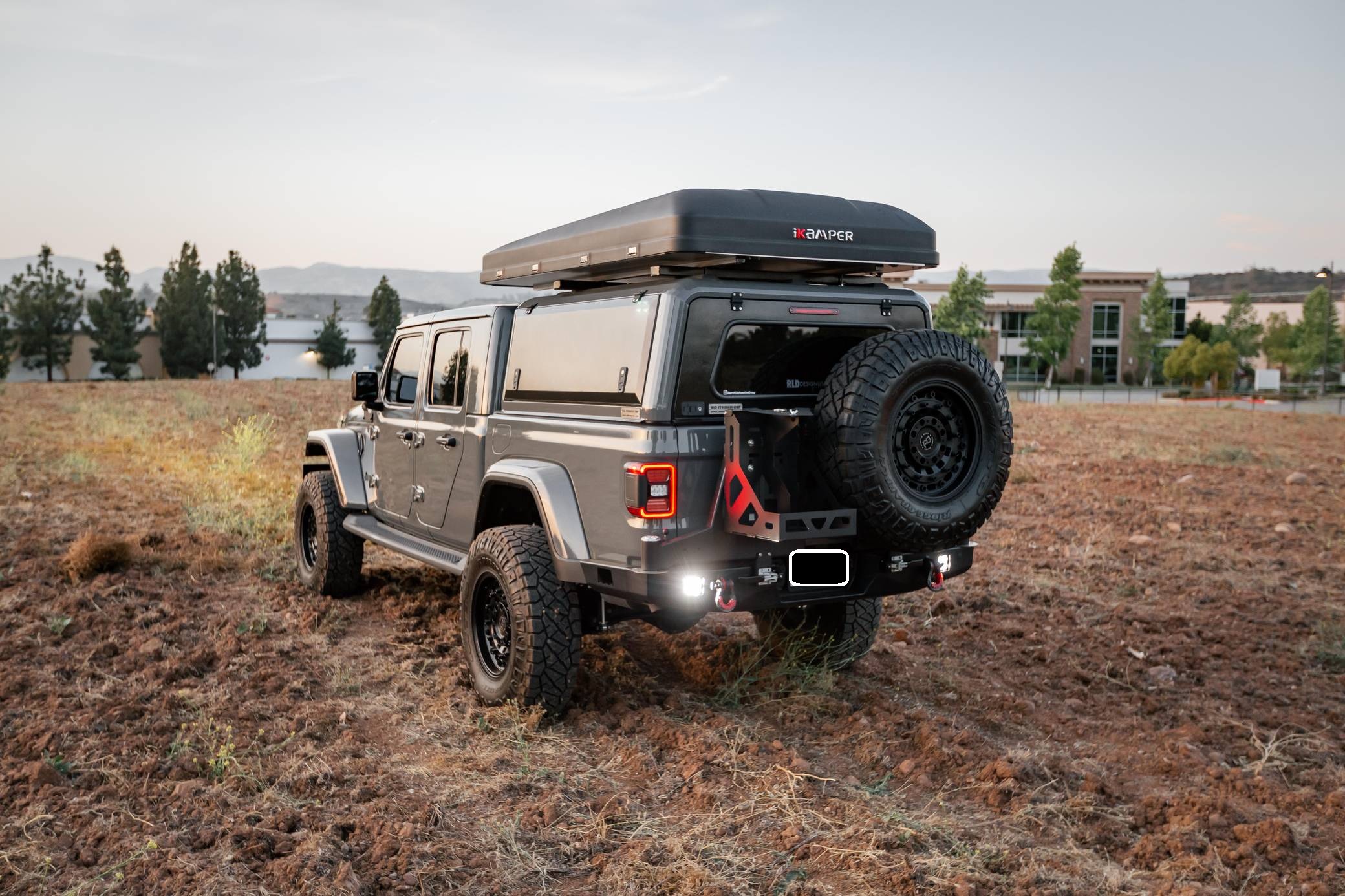 2020 Jeep Gladiator Overland, finished in Sting-Gray with a body-colored hardtop and a black interior. Modifications reported by the seller include 18-inch Black Rhino wheels, a Fabtech Motorsports 5-inch Trail Systems suspension lift kit with Dirt Logic shocks, a WARN Industries Elite Series front bumper with a winch, Baja Designs exterior lights, an RLD Design camper shell with a built-in kitchen, and an iKamper roof-mounted pop-up tent. More details about the aftermarket parts installed on this truck are provided below, and the removed factory 18-inch wheels are included in the sale. It's equipped with the Cold Weather, Premium LED Lighting, and 8. 4-inch Radio and Premium Audio packages, a transmission skid plate, side steps, a 3-piece removable hardtop, and leather upholstery, among other features. Jeep returned to the pickup segment after a long hiatus when it released the Gladiator for 2020. Offered only with four doors, it’s closely related to the fourth-generation Wrangler so it offers heritage-laced styling, body-on-frame construction, and excellent off-road capacity. It’s still sold new in 2022. Power comes from a 3. 6-liter V6, rated at 285 horsepower and 260 lb-ft of torque. It spins the four wheels via an 8-speed automatic transmission and a 2-speed transfer case.