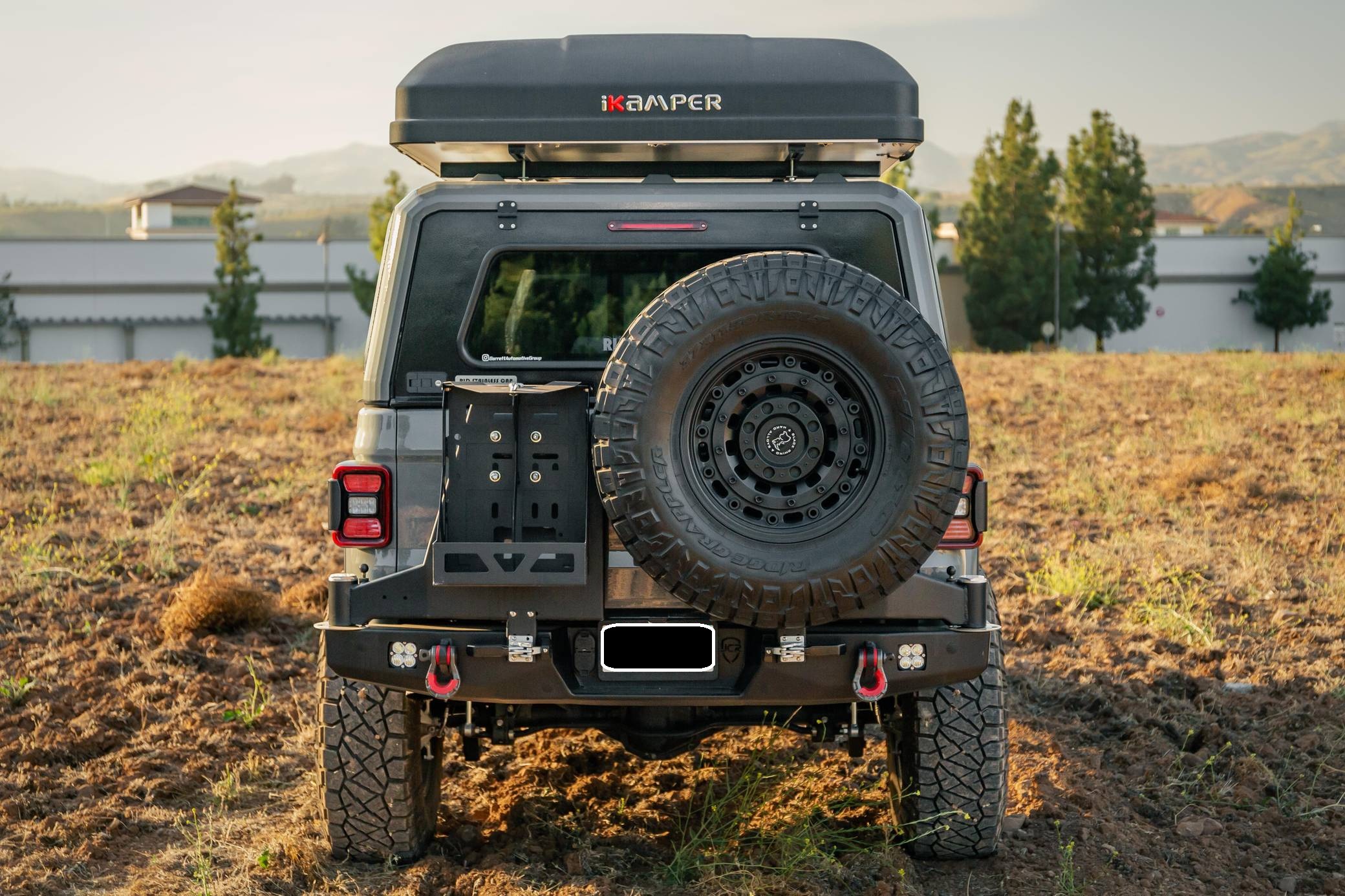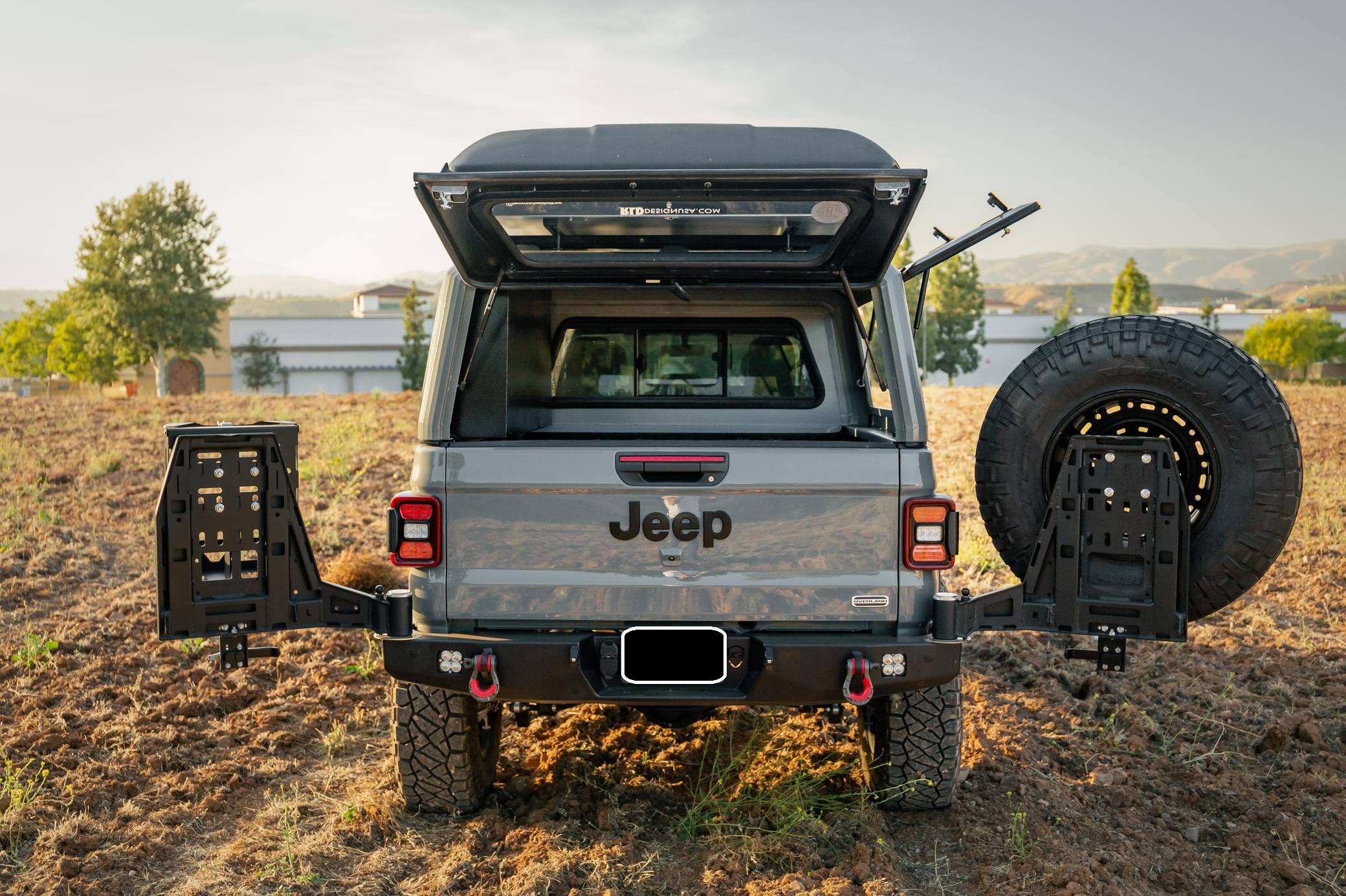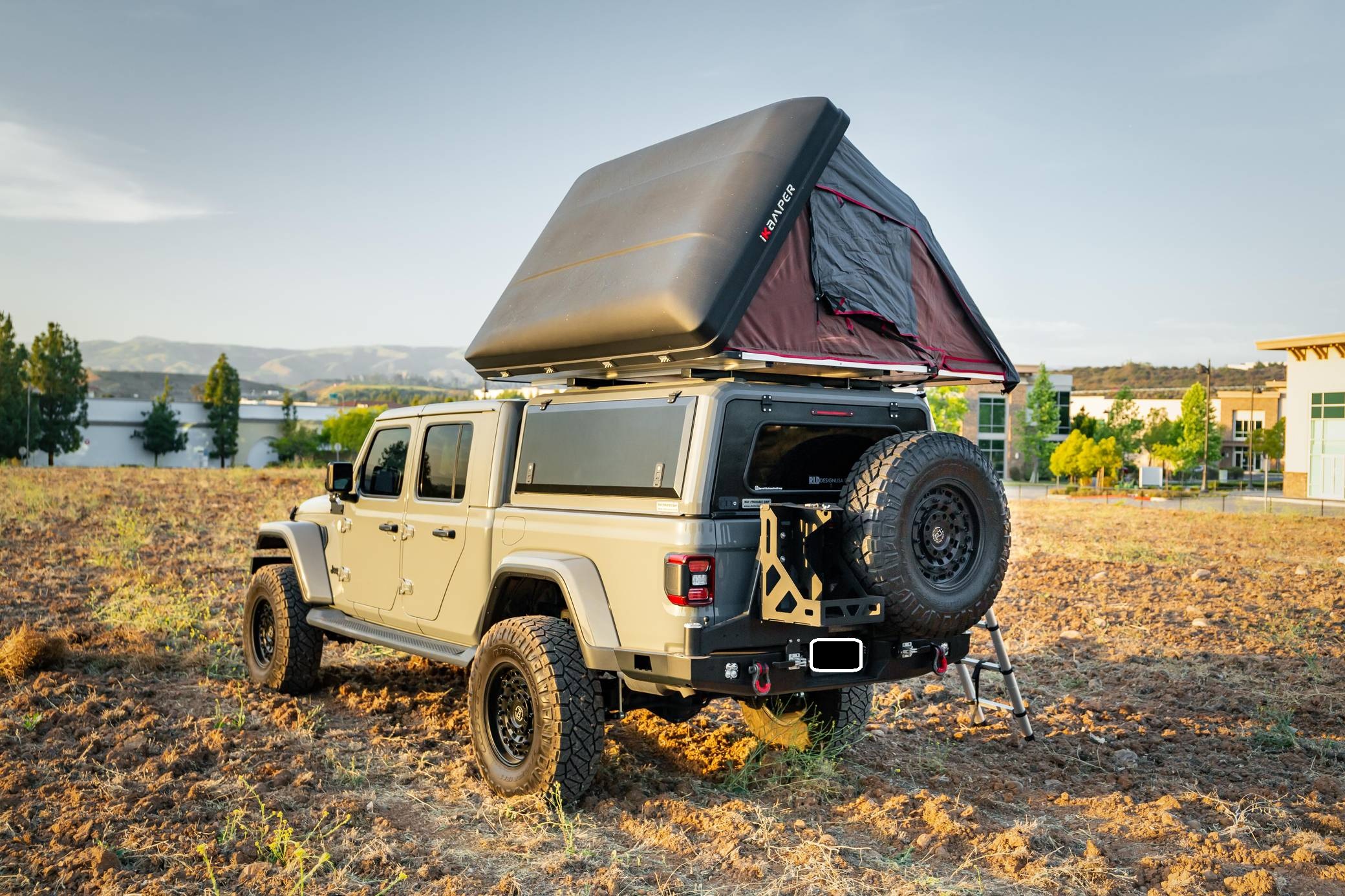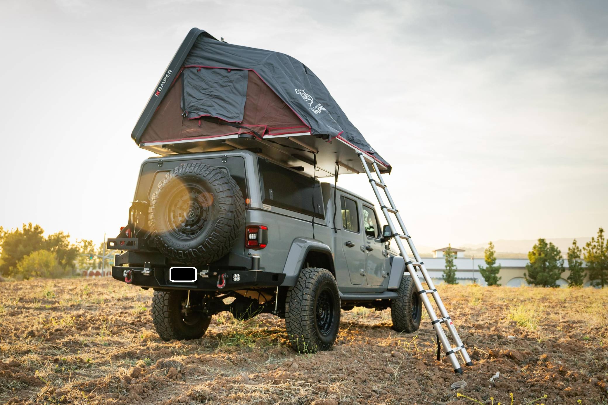2020 Jeep Gladiator Overland, finished in Sting-Gray with a body-colored hardtop and a black interior. Modifications reported by the seller include 18-inch Black Rhino wheels, a Fabtech Motorsports 5-inch Trail Systems suspension lift kit with Dirt Logic shocks, a WARN Industries Elite Series front bumper with a winch, Baja Designs exterior lights, an RLD Design camper shell with a built-in kitchen, and an iKamper roof-mounted pop-up tent. More details about the aftermarket parts installed on this truck are provided below, and the removed factory 18-inch wheels are included in the sale. It's equipped with the Cold Weather, Premium LED Lighting, and 8. 4-inch Radio and Premium Audio packages, a transmission skid plate, side steps, a 3-piece removable hardtop, and leather upholstery, among other features. Jeep returned to the pickup segment after a long hiatus when it released the Gladiator for 2020. Offered only with four doors, it’s closely related to the fourth-generation Wrangler so it offers heritage-laced styling, body-on-frame construction, and excellent off-road capacity. It’s still sold new in 2022. Power comes from a 3. 6-liter V6, rated at 285 horsepower and 260 lb-ft of torque. It spins the four wheels via an 8-speed automatic transmission and a 2-speed transfer case.