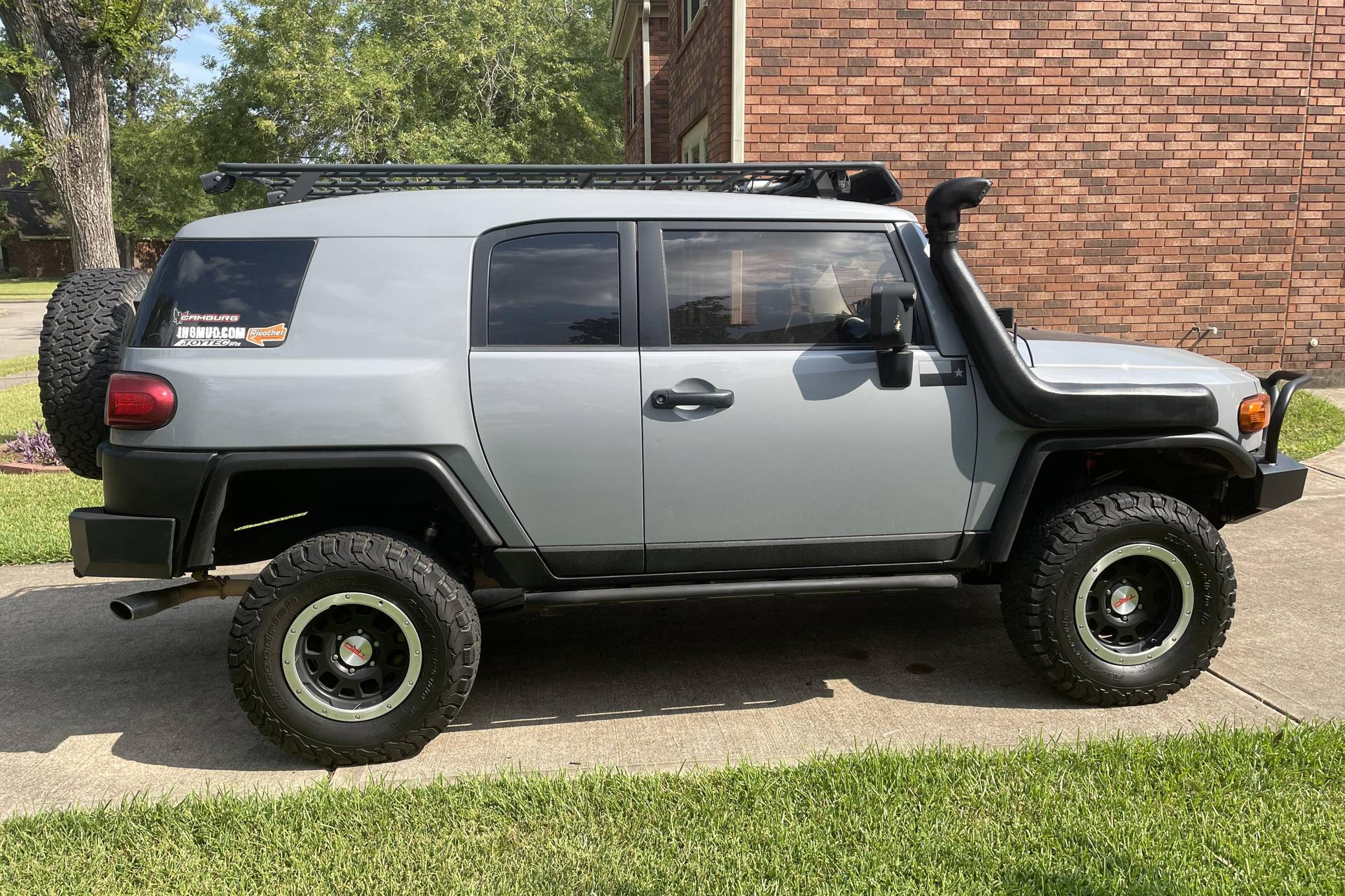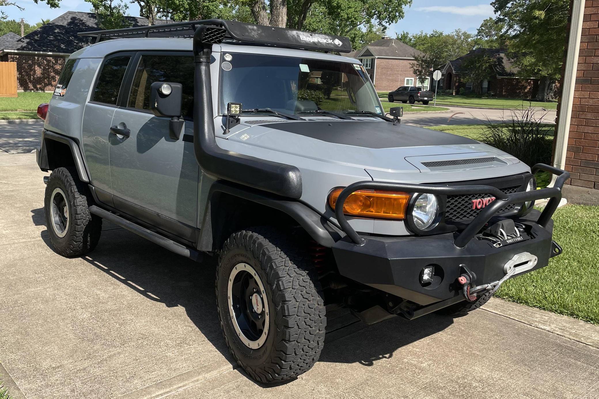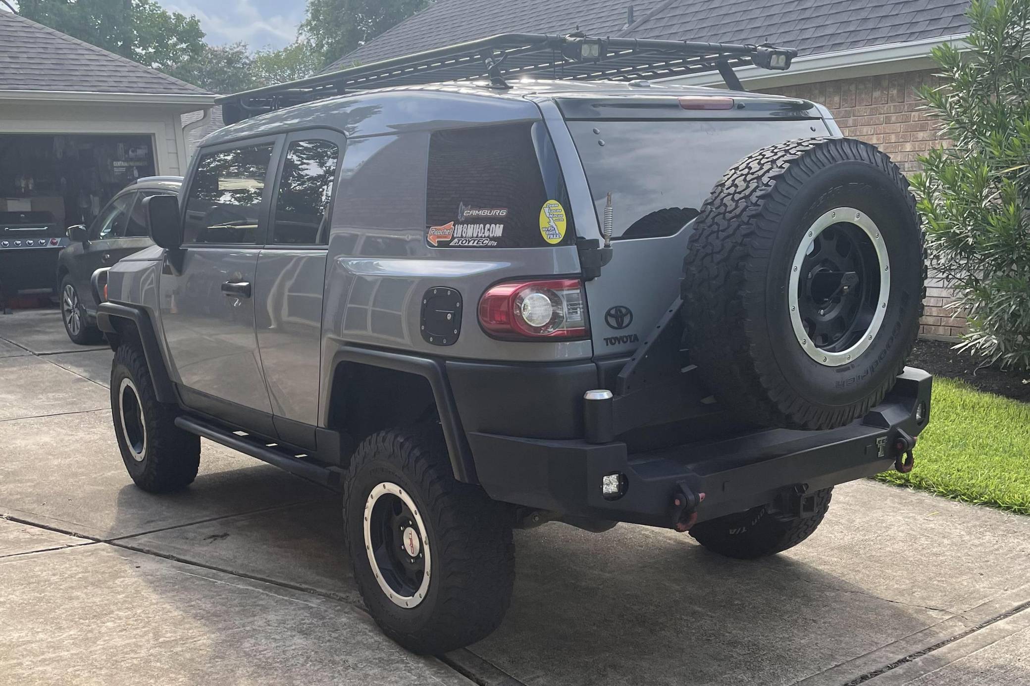 2013 Toyota FJ Cruiser Trail Teams, finished in Cement Gray with a black and gray interior. This SUV's odometer displays about 54,900 miles. Modifications reported by the seller include a ToyTec Lifts suspension lift kit, Camburg Engineering upper control arms, a snorkel-style air intake system, an Expedition One windshield washer fluid reservoir kit, Expedition One steel front and rear bumpers, a Smittybilt X2O winch, a BajaRack roof rack with a SPY light system, 4x4 sPOD switches on the center stack, and a Uniden America Corporation CB radio. More details about the aftermarket parts installed on this FJ Cruiser are provided below. Factory equipment includes the Trail Teams Special Edition Package, water-resistant cloth upholstery, heavy-duty all-weather flooring, air conditioning, and a CD player. Toyota gave the Jeep Wrangler its first direct rival in many years when it launched the FJ Cruiser for the 2007 model year. The heritage-laced exterior design hid proven suspension and mechanical components shared with the 4Runner, among other Toyota off-roaders, and the FJ stood out with quirks like rear half doors and three windshield wipers. It left the American market after the 2014 model year, though production carried on overseas, and it wasn't directly replaced. Power comes from a 4. 0-liter V6, rated at 260 horsepower and 271 lb-ft of torque. It spins the rear or the four wheels via a 5-speed automatic transmission and a 2-speed transfer case.