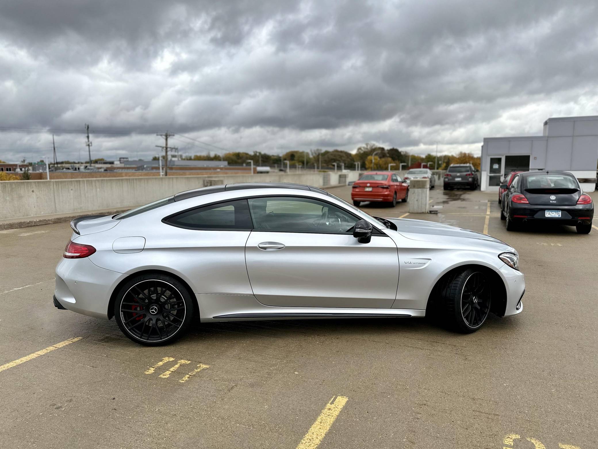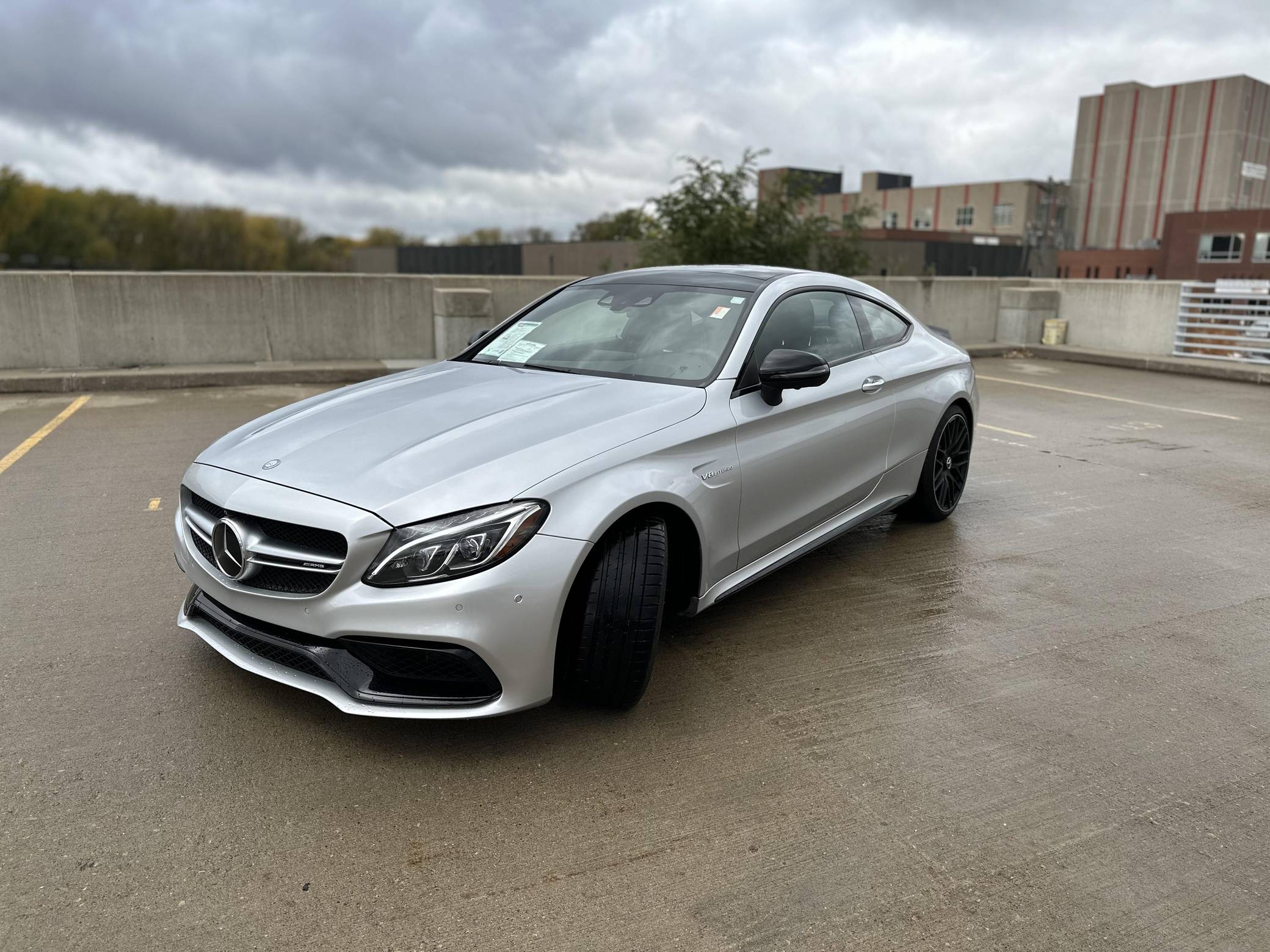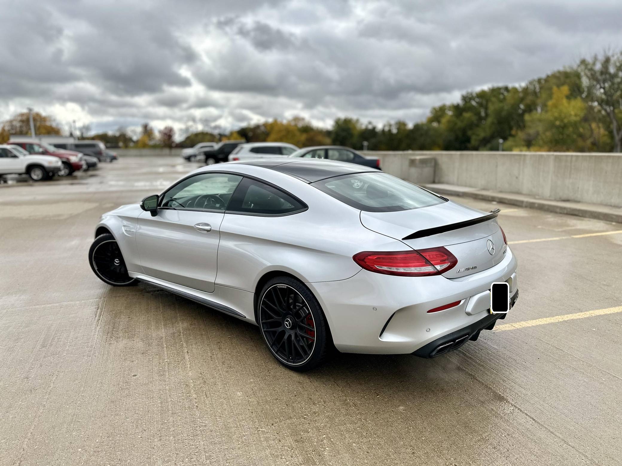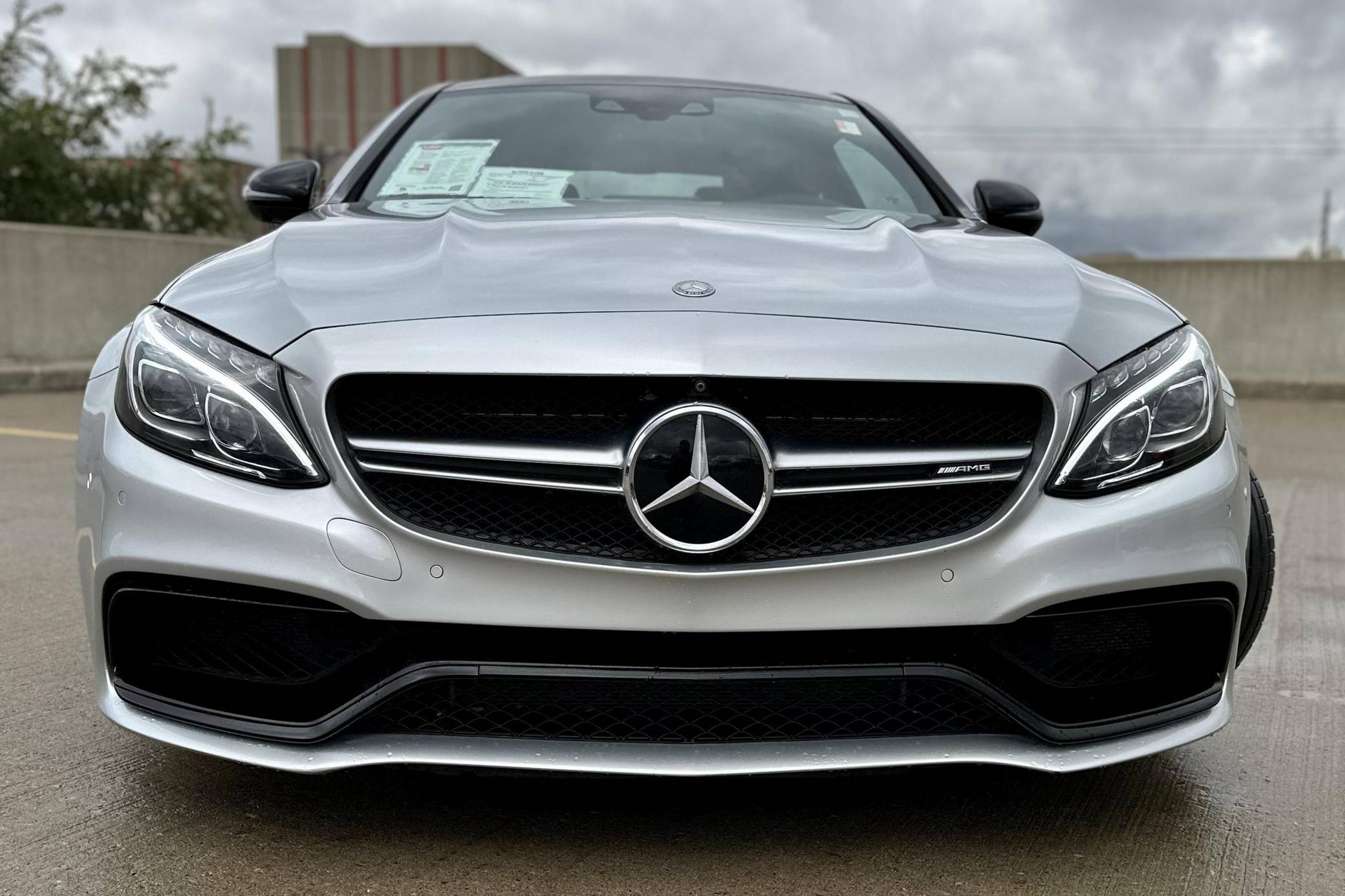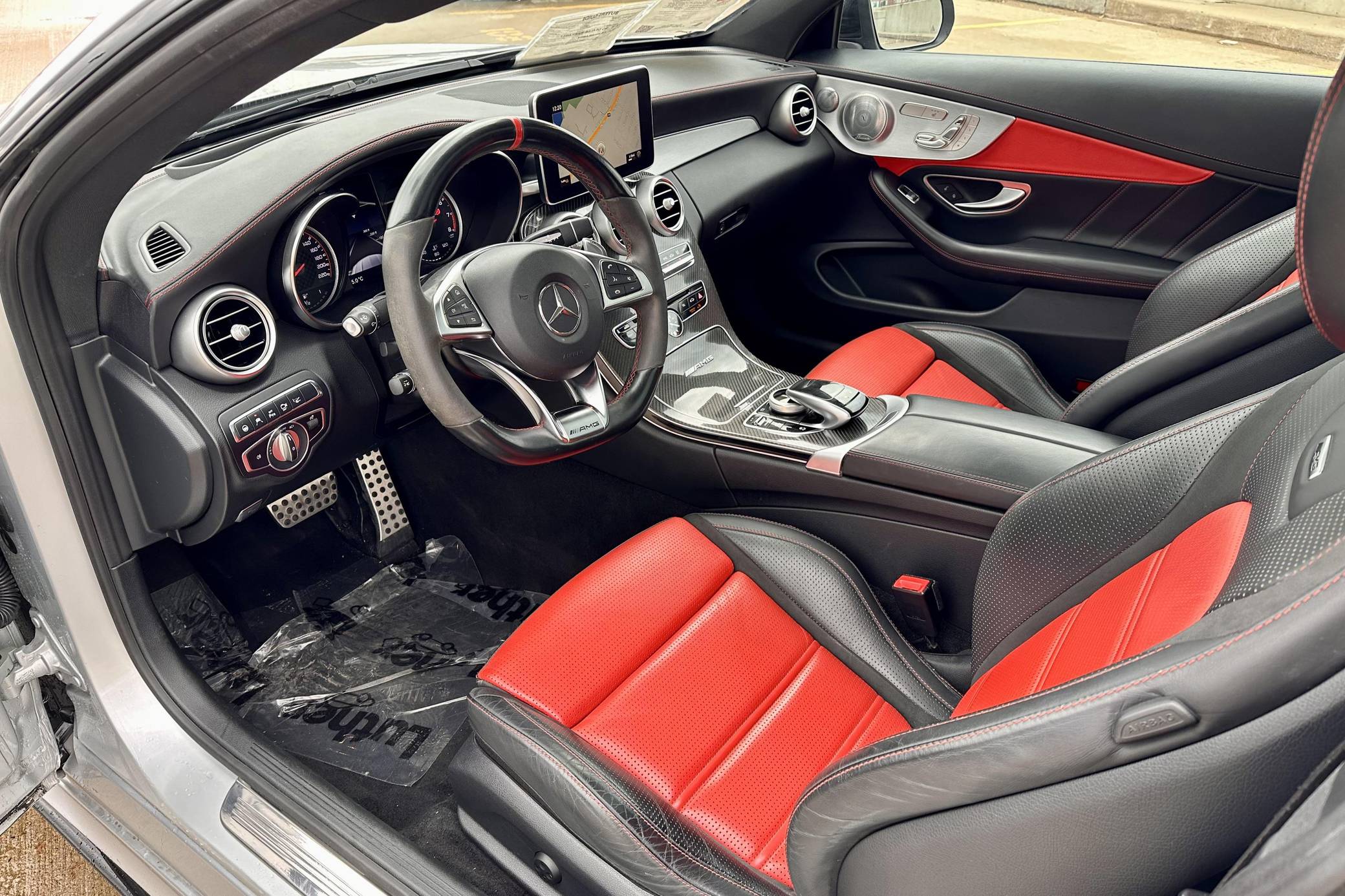 THIS… is a 2017 Mercedes-AMG C63 S Coupe, finished in Iridium Silver Metallic with a Red Pepper and black interior. The factory instrument cluster has been swapped with a U. S. market model, and the odometer shows approximately 48,900 miles. The car was federalized in 2019 by the previous owner. Factory equipment includes 19-inch front and 20-inch rear wheels, LED lights, a sunroof, rear fog lights, leather upholstery, heated and power-adjustable front seats, a Burmester surround sound system, Blind Spot Assist, automatic climate control, and a navigation system, among more listed below. The seller reports no modifications. Mercedes-AMG introduced the "W205"-based C63 for the 2015 model year, shortly after it morphed into a sub-brand within Mercedes-Benz. Offered as a sedan and as a coupe, the C63 surfed the downsizing wave sweeping across the industry by trading displacement for forced induction, yet it was quicker and sharper to drive than its predecessor. Production ended in 2021, and Mercedes-AMG has confirmed that it won't build another V8-powered C63. Power comes from an "M177" 4. 0-liter twin-turbocharged V8, rated at 503 horsepower and 516 lb-ft of torque. Output is sent to the rear wheels via a 7-speed automatic transmission.
