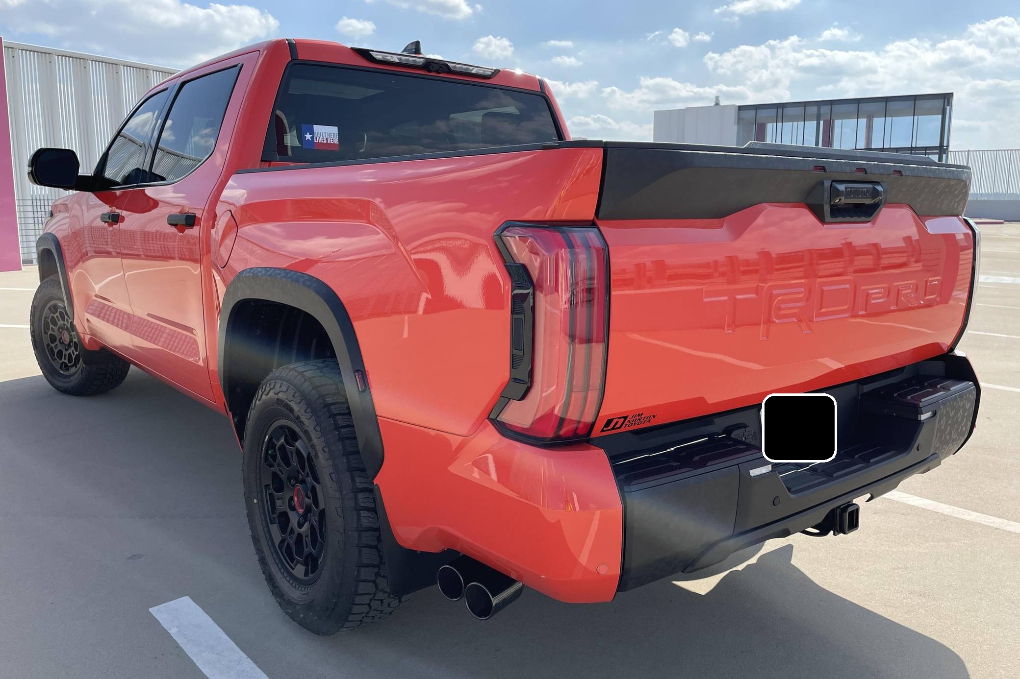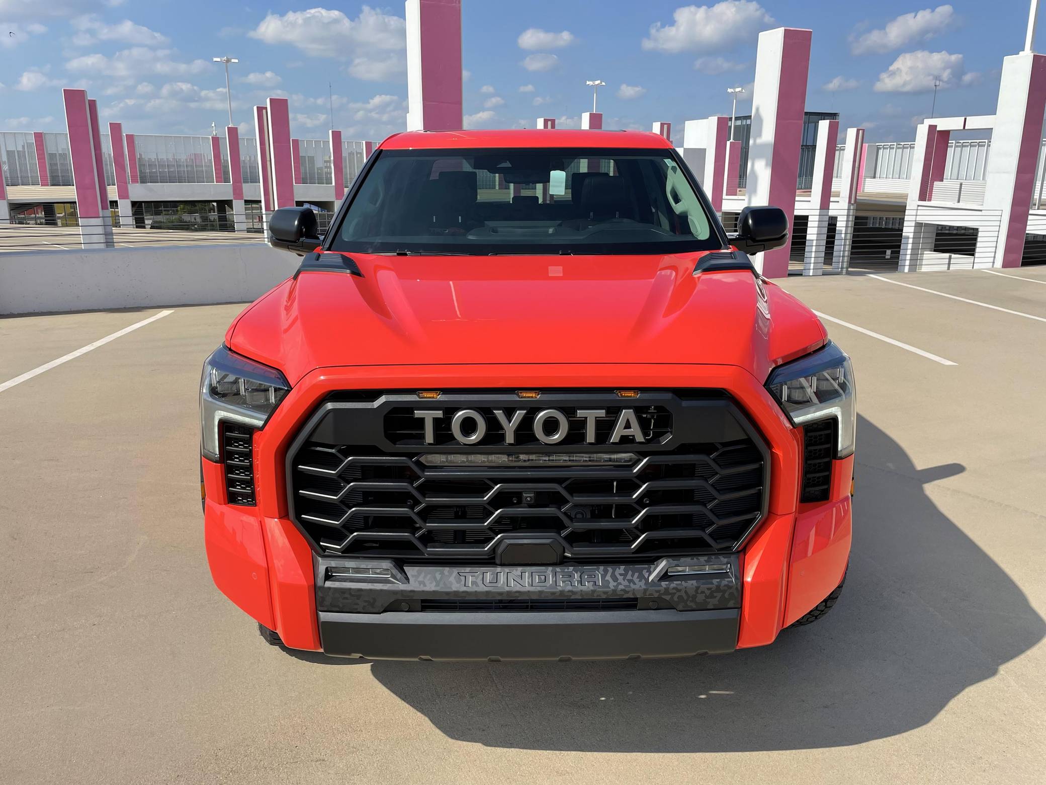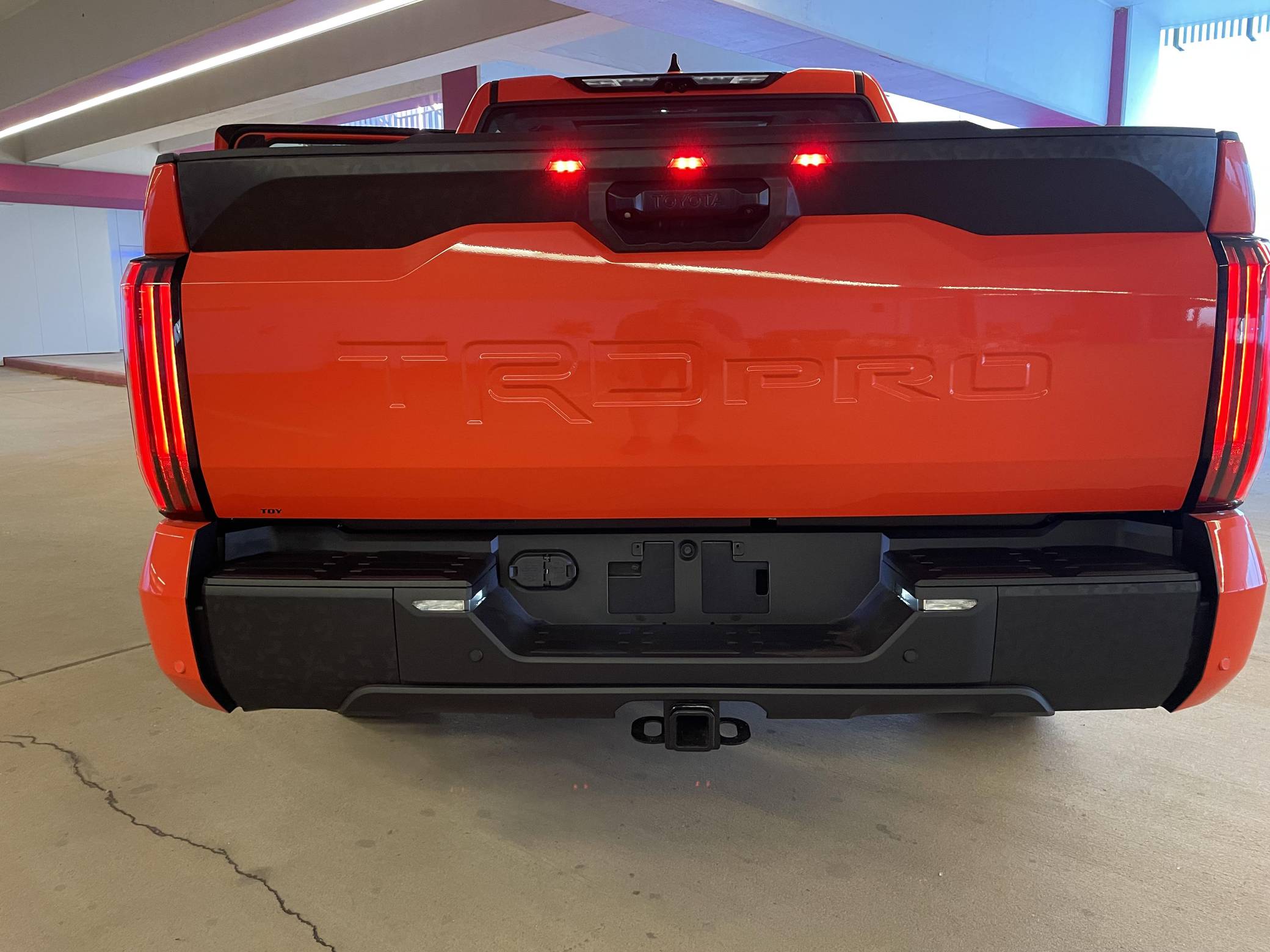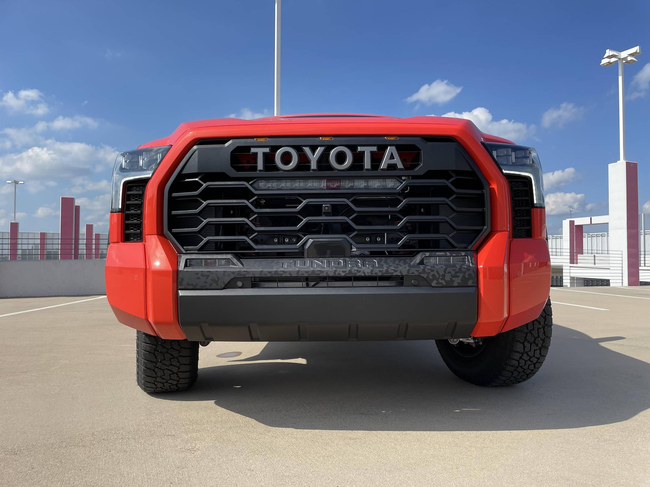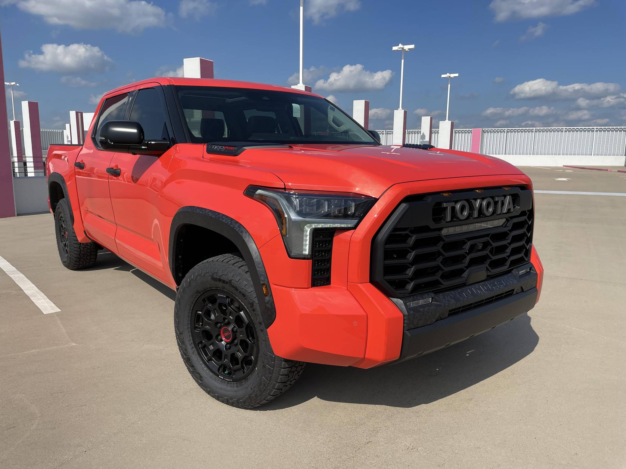 2022 Toyota Tundra TRD Pro, finished in Solar Octane with a black interior. The odometer on this Tundra currently displays 21 miles. 5 driver-assist suite, 18-inch BBS forged aluminum wheels, an electronically controlled locking rear differential, TRD Pro off-road suspension with FOX shocks, an LED light bar mounted in the grille, a TRD aluminum skid plate, an aluminum-reinforced composite bed with bed extender, a power tilt/slide panoramic sunroof, power-adjustable TRD Pro front seats, an integrated dashcam, a 12. 3-inch driver information screen, a 14-inch center touchscreen infotainment system, a 12-speaker JBL Premium audio system with subwoofer and amplifier, a rearview mirror camera, and more as detailed below. The seller reports no modifications. Called the "XK70" internally, the 3rd-generation Toyota Tundra debuted for the 2022 model year as the long-awaited follow-up to the 2nd-generation Tundra that cemented Toyota as a serious player in the full-size pickup segment. Gone is the V8, replaced by a turbocharged and (in some cases) electrified 6-cylinder options that not only helped increase fuel economy, but towing capacity and max payload as well. As before, an off-road-focused TRD Pro trim level is offered that combines muscular styling cues with genuine go-anywhere capabilities. Power comes from an "I-FORCE MAX" gasoline-electric hybrid powertrain, which consists of a 3. 5-liter twin-turbocharged V6 engine and an electric motor/generator. The system is rated at a combined 437 horsepower and 583 lb-ft of torque. Output is sent to the rear or all four wheels via a 10-speed automatic transmission and a 4WDemand part-time 4-wheel drive system with an electronically-controlled transfer case.