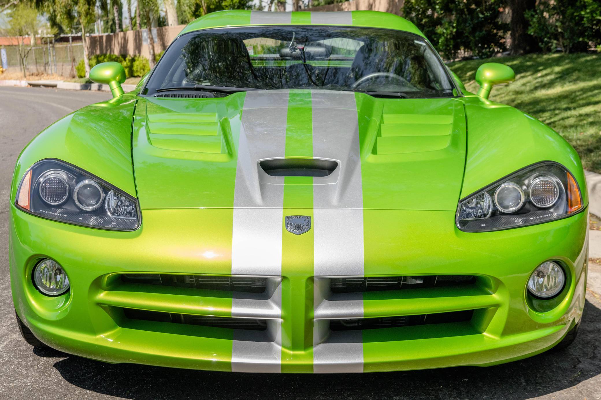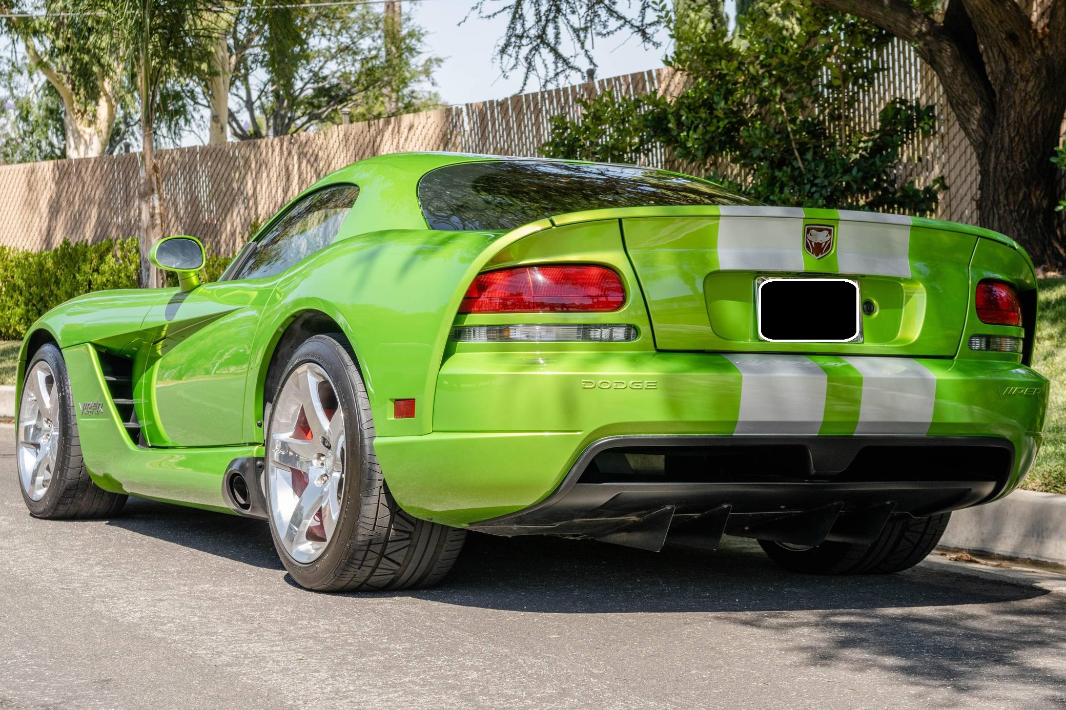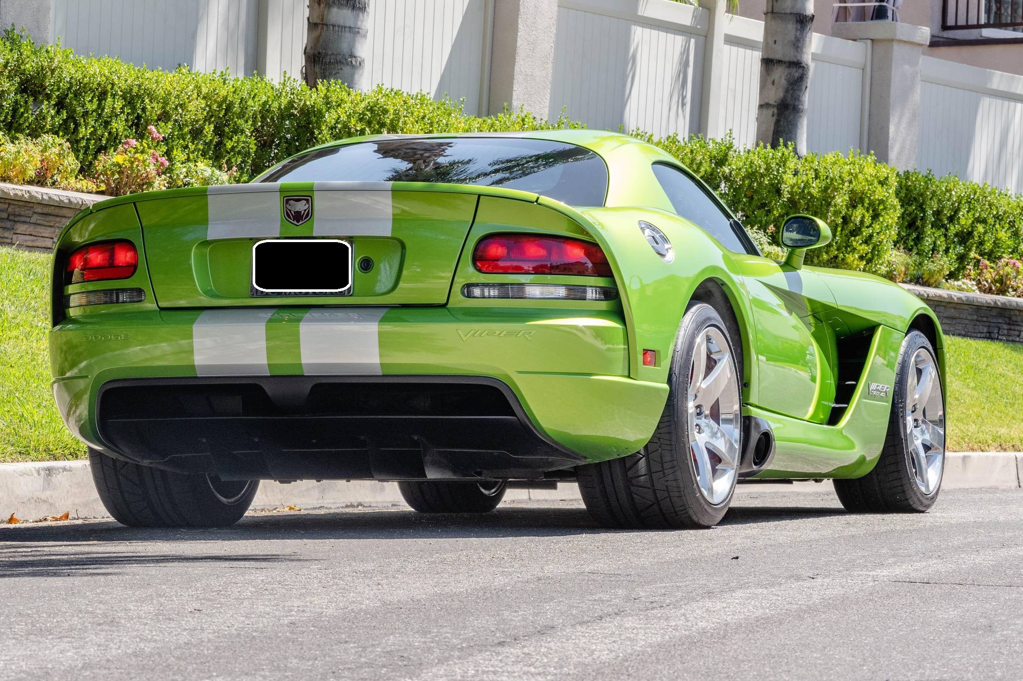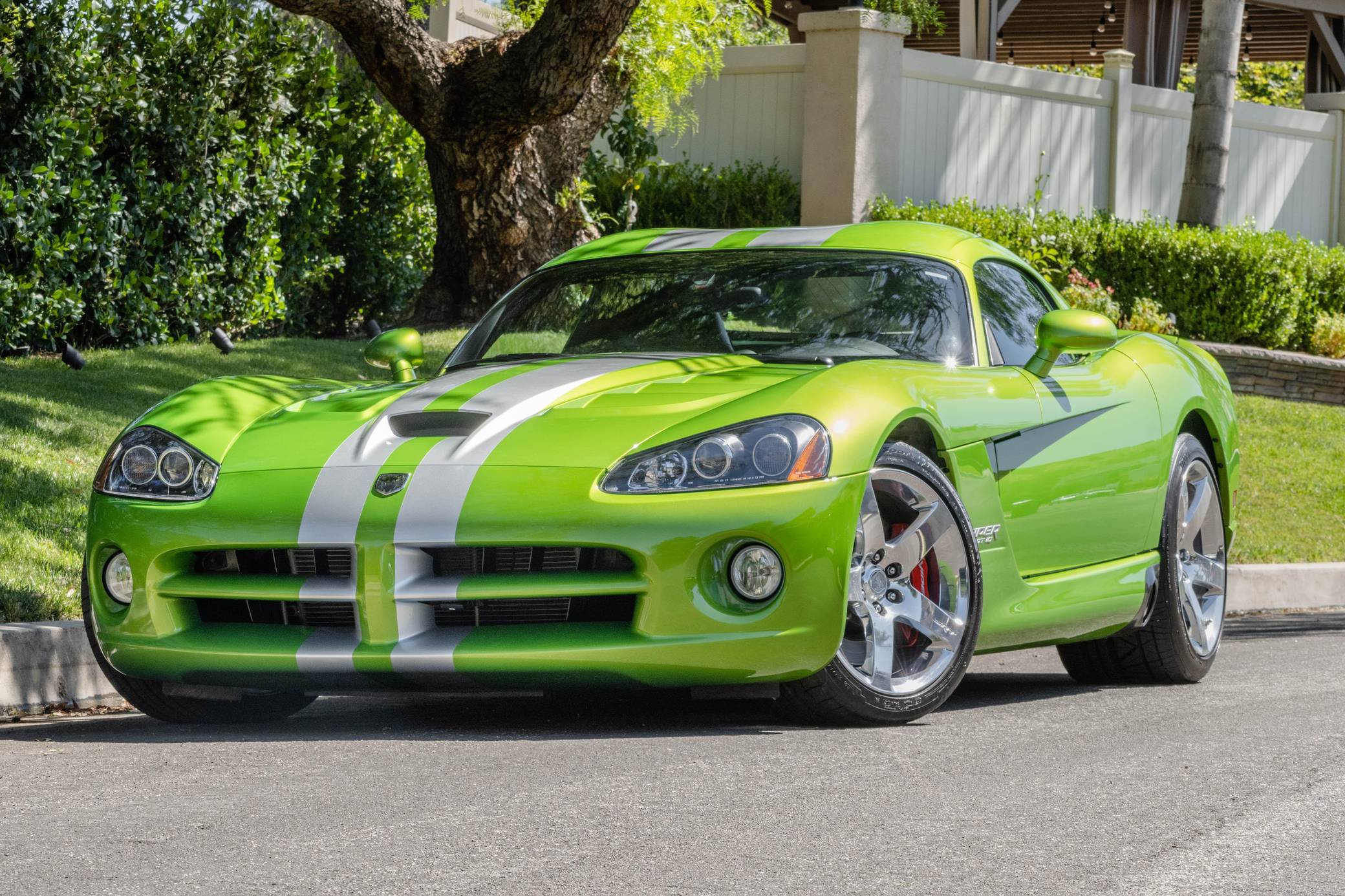 2008 Dodge Viper SRT-10 Coupe, finished in Snakeskin Green with silver stripes and a black interior. The odometer currently indicates approximately 4,600 miles. Factory equipment includes 18-inch front and 19-inch rear wheels, a limited-slip differential, an engine oil cooler, a dual side-mounted exhaust system, leather and suede upholstery, an AM/FM sound system with CD player, and air conditioning. Modifications reported by the seller are limited to aftermarket center console trim and an aftermarket shift knob. Dodge's fourth-generation Viper hatched for the 2008 model year with a familiar-looking exterior design and several significant changes underneath the sheet metal. It gained a slightly bigger and heavily revised engine, a side-exit exhaust system developed to reduce heat levels in the cabin, and a retuned suspension system. Production ended in 2010. Power comes from an 8. 4-liter V10, rated at 600 horsepower and 560 lb-ft of torque. Output is sent to the rear wheels via a 6-speed manual transmission.