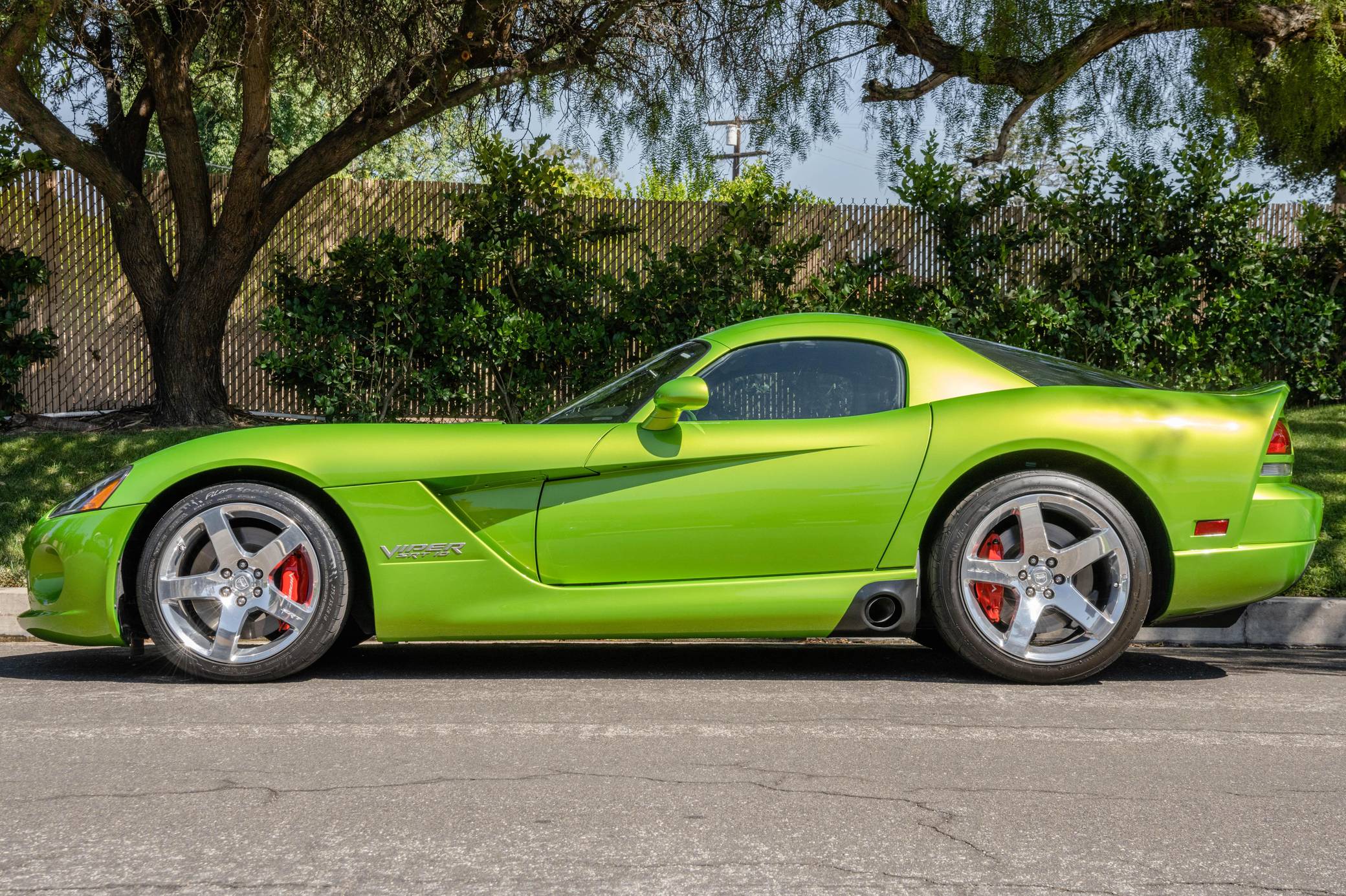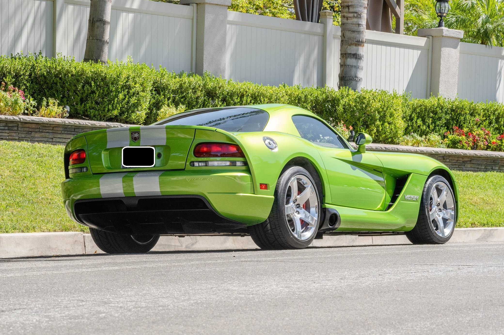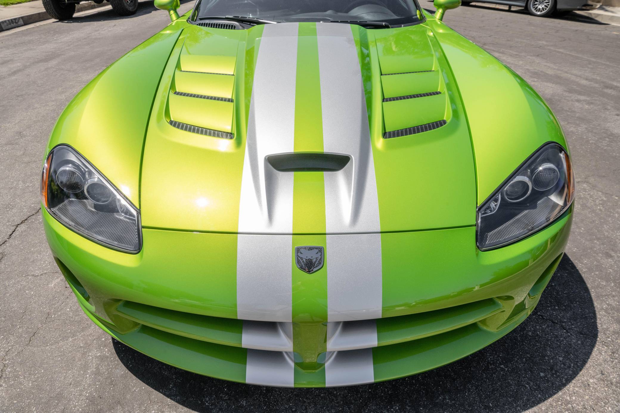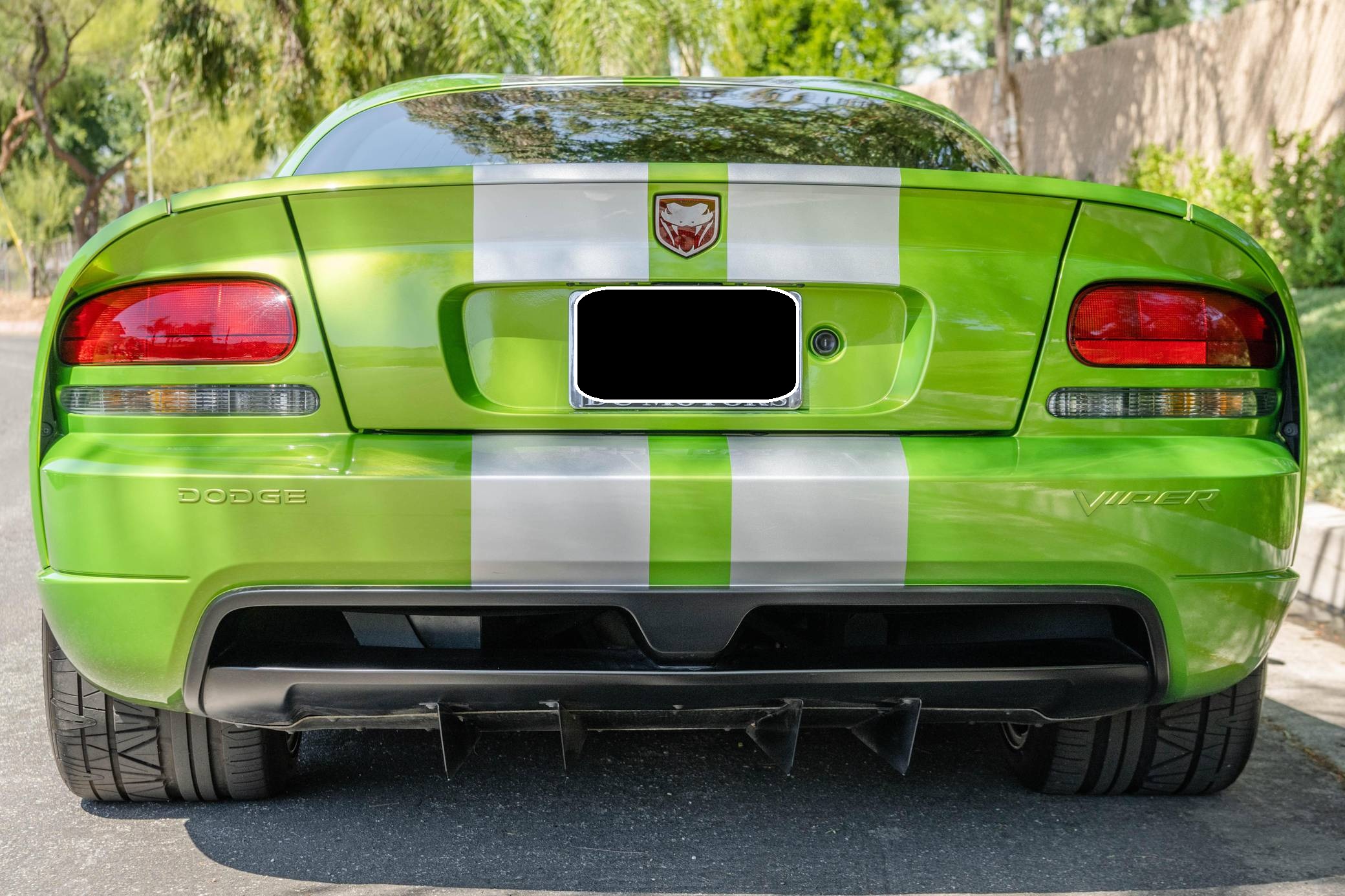 2008 Dodge Viper SRT-10 Coupe, finished in Snakeskin Green with silver stripes and a black interior. The odometer currently indicates approximately 4,600 miles. Factory equipment includes 18-inch front and 19-inch rear wheels, a limited-slip differential, an engine oil cooler, a dual side-mounted exhaust system, leather and suede upholstery, an AM/FM sound system with CD player, and air conditioning. Modifications reported by the seller are limited to aftermarket center console trim and an aftermarket shift knob. Dodge's fourth-generation Viper hatched for the 2008 model year with a familiar-looking exterior design and several significant changes underneath the sheet metal. It gained a slightly bigger and heavily revised engine, a side-exit exhaust system developed to reduce heat levels in the cabin, and a retuned suspension system. Production ended in 2010. Power comes from an 8. 4-liter V10, rated at 600 horsepower and 560 lb-ft of torque. Output is sent to the rear wheels via a 6-speed manual transmission.