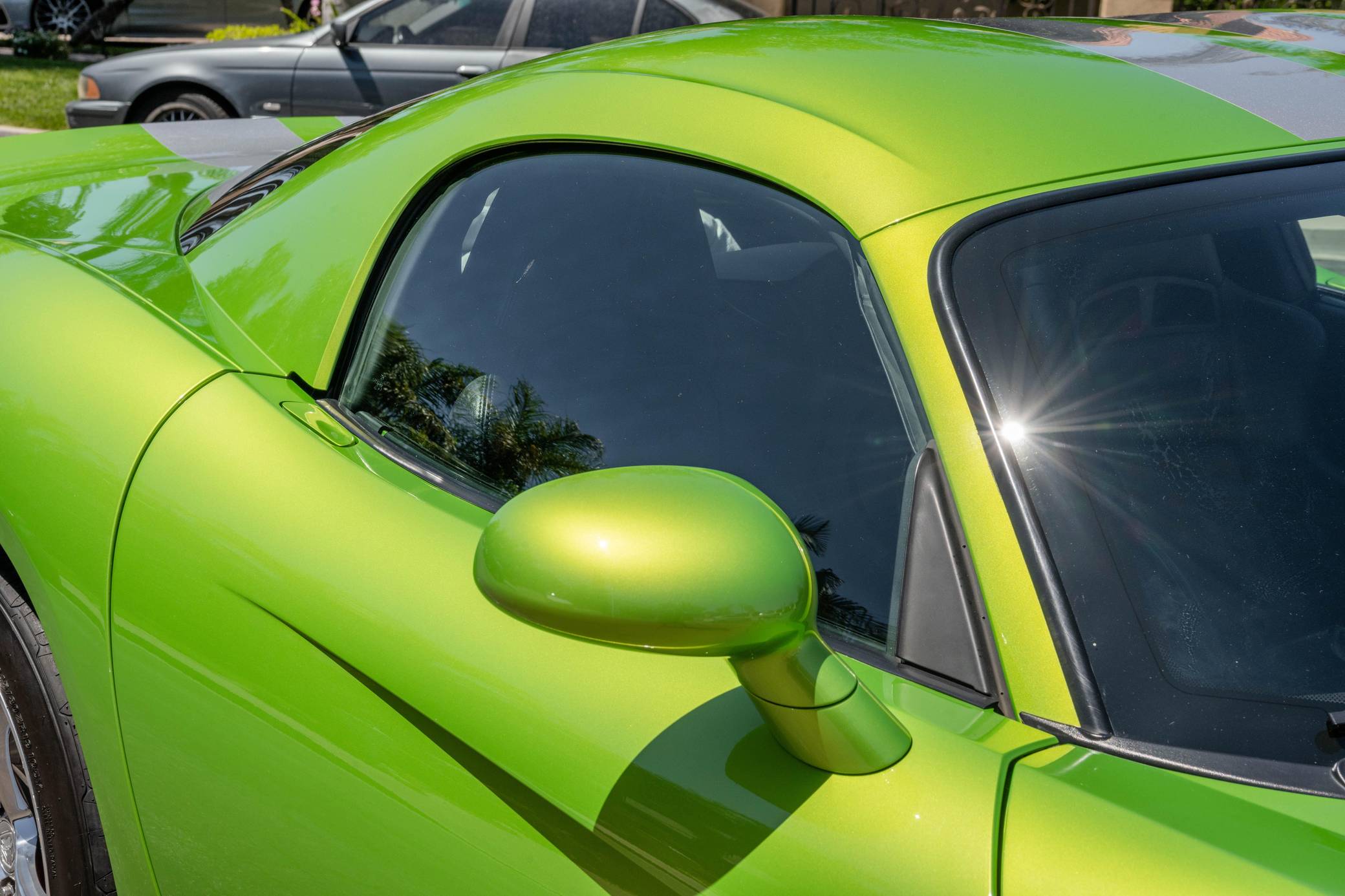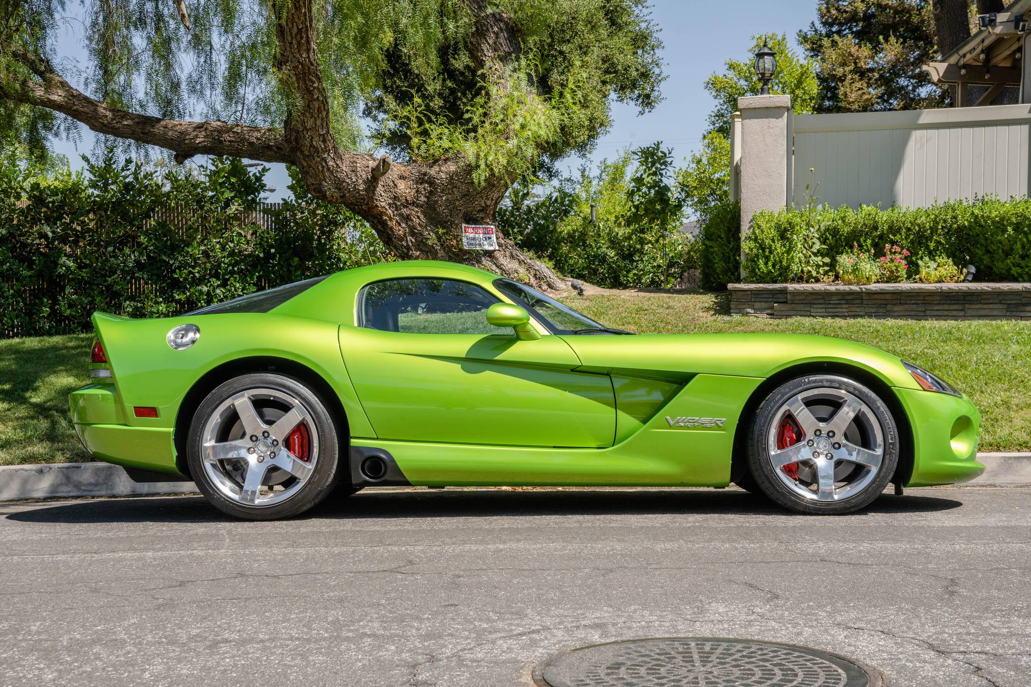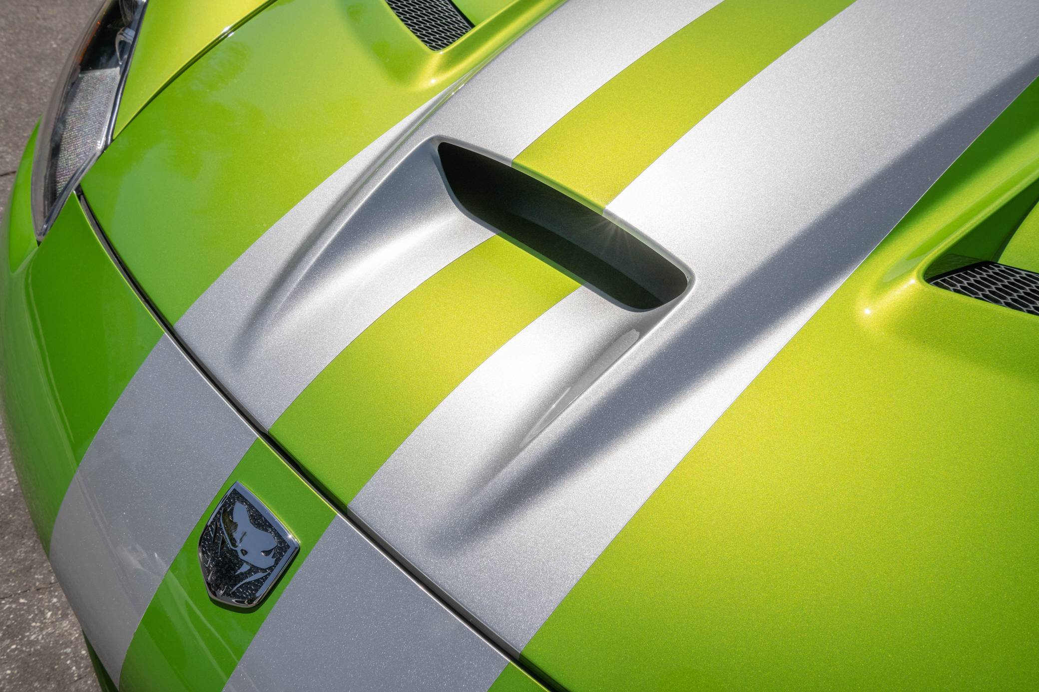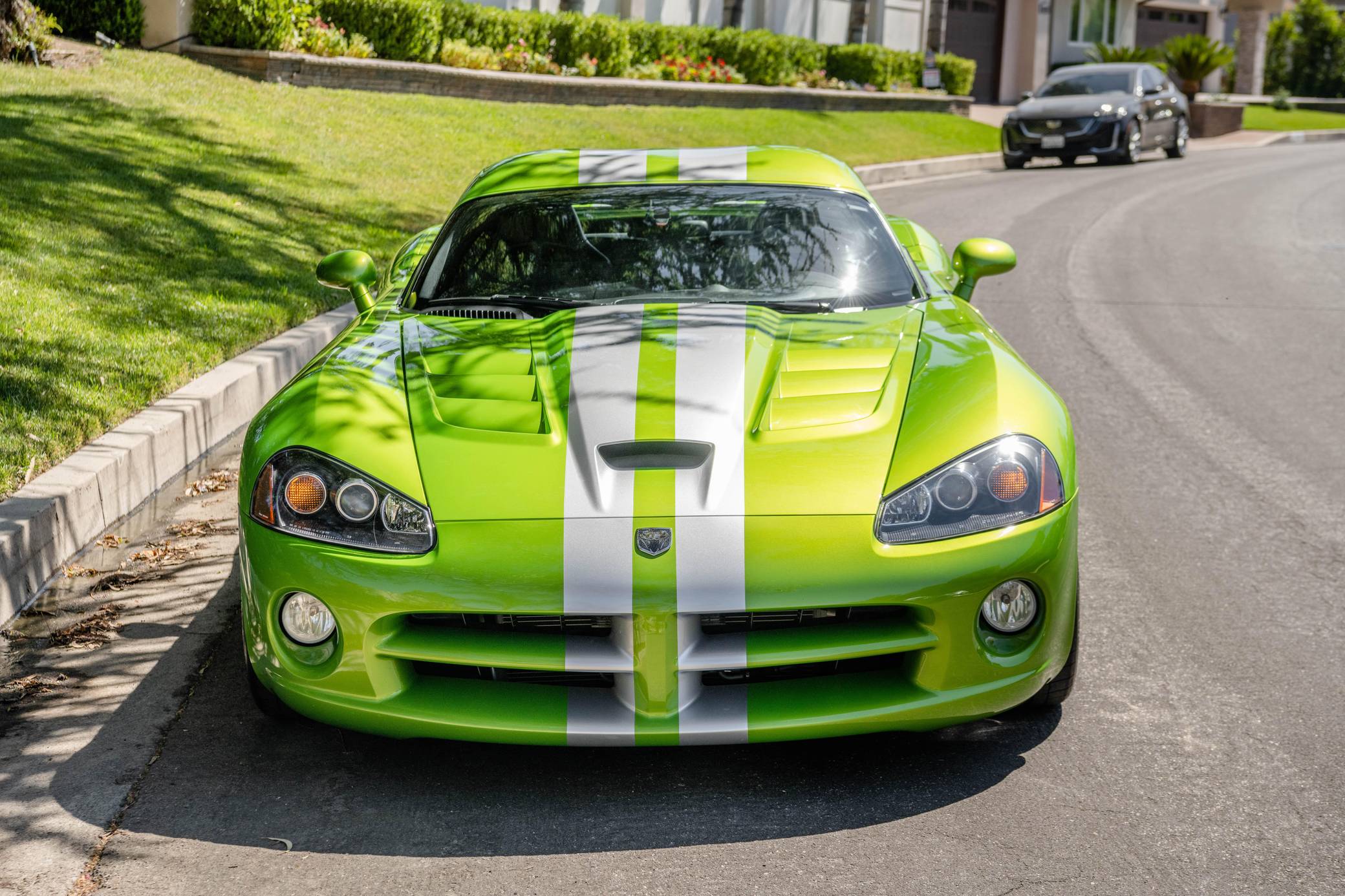 2008 Dodge Viper SRT-10 Coupe, finished in Snakeskin Green with silver stripes and a black interior. The odometer currently indicates approximately 4,600 miles. Factory equipment includes 18-inch front and 19-inch rear wheels, a limited-slip differential, an engine oil cooler, a dual side-mounted exhaust system, leather and suede upholstery, an AM/FM sound system with CD player, and air conditioning. Modifications reported by the seller are limited to aftermarket center console trim and an aftermarket shift knob. Dodge's fourth-generation Viper hatched for the 2008 model year with a familiar-looking exterior design and several significant changes underneath the sheet metal. It gained a slightly bigger and heavily revised engine, a side-exit exhaust system developed to reduce heat levels in the cabin, and a retuned suspension system. Production ended in 2010. Power comes from an 8. 4-liter V10, rated at 600 horsepower and 560 lb-ft of torque. Output is sent to the rear wheels via a 6-speed manual transmission.