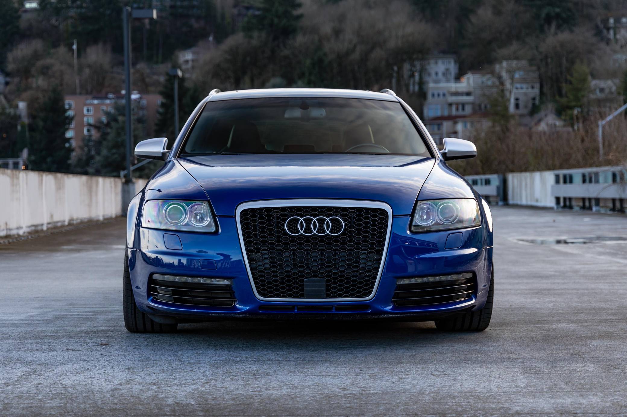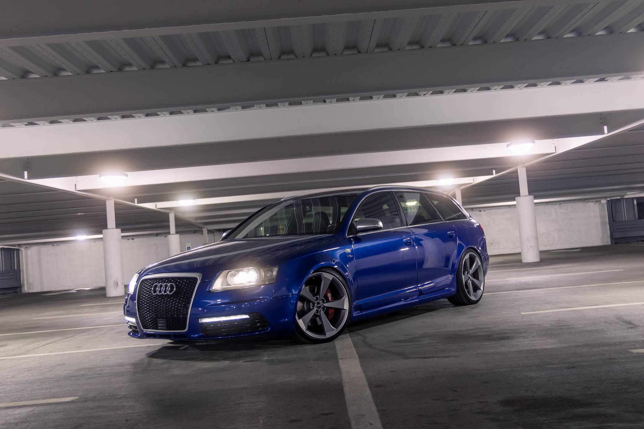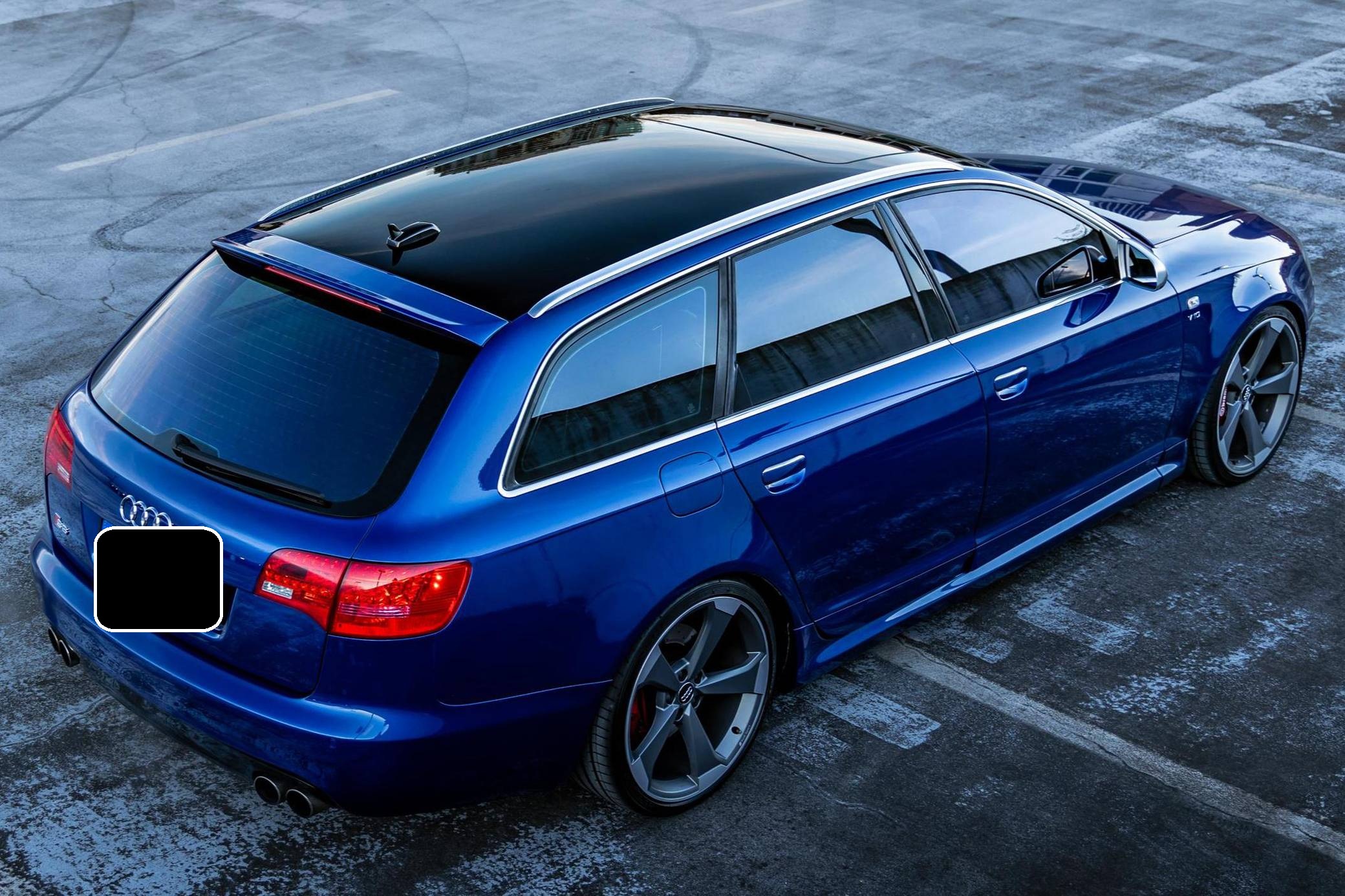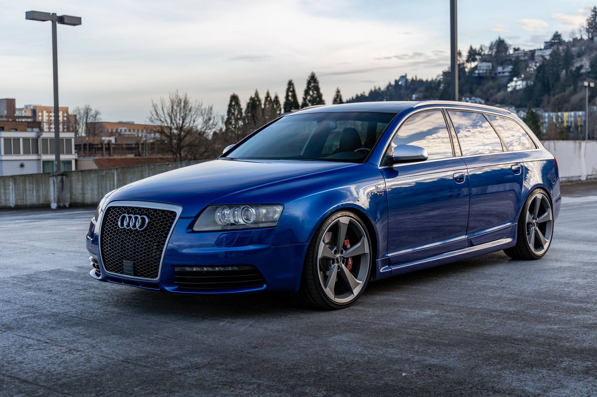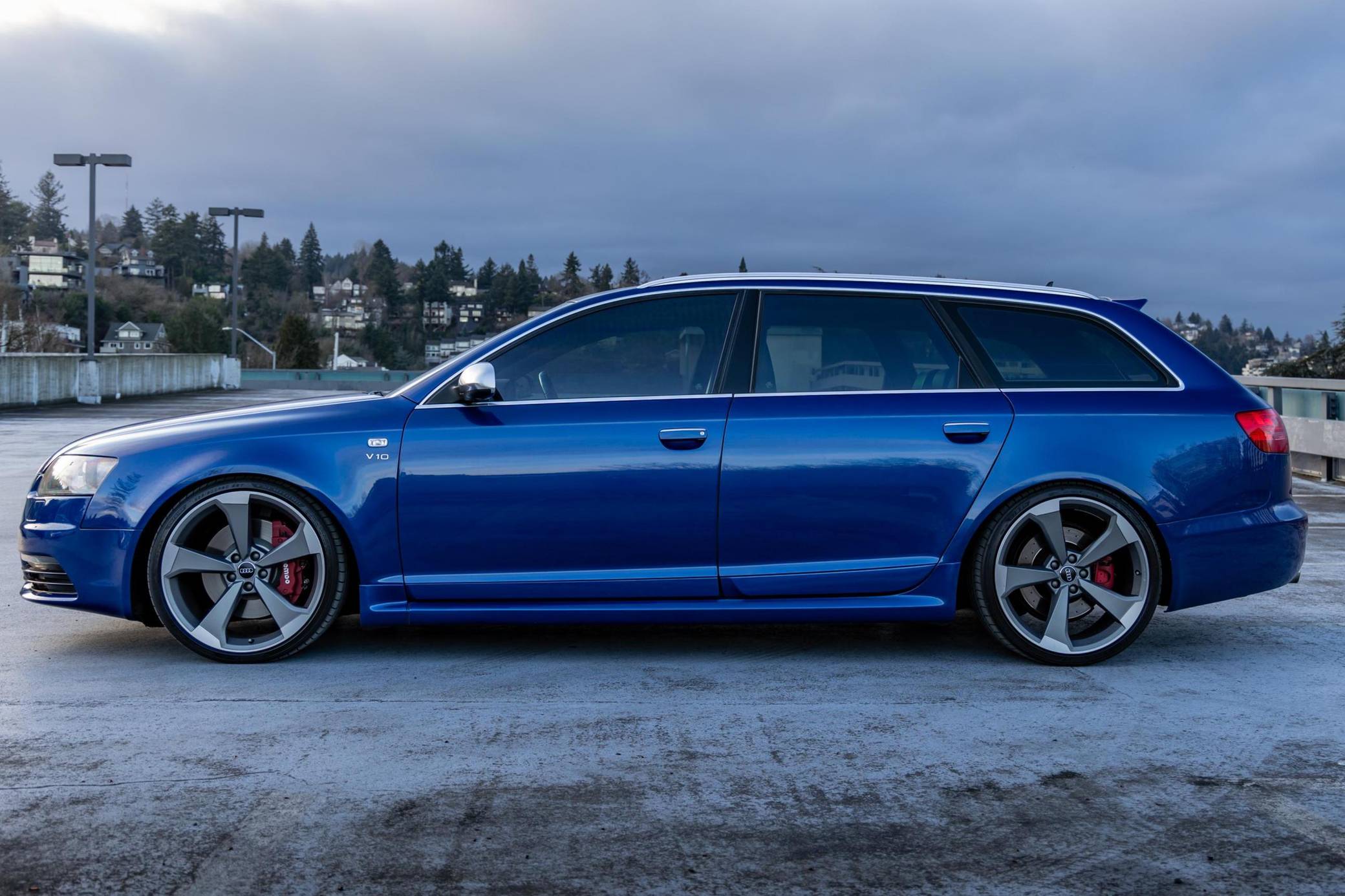 2006 Audi A6 Avant Quattro, finished in Sepang Blue with a black interior. Substantially modified, this A6 Avant is powered by a 5. 2-liter V10 paired with a 6-speed automatic transmission sourced from a 2008 C6-generation Audi S6. Other modifications include C6 RS6 rocker panels, S6 Recaro sport front and rear seats, an aftermarket exhaust system, 20-inch B9 S5 wheels, and much more detailed below. Factory equipment includes a Quattro permanent all-wheel-drive system, a sunroof, Bose sound system, and dual-zone automatic climate control. This "C6" generation A6 Avant benefits from the platform's consistent upgrades since introduction for the 2004 model year. Additions include LED lighting, and an updated Quattro all-wheel drive system with 40-60 front-rear split. Sales of the A6 Avant were discontinued in North America after the 2011 model year. The V10-powered S6 was launched for the 2007 model year, though the S6 Avant wagon never made it to the United States. Power for this S6 comes from a 5. 2-liter V10, rated at 435 horsepower and 389 lb-ft of torque. Due to the modifications performed, it may produce more power, but a dyno sheet was not provided to confirm. It spins all four wheels via a 6-speed automatic transmission and Audi's Quattro permanent all-wheel-drive system.