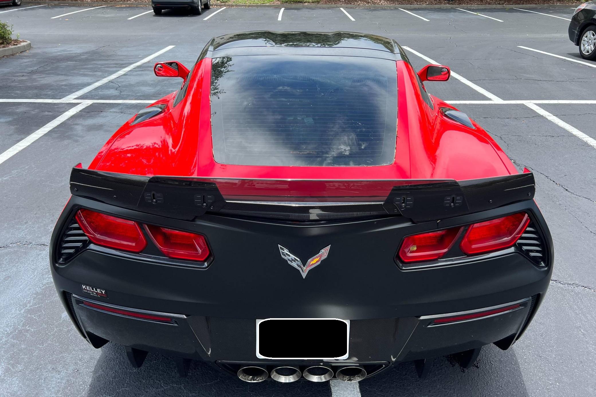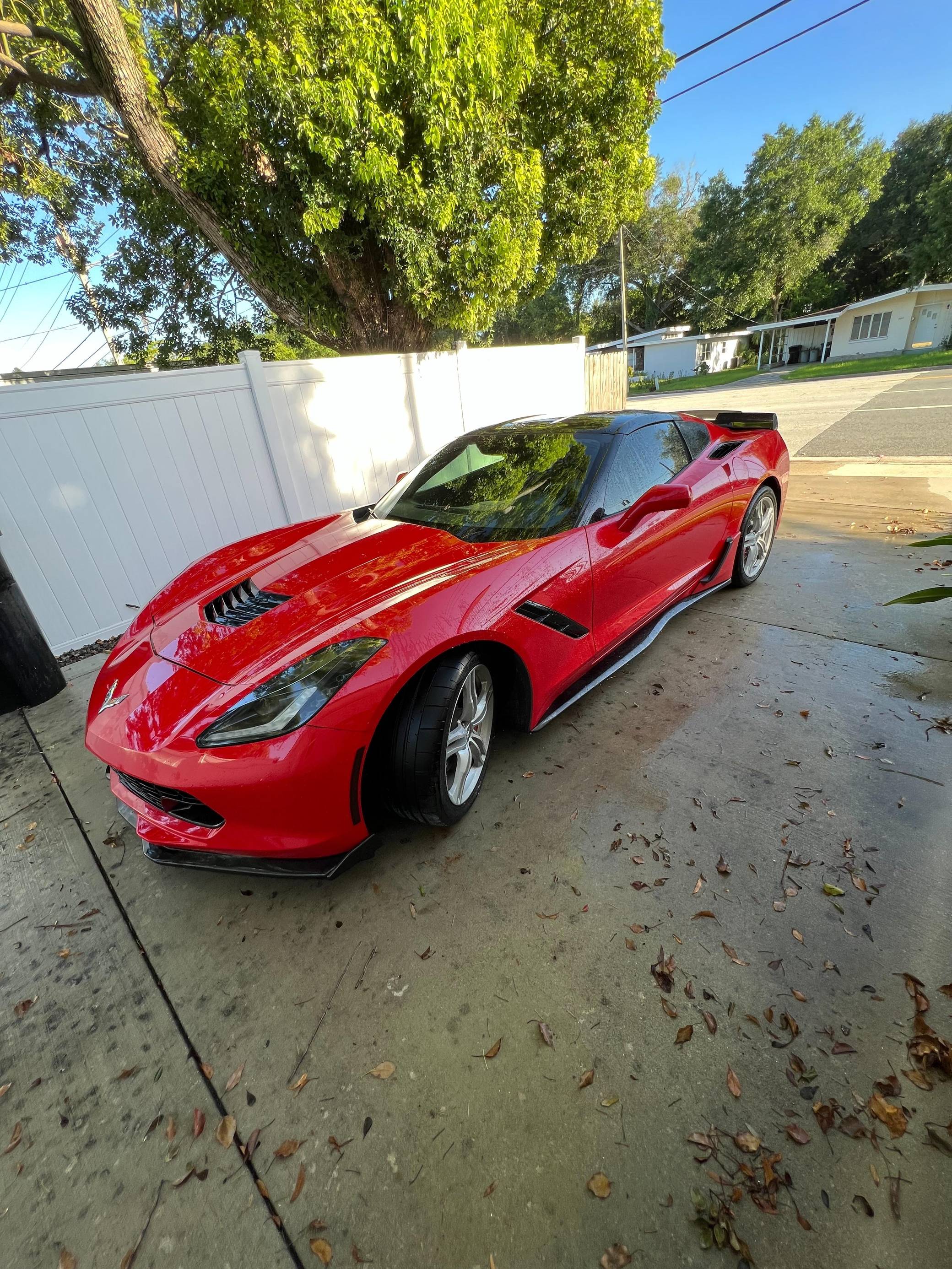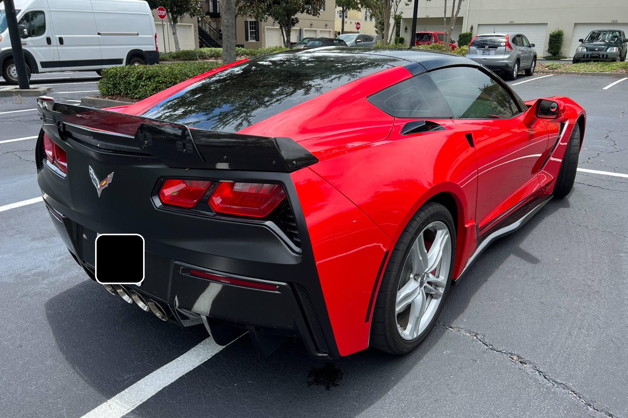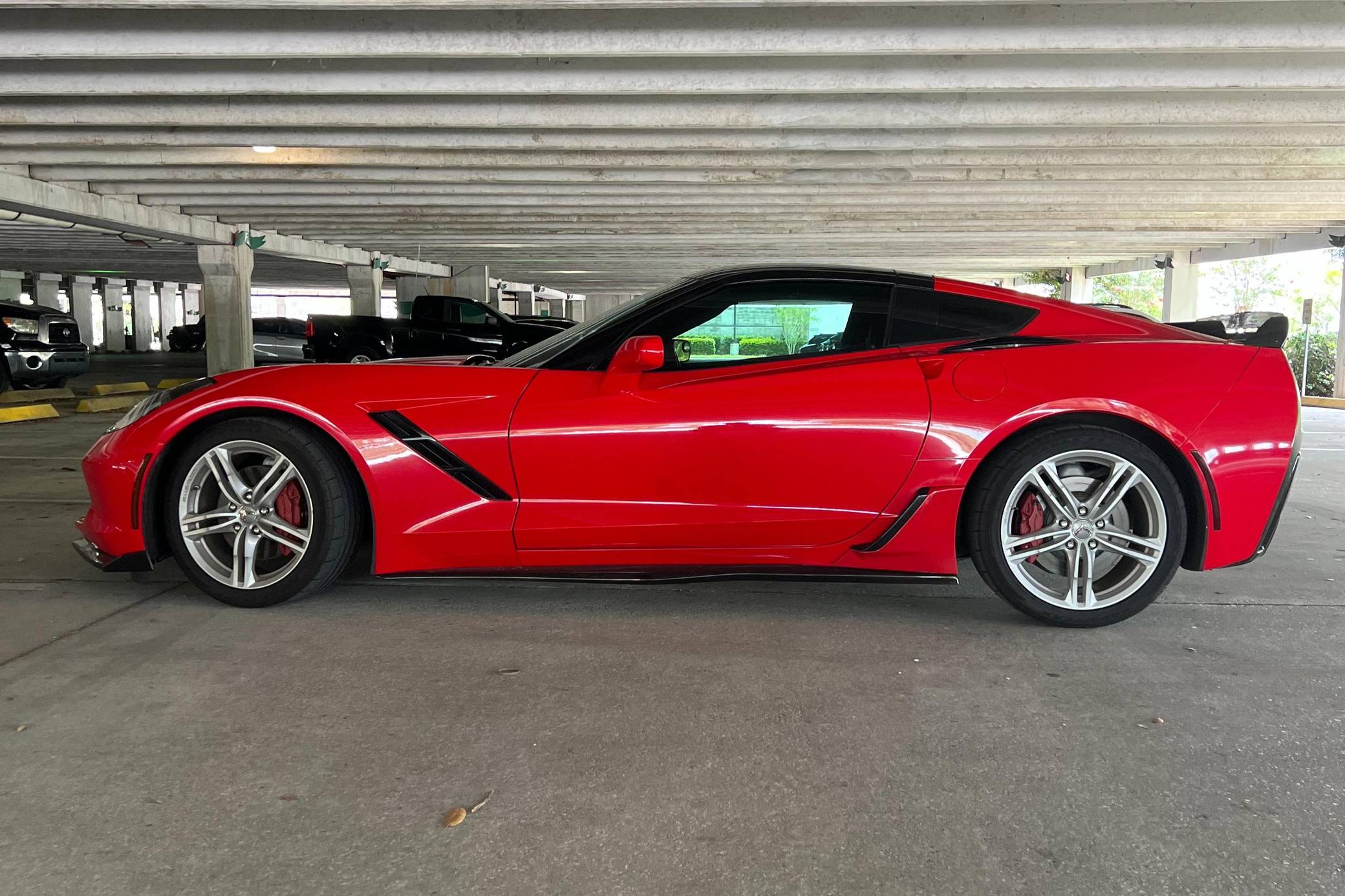 2016 Chevrolet Corvette Coupe, finished in Torch Red with a Jet Black interior. Factory equipment includes staggered 18-inch front and 19-inch rear wheels, carbon fiber ground effects, a removable roof panel, power-adjustable bucket seats, MyLink 8-inch infotainment system with Apple CarPlay and navigation, a performance data and video recorder, and a Bose audio system. Modifications reported by the seller include black vinyl wrap on the roof panel and rear panel, a Z06-style front grille, and a wicker bill on the rear spoiler. Chevrolet launched the seventh-generation Corvette (colloquially called "C7") for the 2014 model year. It offered a more user-friendly interior, a sharper-looking exterior design, and, significantly, the then-new "LT1" small-block V8. The C7 represented the culmination of four decades of development, and production ended in 2019. Power comes from a 6. 2-liter V8, rated at 455 horsepower and 460 lb-ft of torque. Output is sent to the rear wheels via an 8-speed automatic transmission.