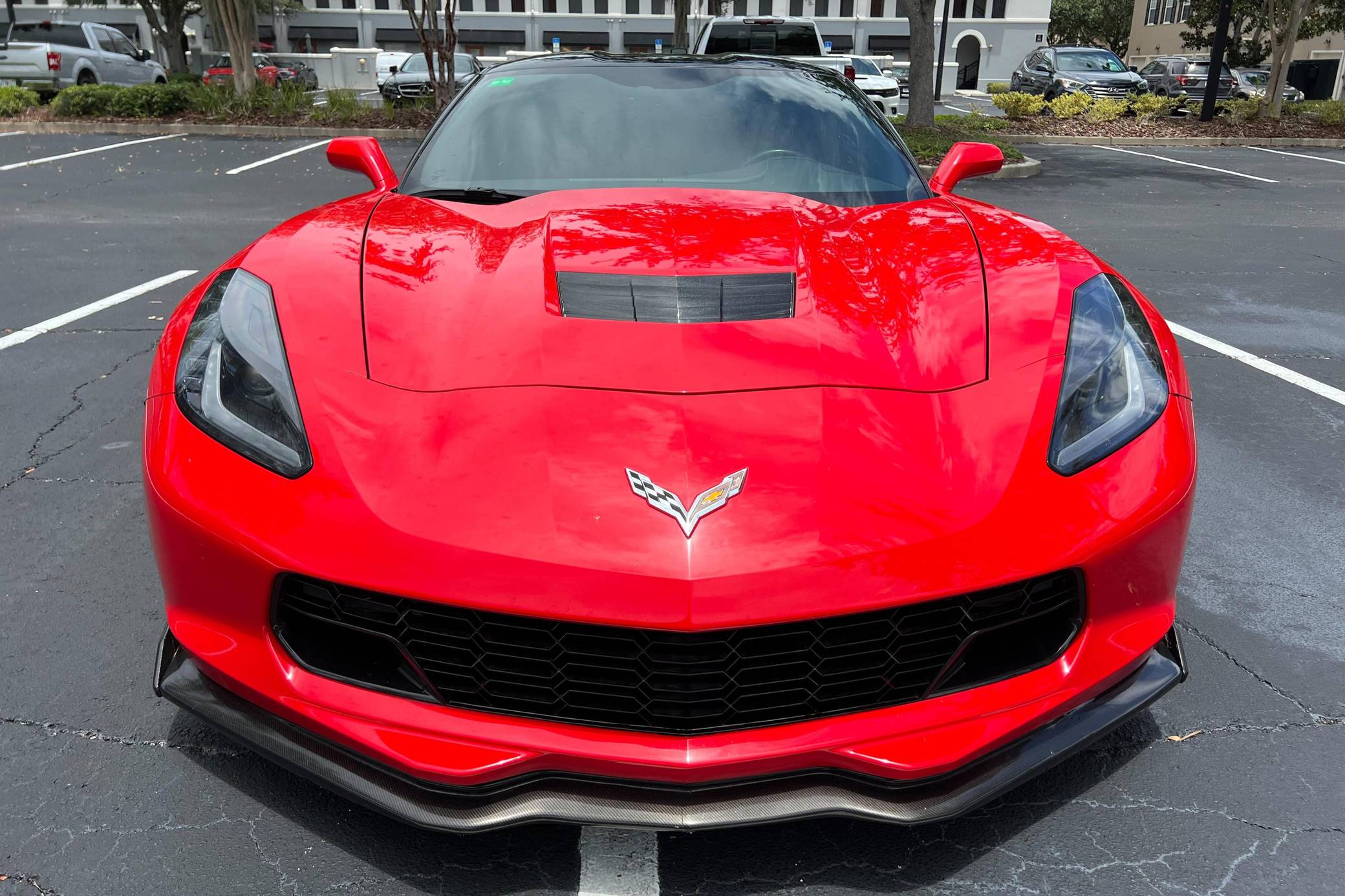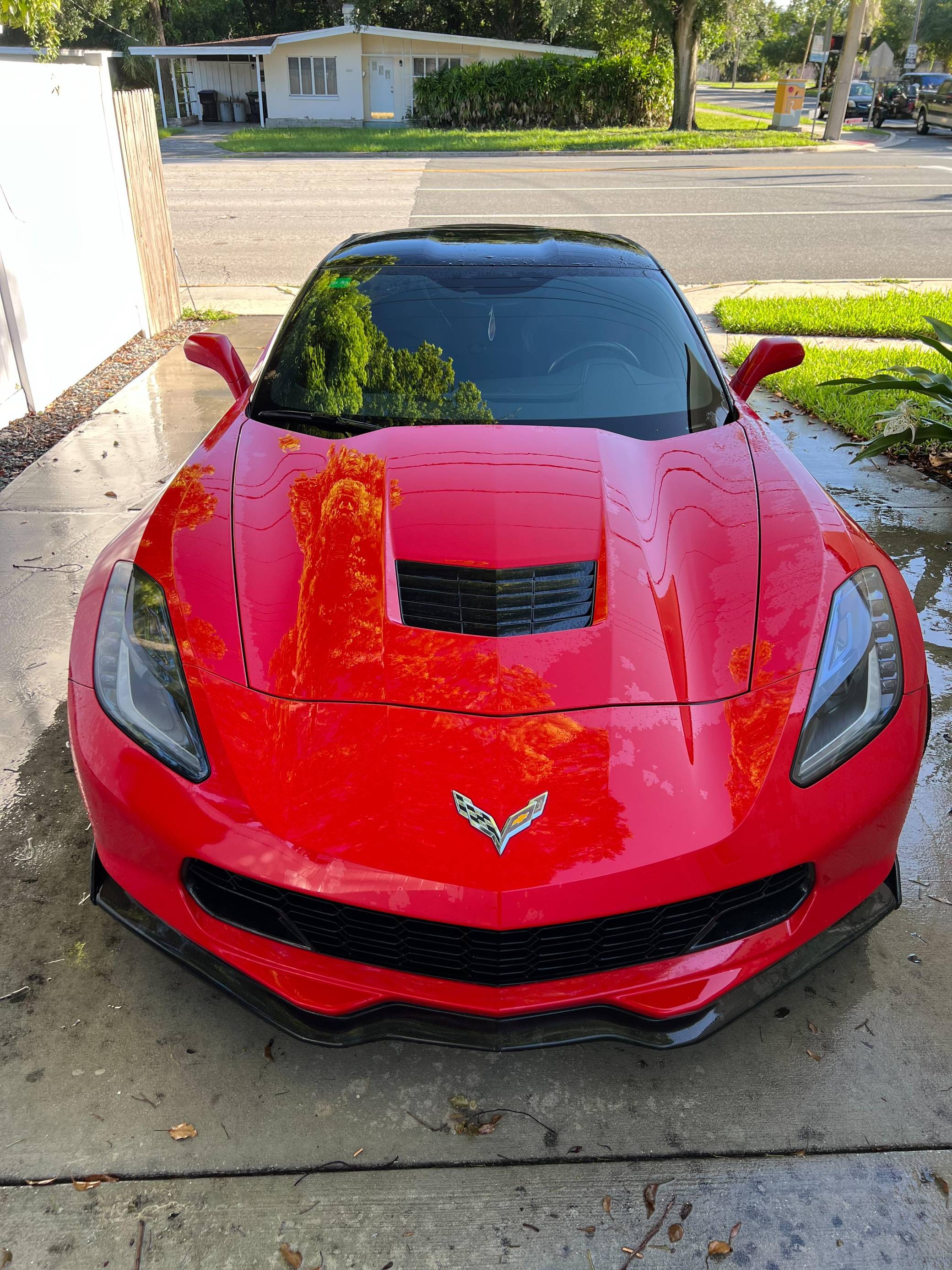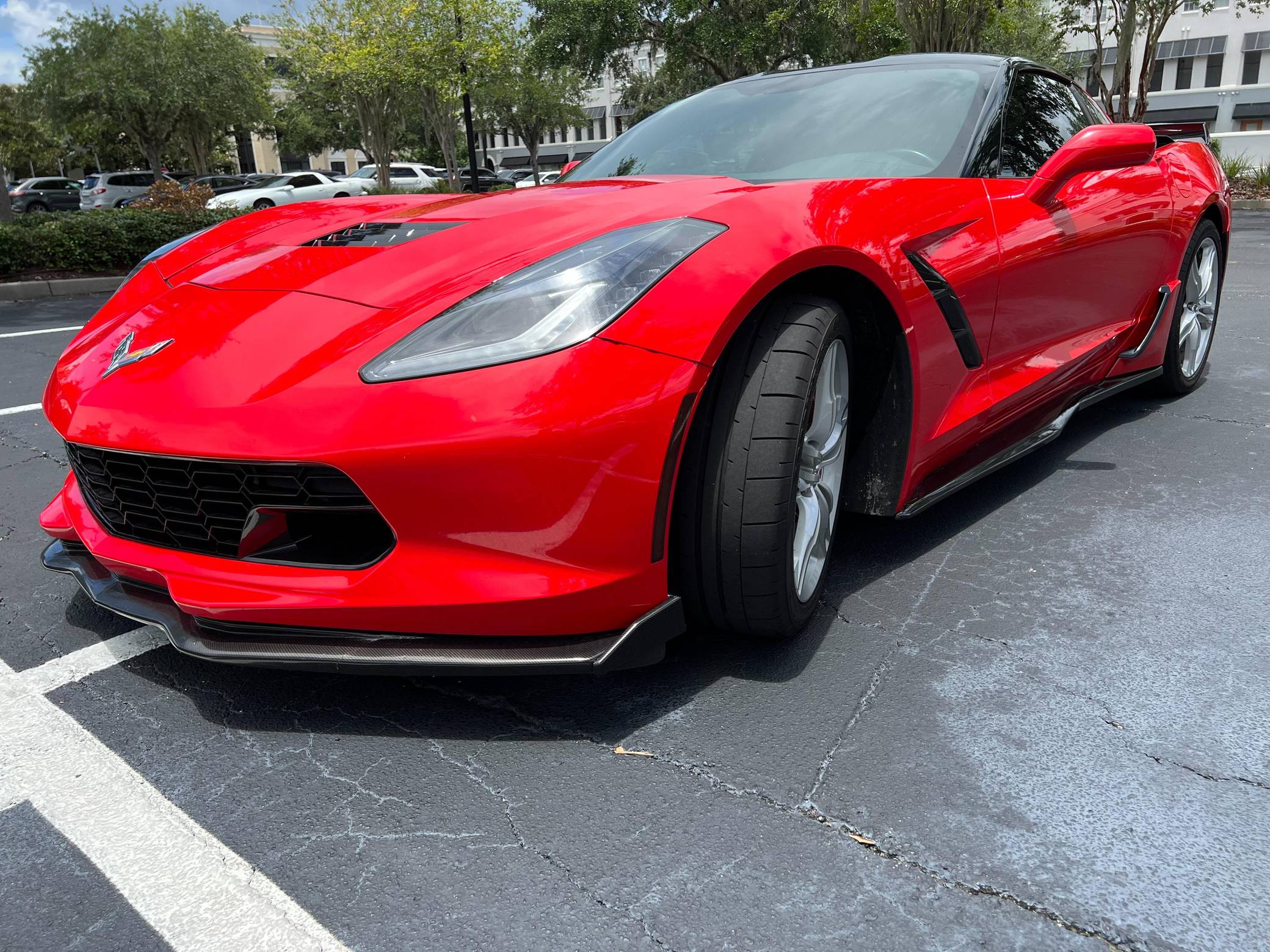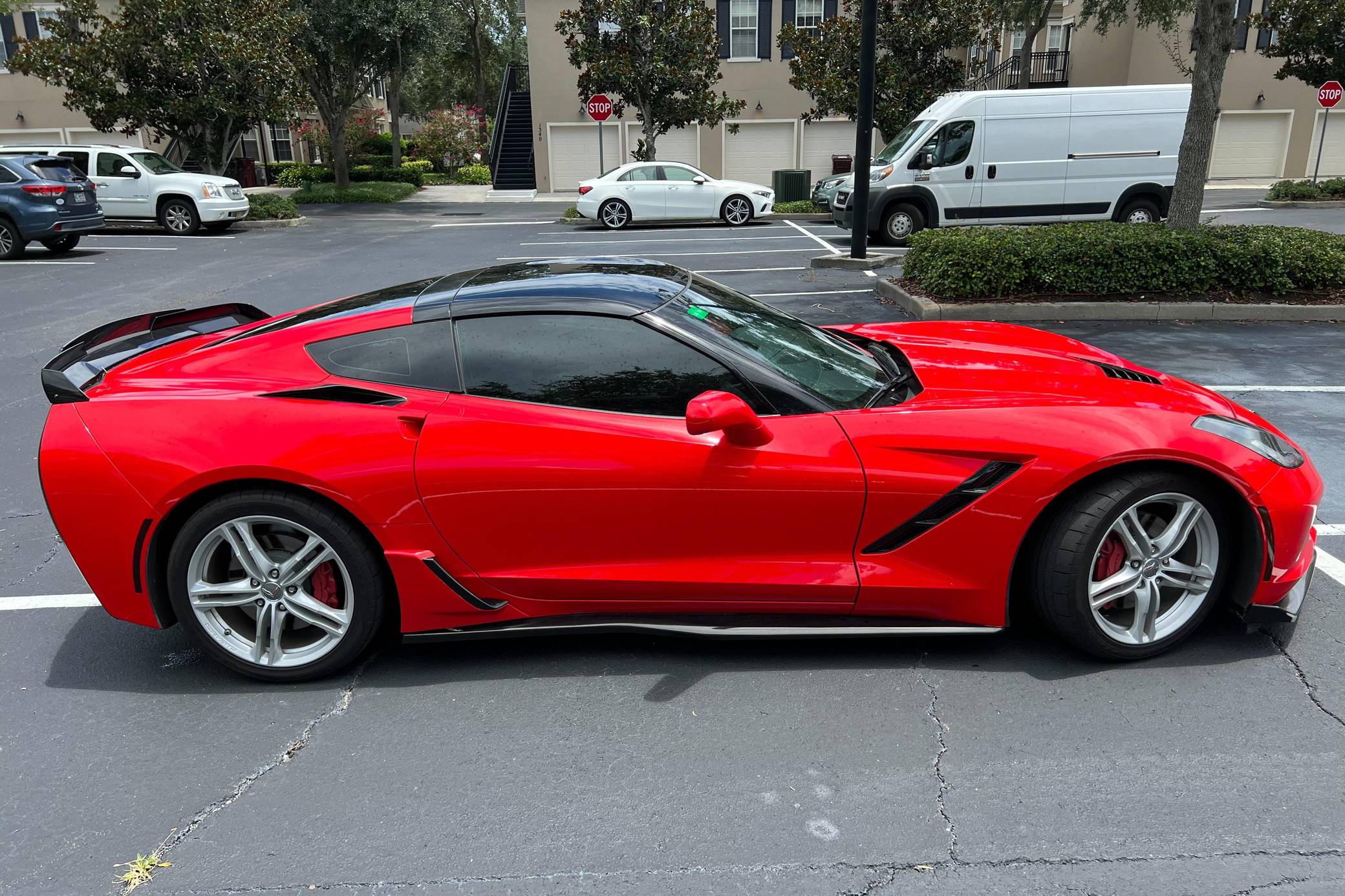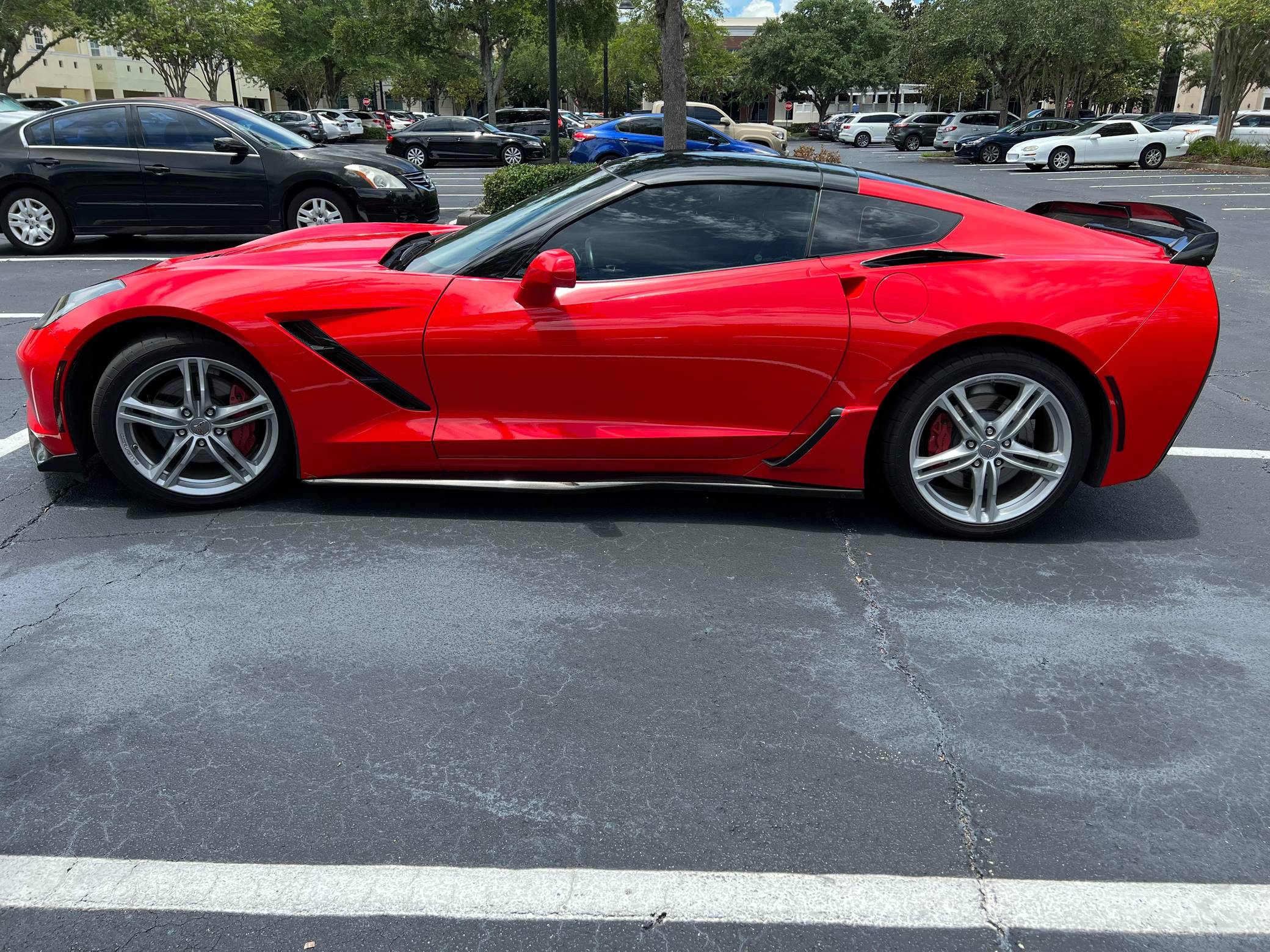 2016 Chevrolet Corvette Coupe, finished in Torch Red with a Jet Black interior. Factory equipment includes staggered 18-inch front and 19-inch rear wheels, carbon fiber ground effects, a removable roof panel, power-adjustable bucket seats, MyLink 8-inch infotainment system with Apple CarPlay and navigation, a performance data and video recorder, and a Bose audio system. Modifications reported by the seller include black vinyl wrap on the roof panel and rear panel, a Z06-style front grille, and a wicker bill on the rear spoiler. Chevrolet launched the seventh-generation Corvette (colloquially called "C7") for the 2014 model year. It offered a more user-friendly interior, a sharper-looking exterior design, and, significantly, the then-new "LT1" small-block V8. The C7 represented the culmination of four decades of development, and production ended in 2019. Power comes from a 6. 2-liter V8, rated at 455 horsepower and 460 lb-ft of torque. Output is sent to the rear wheels via an 8-speed automatic transmission.