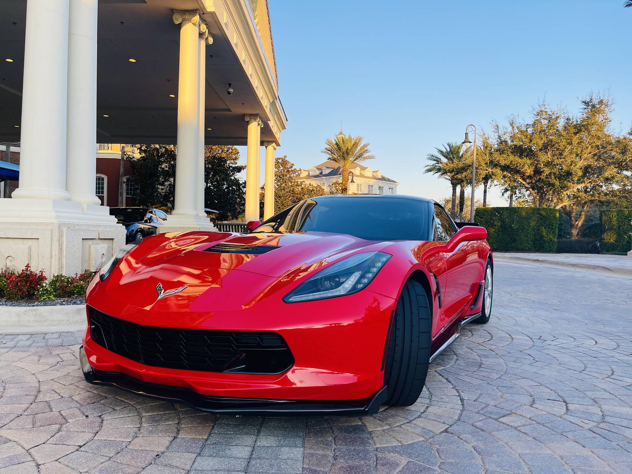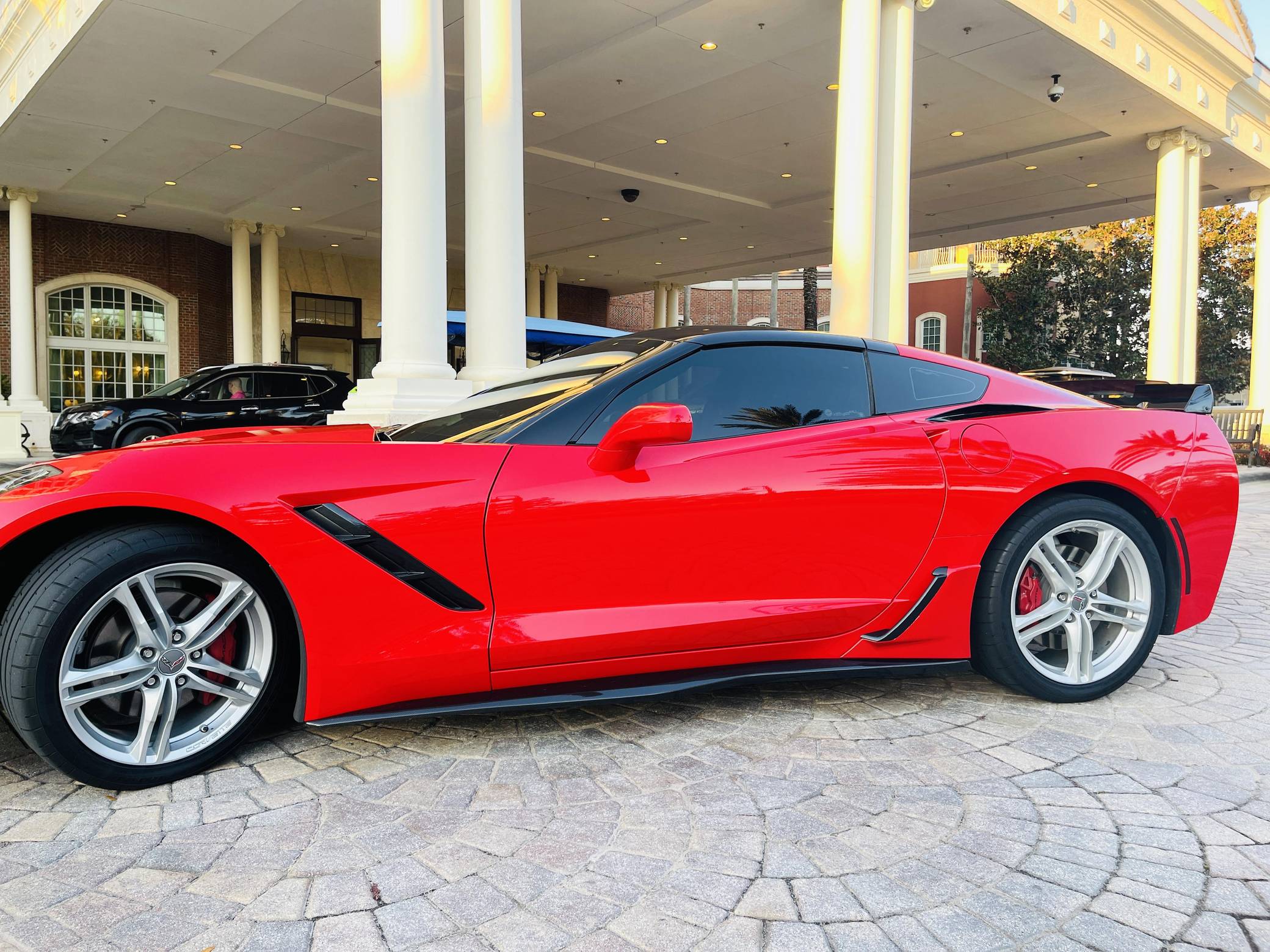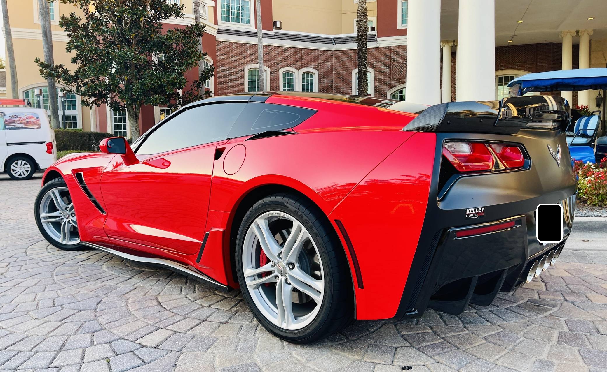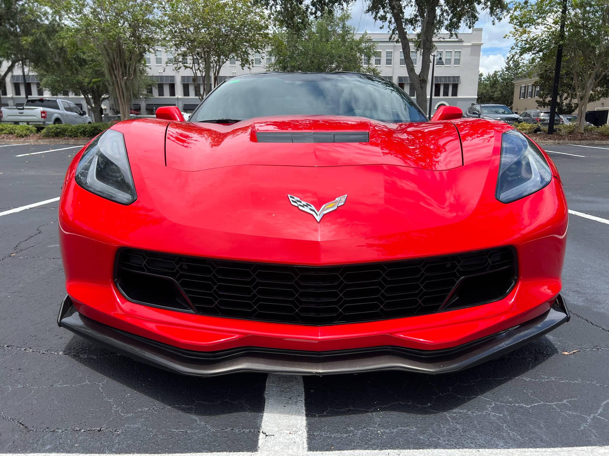 2016 Chevrolet Corvette Coupe, finished in Torch Red with a Jet Black interior. Factory equipment includes staggered 18-inch front and 19-inch rear wheels, carbon fiber ground effects, a removable roof panel, power-adjustable bucket seats, MyLink 8-inch infotainment system with Apple CarPlay and navigation, a performance data and video recorder, and a Bose audio system. Modifications reported by the seller include black vinyl wrap on the roof panel and rear panel, a Z06-style front grille, and a wicker bill on the rear spoiler. Chevrolet launched the seventh-generation Corvette (colloquially called "C7") for the 2014 model year. It offered a more user-friendly interior, a sharper-looking exterior design, and, significantly, the then-new "LT1" small-block V8. The C7 represented the culmination of four decades of development, and production ended in 2019. Power comes from a 6. 2-liter V8, rated at 455 horsepower and 460 lb-ft of torque. Output is sent to the rear wheels via an 8-speed automatic transmission.